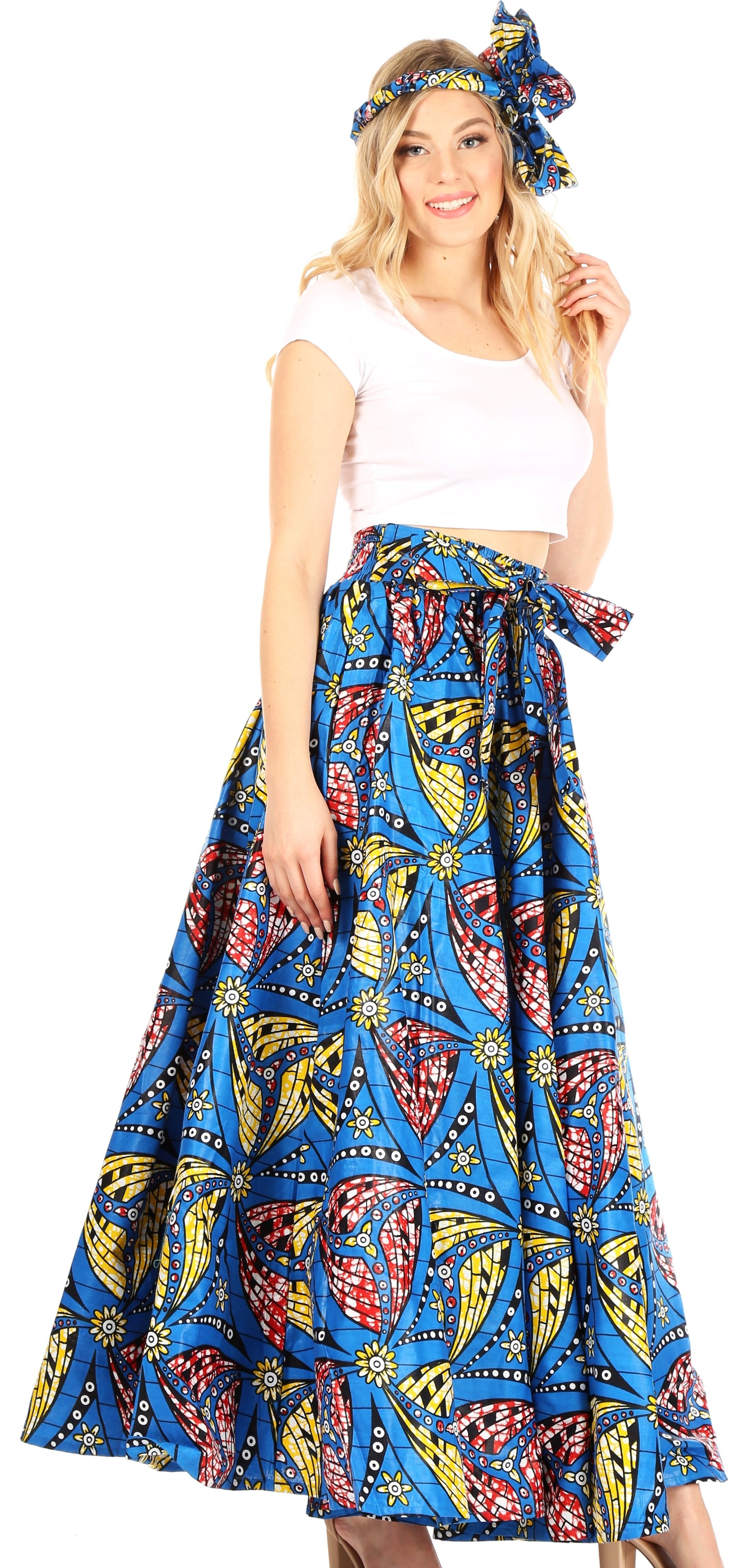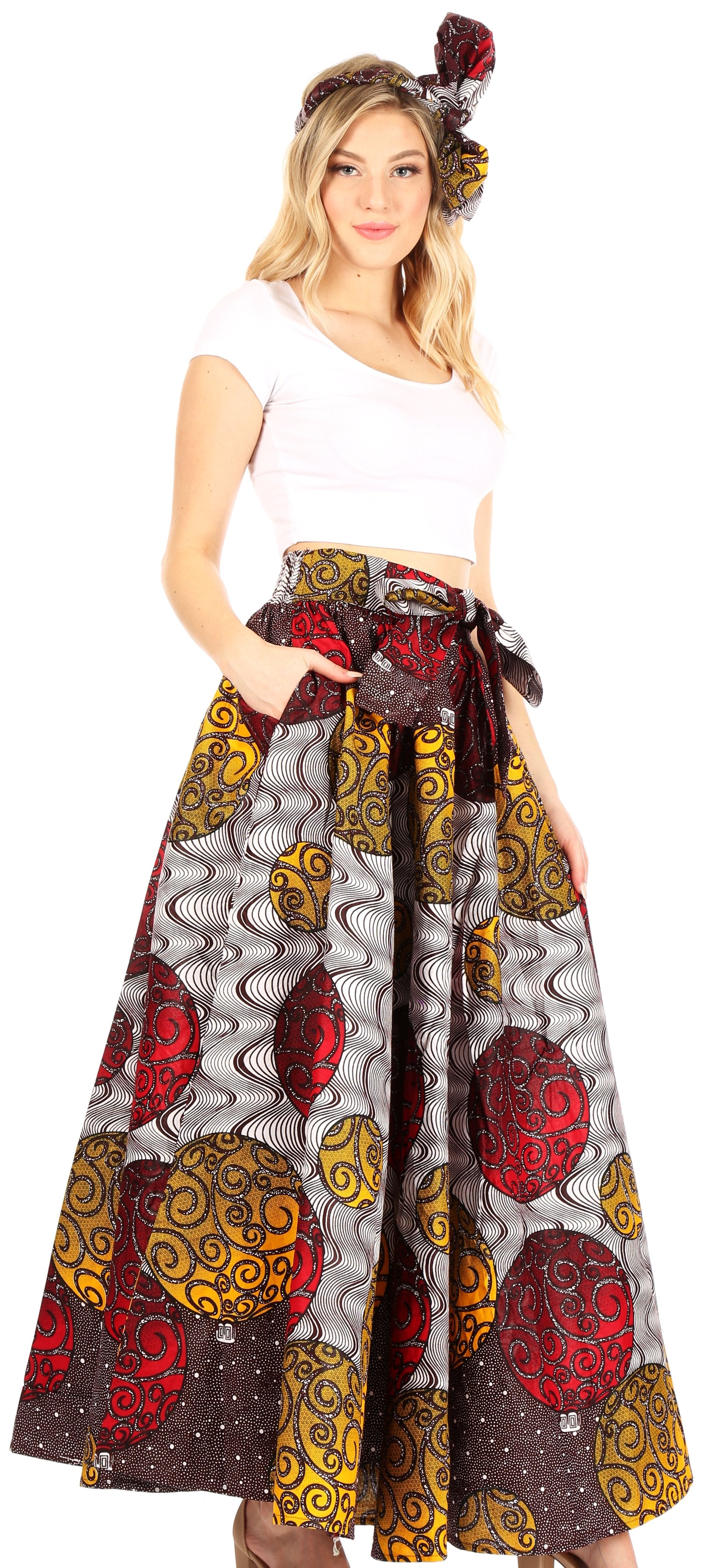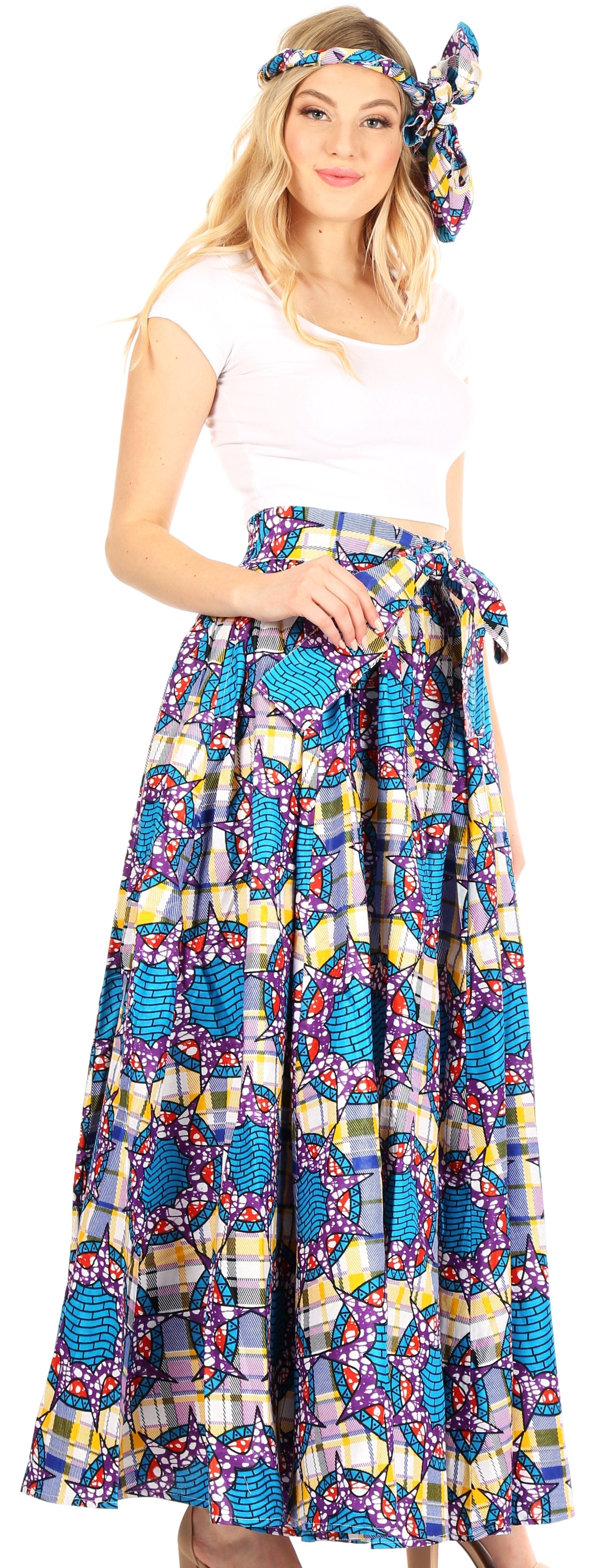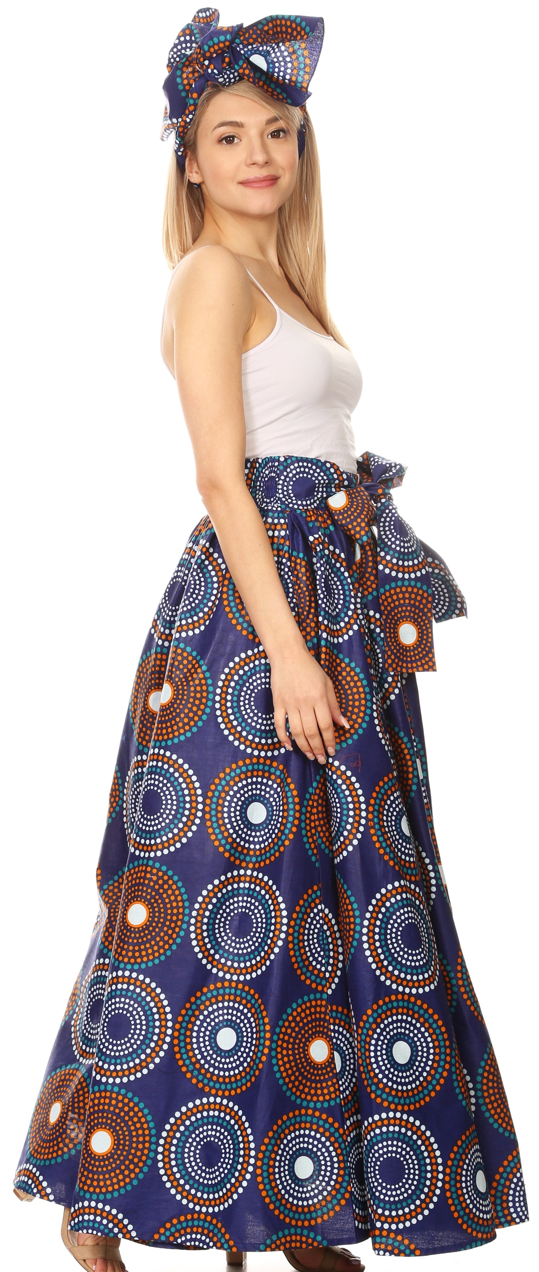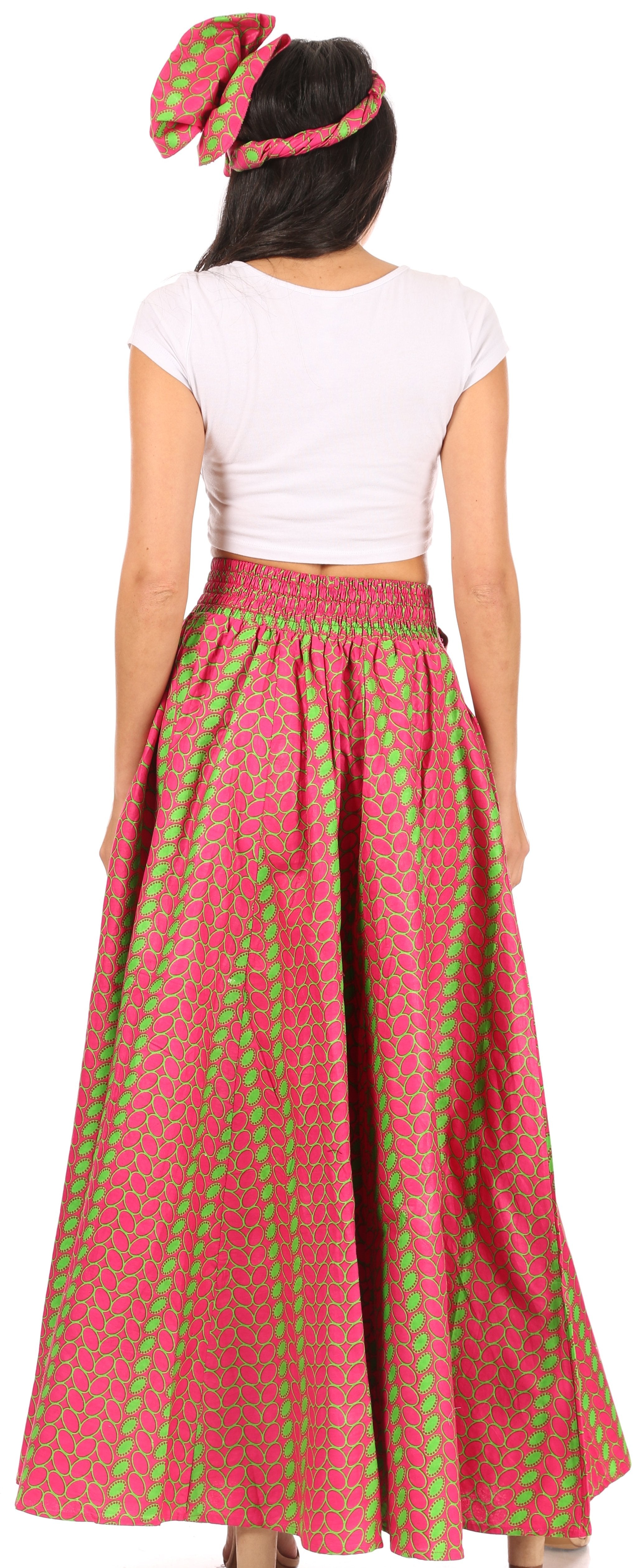 • This skirt features a long and wide flowing beautiful design. It is multi colored with a traditional wax print pattern. This skirt has pockets at the side for a total of two pockets. Pockets are deep and comfortable. A broad elastic waist band and adjustable wrap around strap allows skirt to easily convert into an elegant and carefree dress. This versatile item also features a beautiful head scarf in matching print.