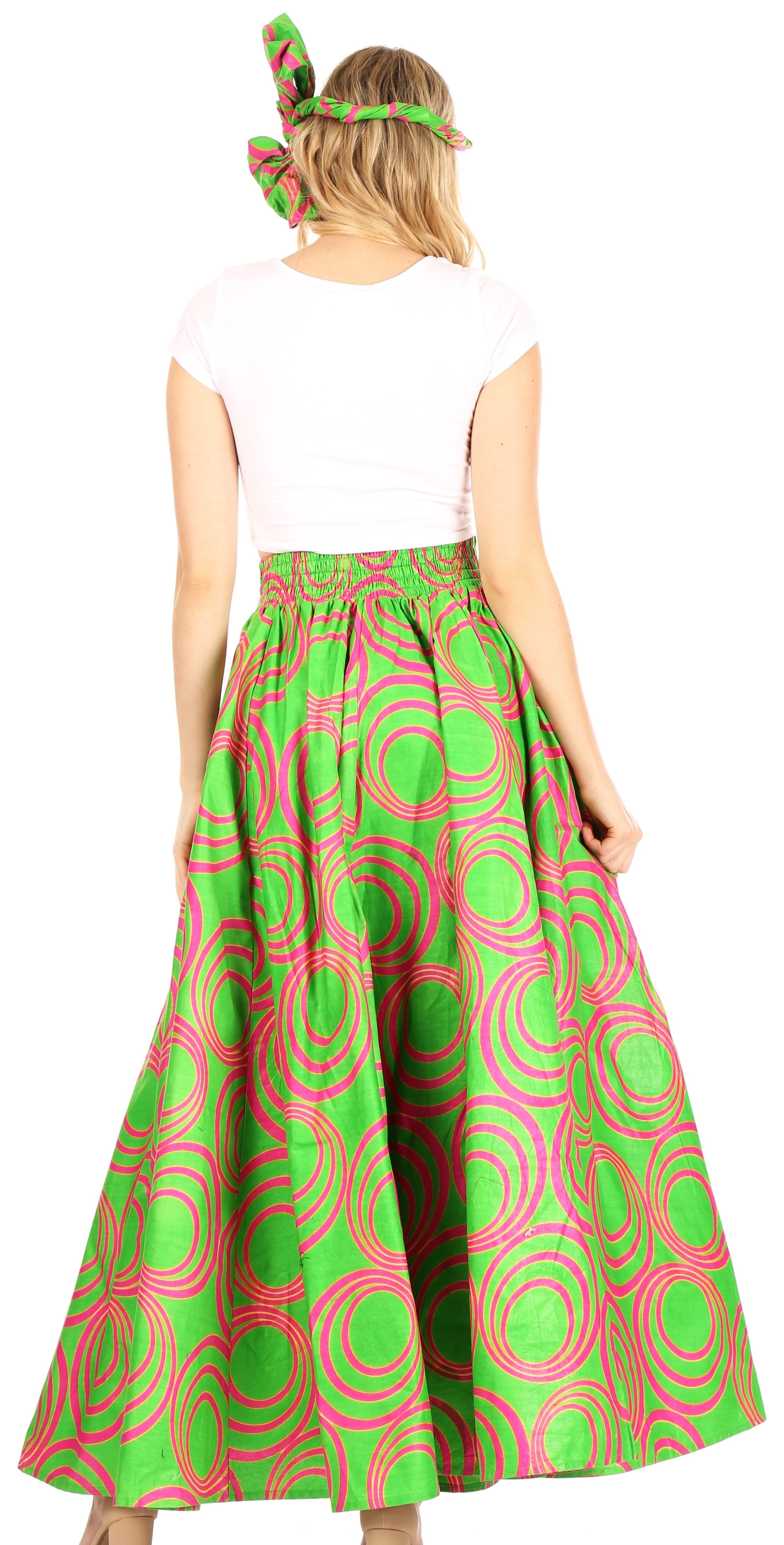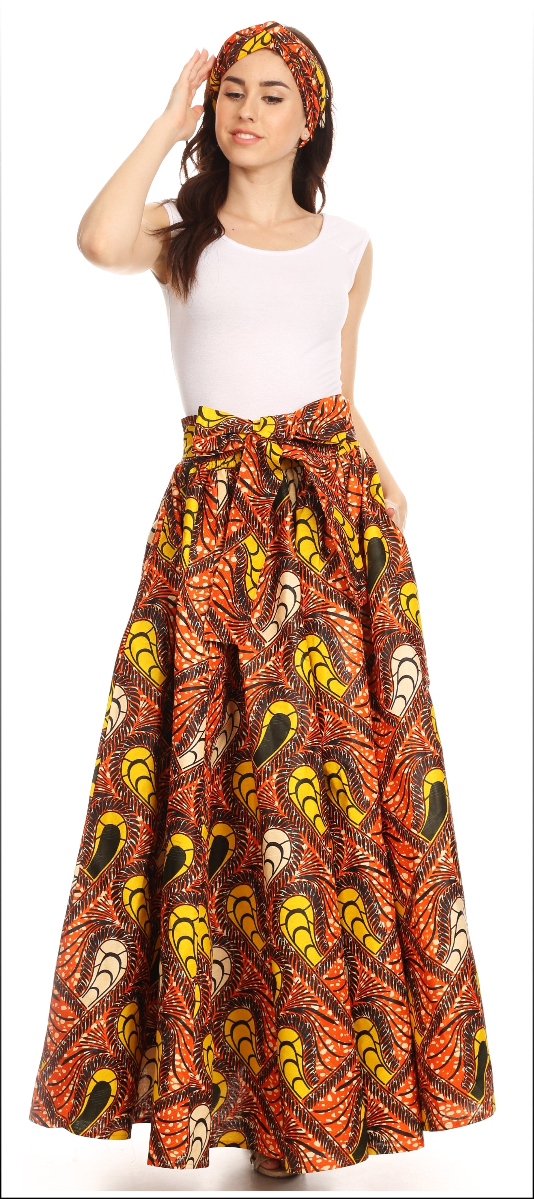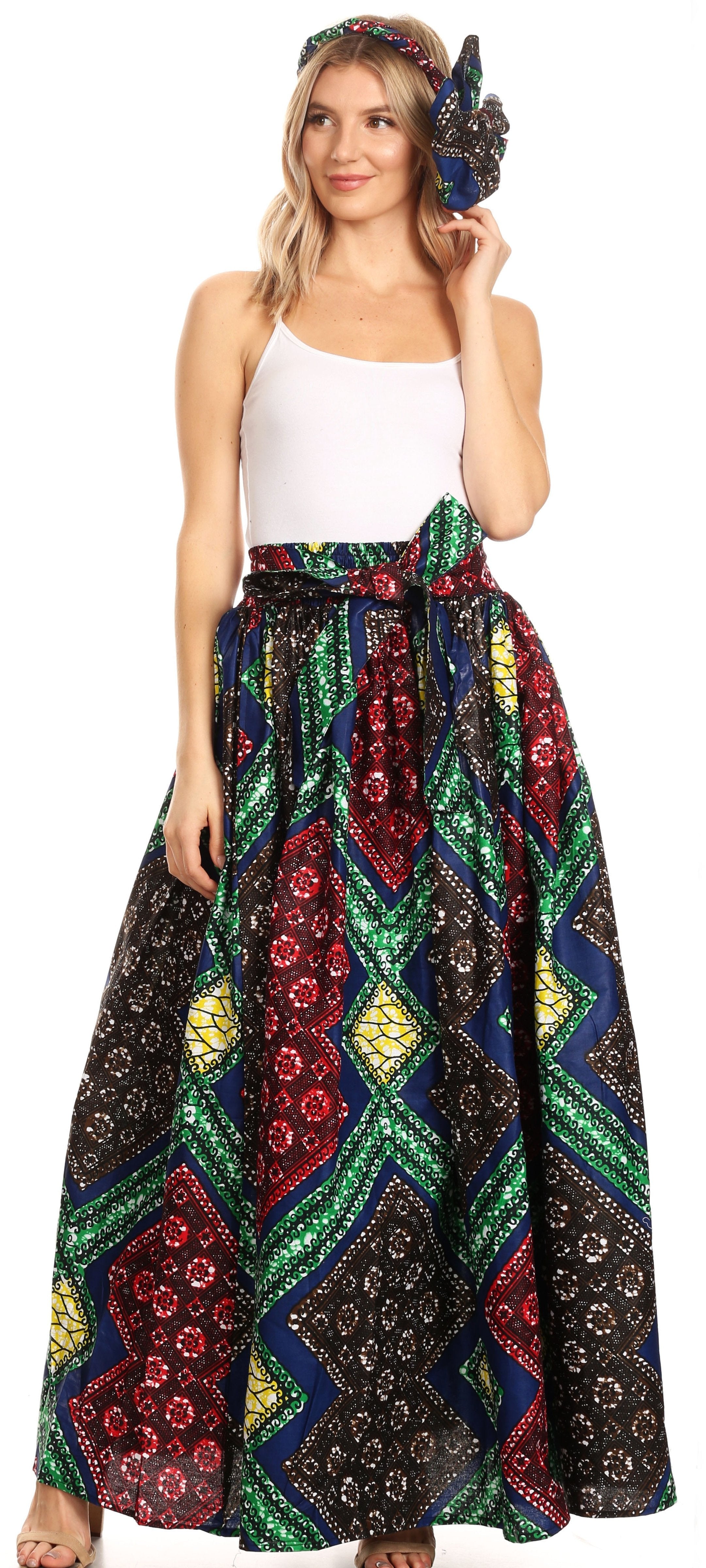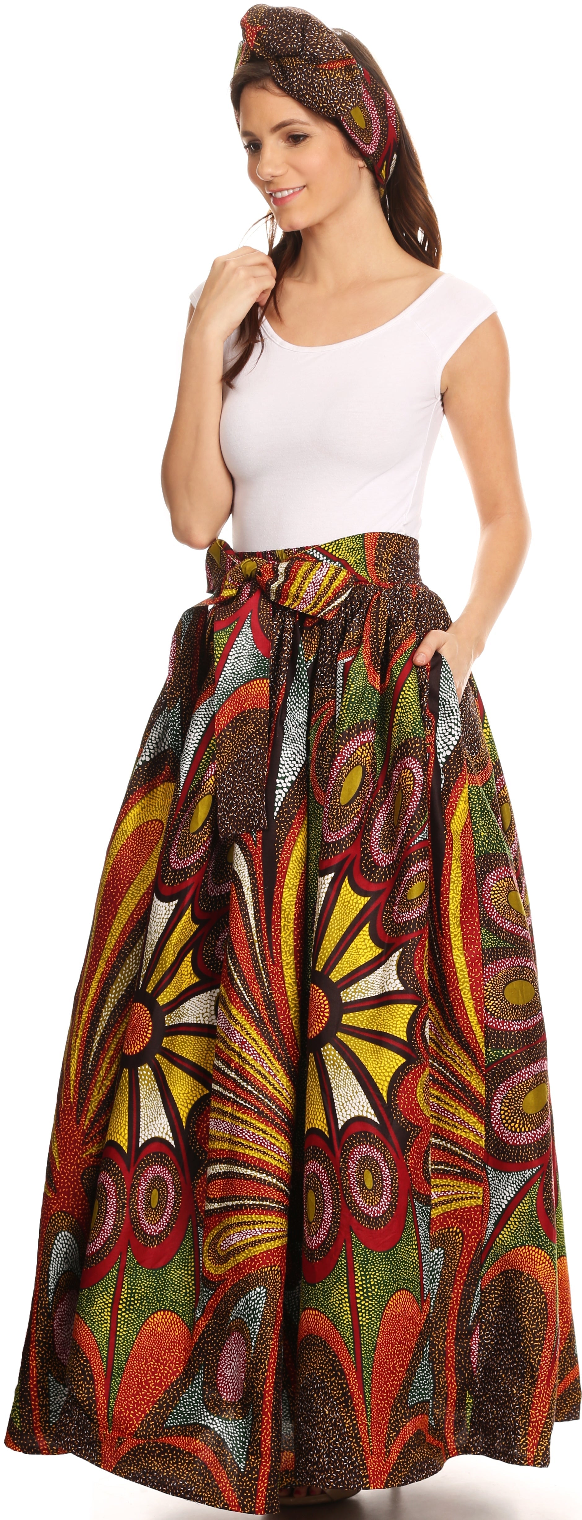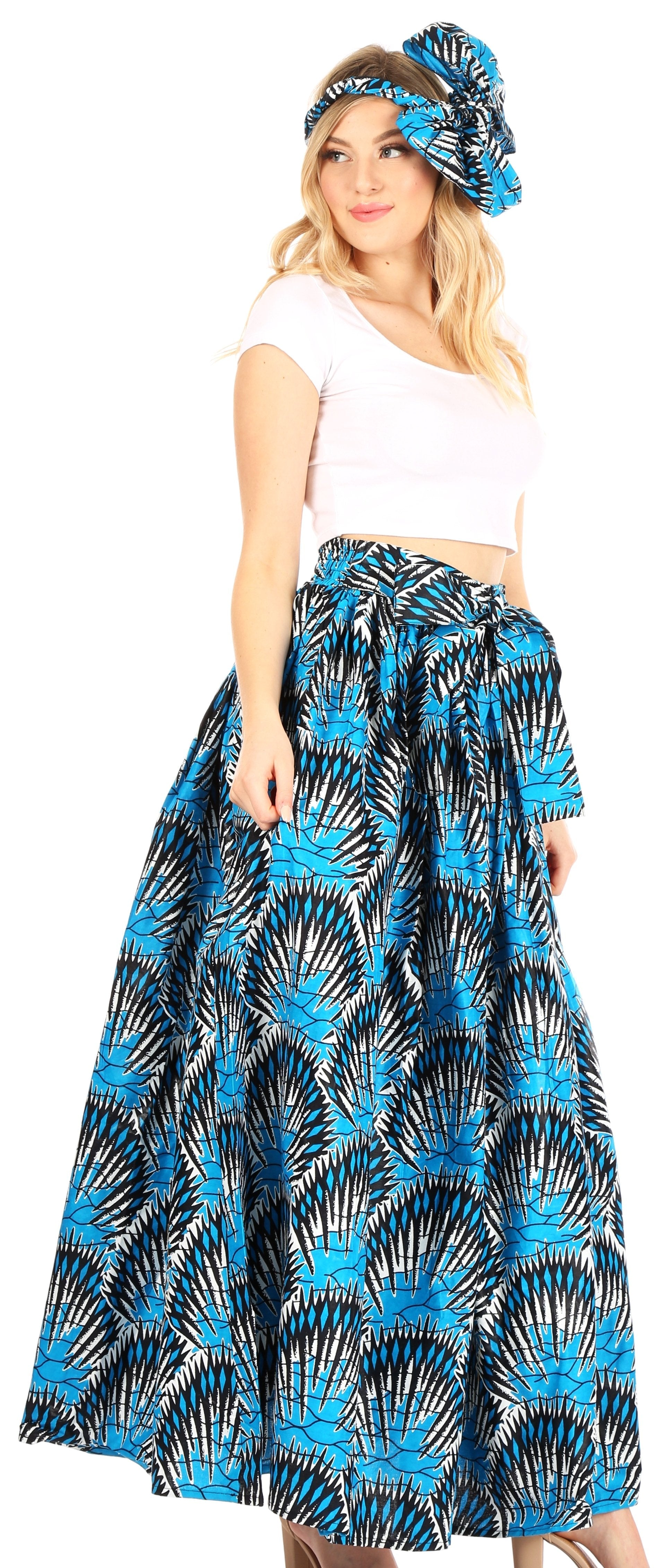 • This skirt features a long and wide flowing beautiful design. It is multi colored with a traditional wax print pattern. This skirt has pockets at the side for a total of two pockets. Pockets are deep and comfortable. A broad elastic waist band and adjustable wrap around strap allows skirt to easily convert into an elegant and carefree dress. This versatile item also features a beautiful head scarf in matching print.
