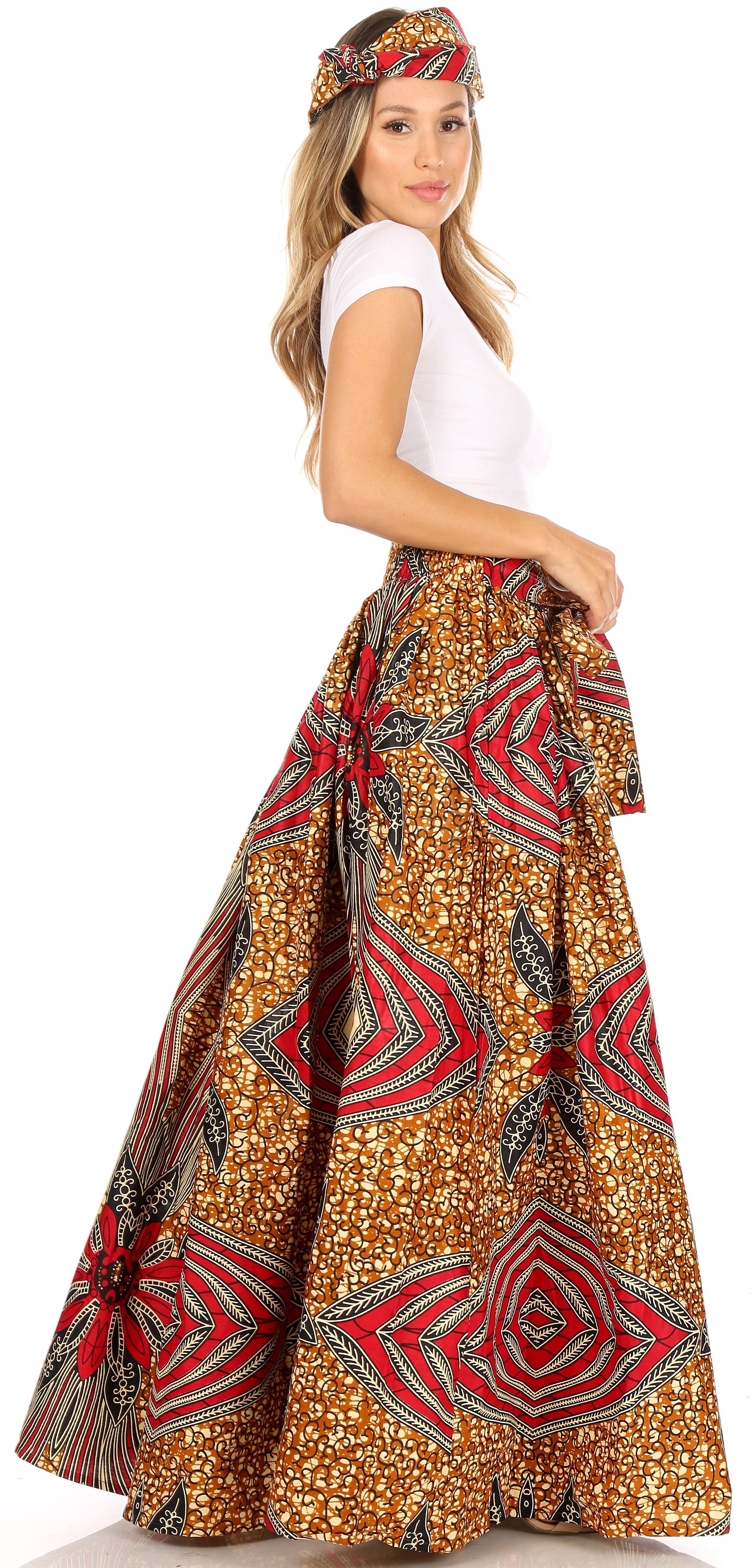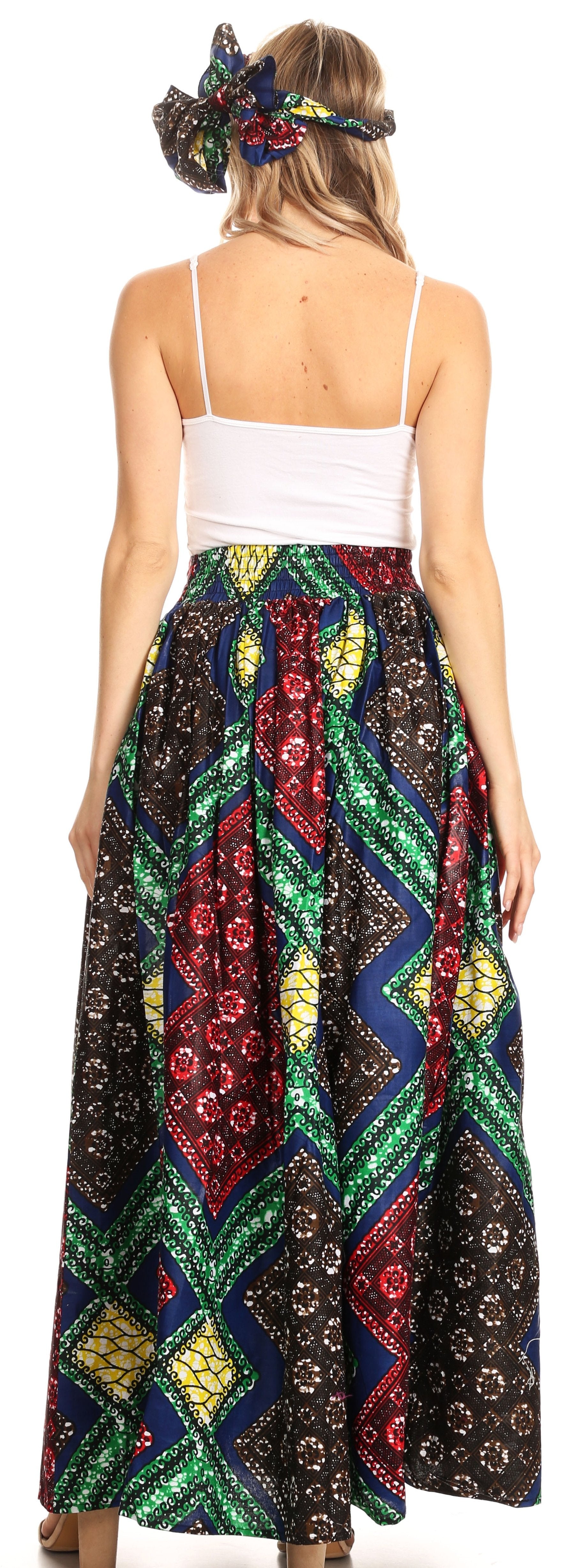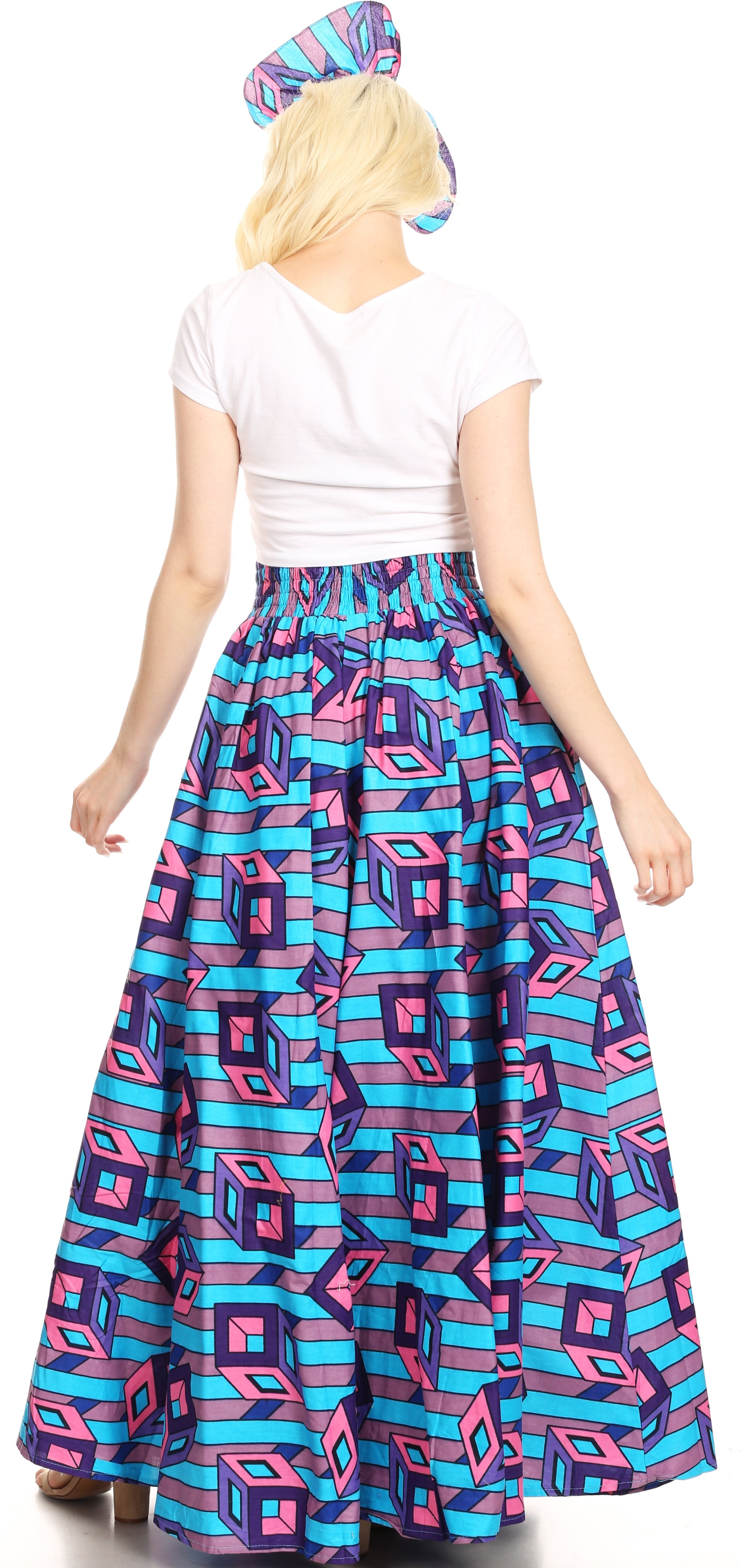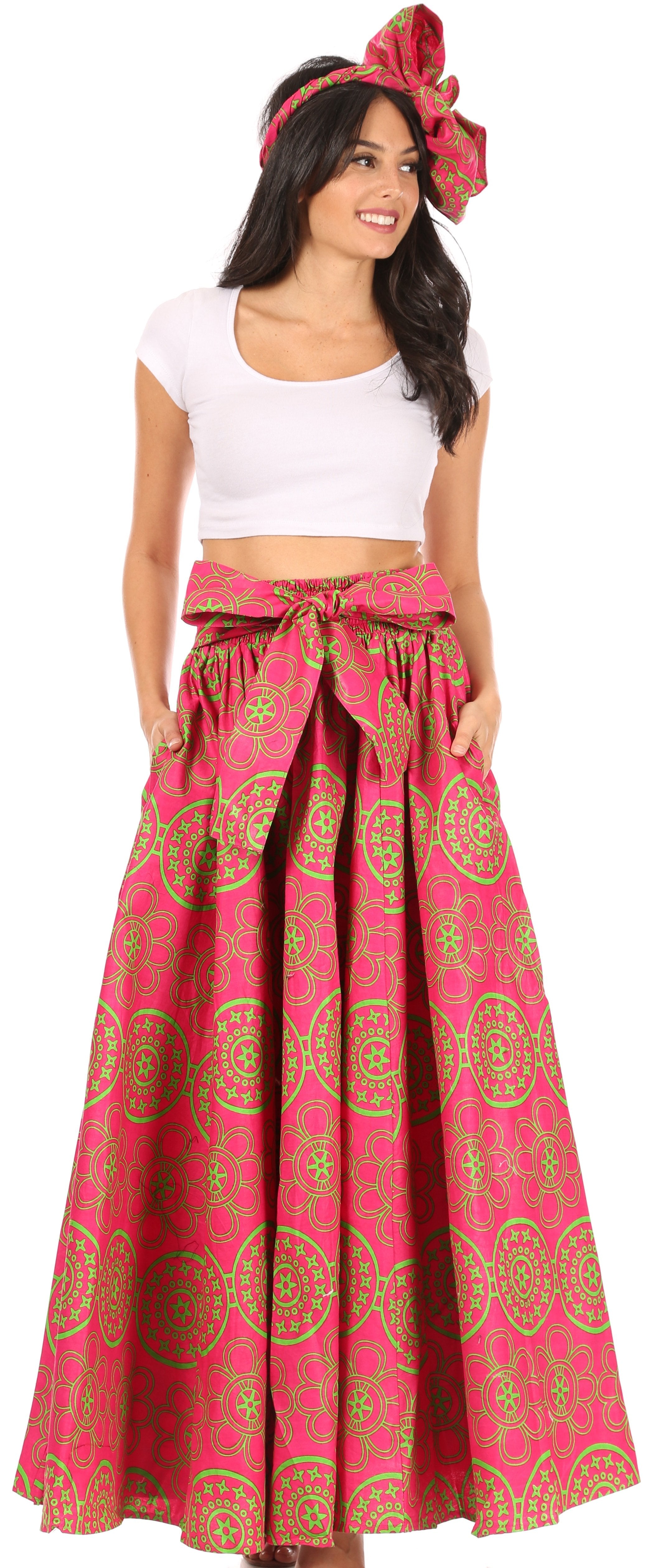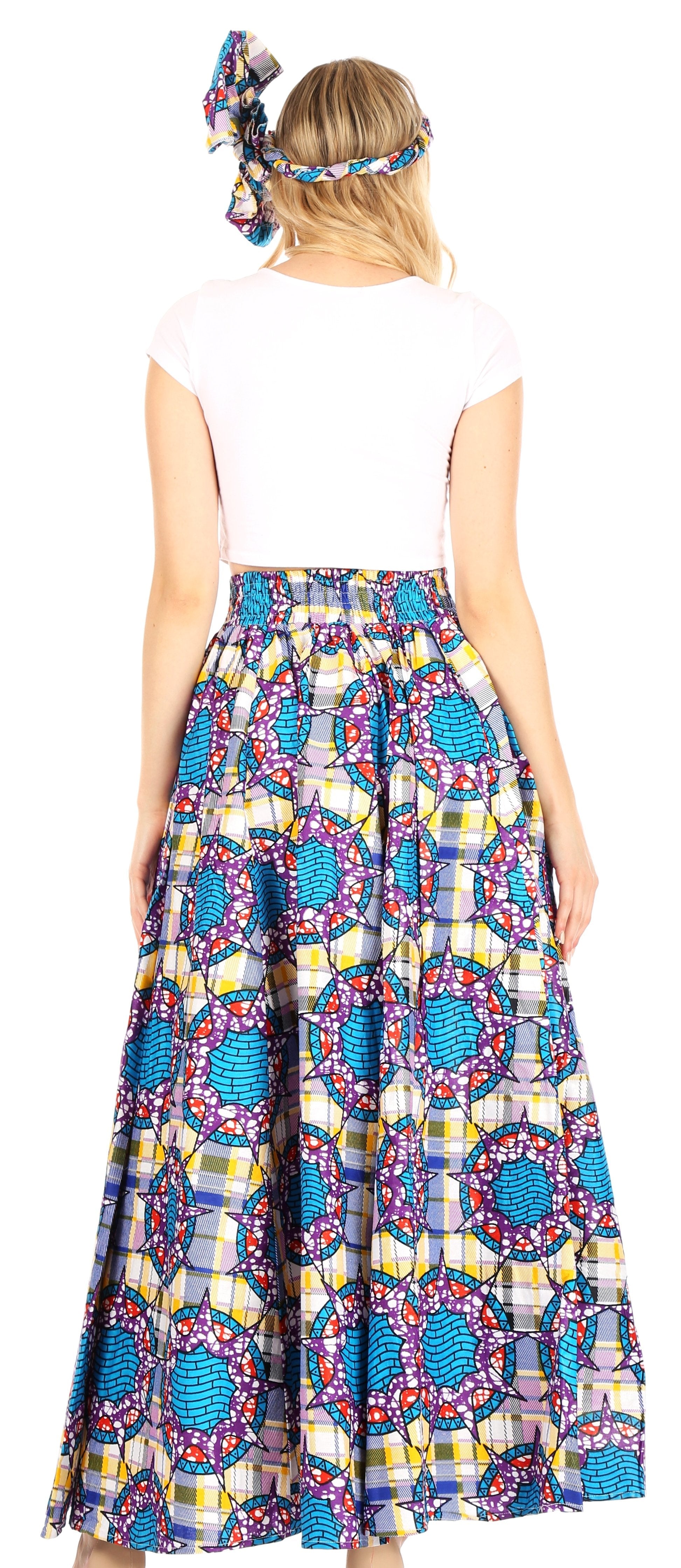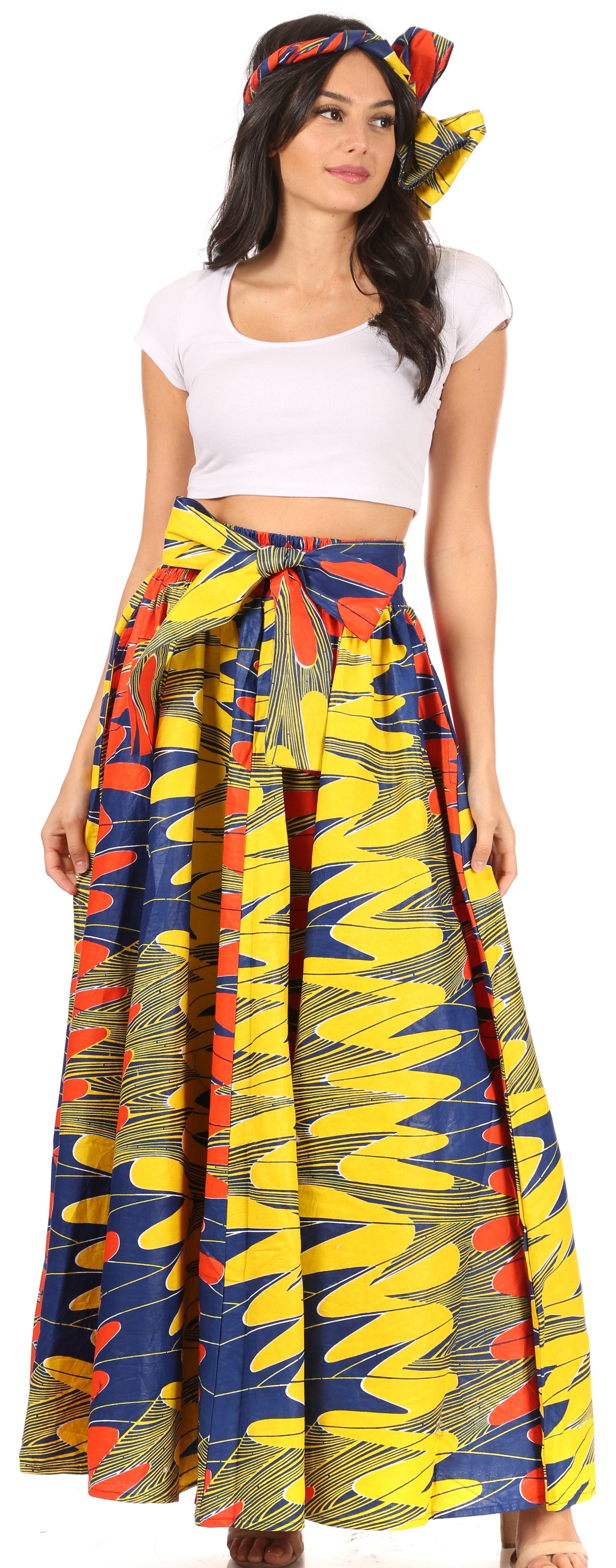 • This skirt features a long and wide flowing beautiful design. It is multi colored with a traditional wax print pattern. This skirt has pockets at the side for a total of two pockets. Pockets are deep and comfortable. A broad elastic waist band and adjustable wrap around strap allows skirt to easily convert into an elegant and carefree dress. This versatile item also features a beautiful head scarf in matching print.