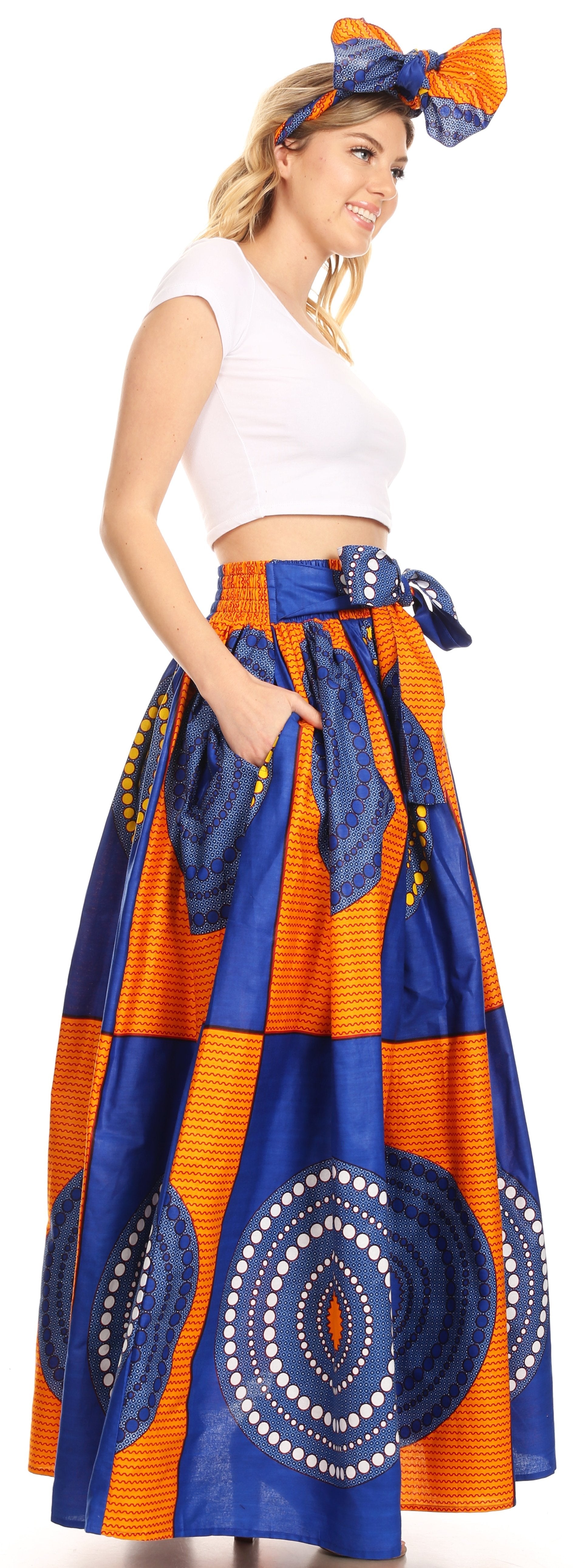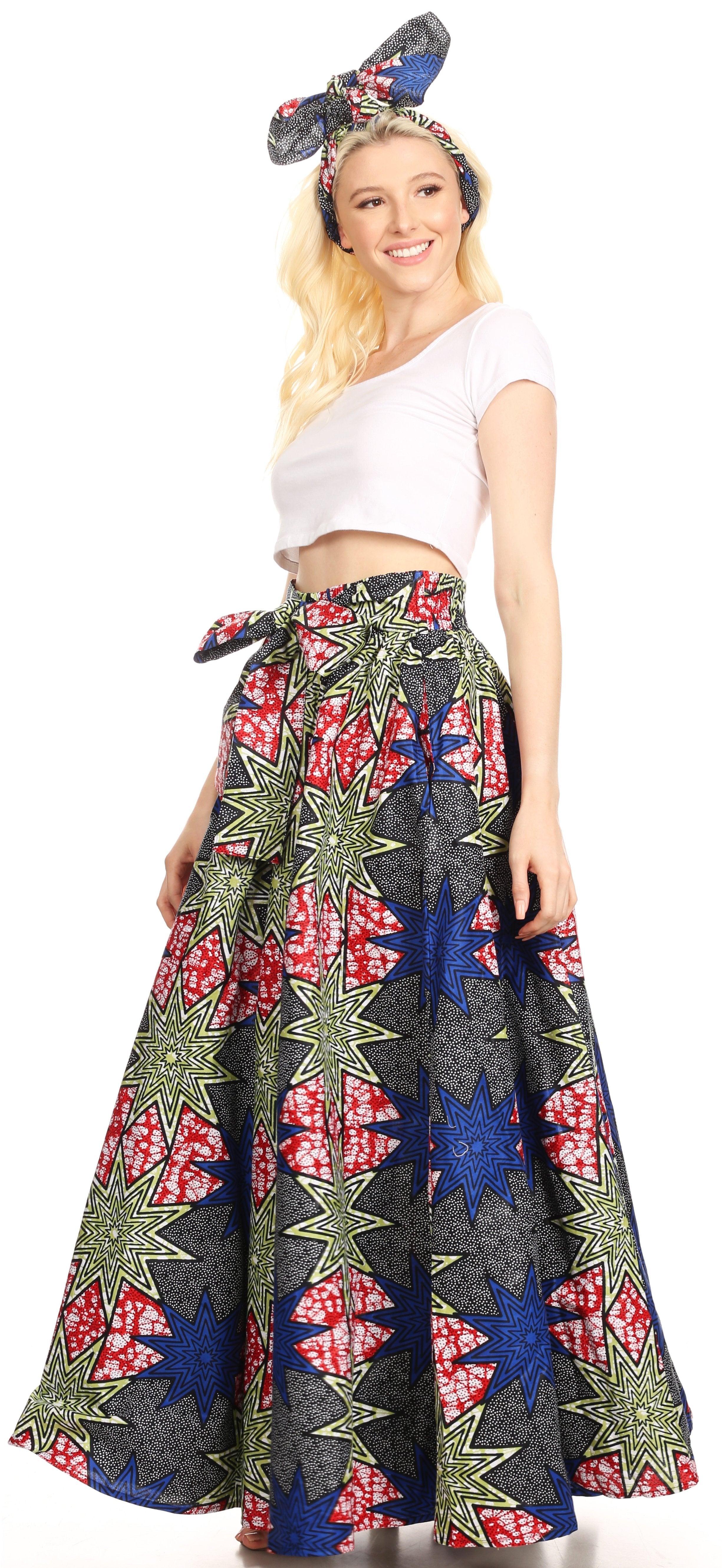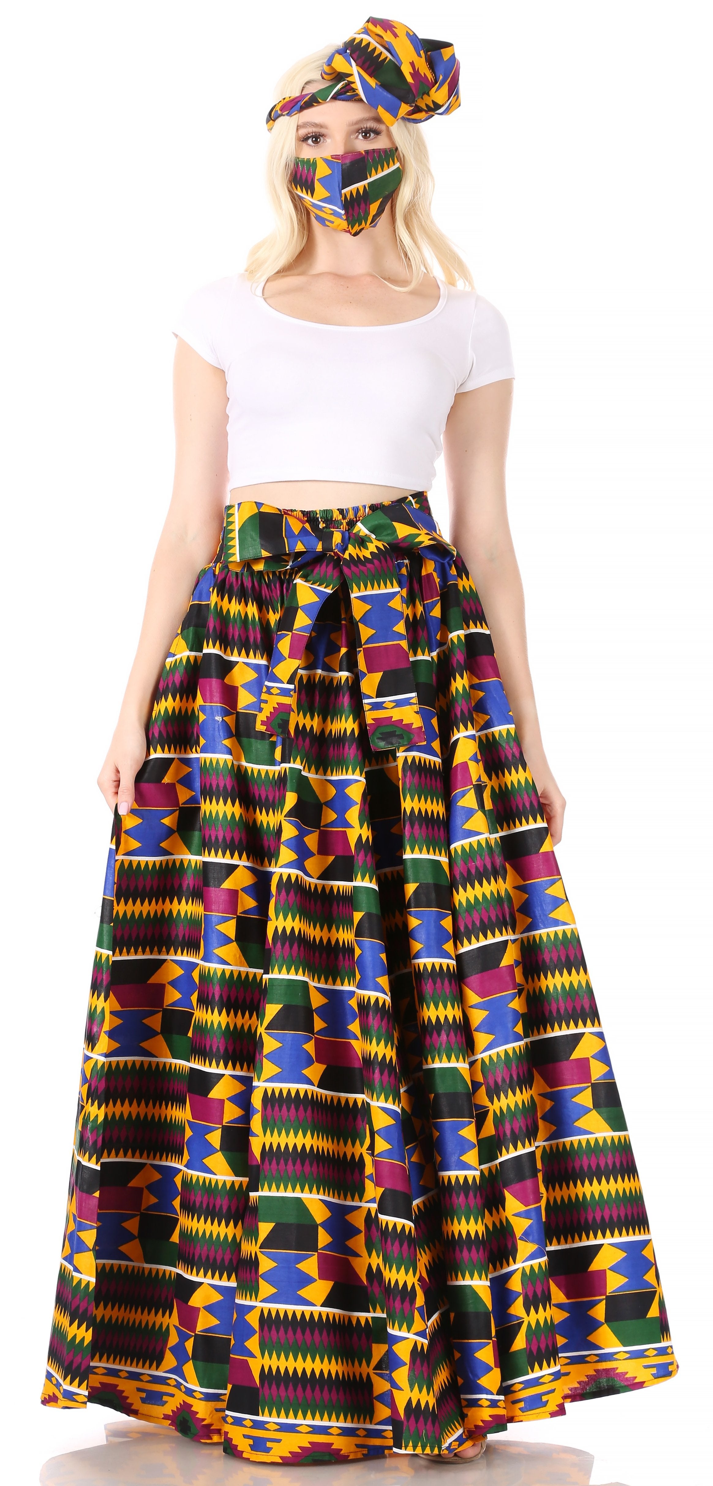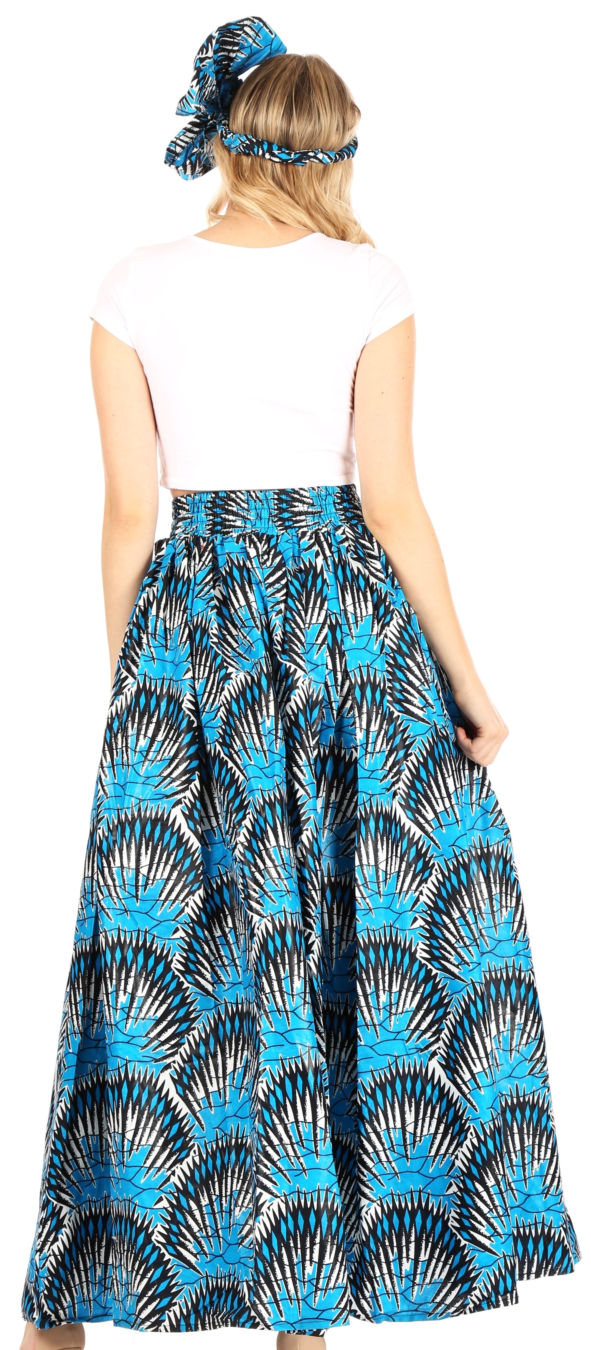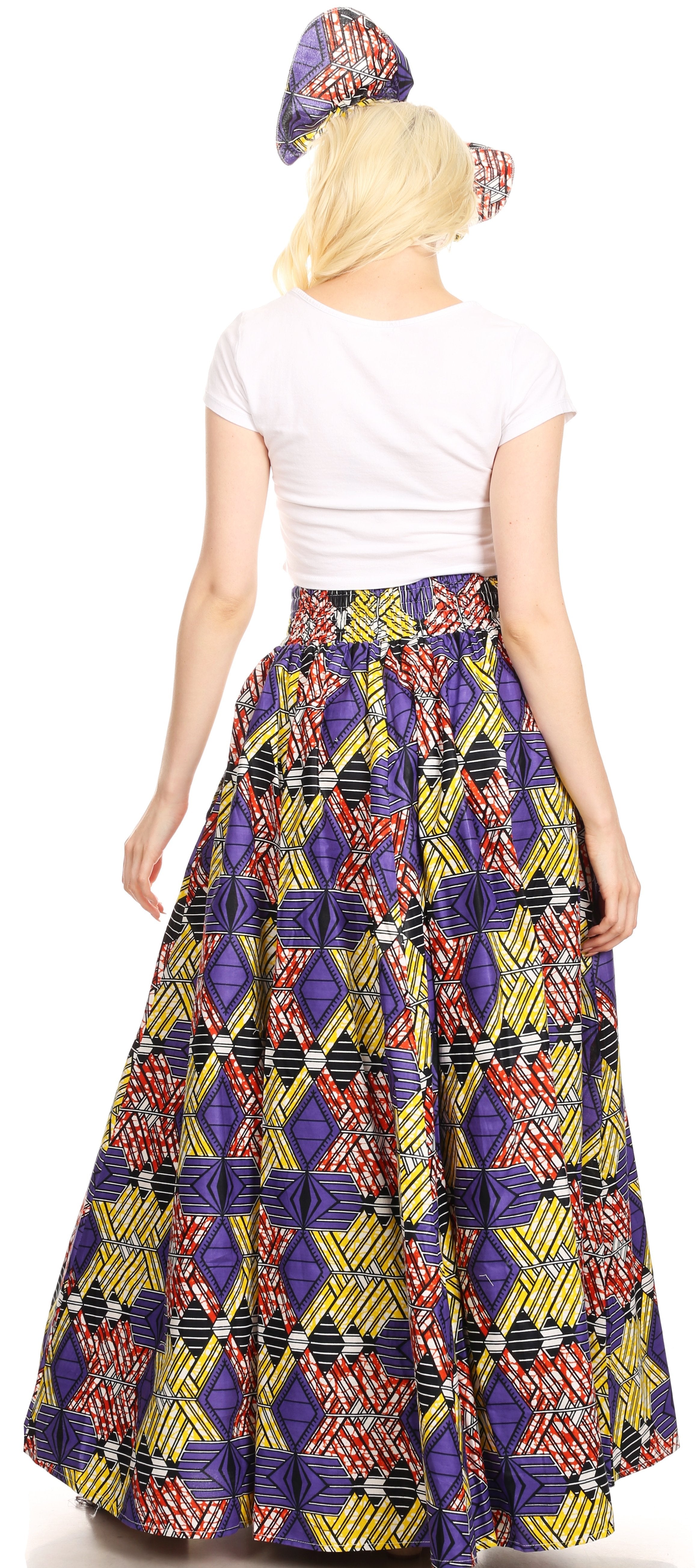 • This skirt features a long and wide flowing beautiful design. It is multi colored with a traditional wax print pattern. This skirt has pockets at the side for a total of two pockets. Pockets are deep and comfortable. A broad elastic waist band and adjustable wrap around strap allows skirt to easily convert into an elegant and carefree dress. This versatile item also features a beautiful head scarf in matching print.