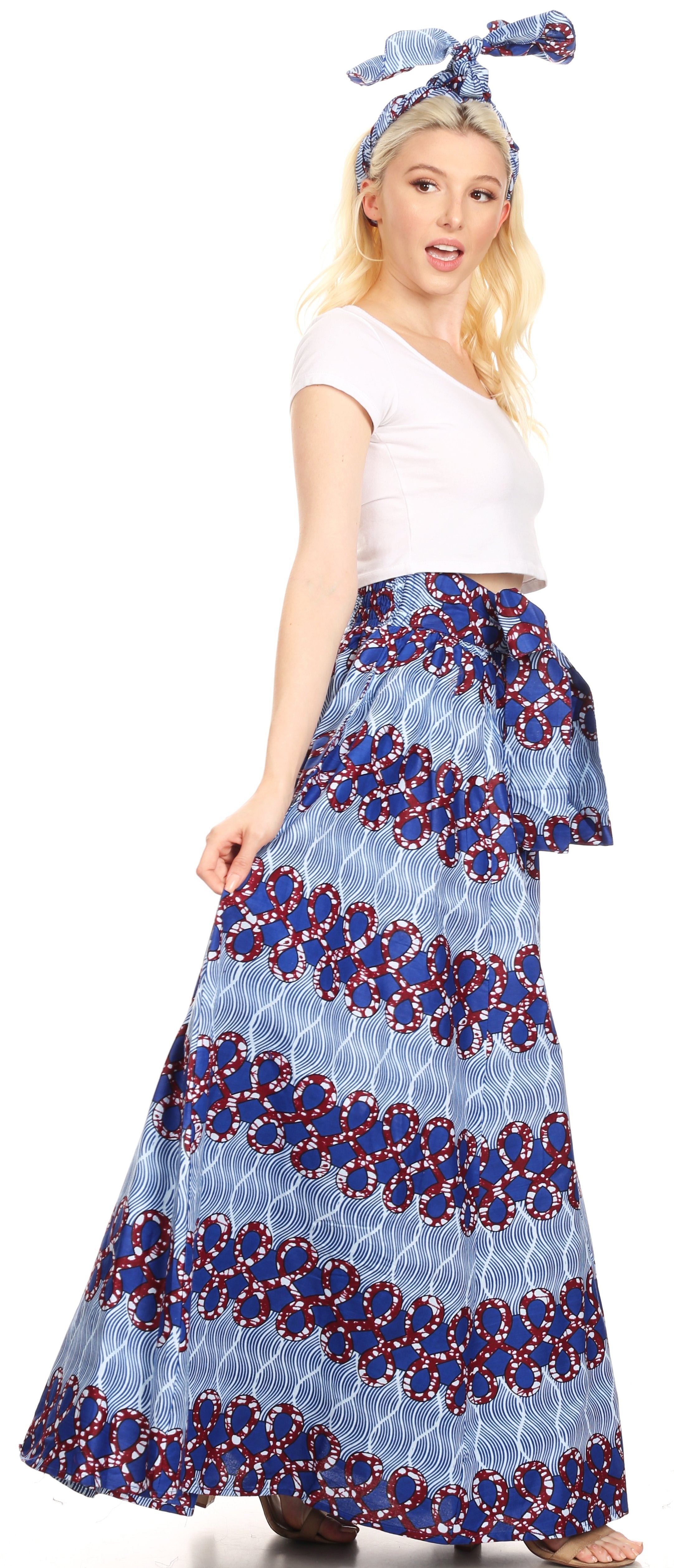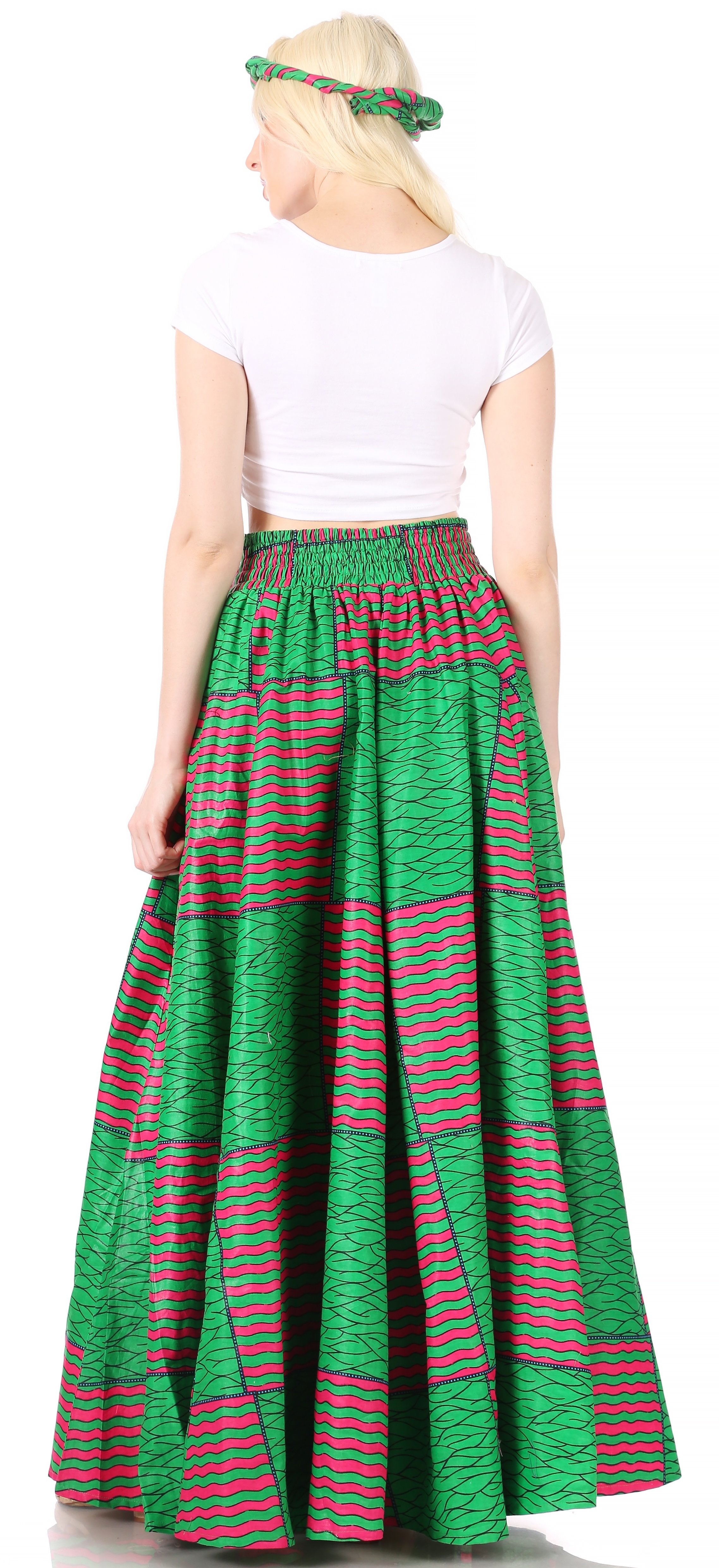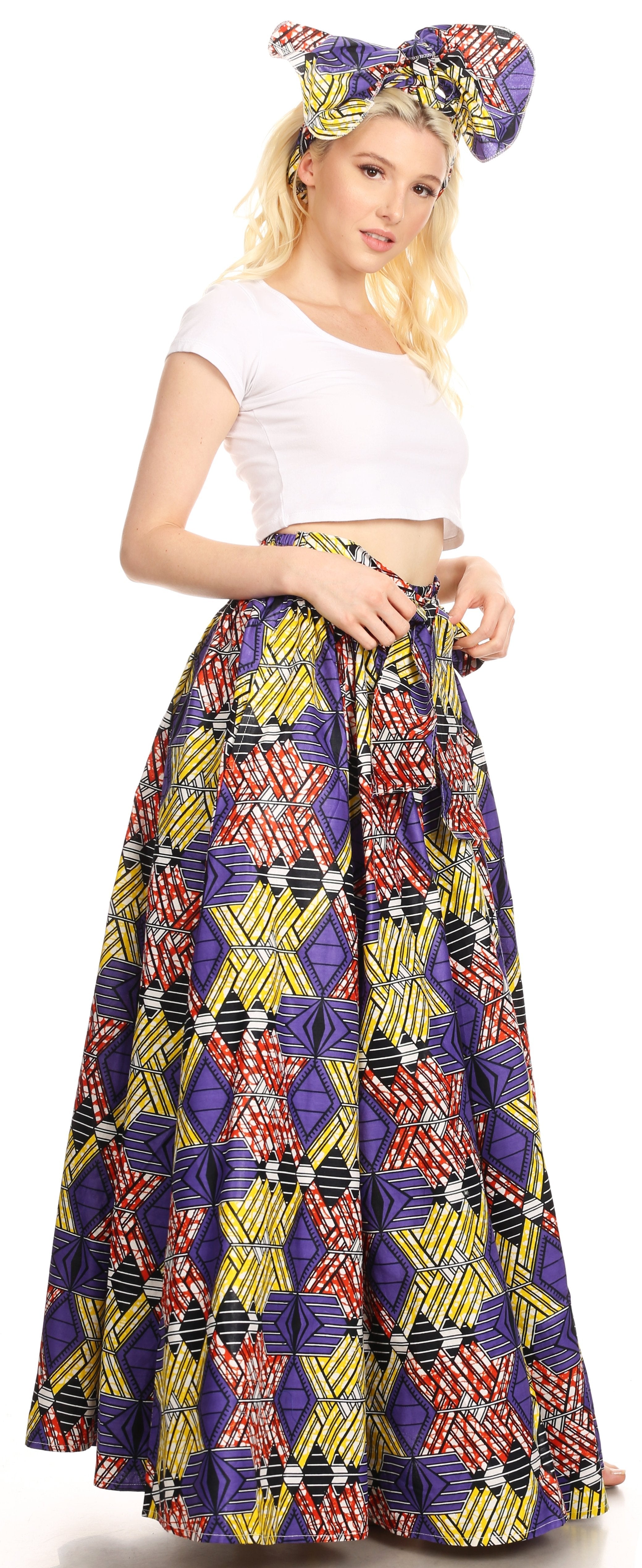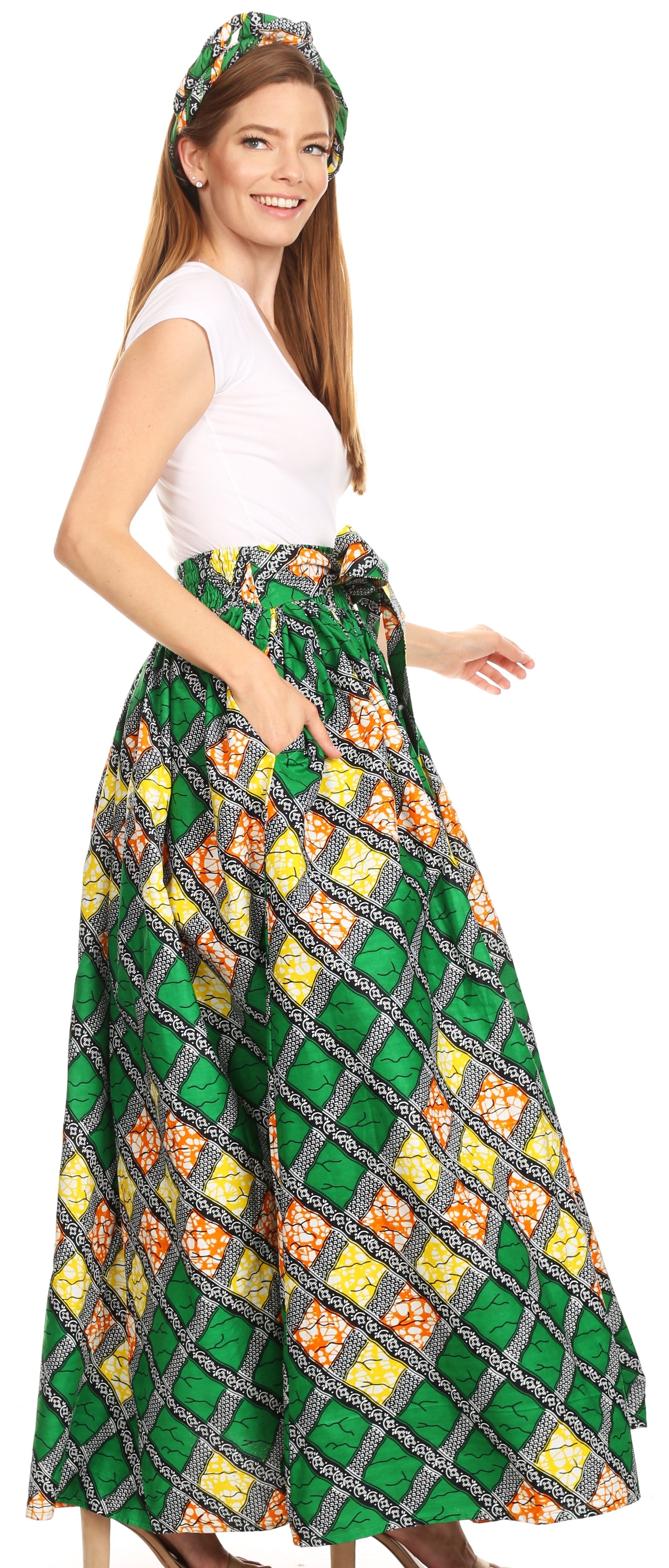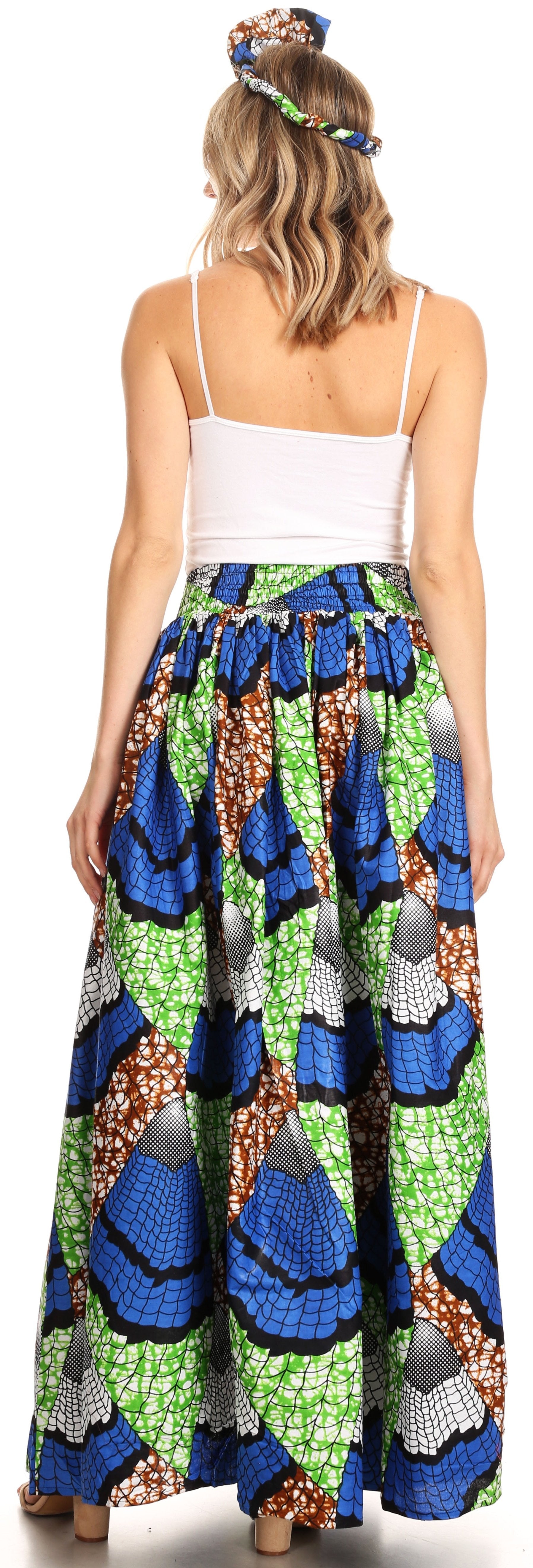 • This skirt features a long and wide flowing beautiful design. It is multi colored with a traditional wax print pattern. This skirt has pockets at the side for a total of two pockets. Pockets are deep and comfortable. A broad elastic waist band and adjustable wrap around strap allows skirt to easily convert into an elegant and carefree dress. This versatile item also features a beautiful head scarf in matching print.