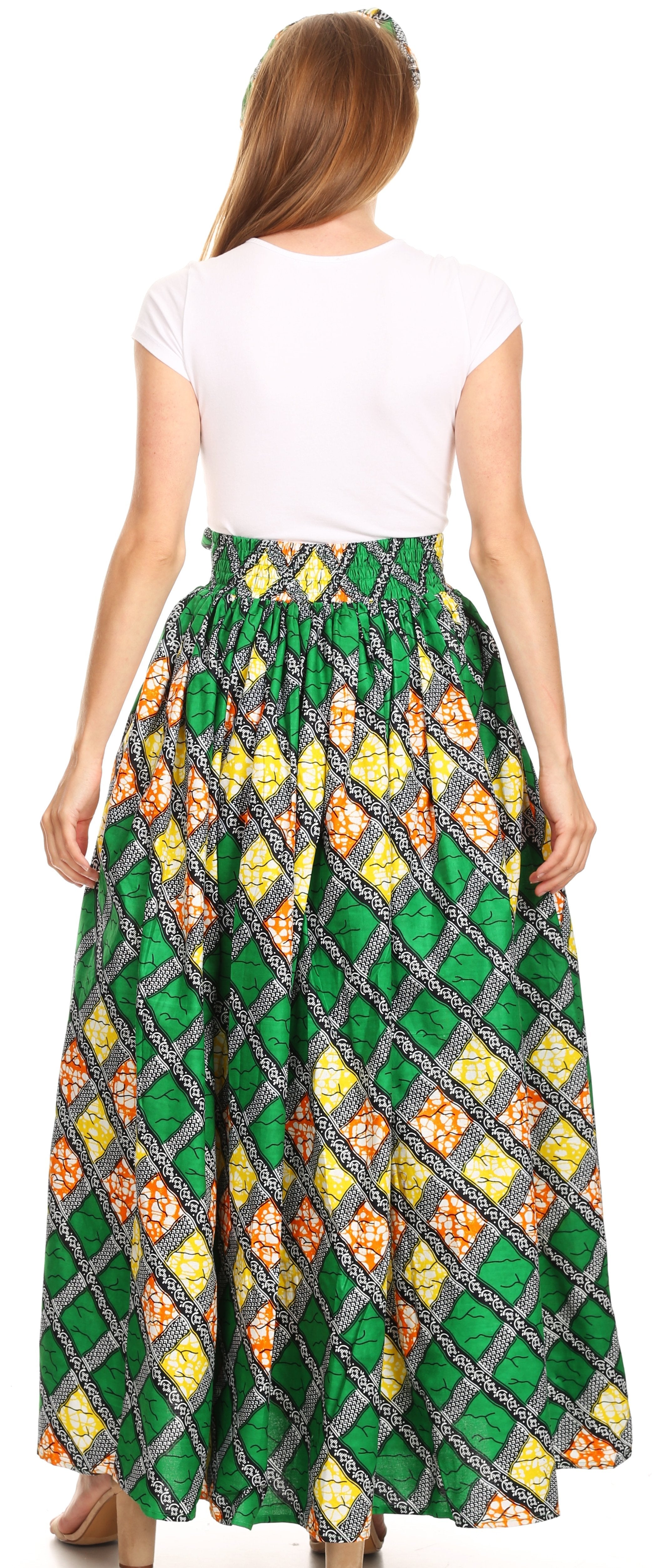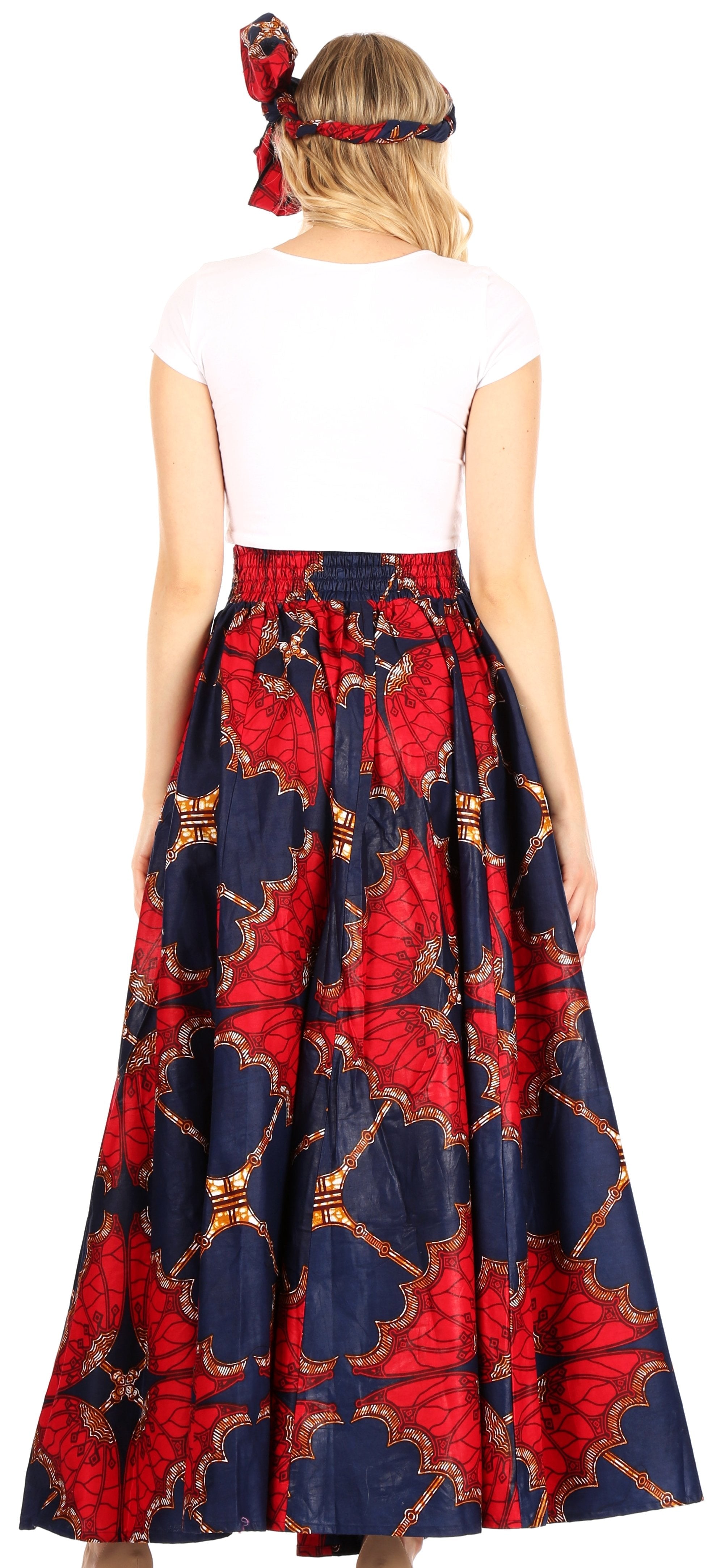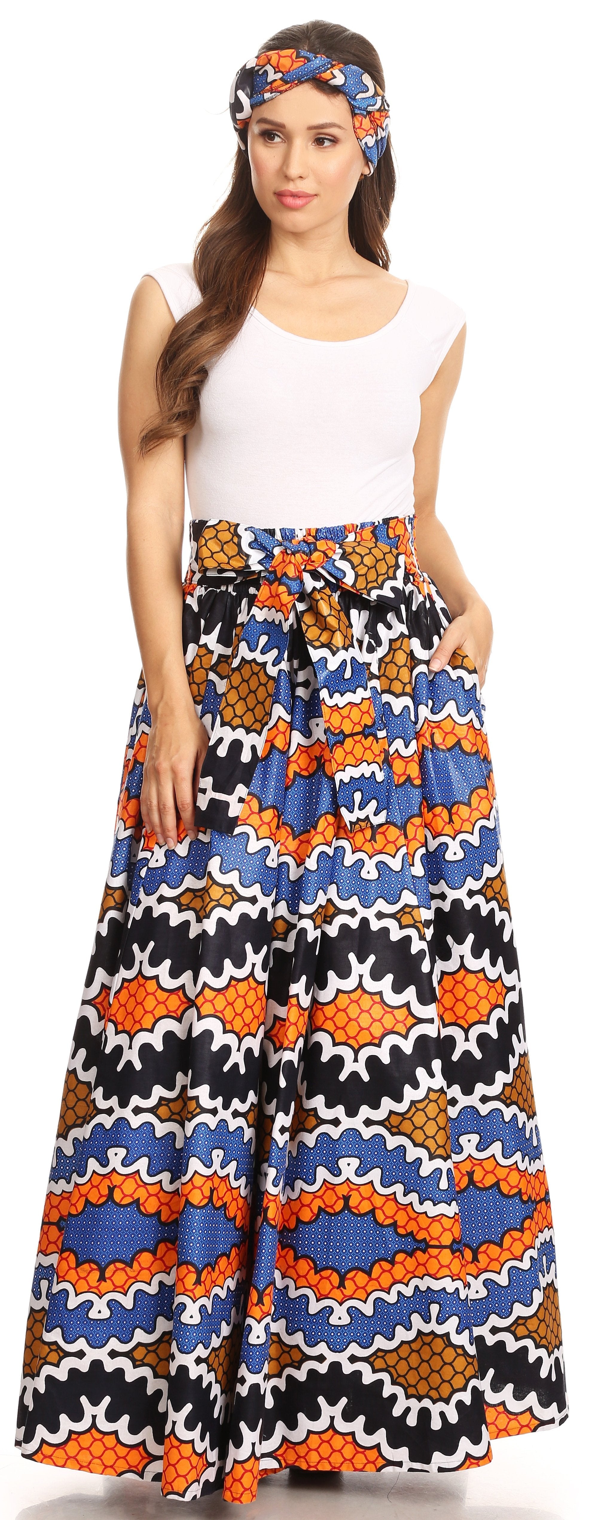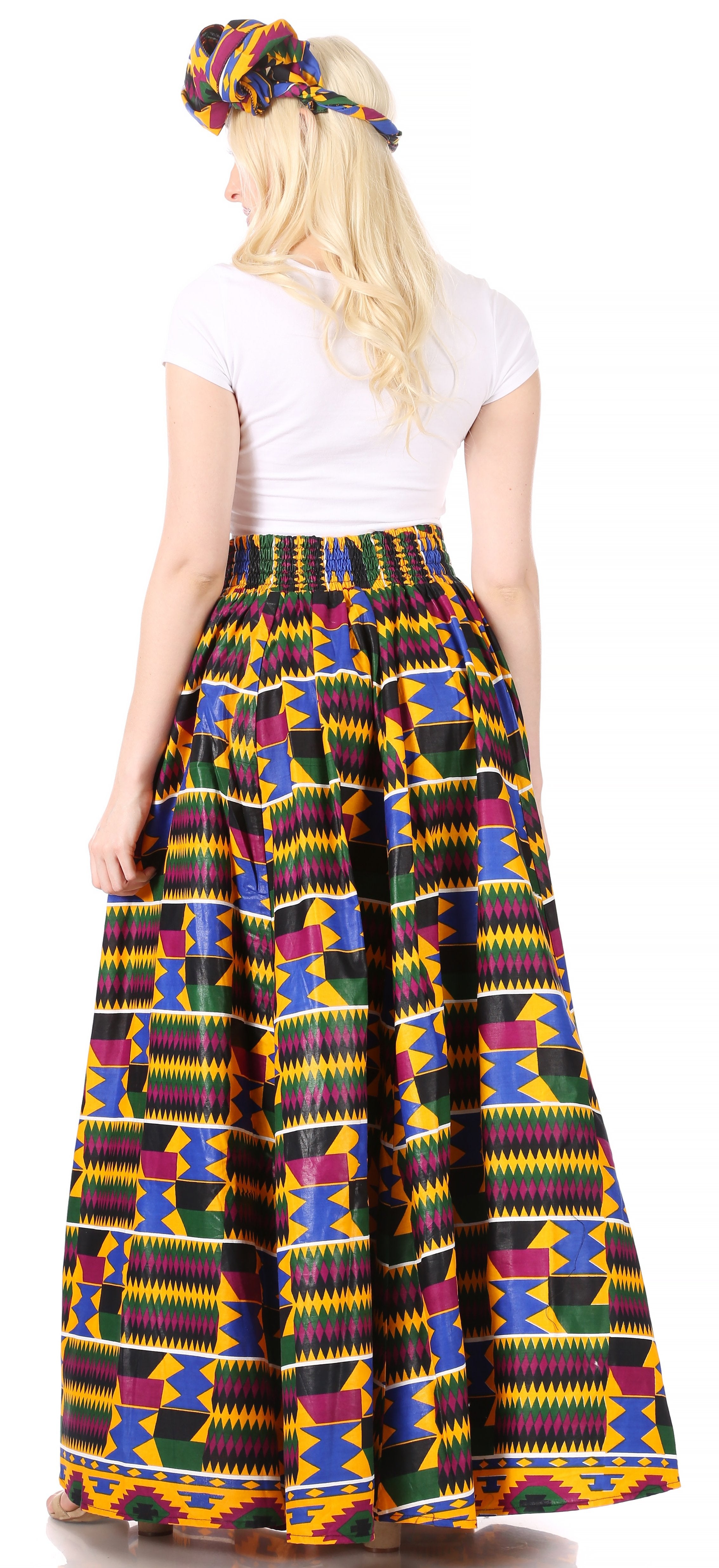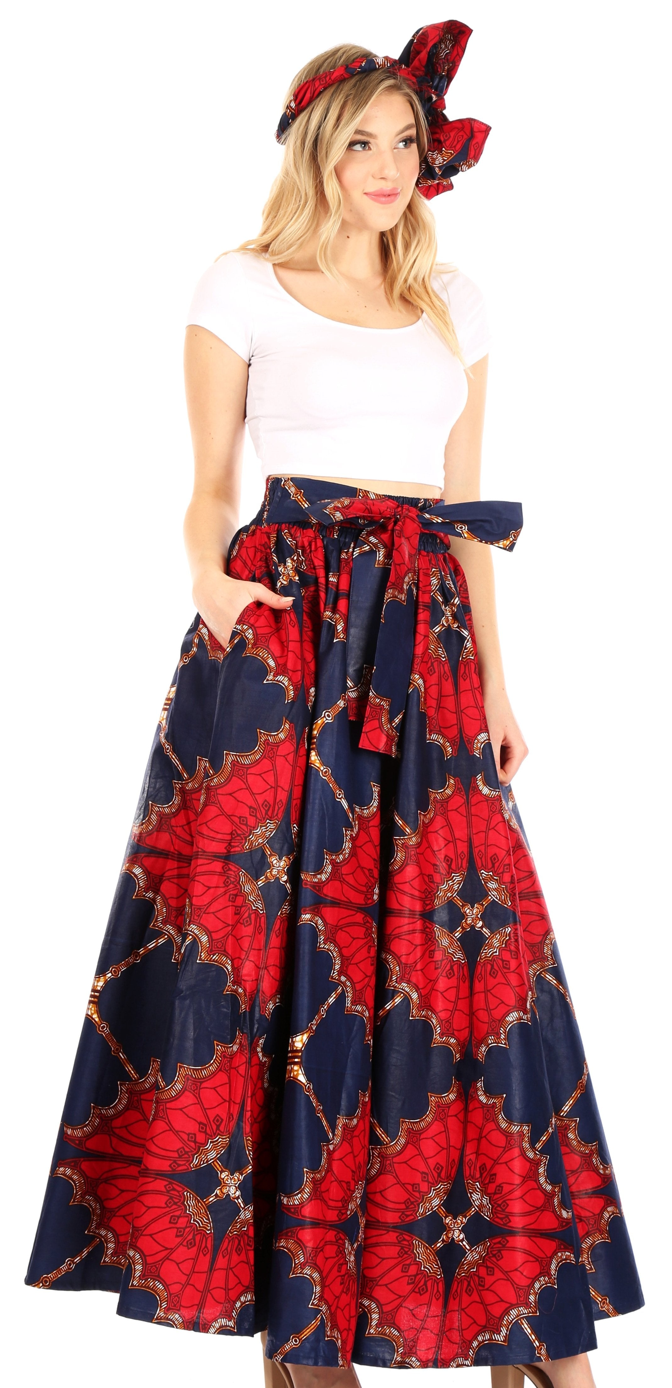 • This skirt features a long and wide flowing beautiful design. It is multi colored with a traditional wax print pattern. This skirt has pockets at the side for a total of two pockets. Pockets are deep and comfortable. A broad elastic waist band and adjustable wrap around strap allows skirt to easily convert into an elegant and carefree dress. This versatile item also features a beautiful head scarf in matching print.