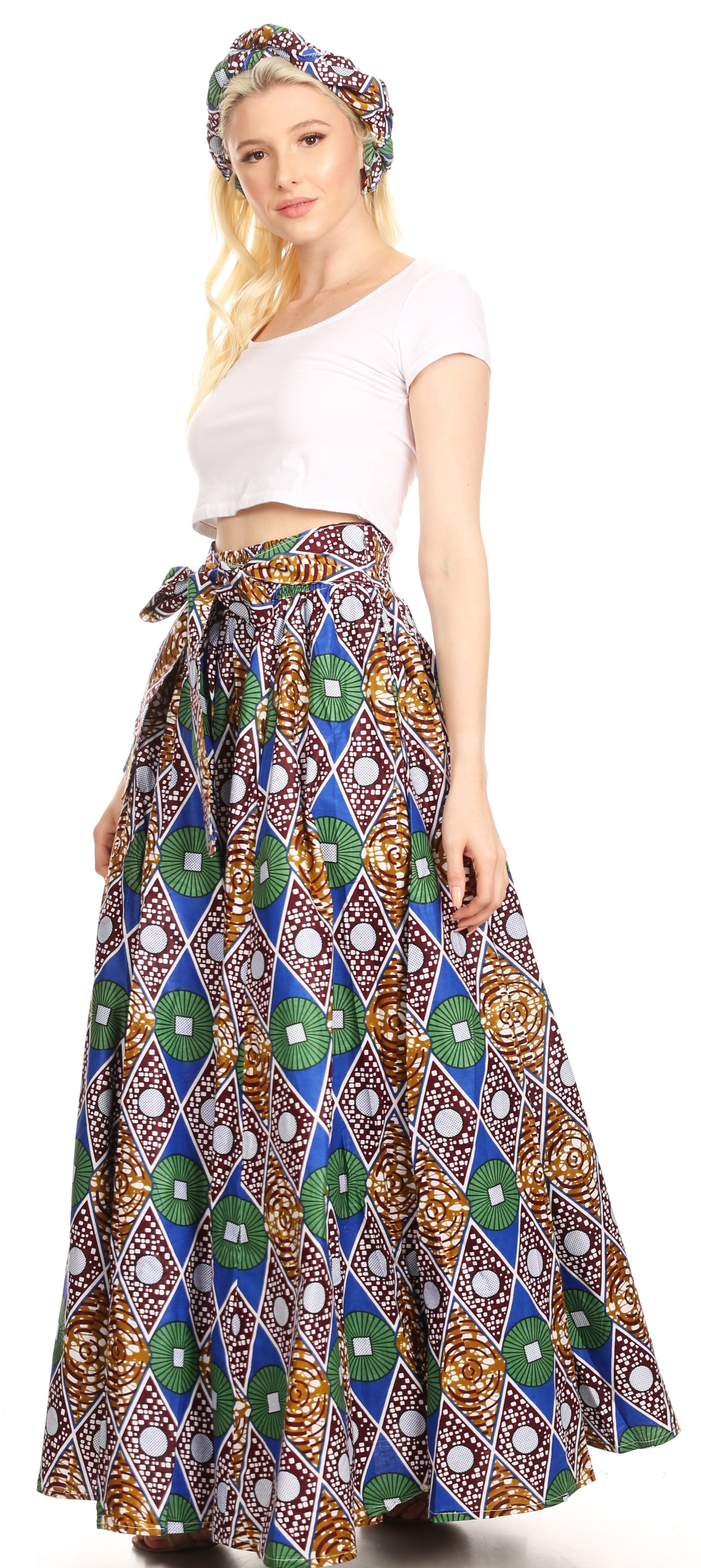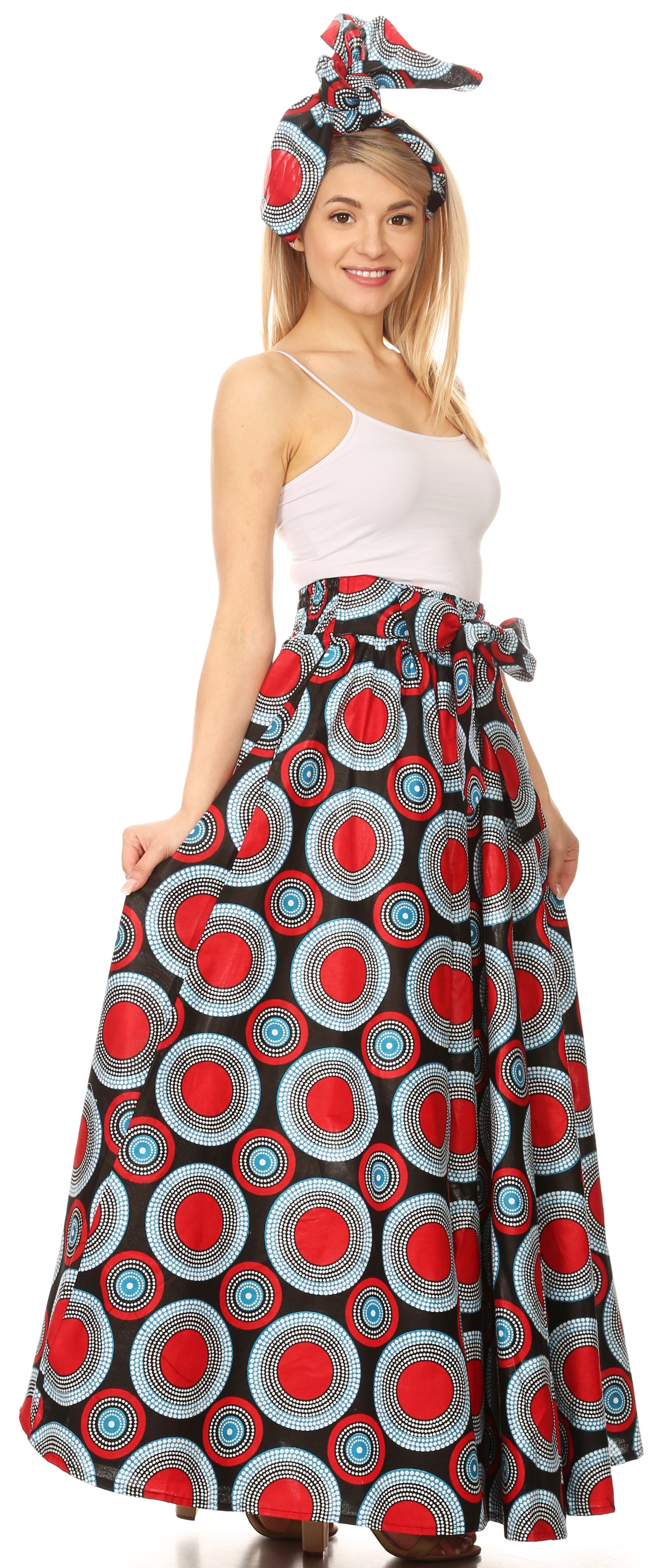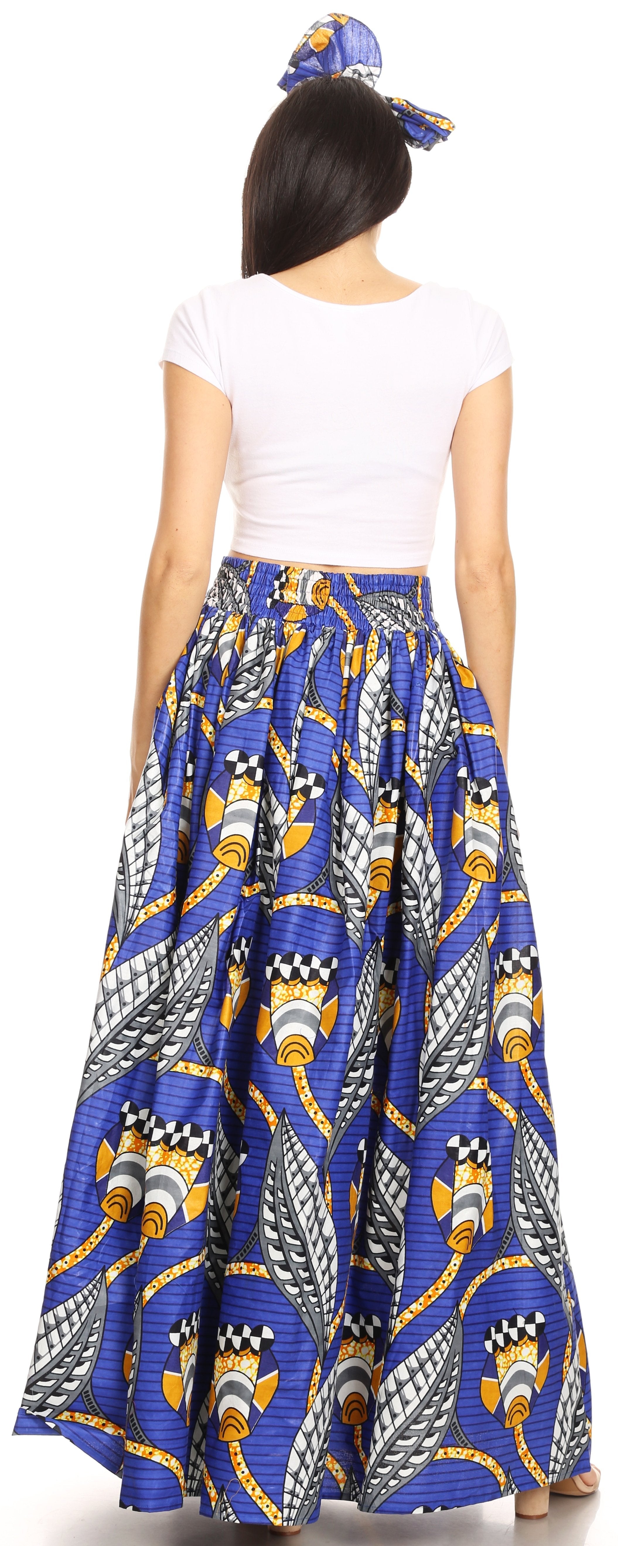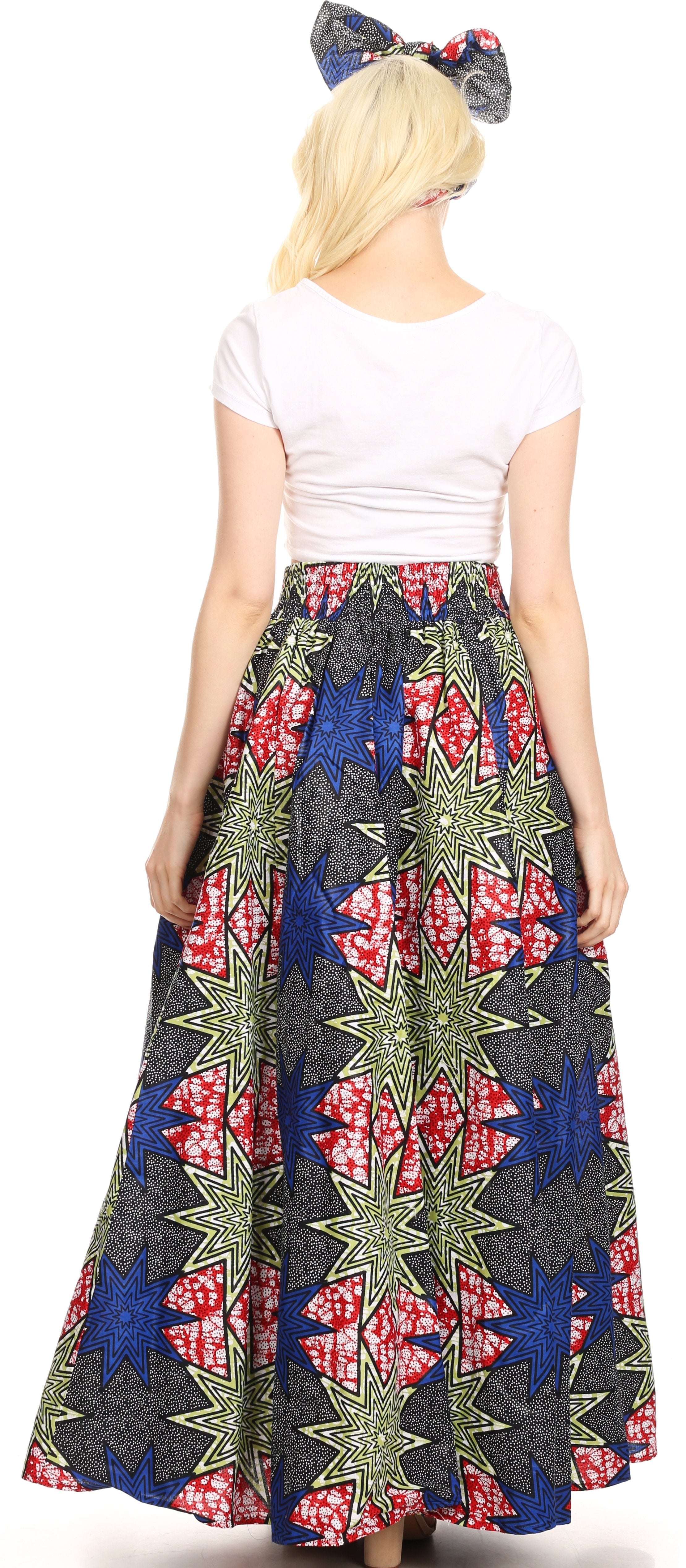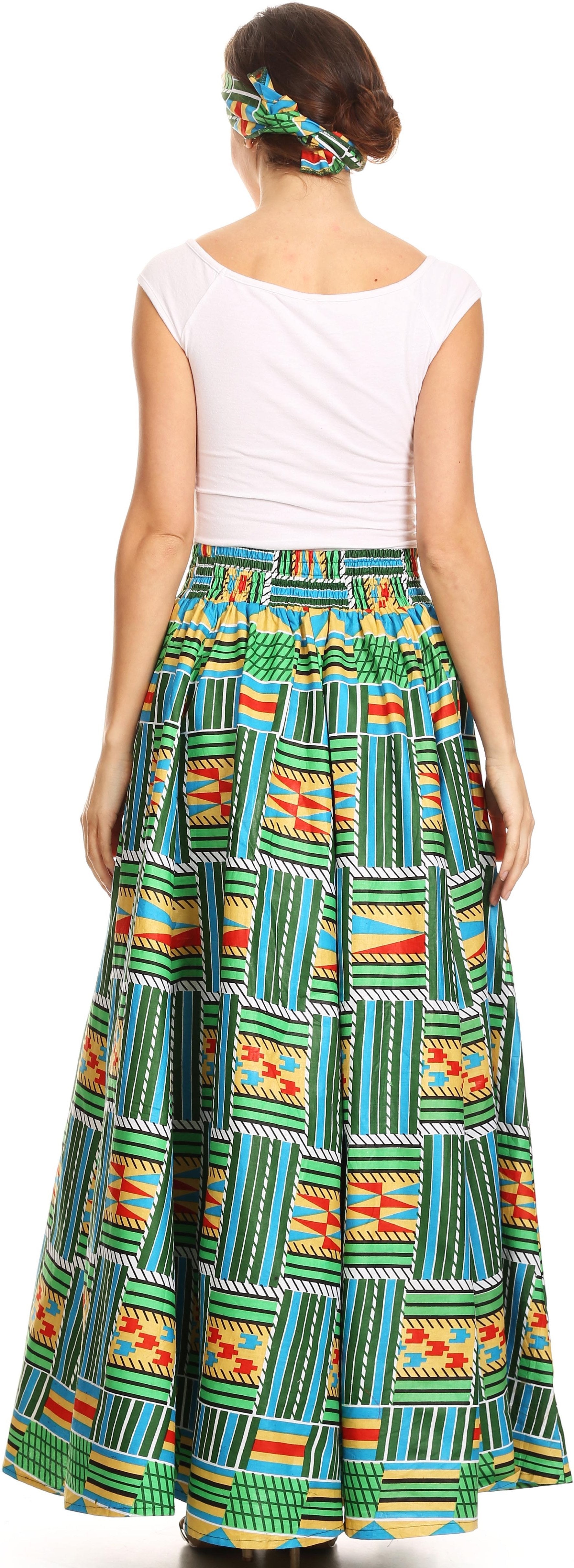 • This skirt features a long and wide flowing beautiful design. It is multi colored with a traditional wax print pattern. This skirt has pockets at the side for a total of two pockets. Pockets are deep and comfortable. A broad elastic waist band and adjustable wrap around strap allows skirt to easily convert into an elegant and carefree dress. This versatile item also features a beautiful head scarf in matching print.