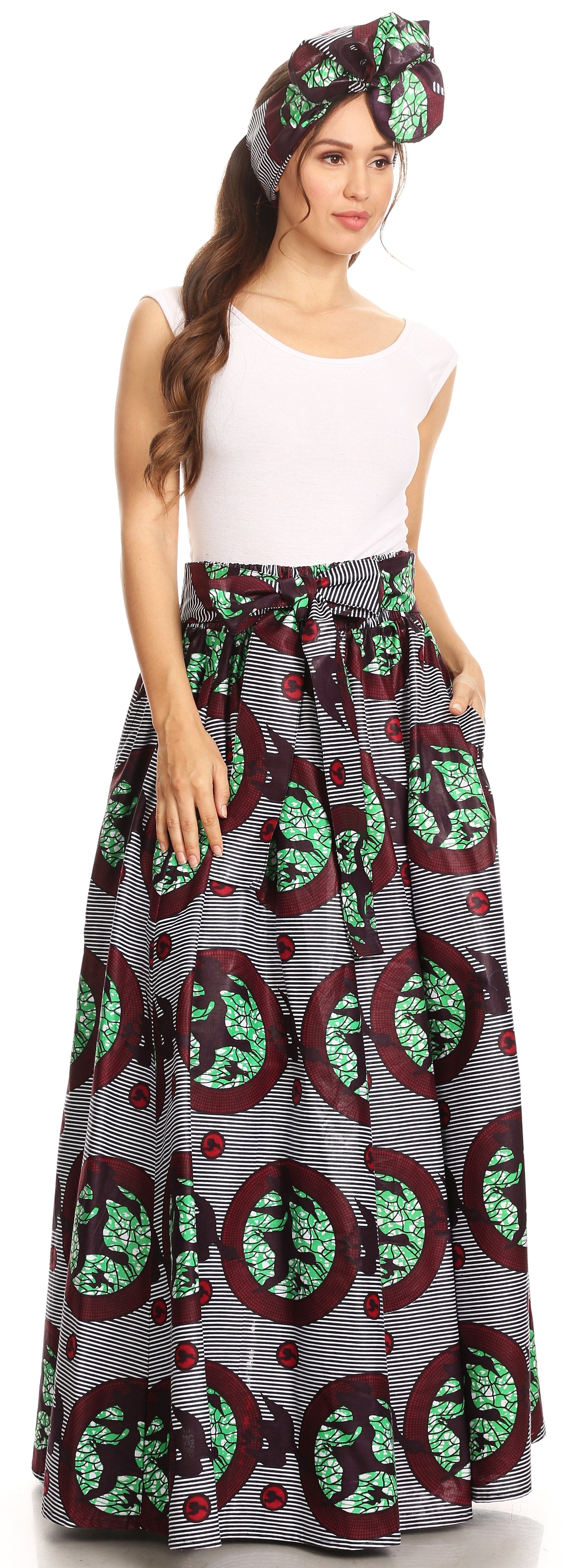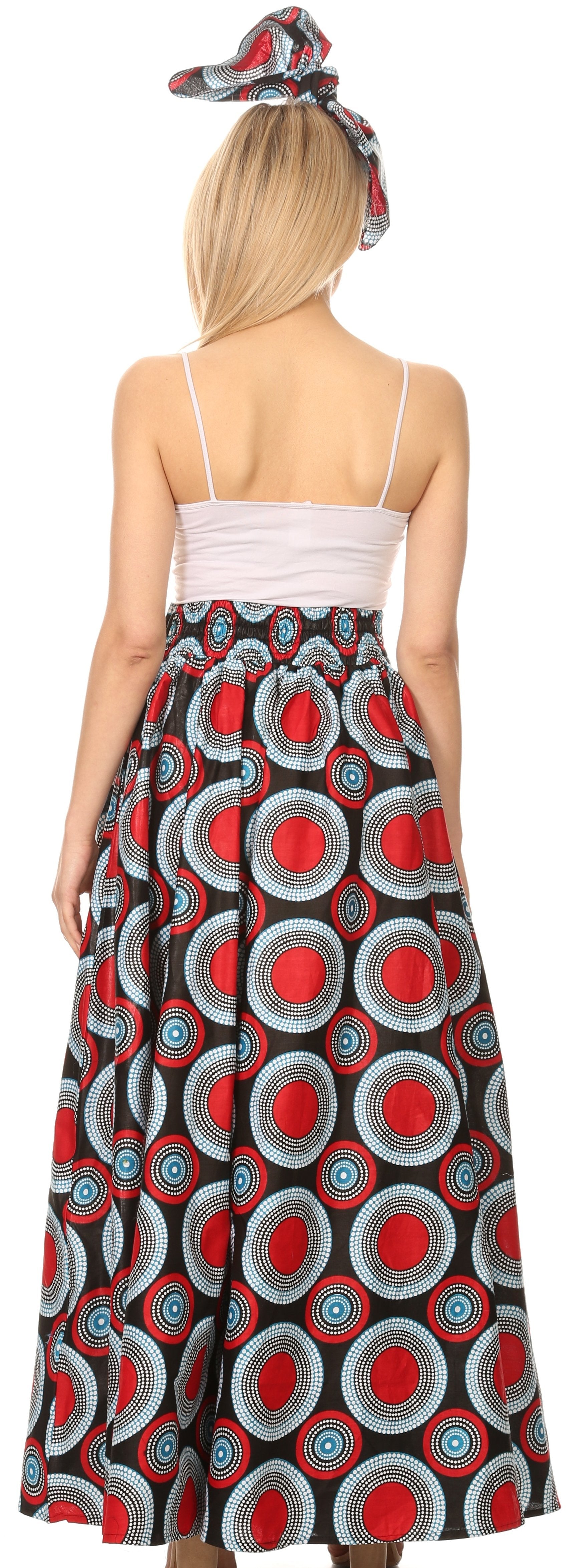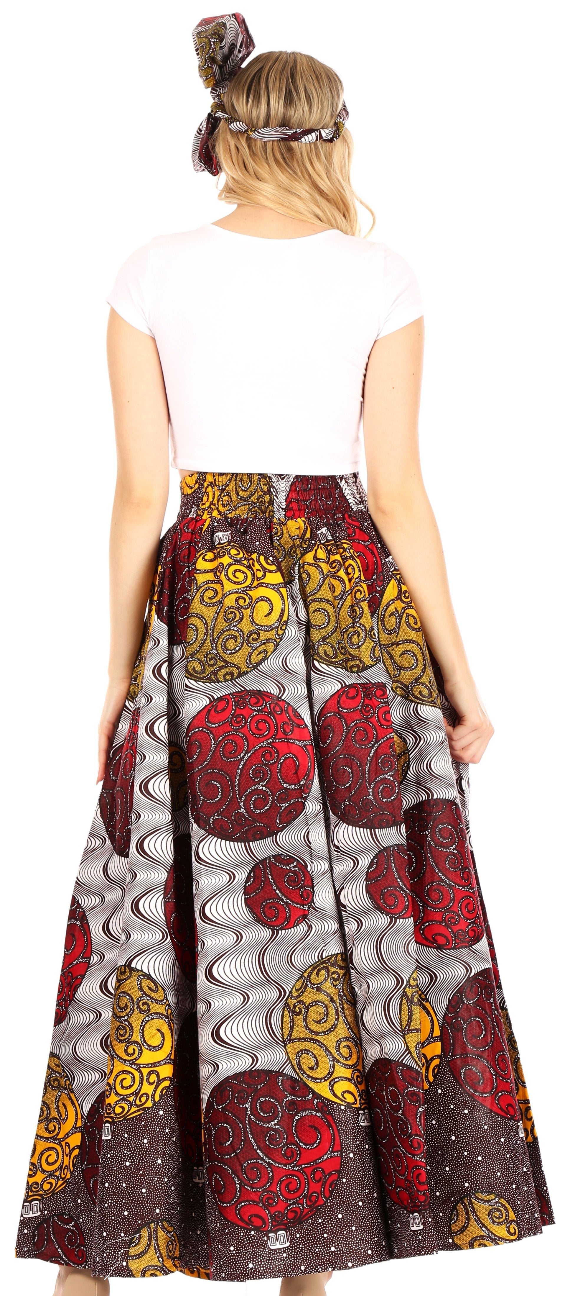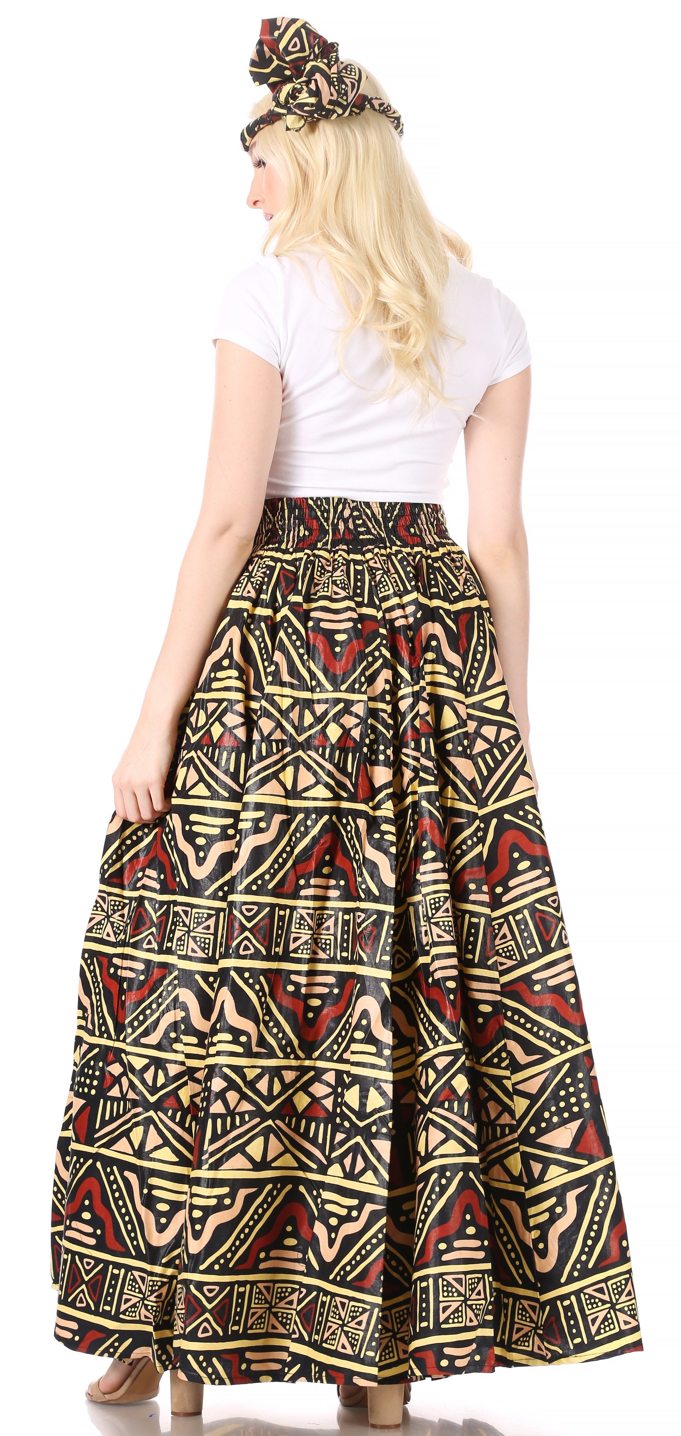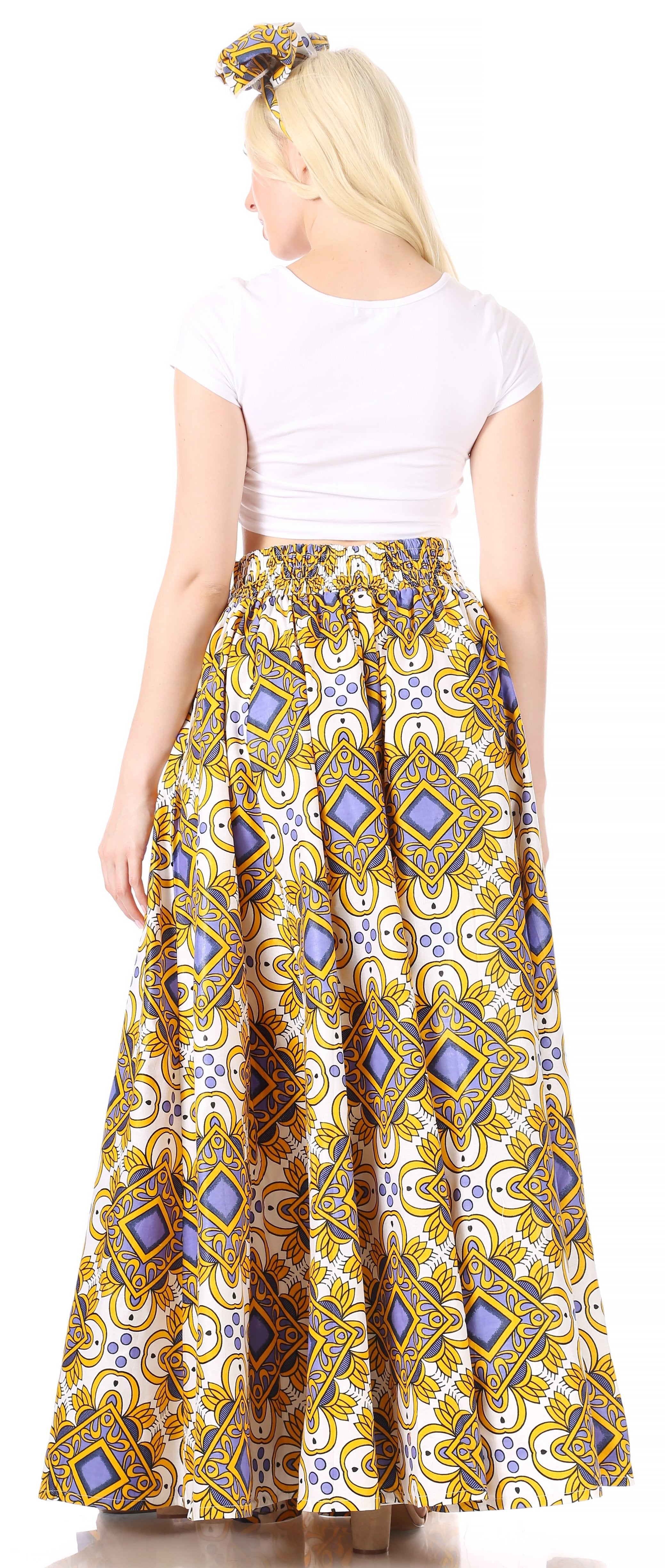 • This skirt features a long and wide flowing beautiful design. It is multi colored with a traditional wax print pattern. This skirt has pockets at the side for a total of two pockets. Pockets are deep and comfortable. A broad elastic waist band and adjustable wrap around strap allows skirt to easily convert into an elegant and carefree dress. This versatile item also features a beautiful head scarf in matching print.