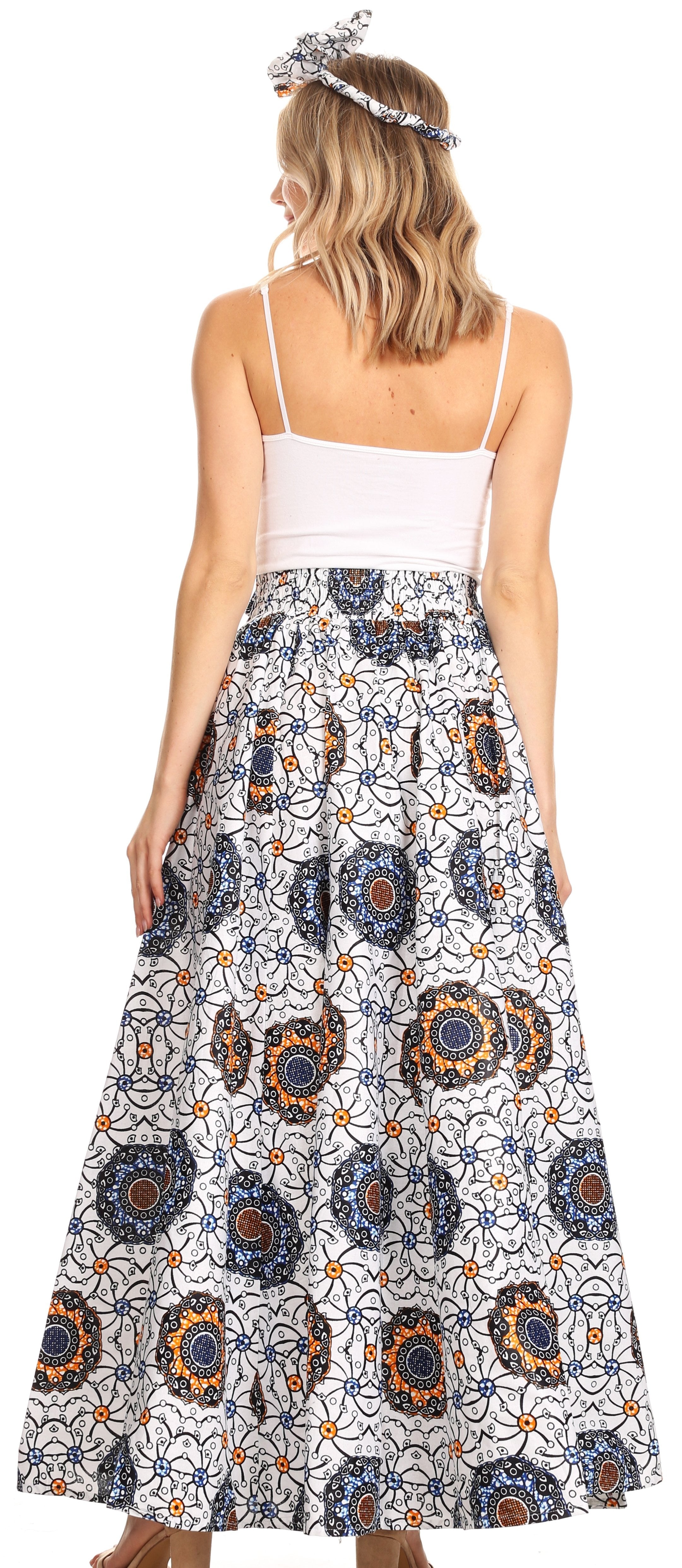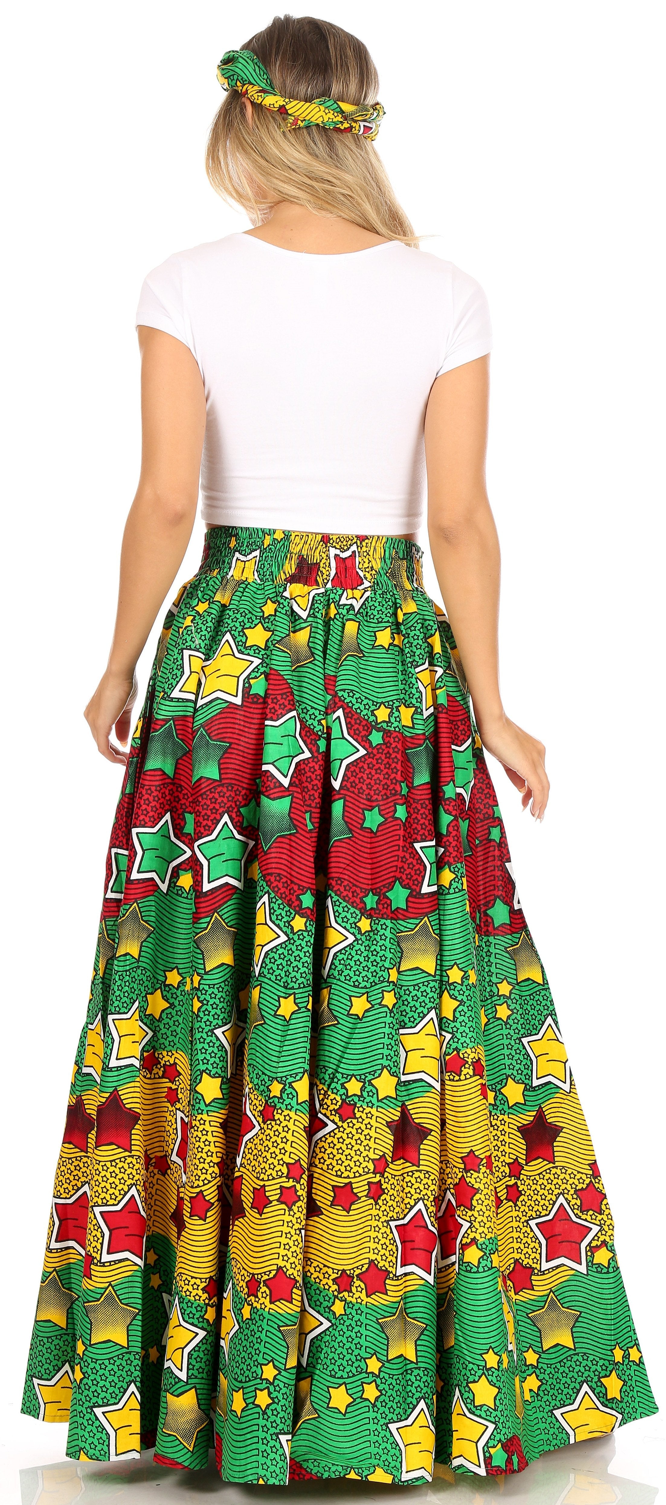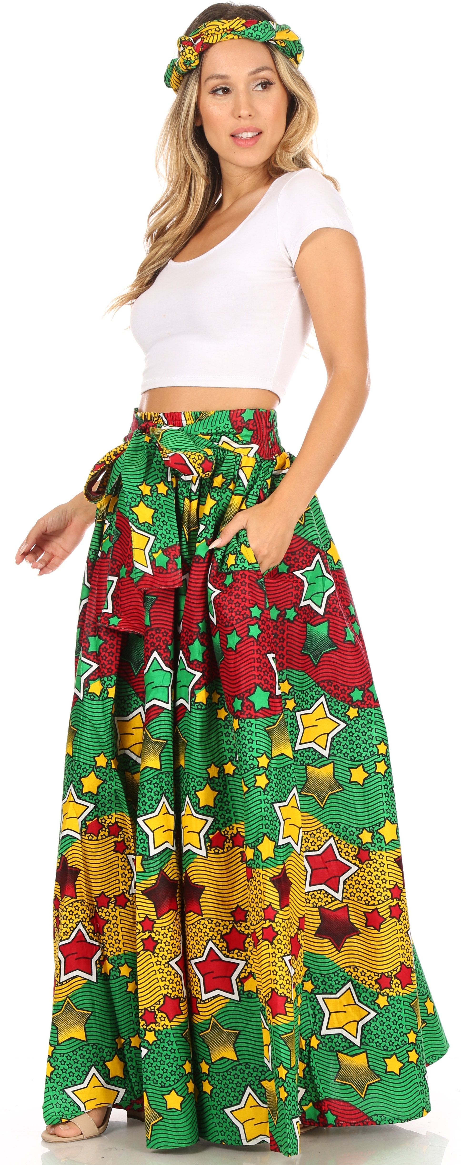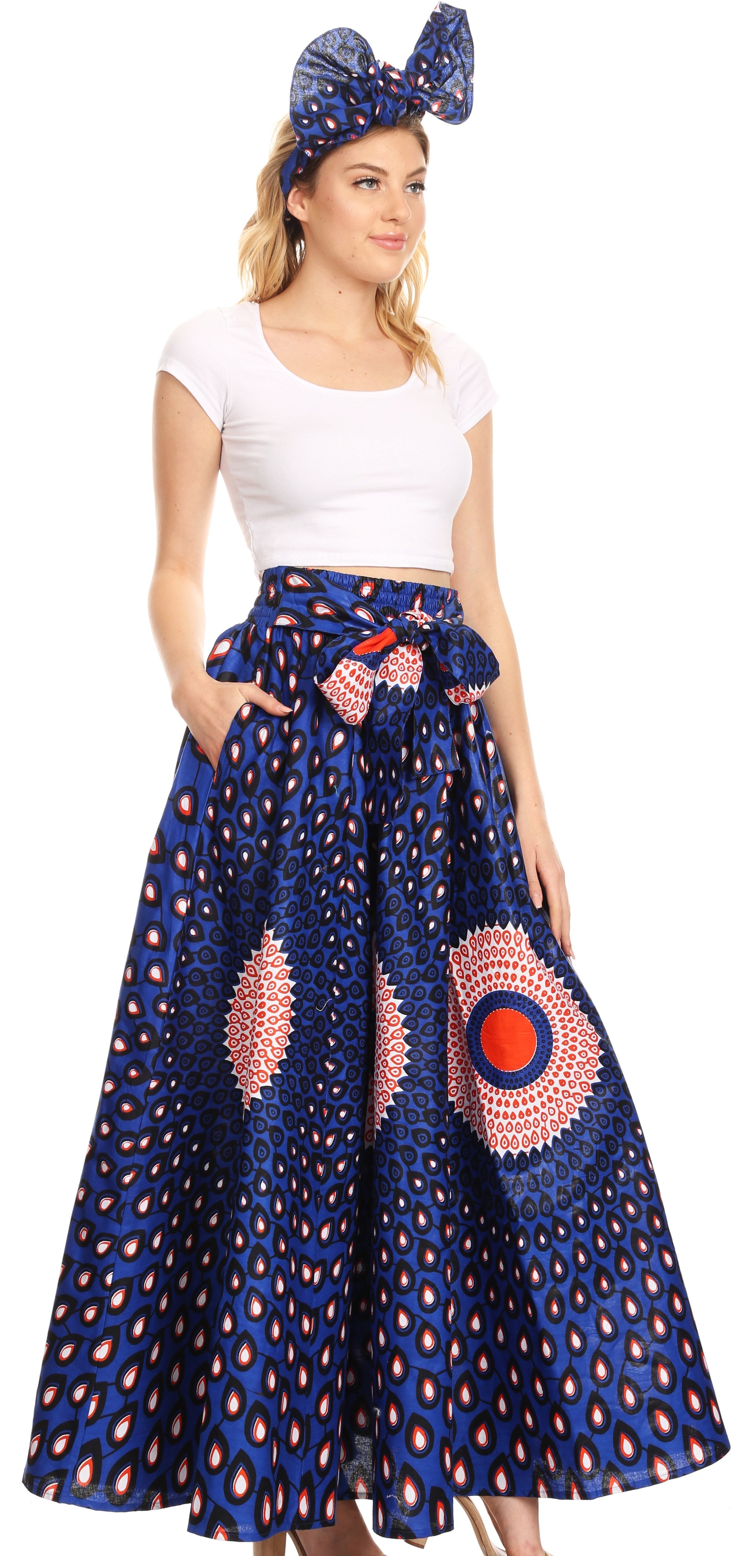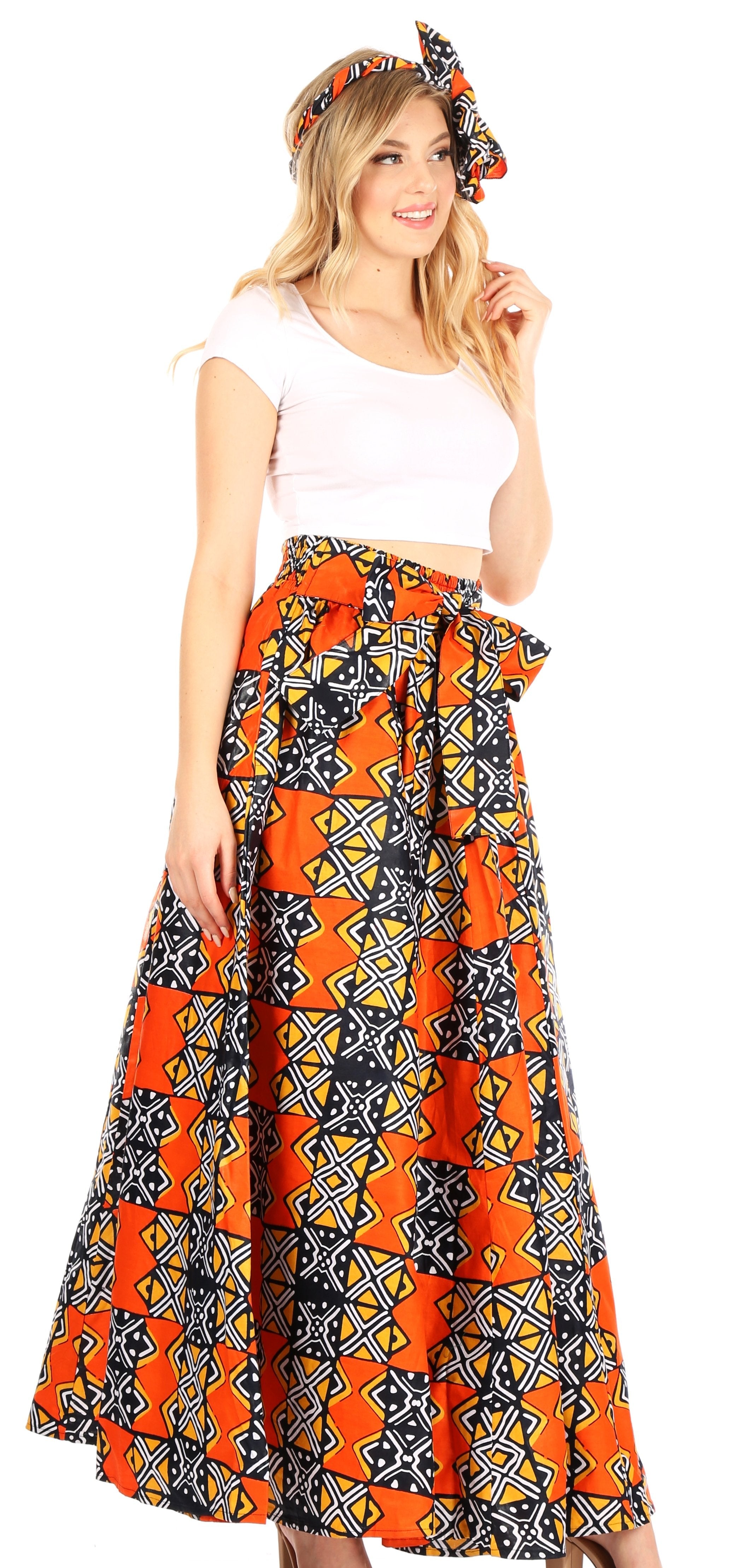 • This skirt features a long and wide flowing beautiful design. It is multi colored with a traditional wax print pattern. This skirt has pockets at the side for a total of two pockets. Pockets are deep and comfortable. A broad elastic waist band and adjustable wrap around strap allows skirt to easily convert into an elegant and carefree dress. This versatile item also features a beautiful head scarf in matching print.