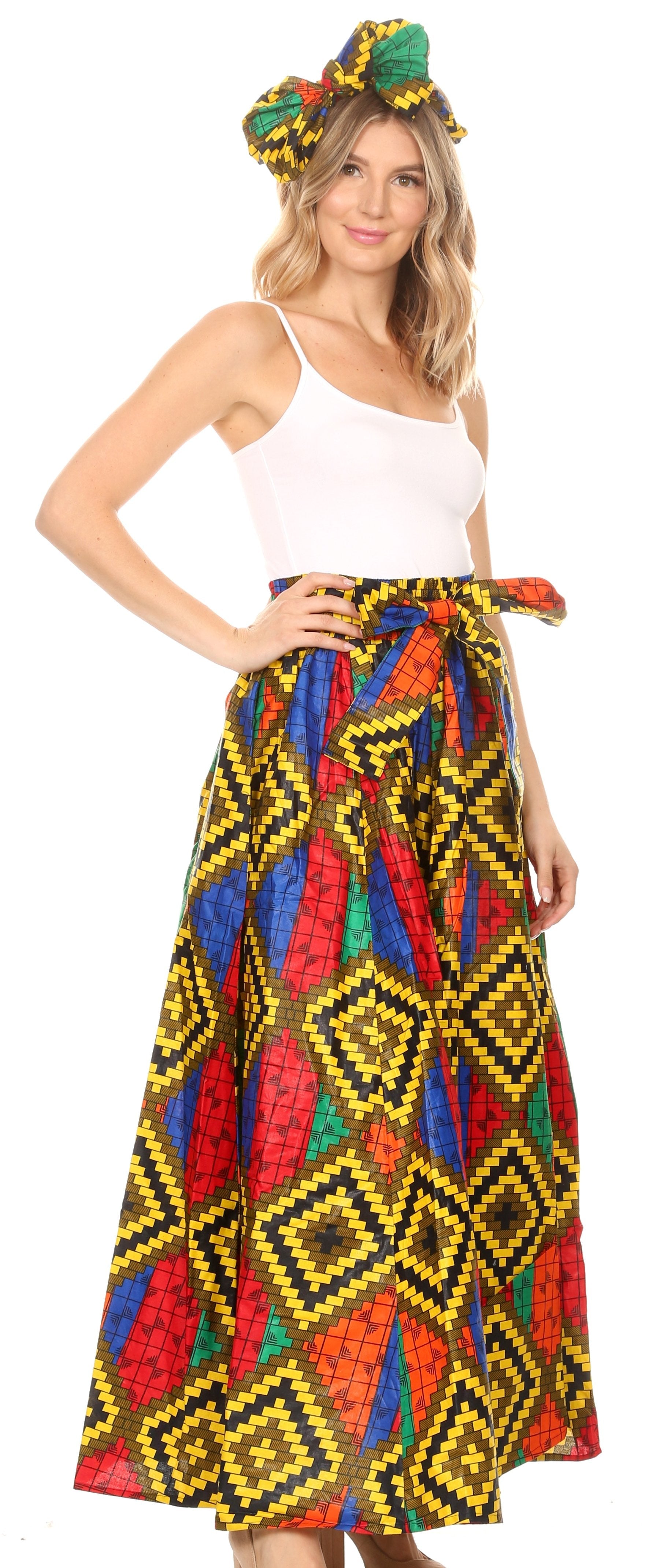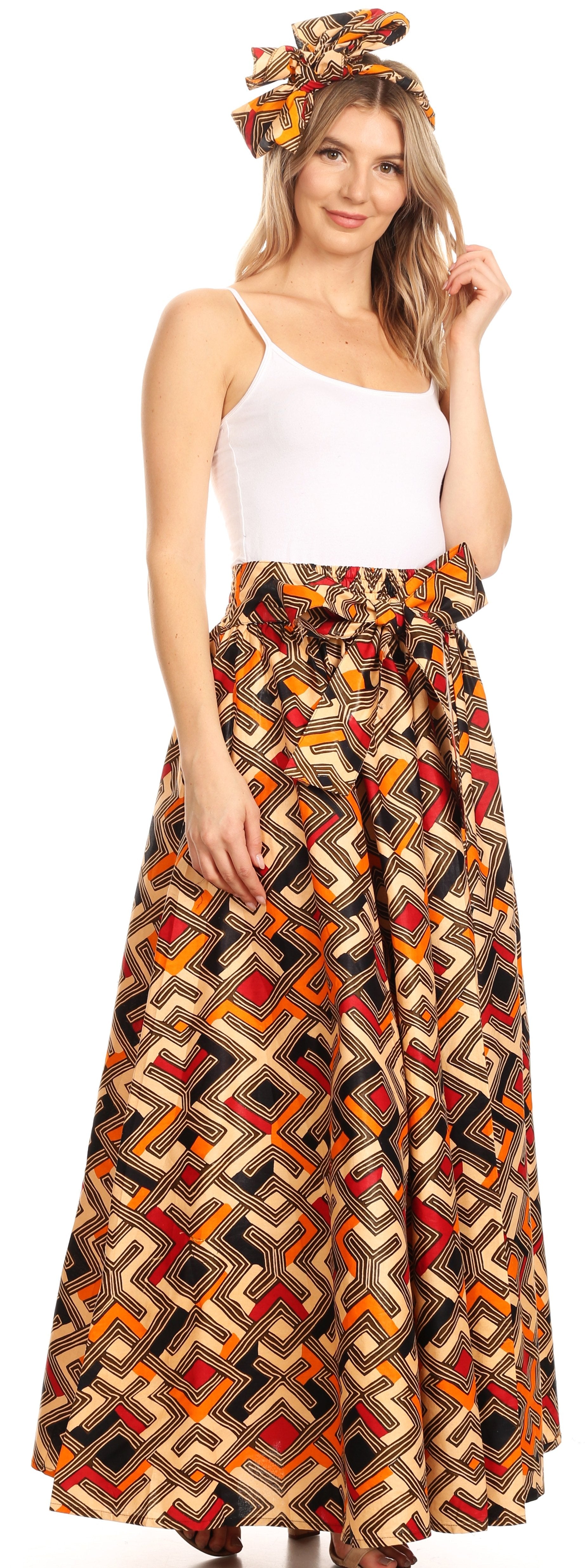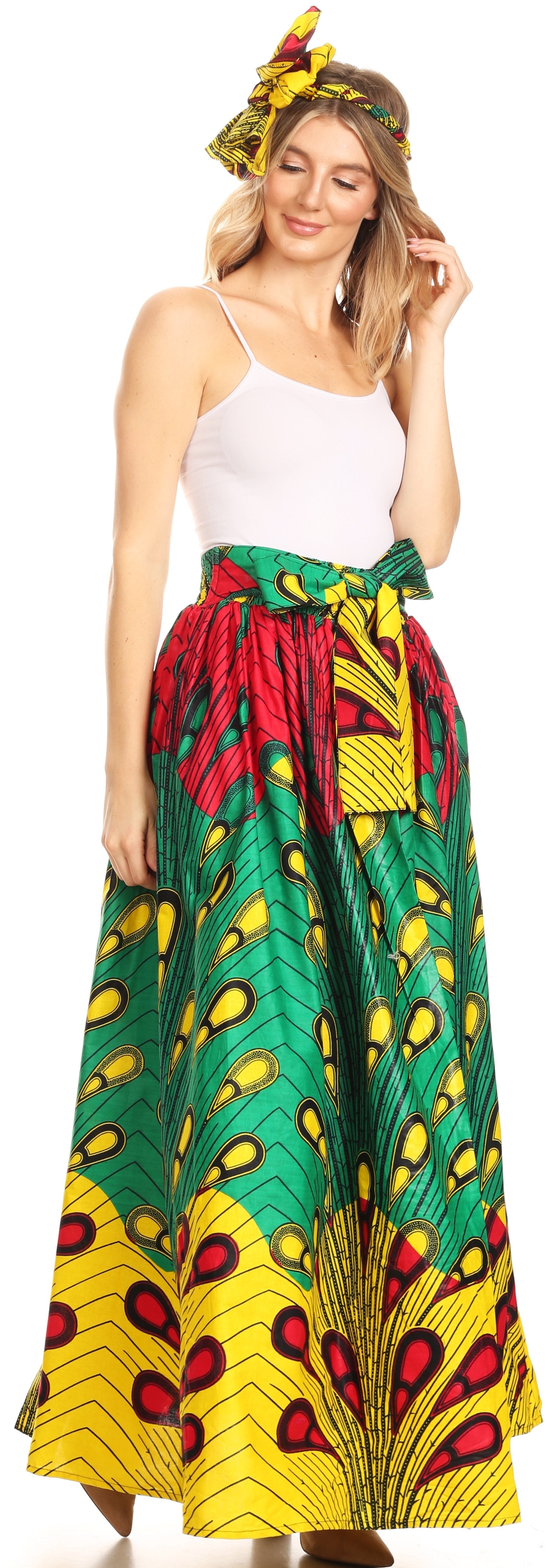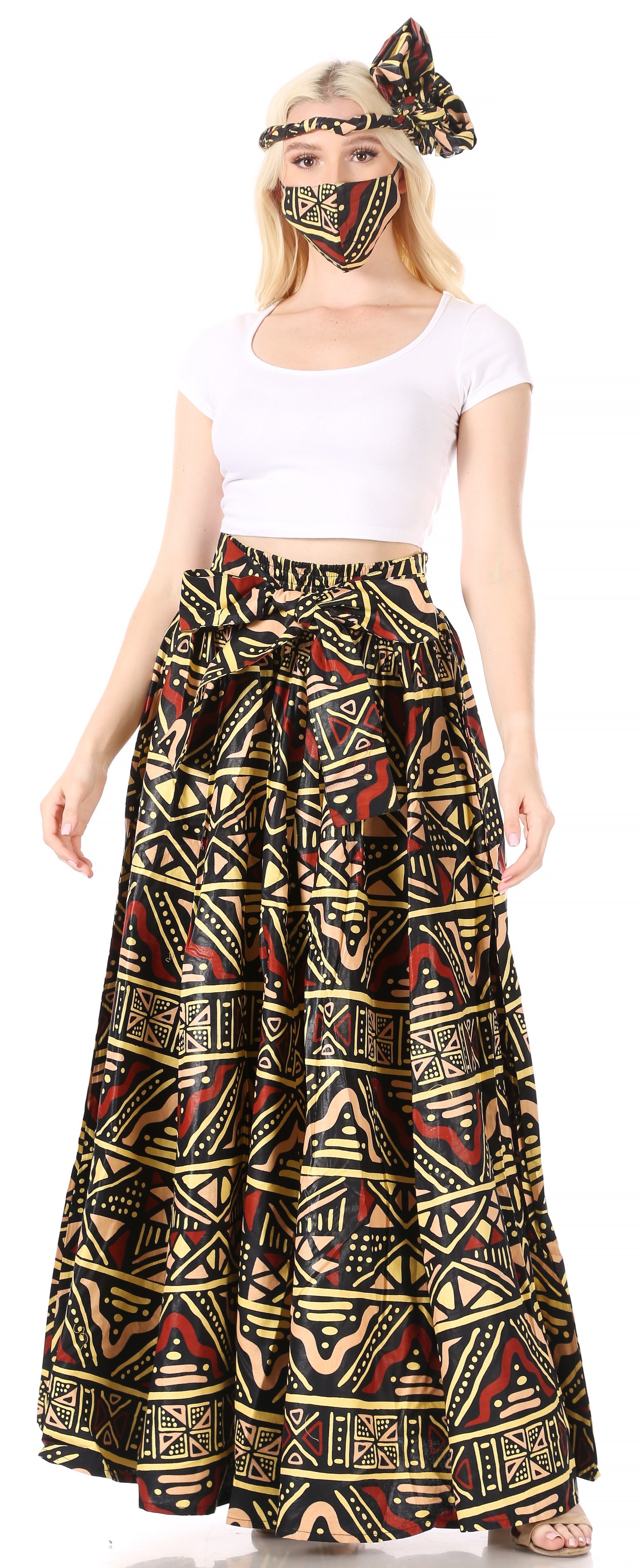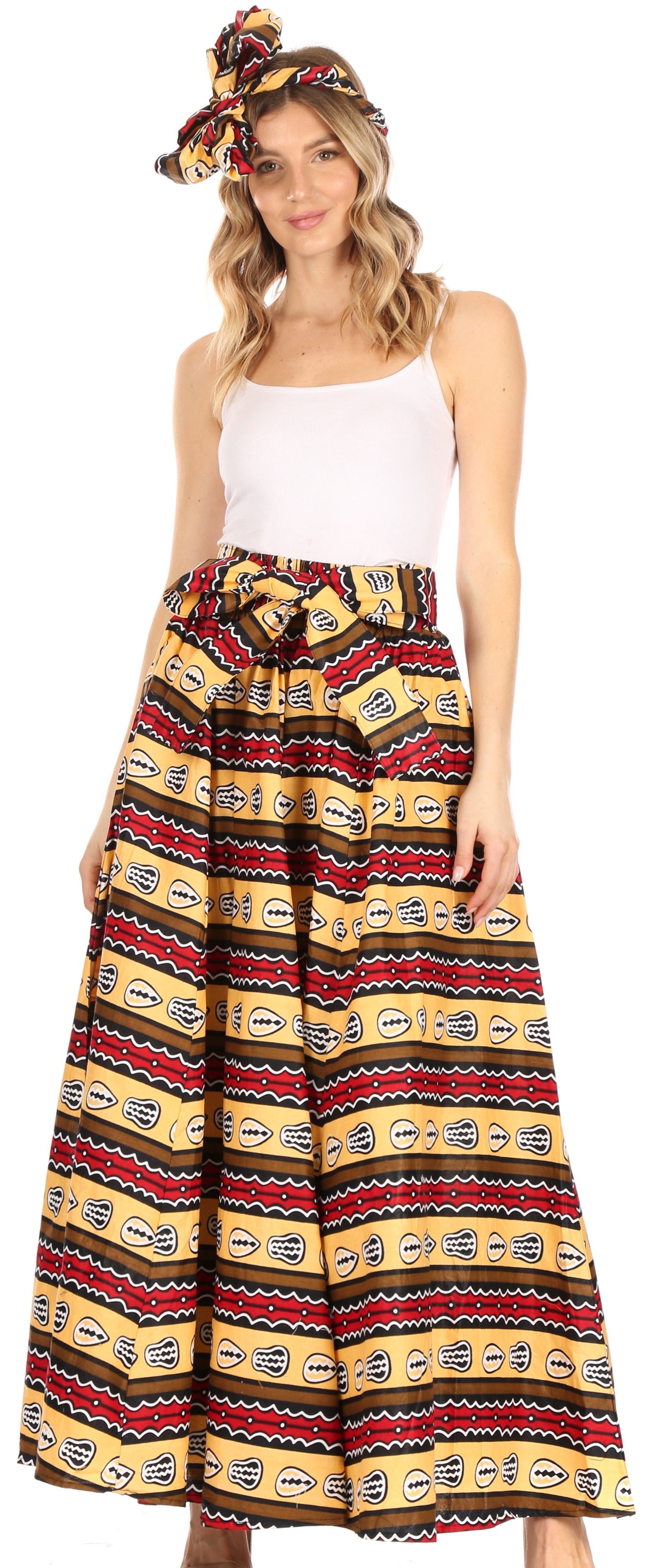 • This skirt features a long and wide flowing beautiful design. It is multi colored with a traditional wax print pattern. This skirt has pockets at the side for a total of two pockets. Pockets are deep and comfortable. A broad elastic waist band and adjustable wrap around strap allows skirt to easily convert into an elegant and carefree dress. This versatile item also features a beautiful head scarf in matching print.