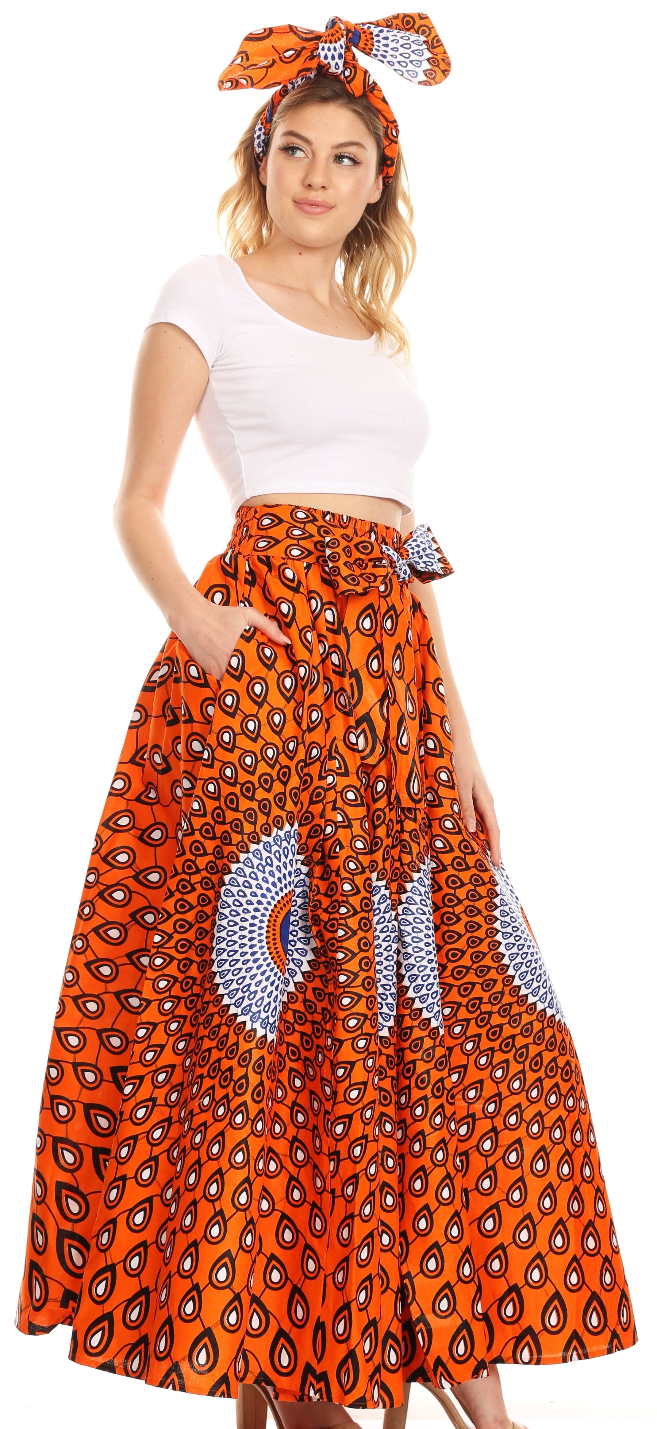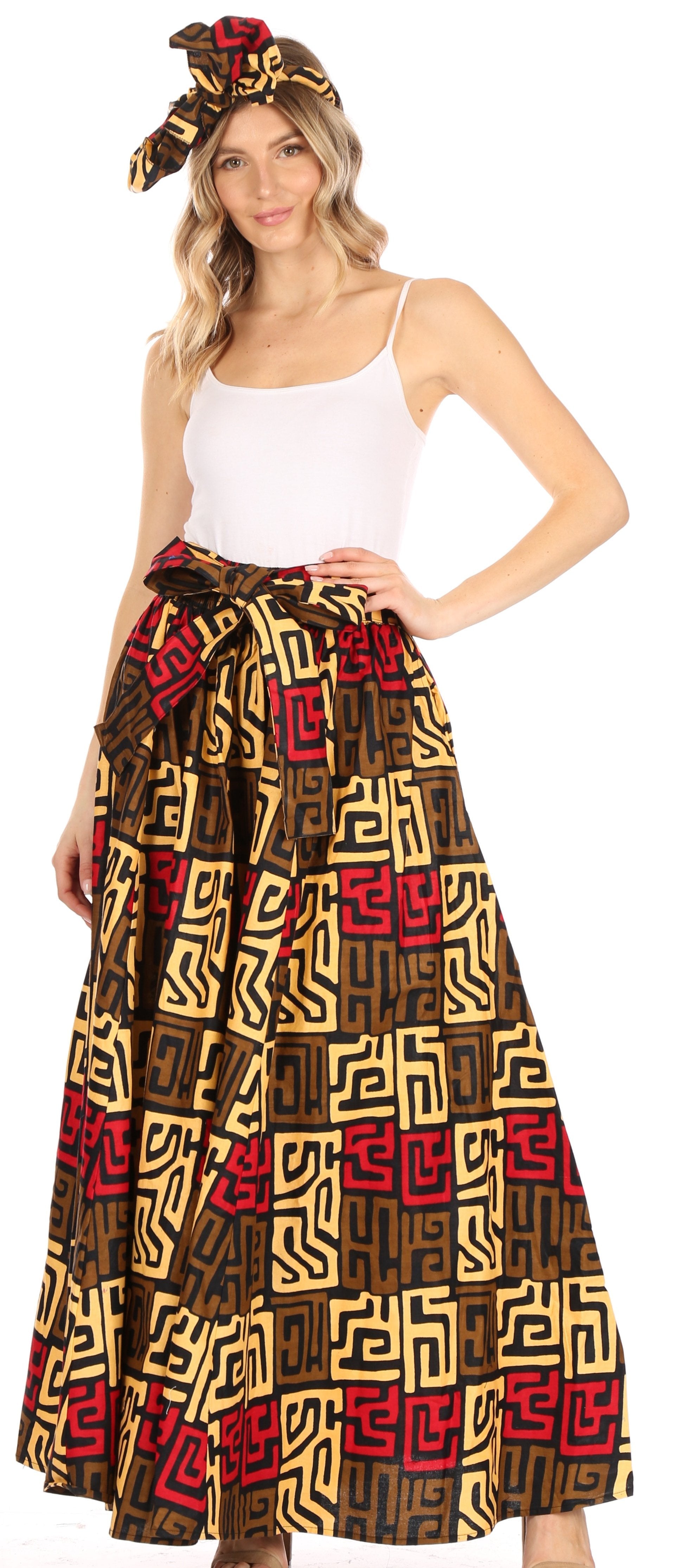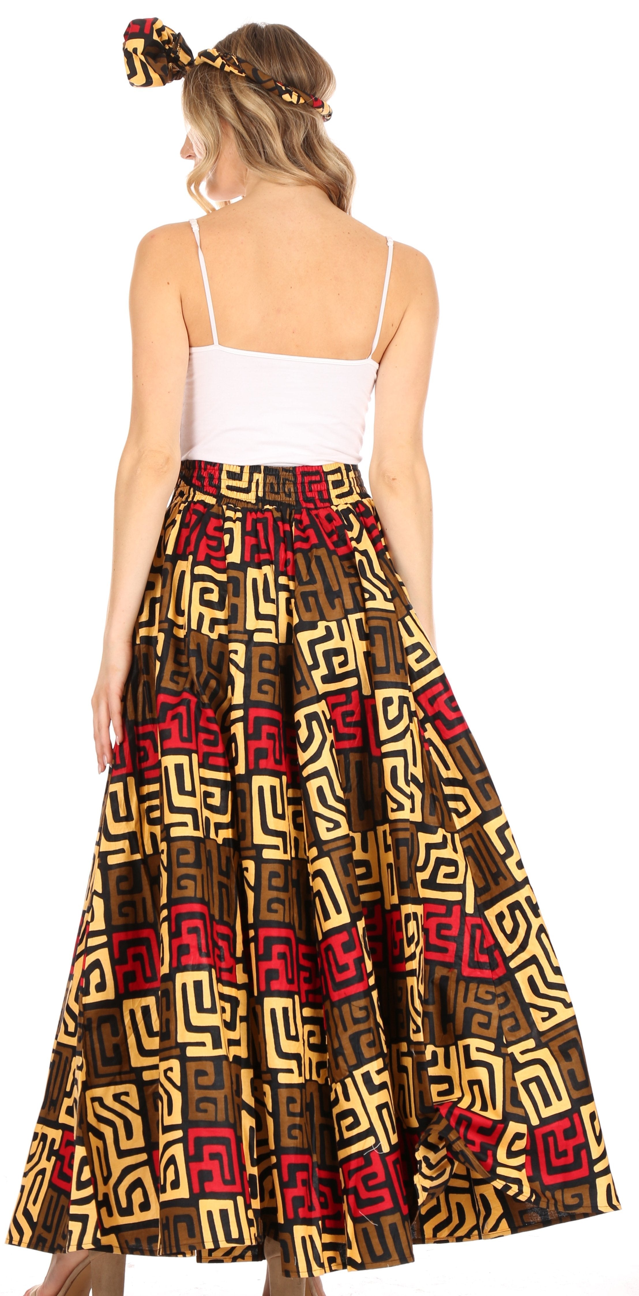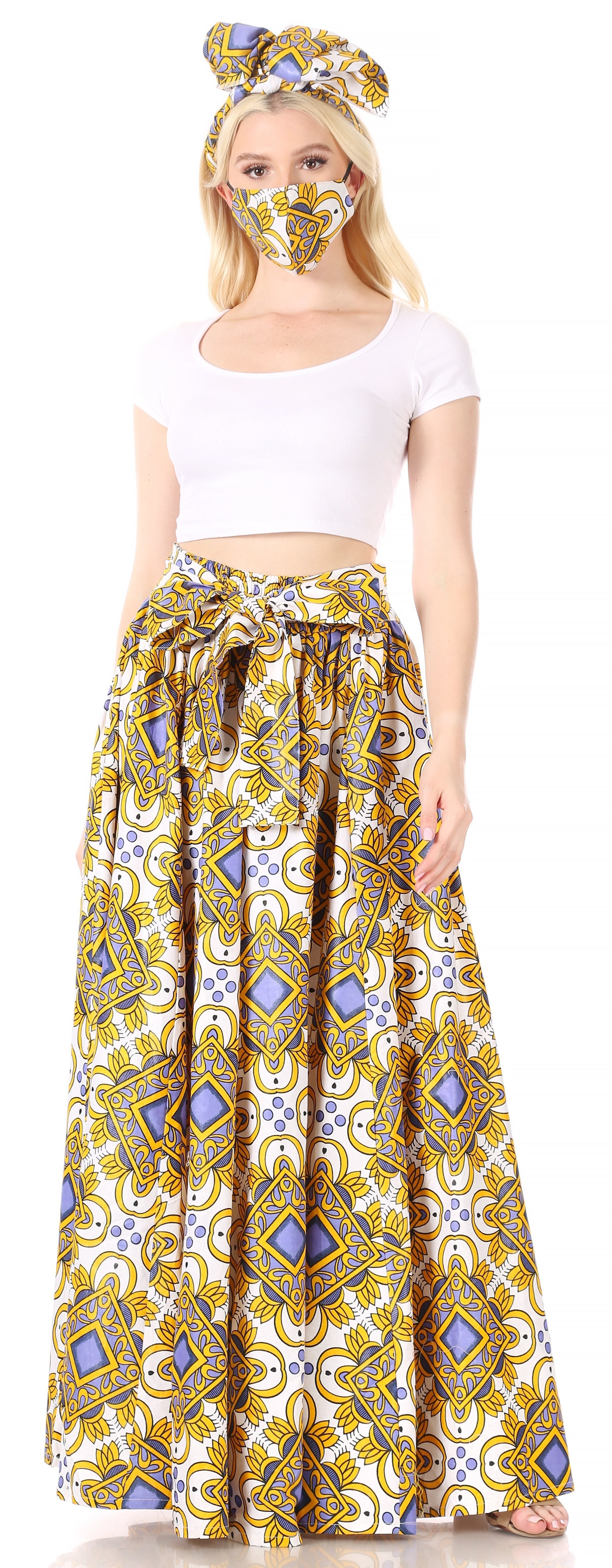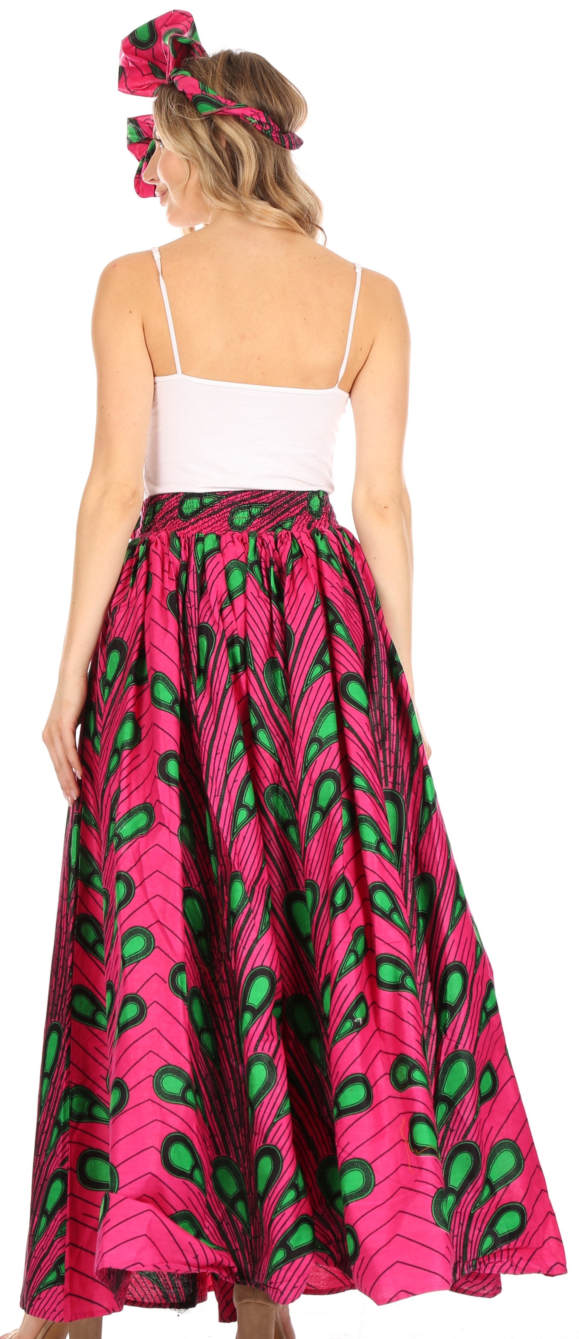 • This skirt features a long and wide flowing beautiful design. It is multi colored with a traditional wax print pattern. This skirt has pockets at the side for a total of two pockets. Pockets are deep and comfortable. A broad elastic waist band and adjustable wrap around strap allows skirt to easily convert into an elegant and carefree dress. This versatile item also features a beautiful head scarf in matching print.