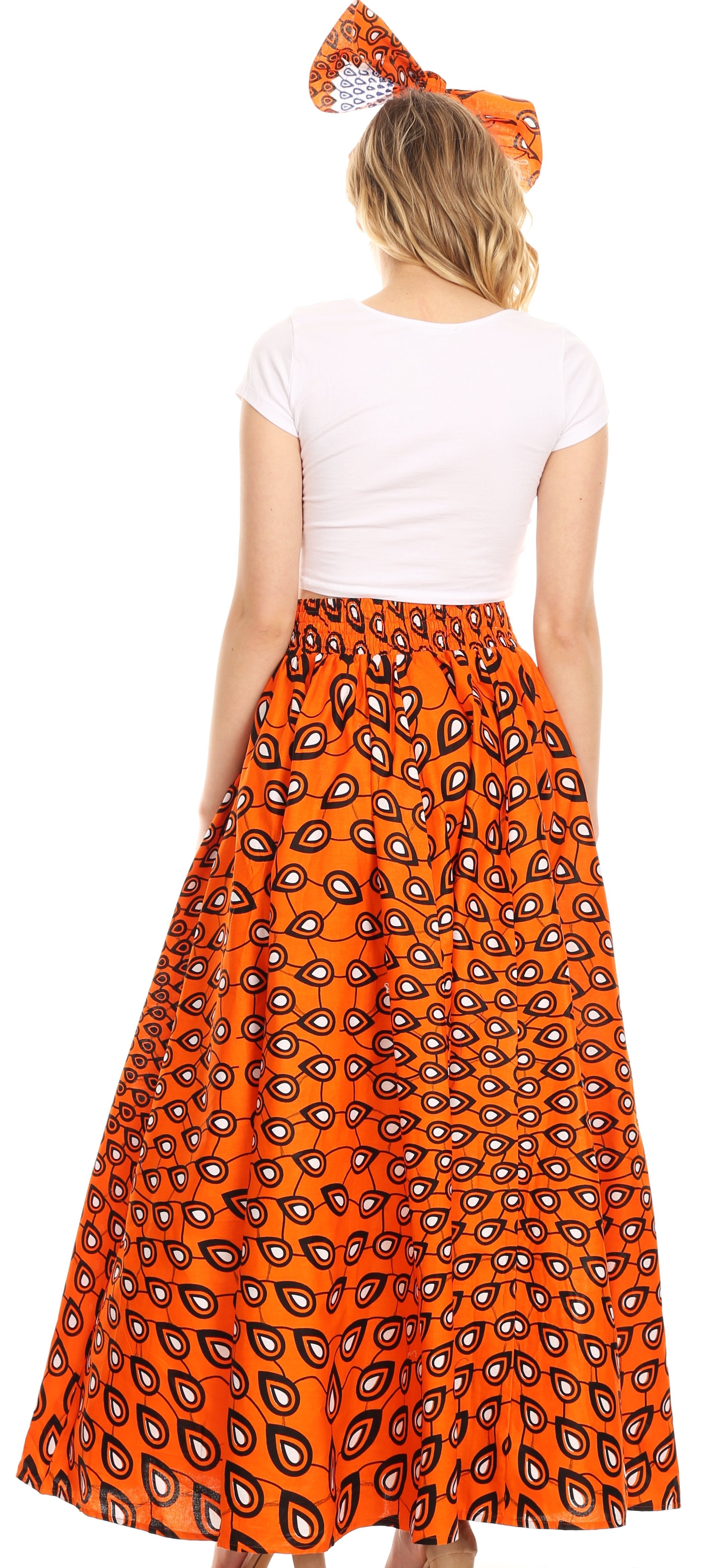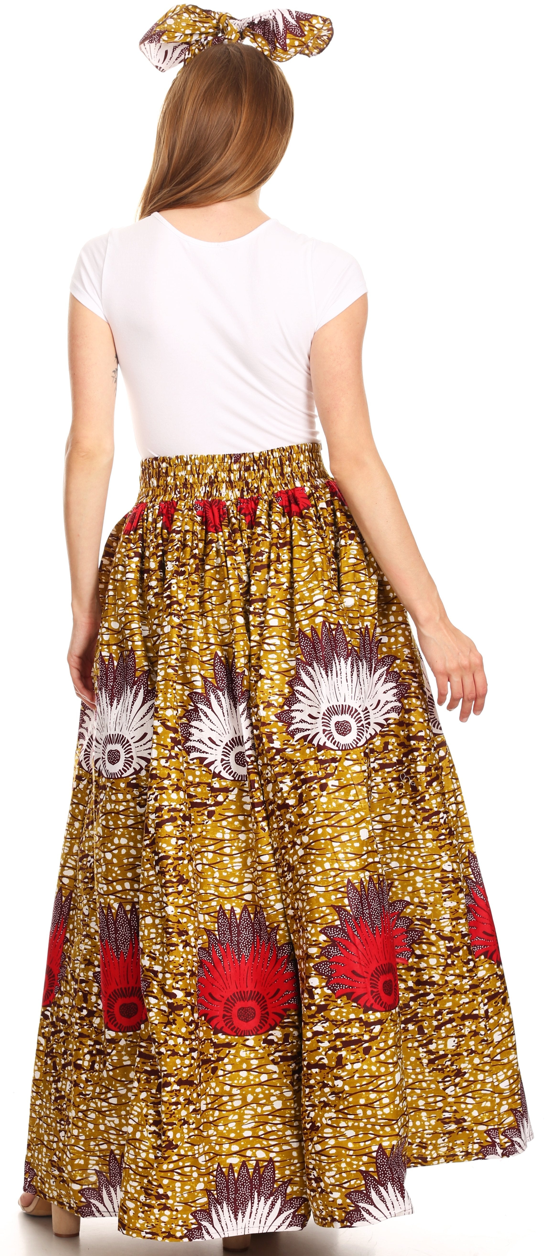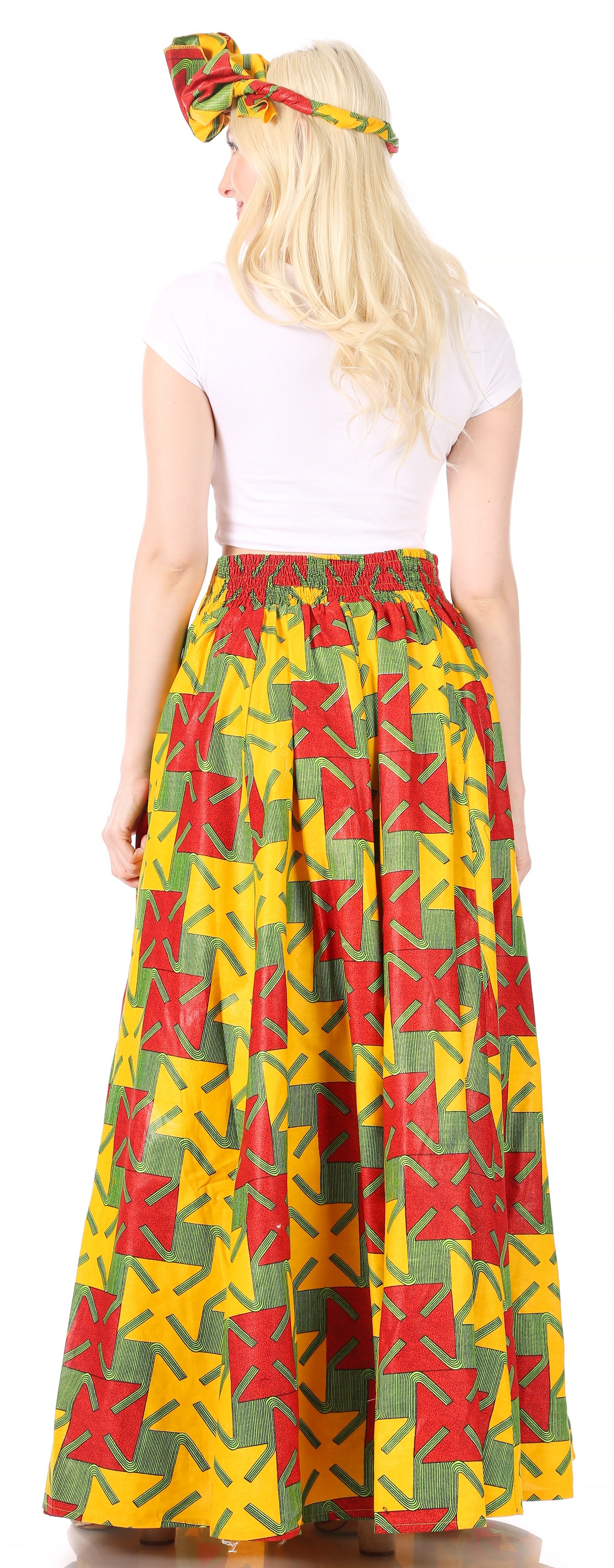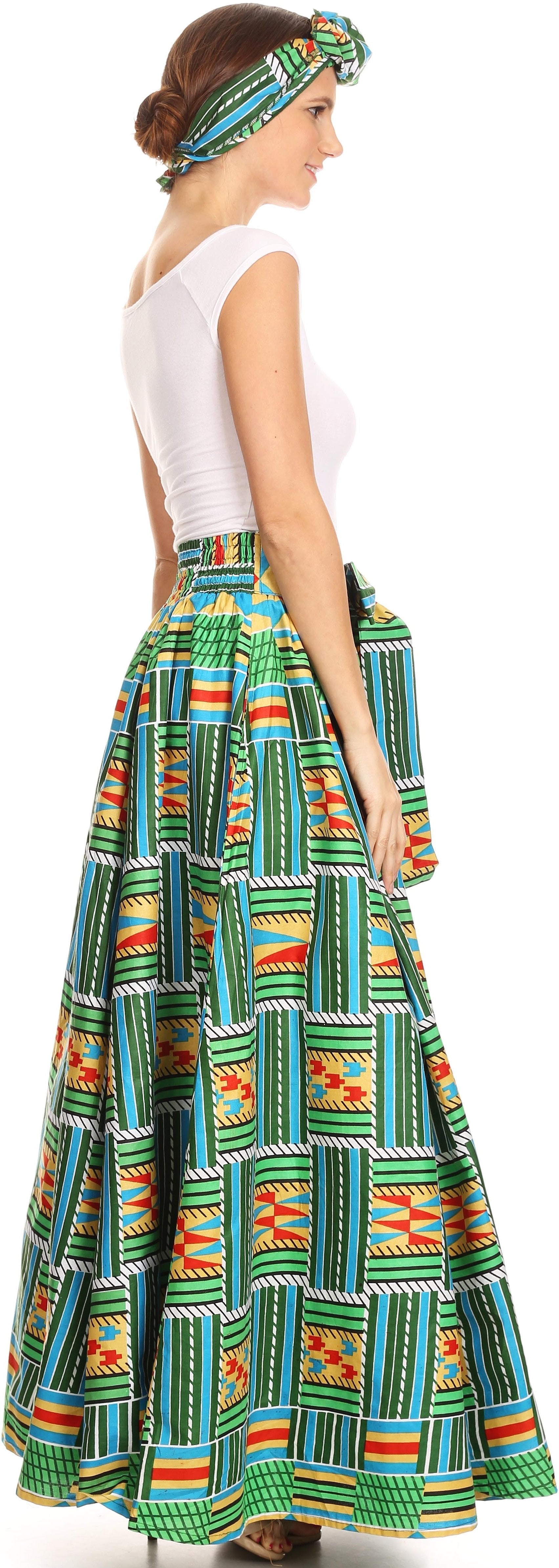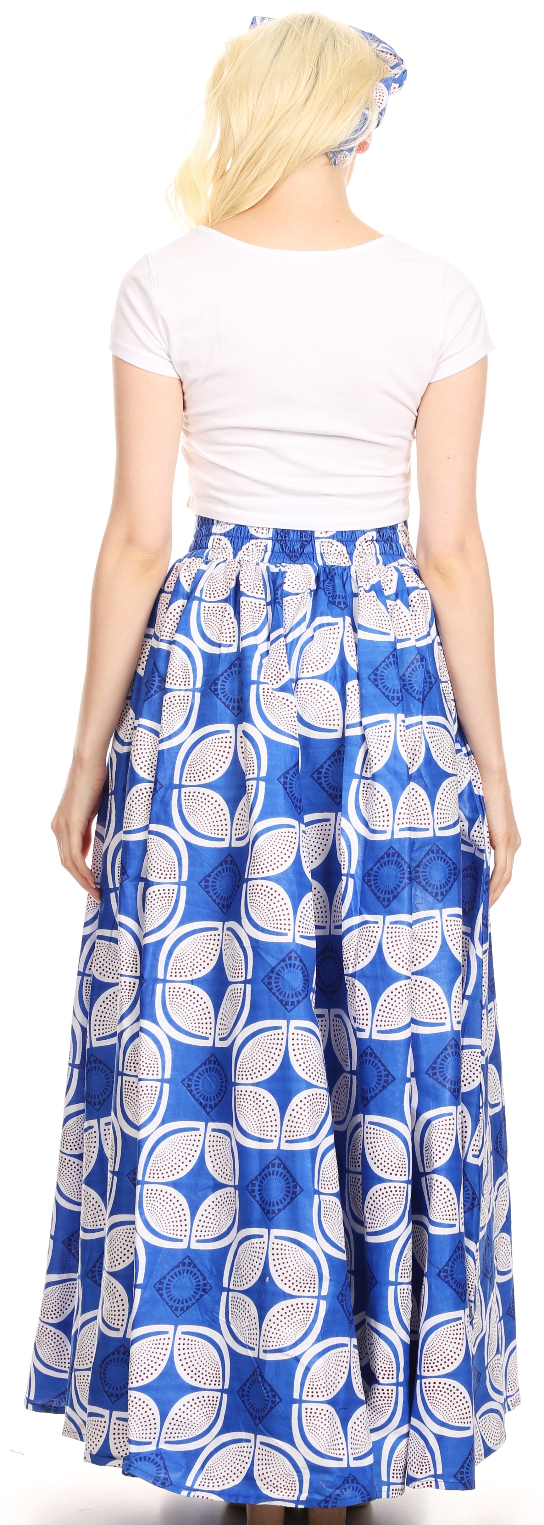 • This skirt features a long and wide flowing beautiful design. It is multi colored with a traditional wax print pattern. This skirt has pockets at the side for a total of two pockets. Pockets are deep and comfortable. A broad elastic waist band and adjustable wrap around strap allows skirt to easily convert into an elegant and carefree dress. This versatile item also features a beautiful head scarf in matching print.