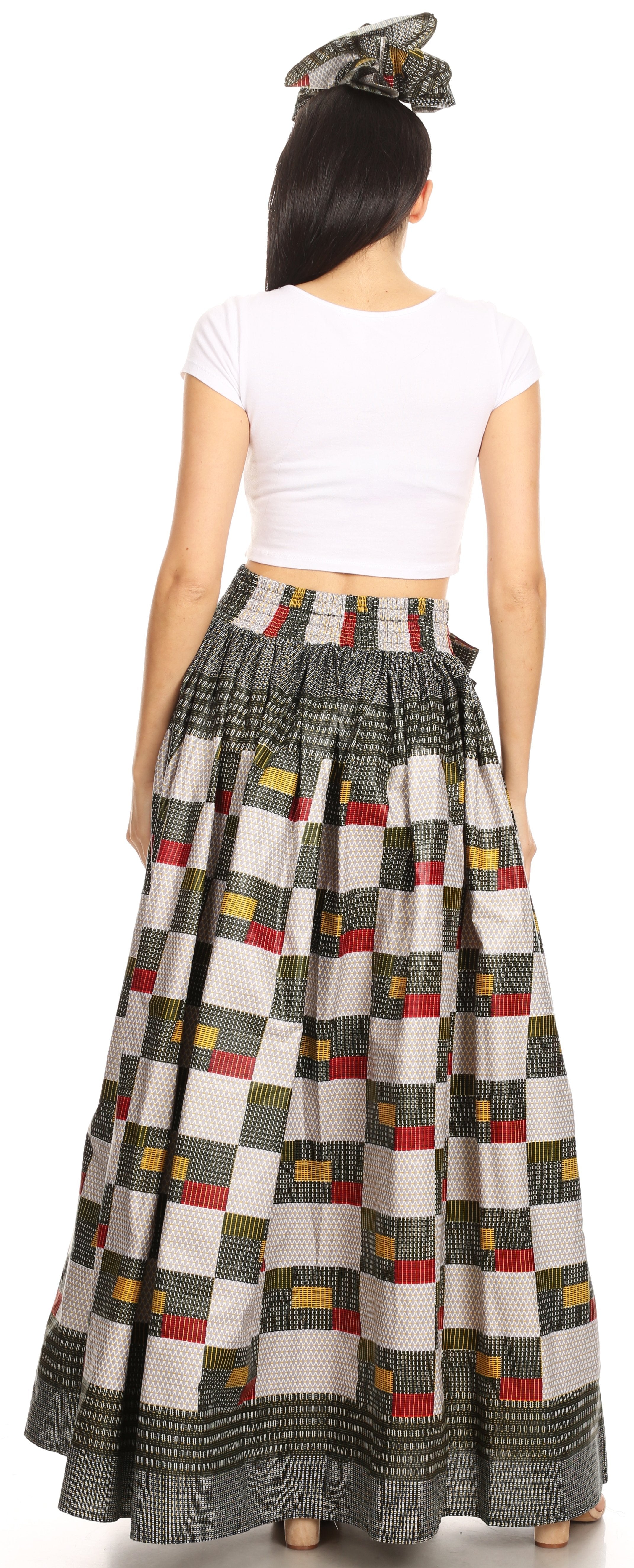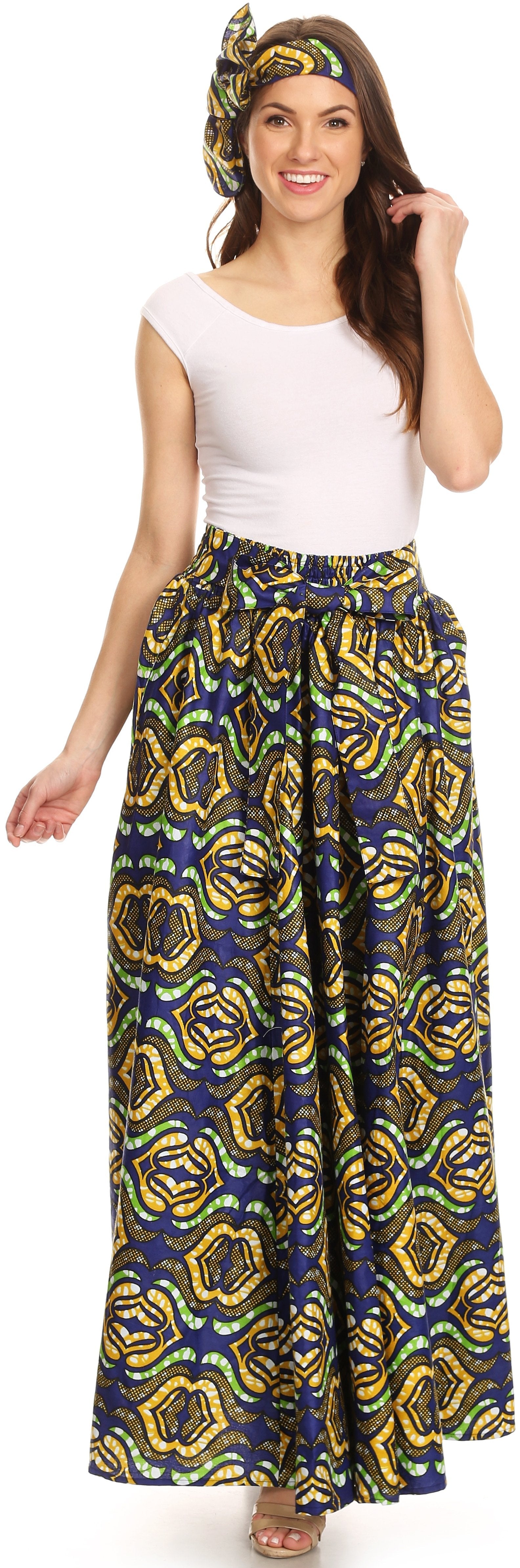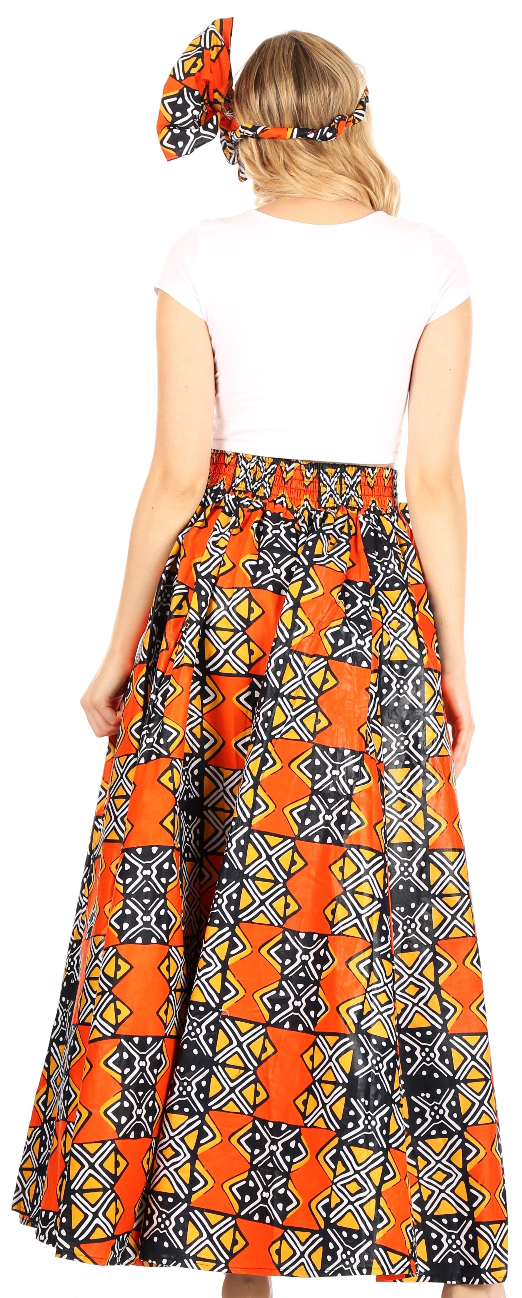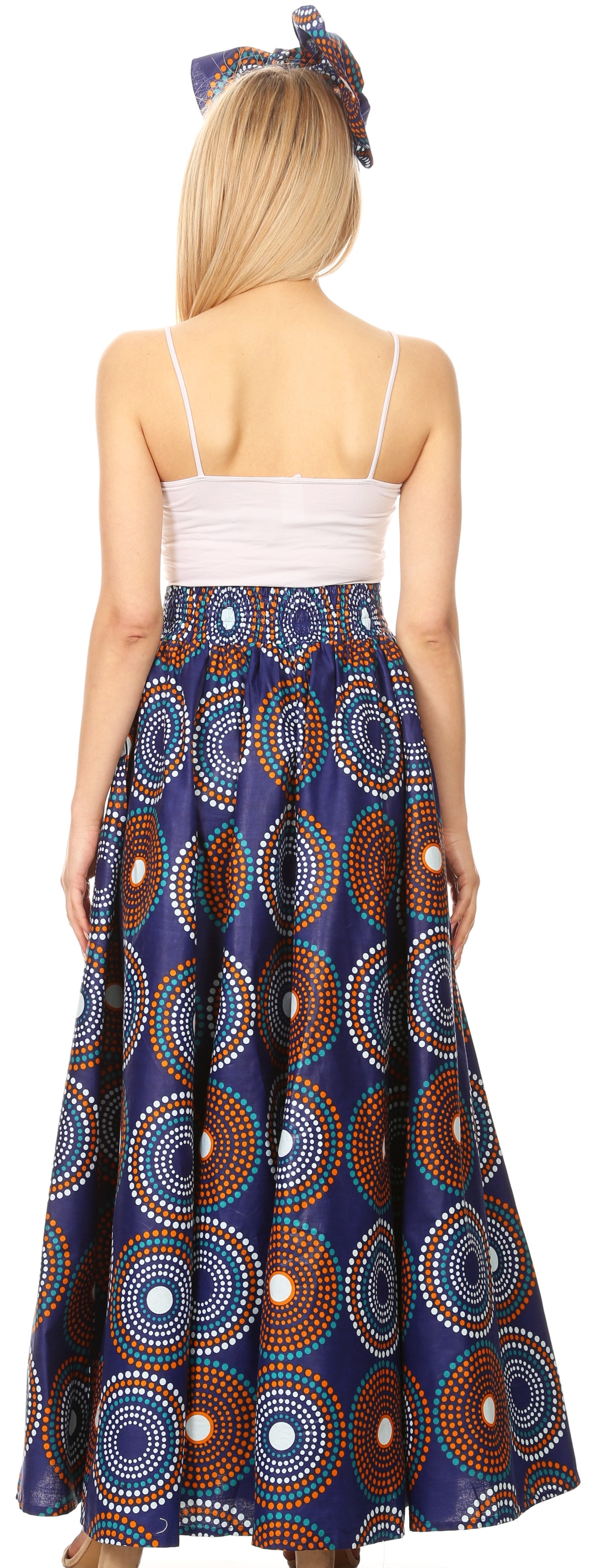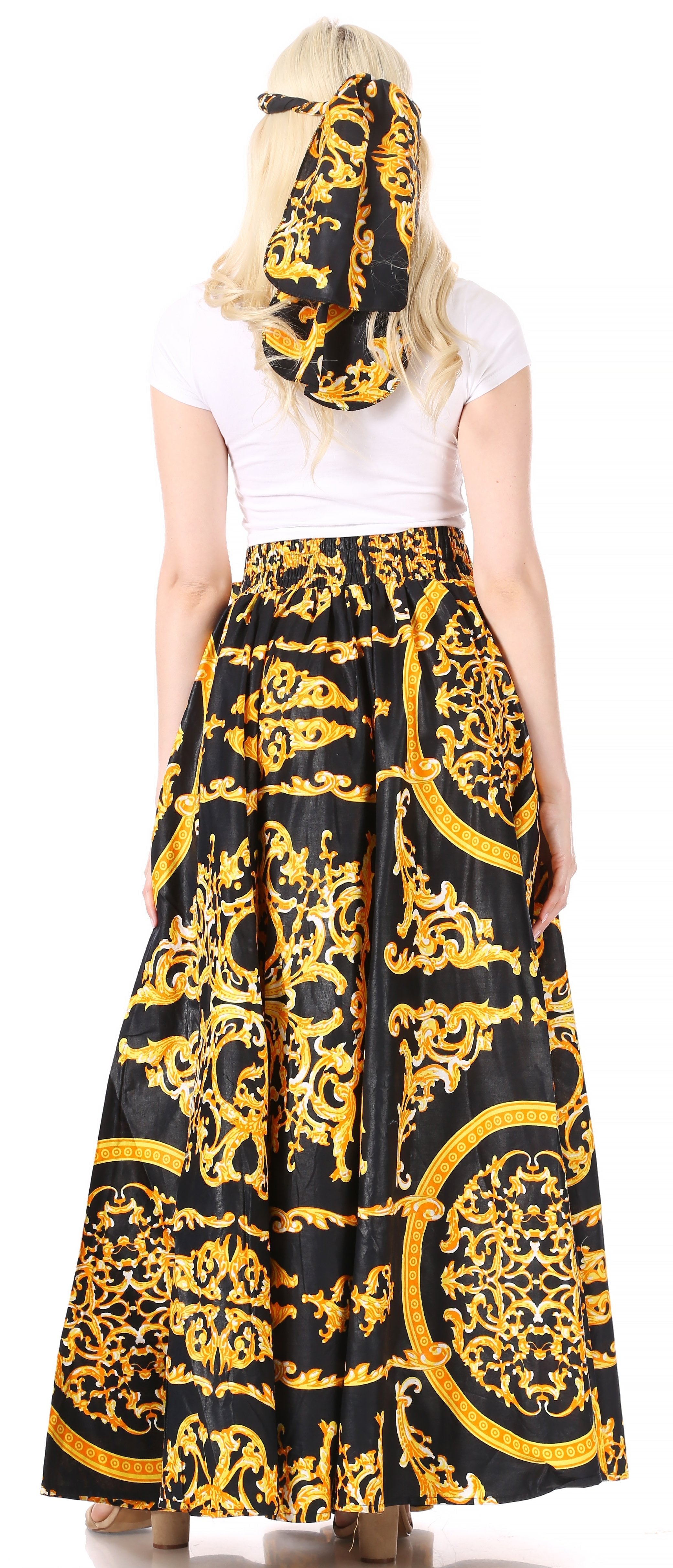 • This skirt features a long and wide flowing beautiful design. It is multi colored with a traditional wax print pattern. This skirt has pockets at the side for a total of two pockets. Pockets are deep and comfortable. A broad elastic waist band and adjustable wrap around strap allows skirt to easily convert into an elegant and carefree dress. This versatile item also features a beautiful head scarf in matching print.