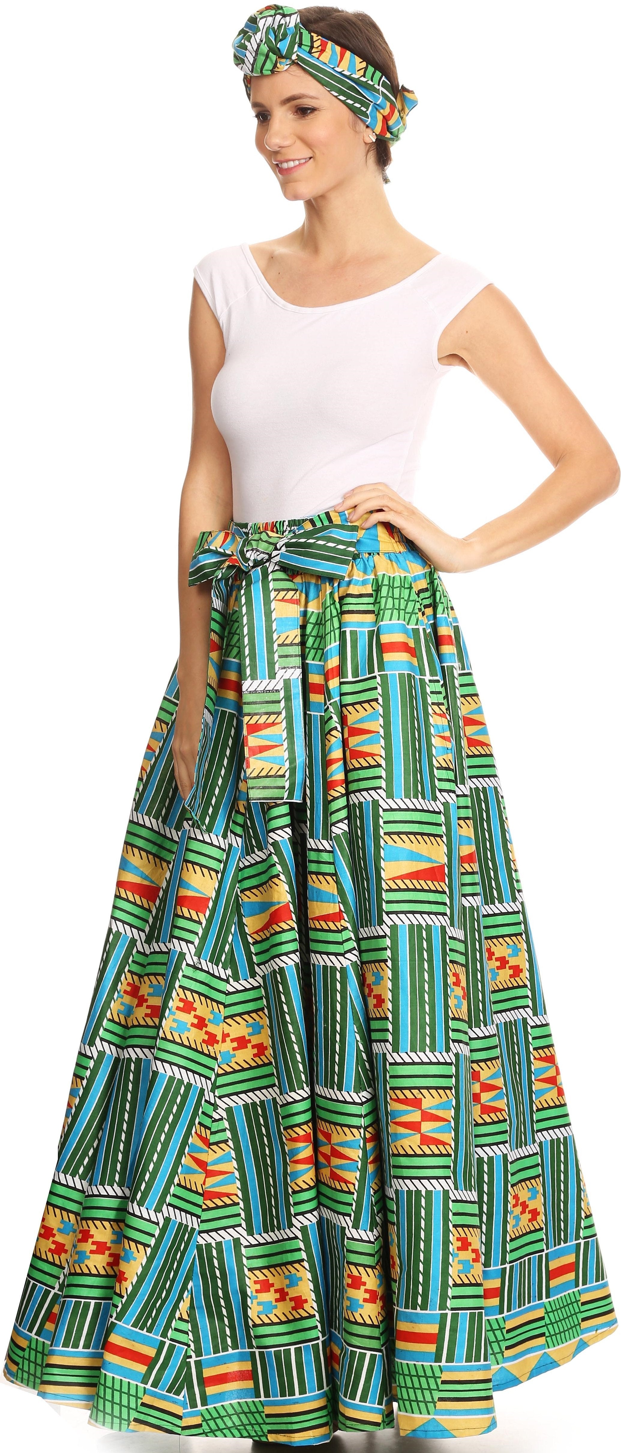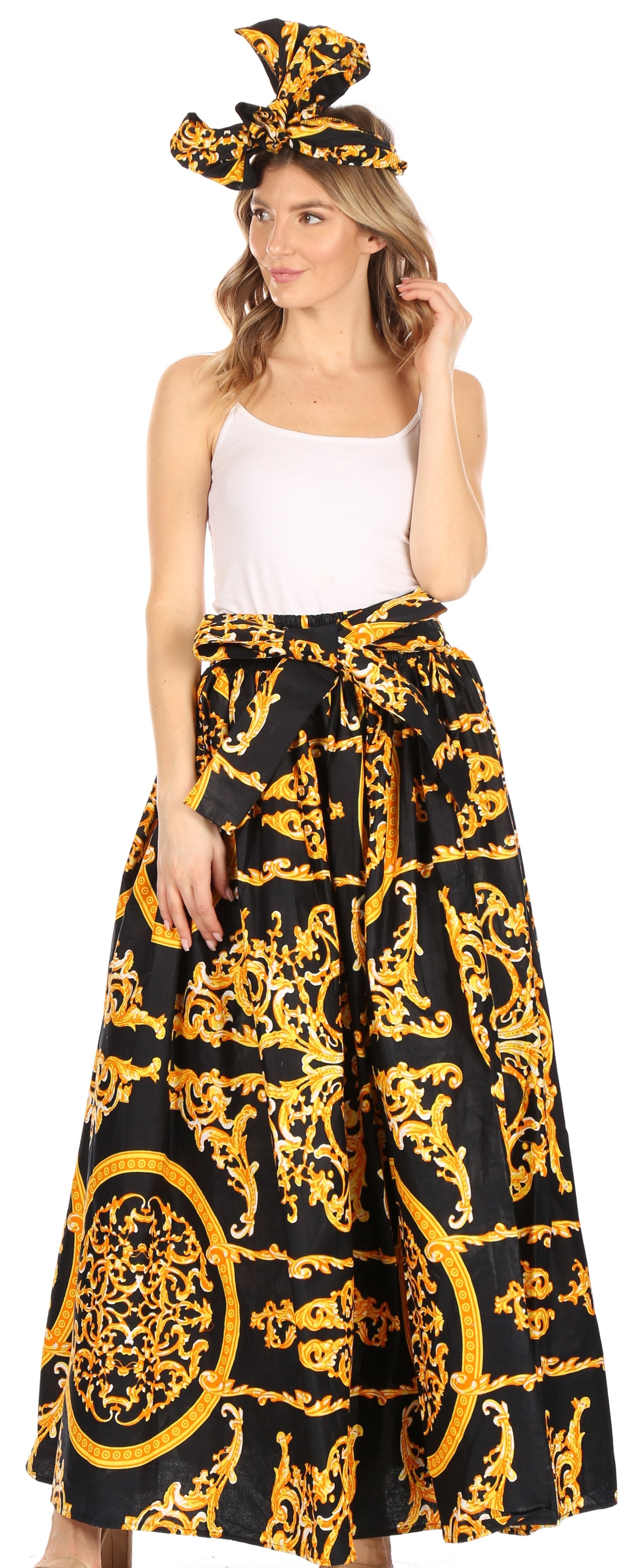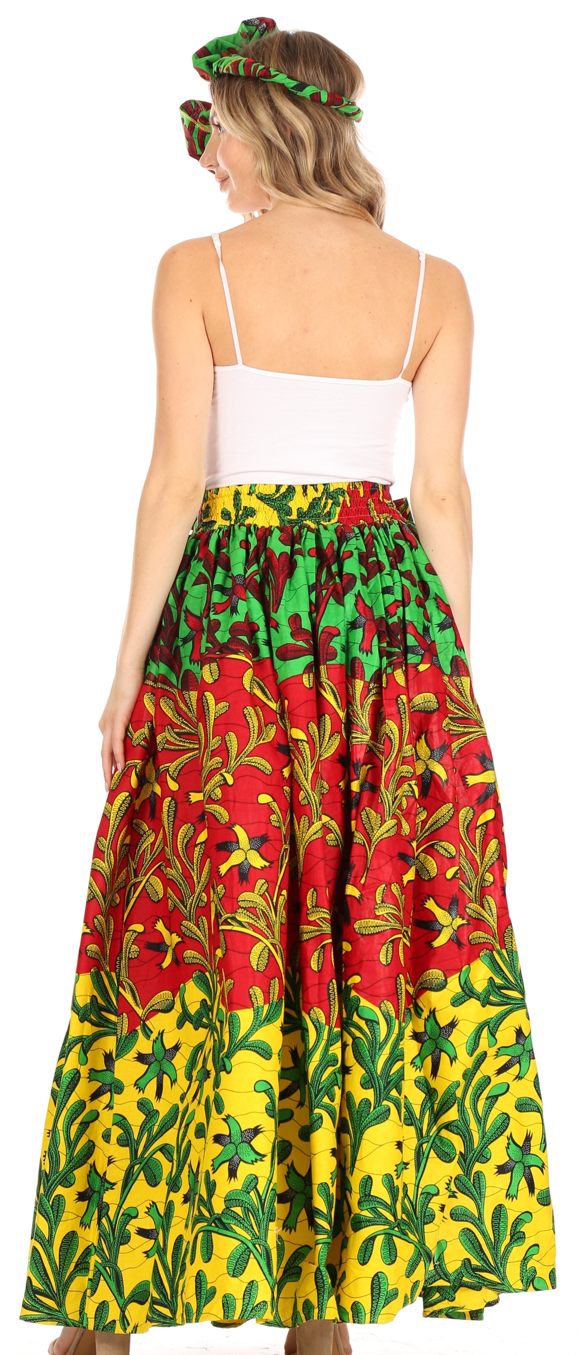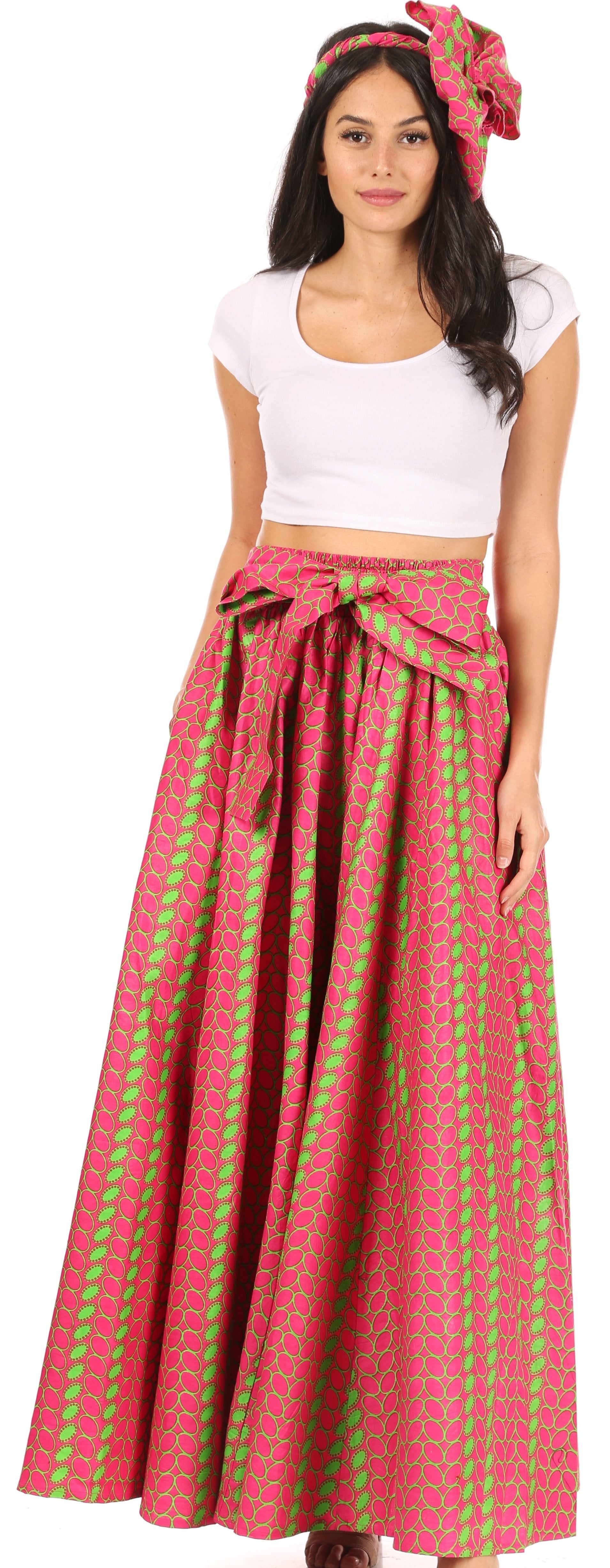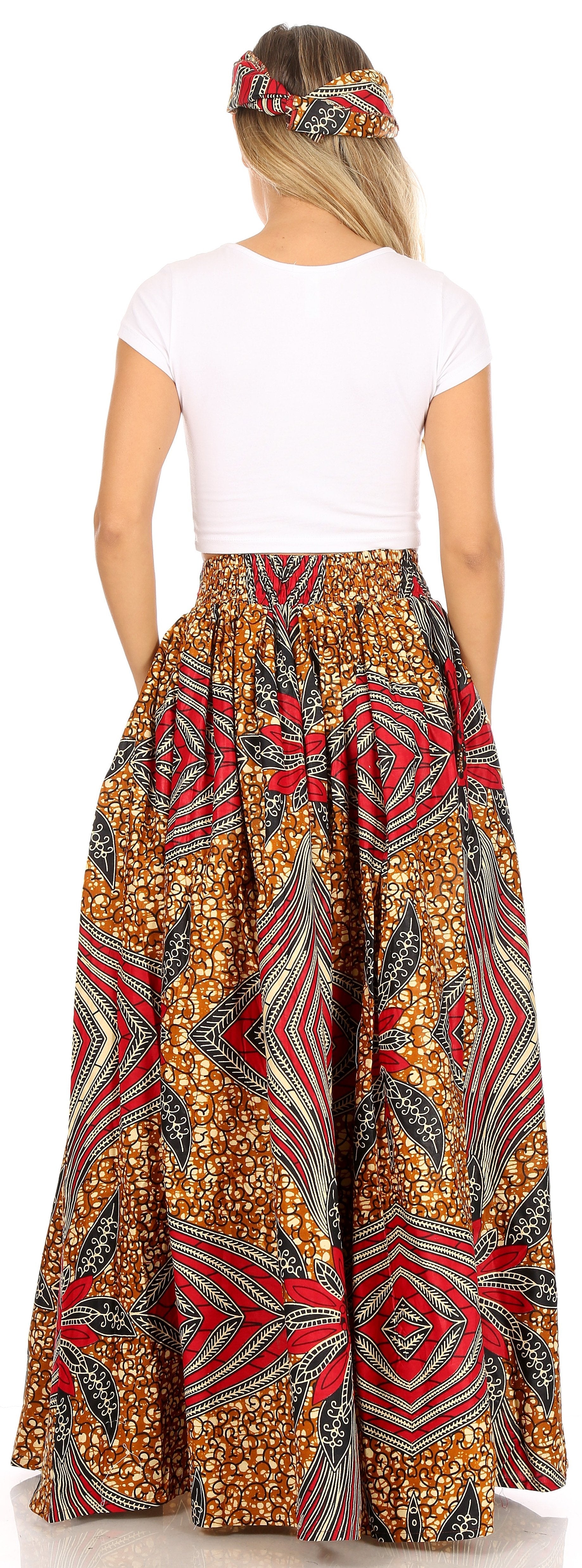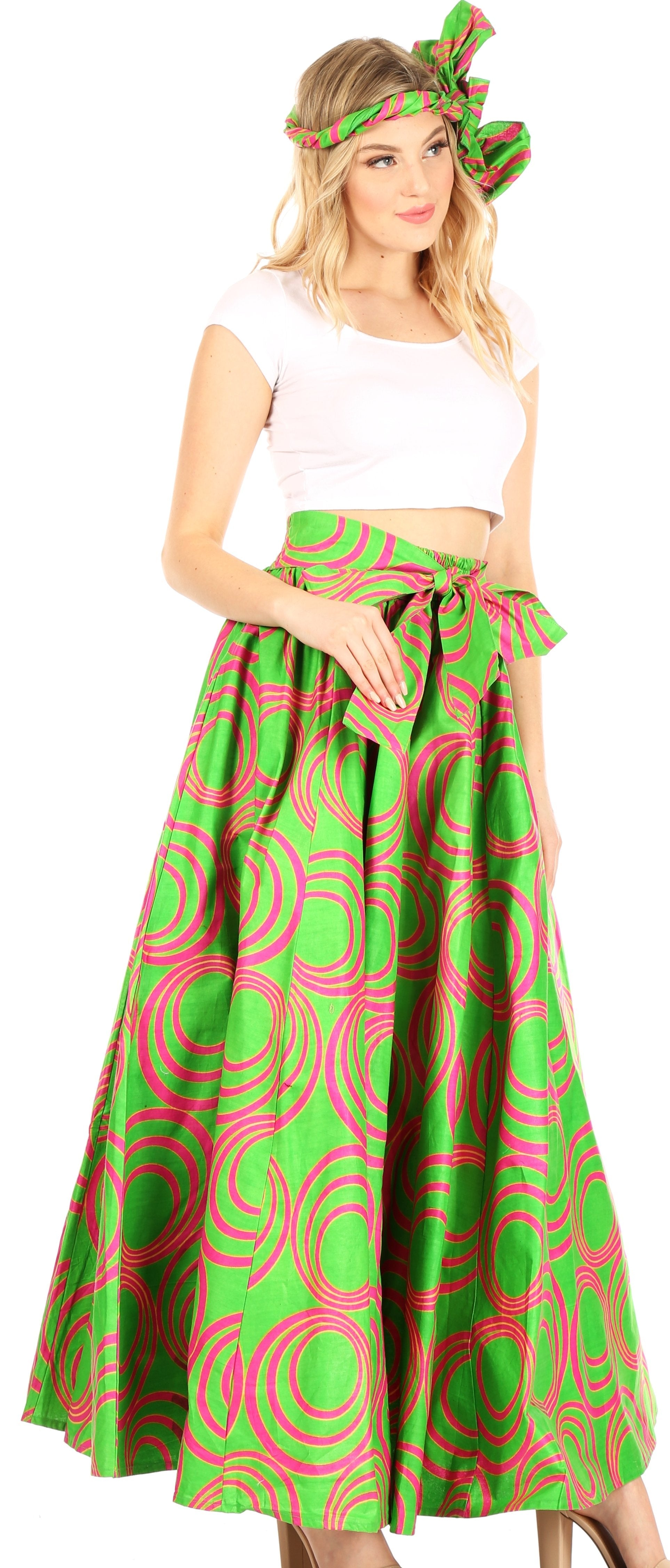 • This skirt features a long and wide flowing beautiful design. It is multi colored with a traditional wax print pattern. This skirt has pockets at the side for a total of two pockets. Pockets are deep and comfortable. A broad elastic waist band and adjustable wrap around strap allows skirt to easily convert into an elegant and carefree dress. This versatile item also features a beautiful head scarf in matching print.