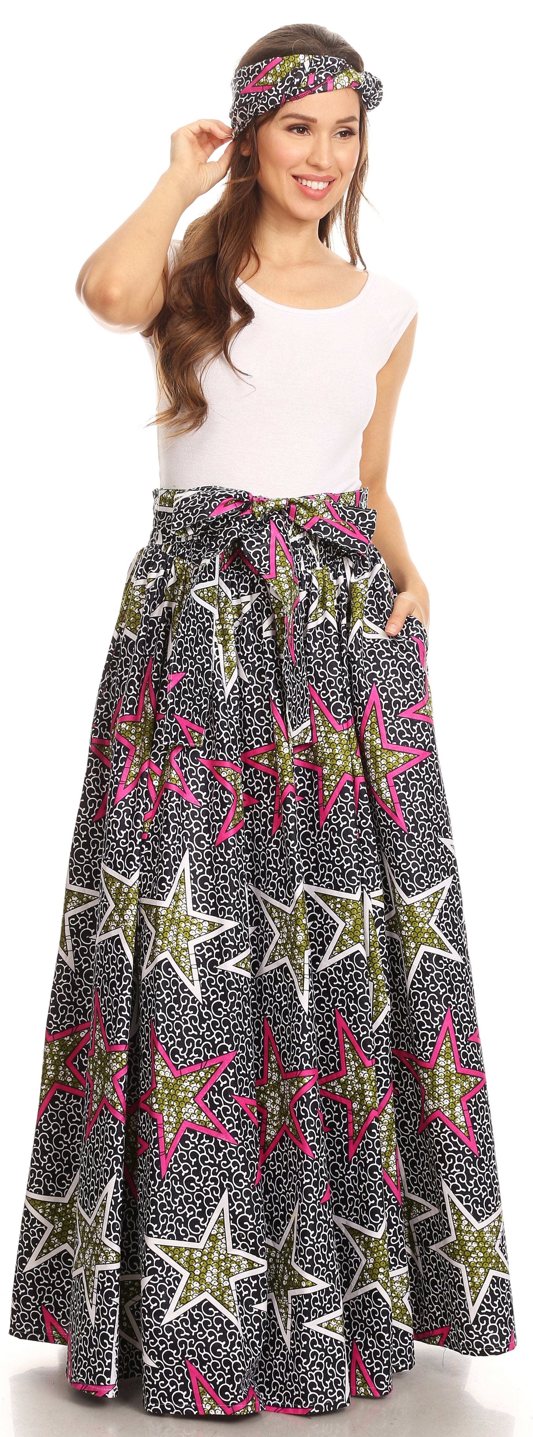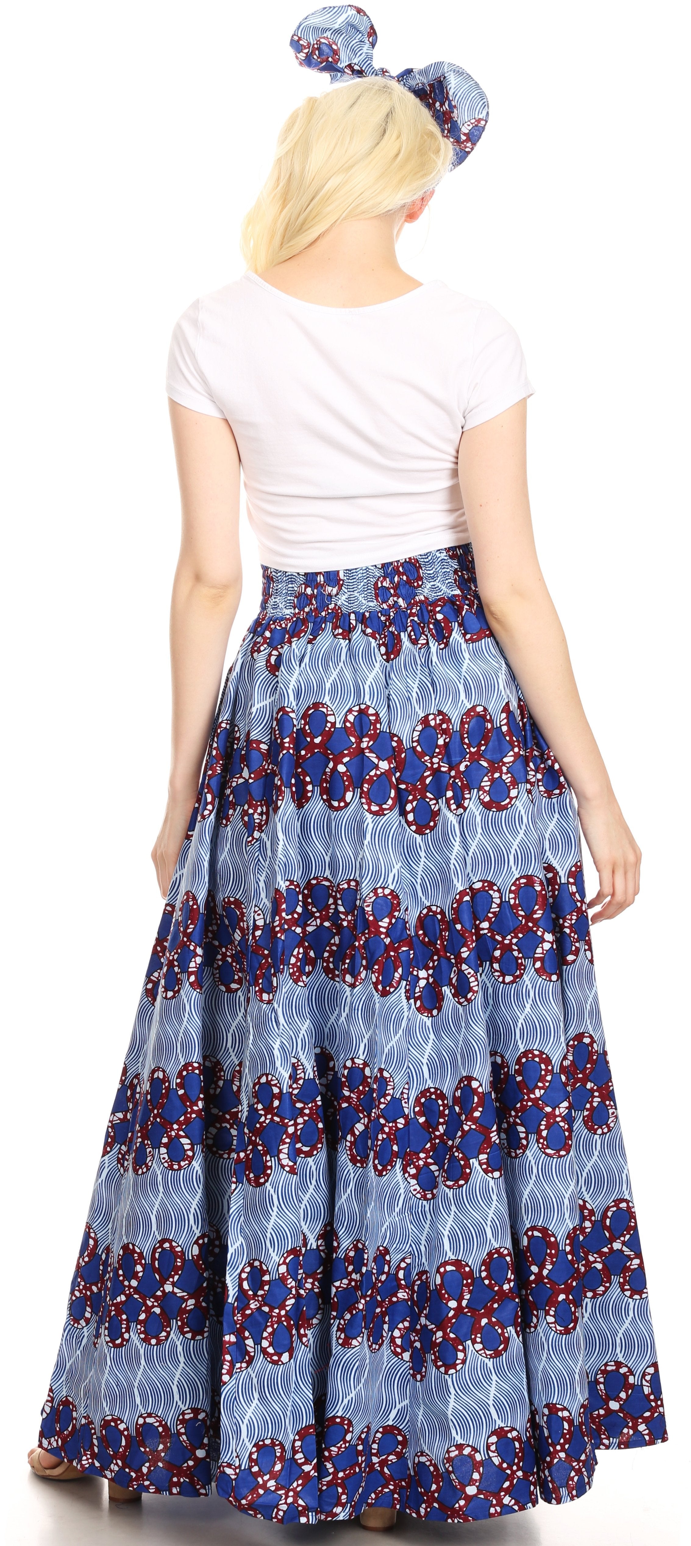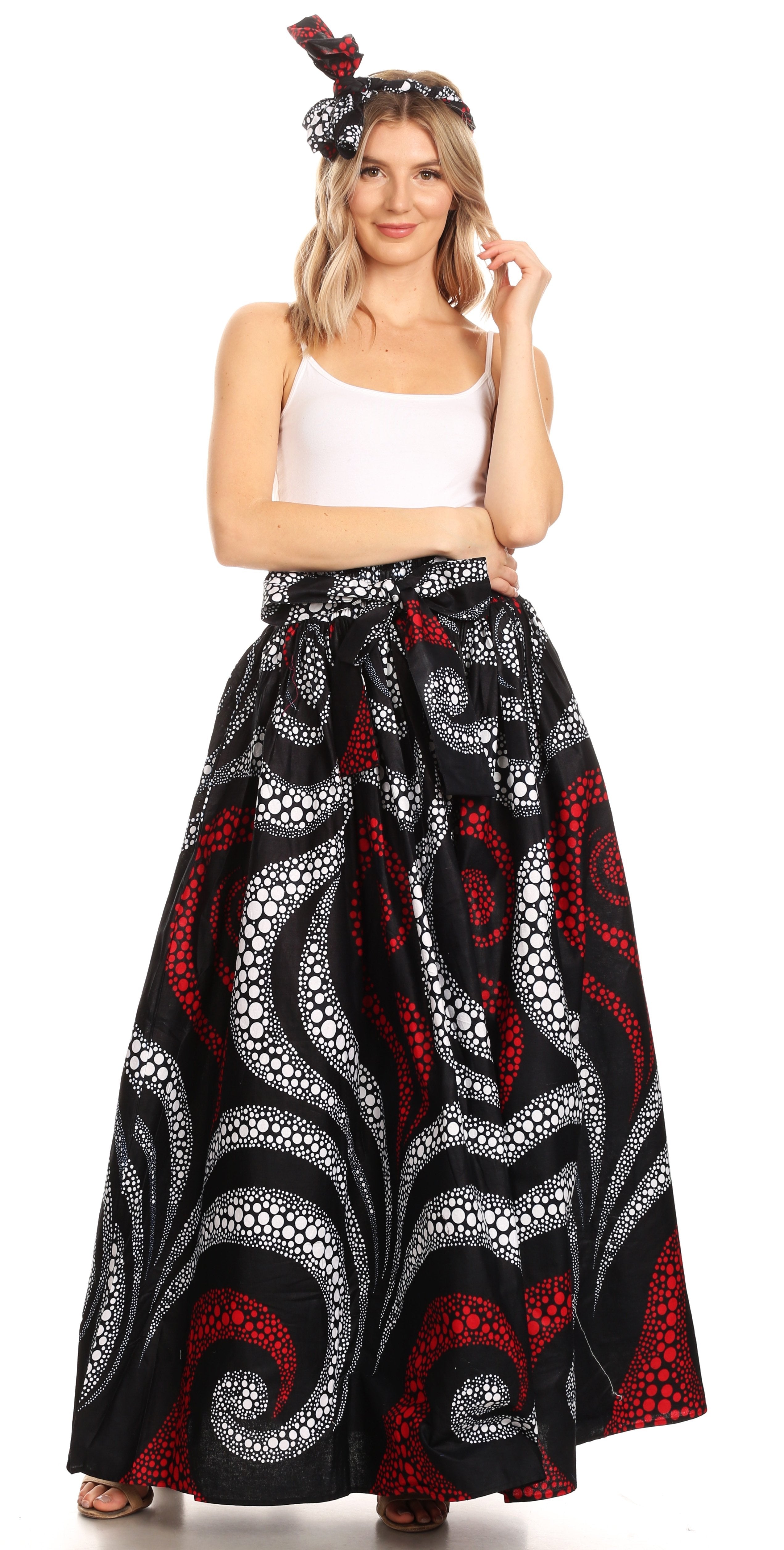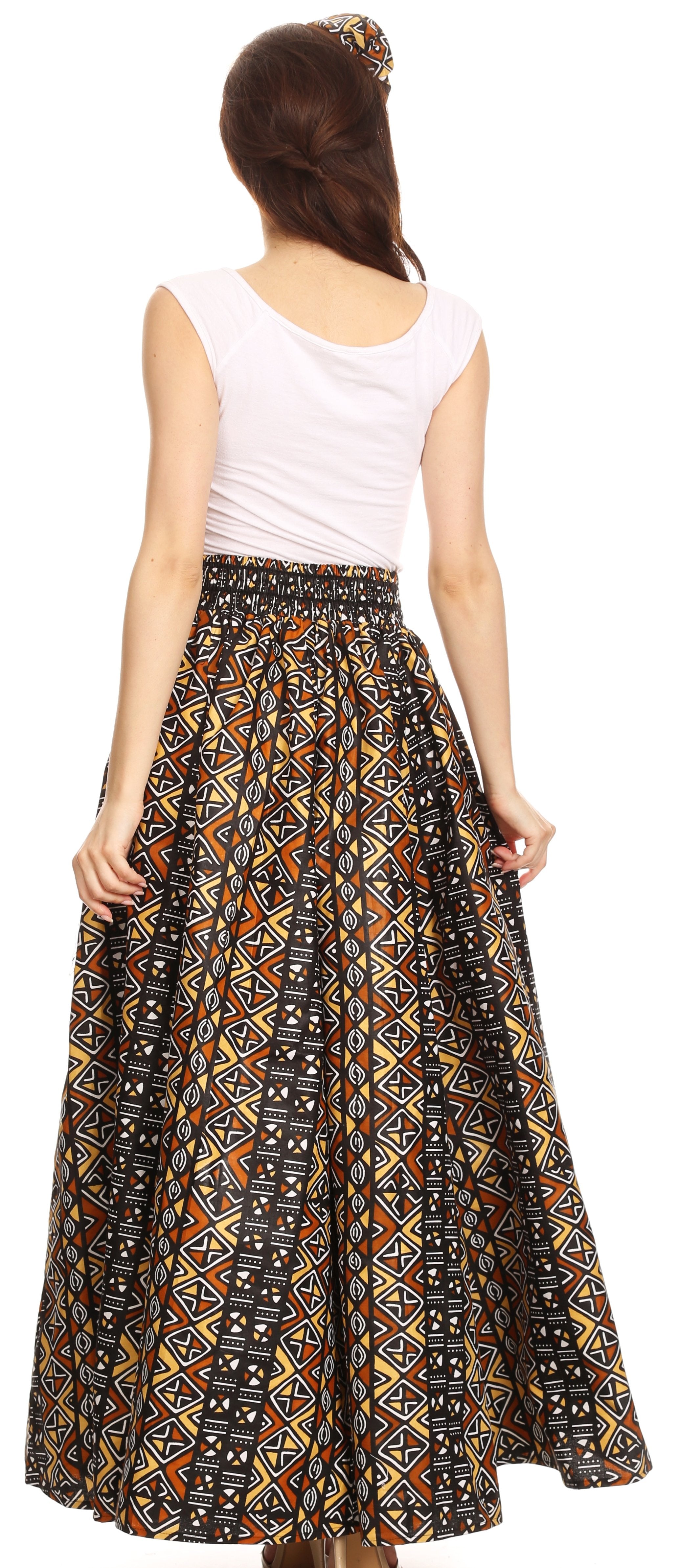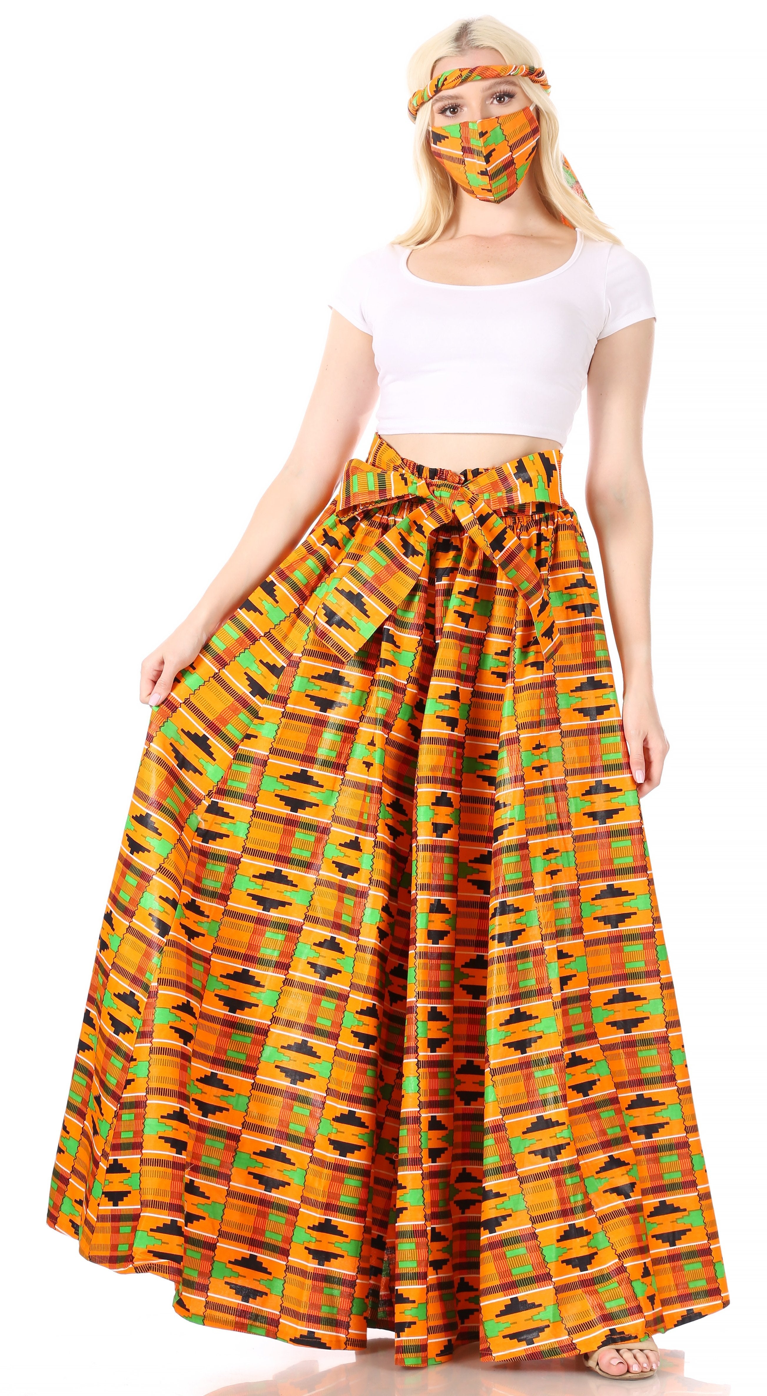 • This skirt features a long and wide flowing beautiful design. It is multi colored with a traditional wax print pattern. This skirt has pockets at the side for a total of two pockets. Pockets are deep and comfortable. A broad elastic waist band and adjustable wrap around strap allows skirt to easily convert into an elegant and carefree dress. This versatile item also features a beautiful head scarf in matching print.