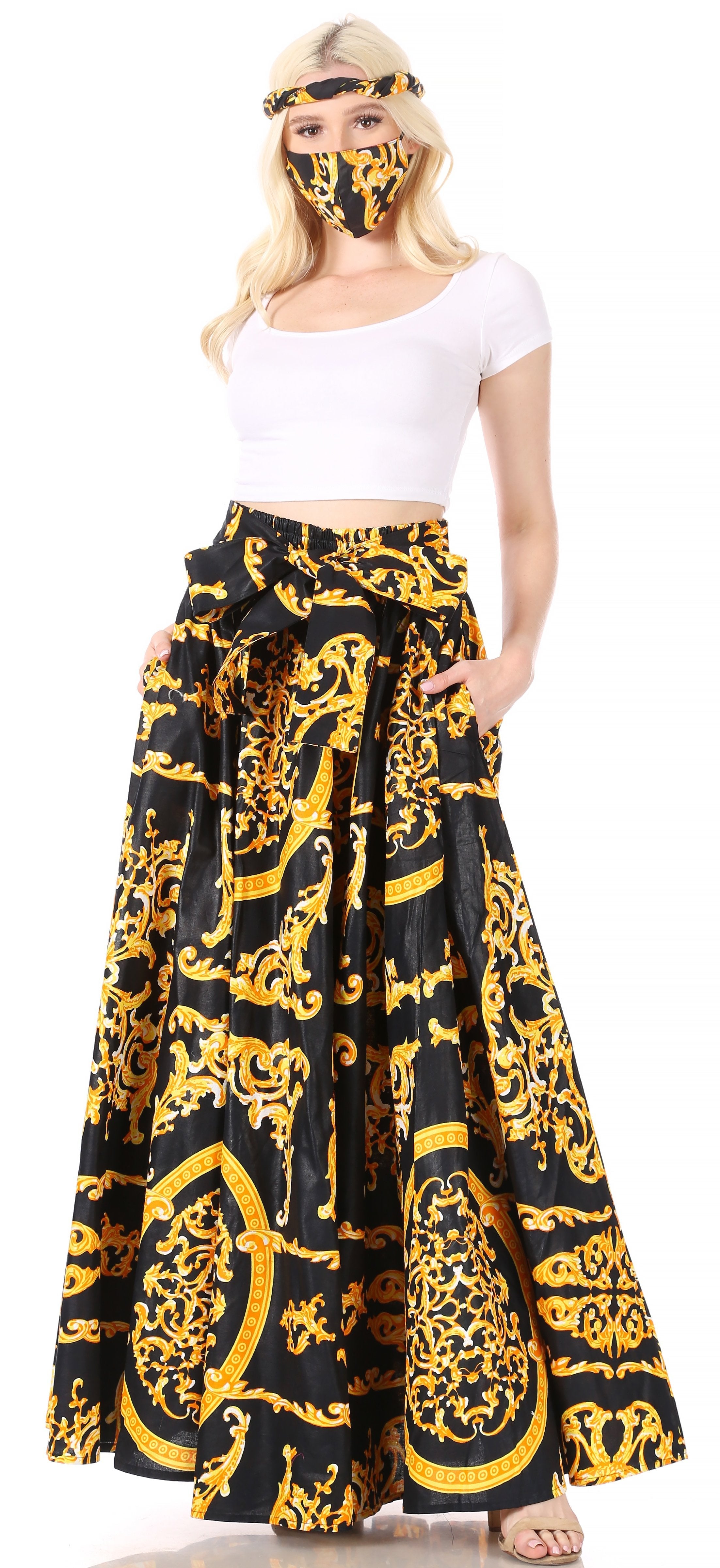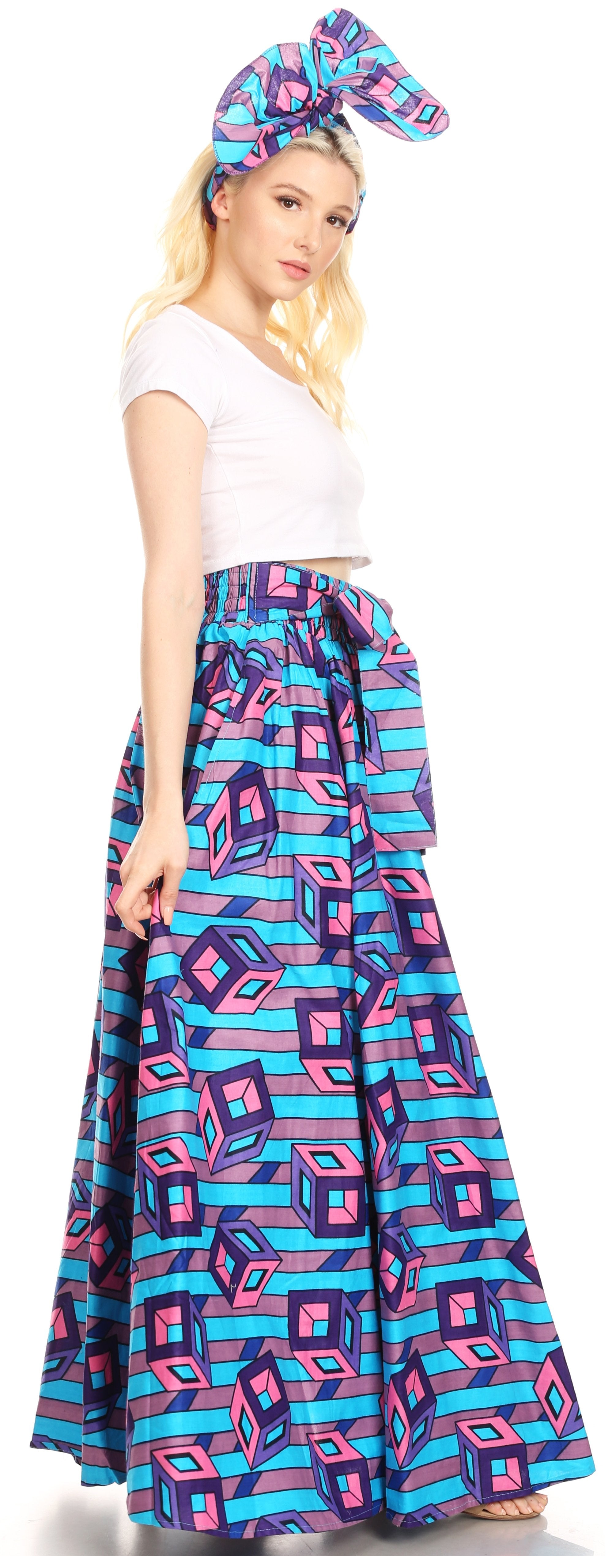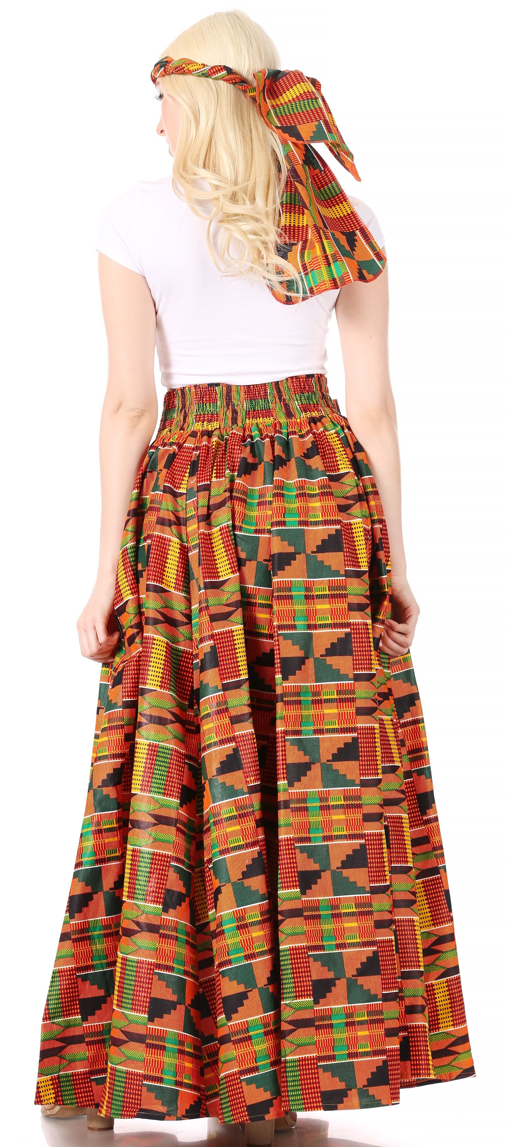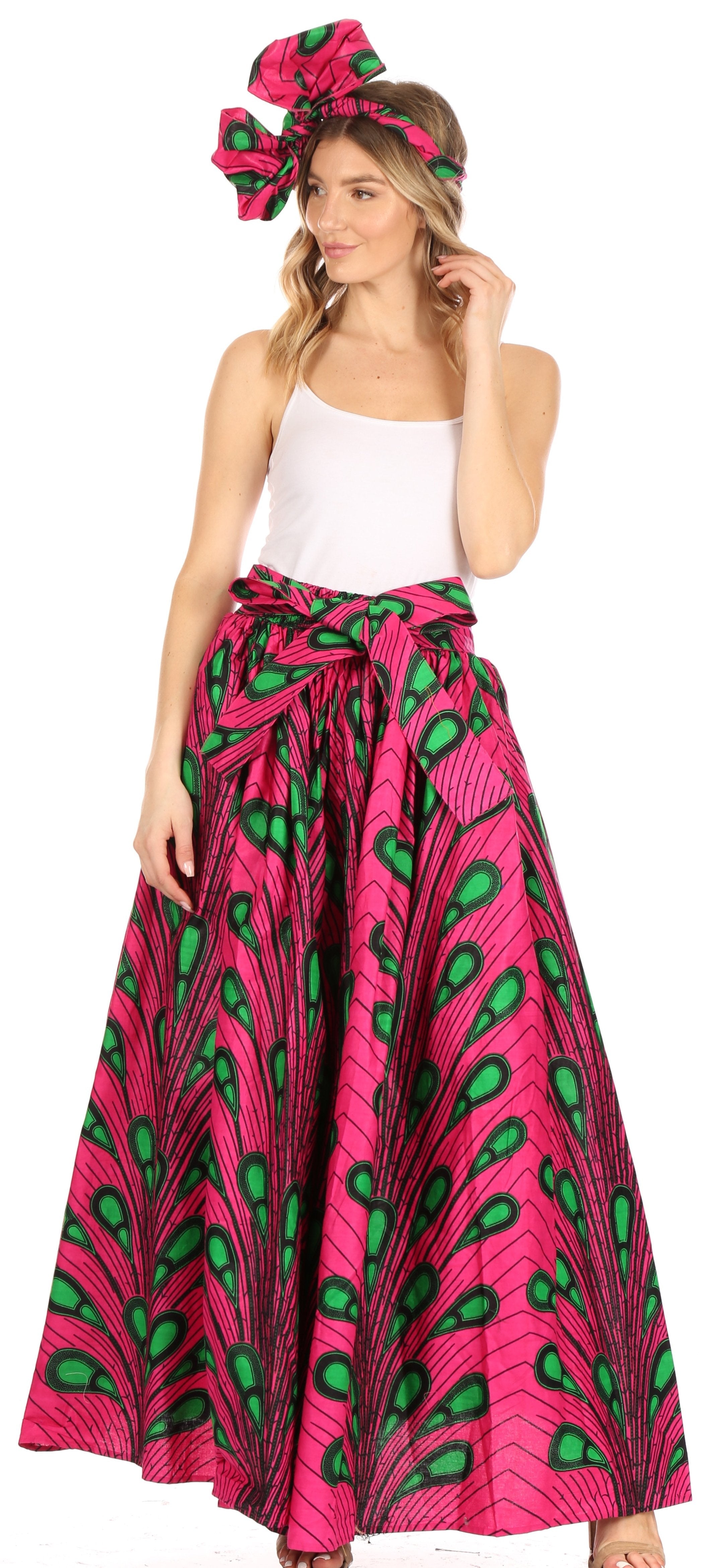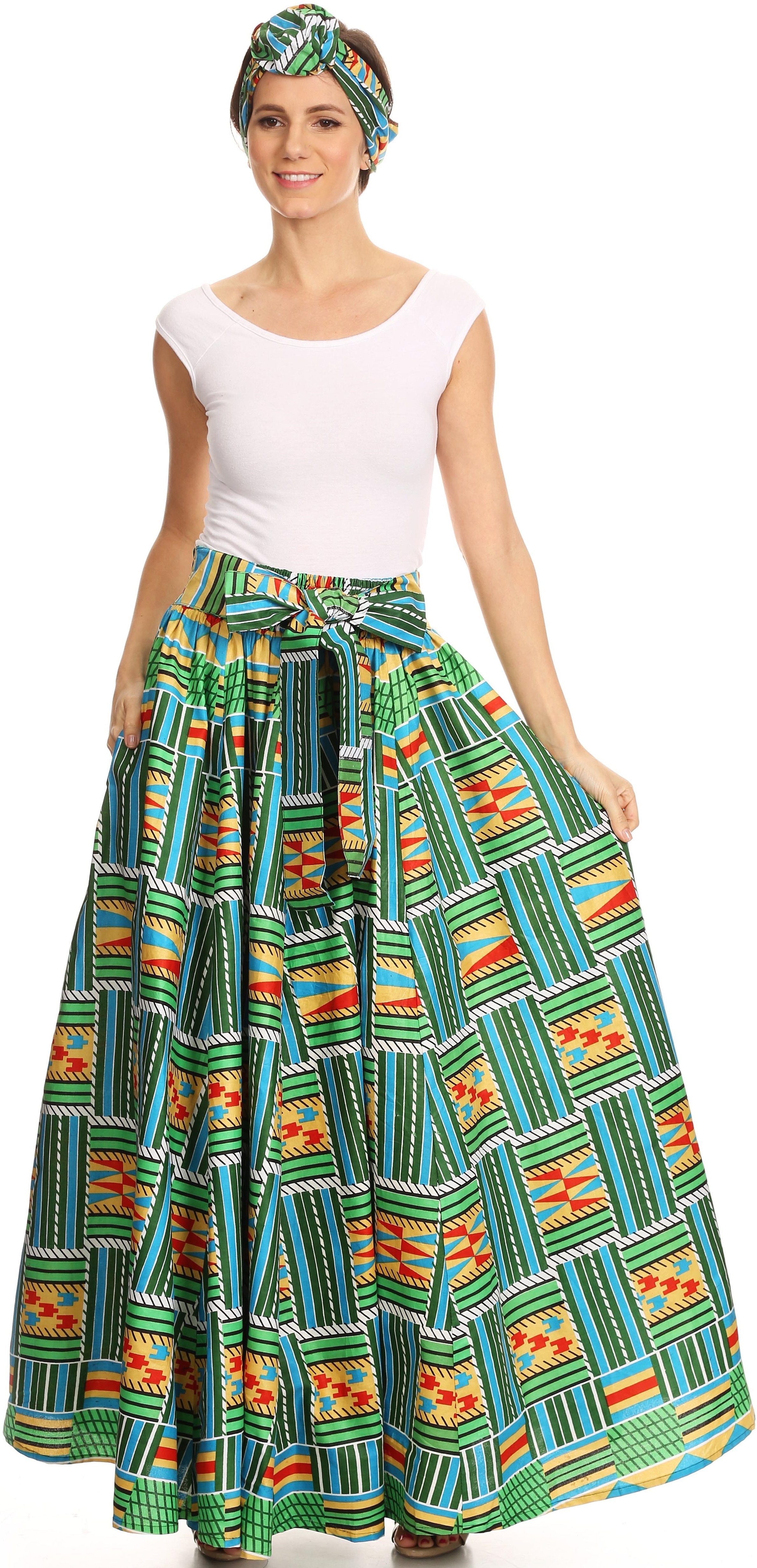 • This skirt features a long and wide flowing beautiful design. It is multi colored with a traditional wax print pattern. This skirt has pockets at the side for a total of two pockets. Pockets are deep and comfortable. A broad elastic waist band and adjustable wrap around strap allows skirt to easily convert into an elegant and carefree dress. This versatile item also features a beautiful head scarf in matching print.