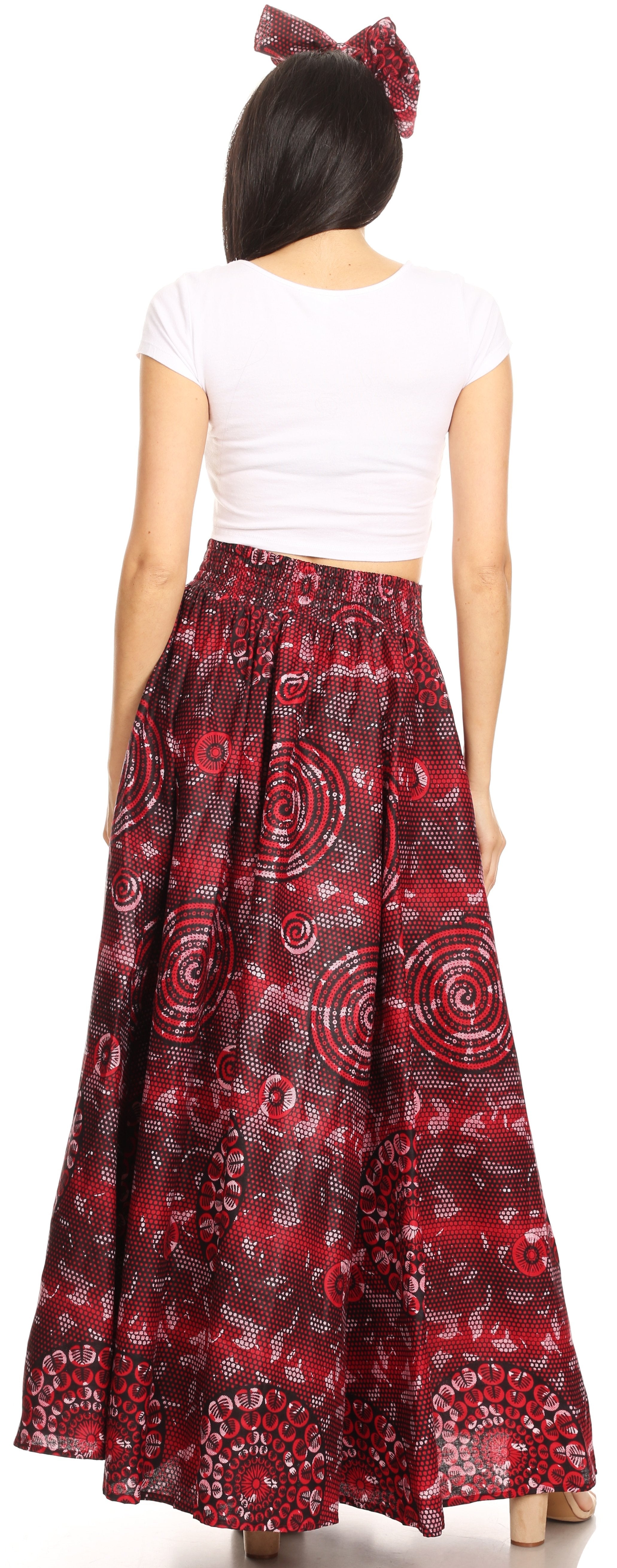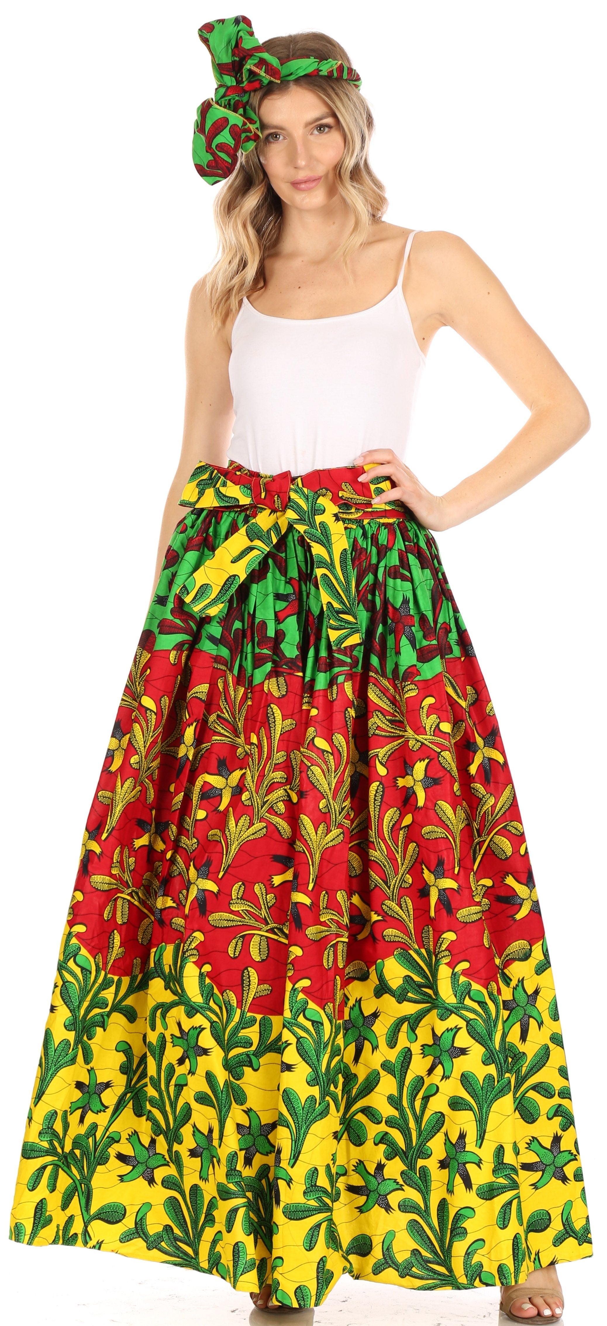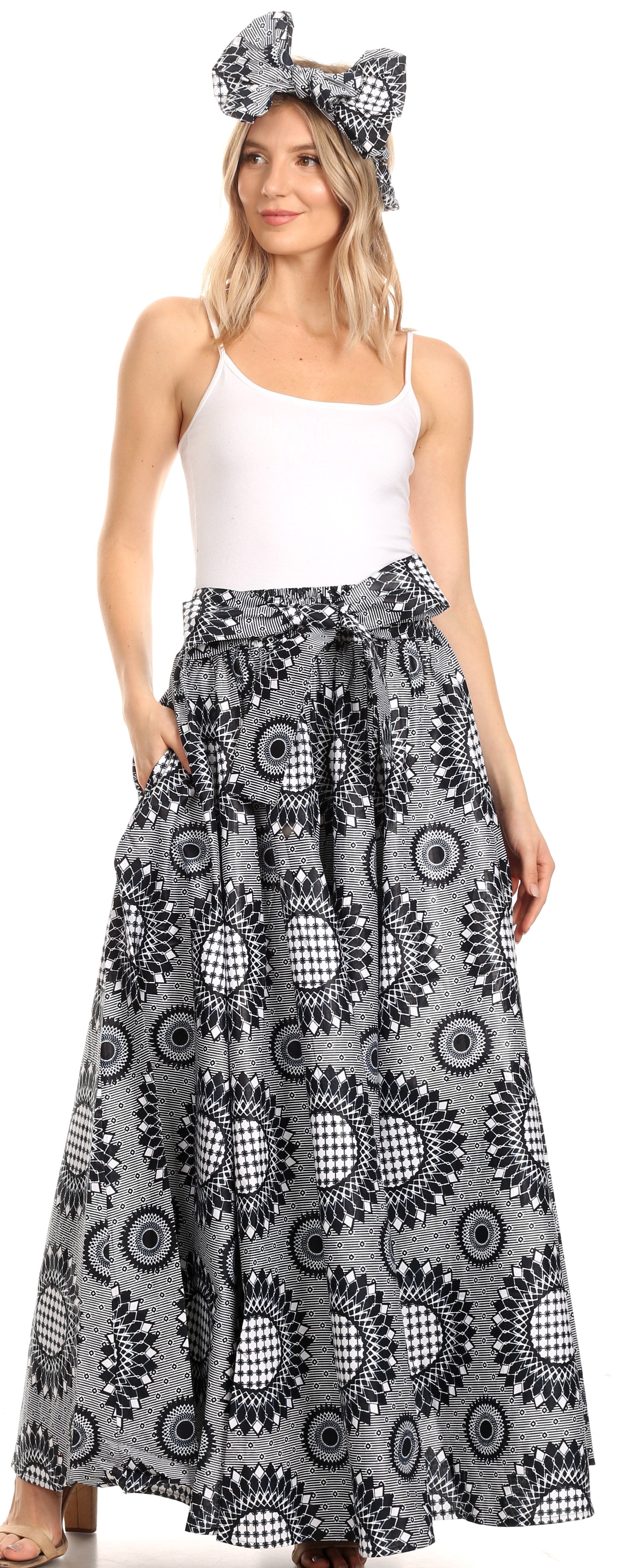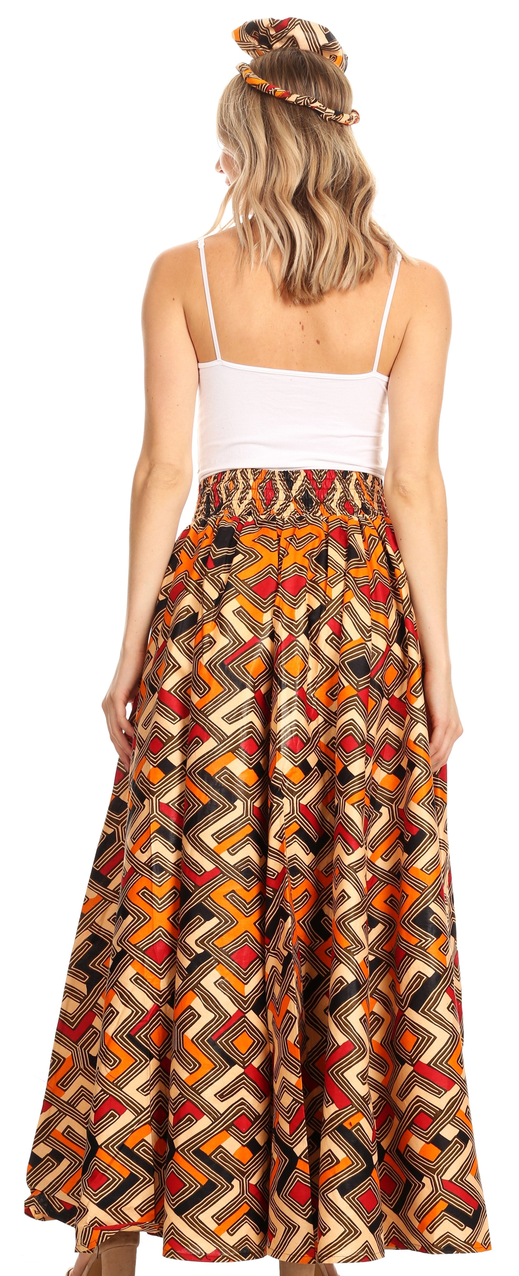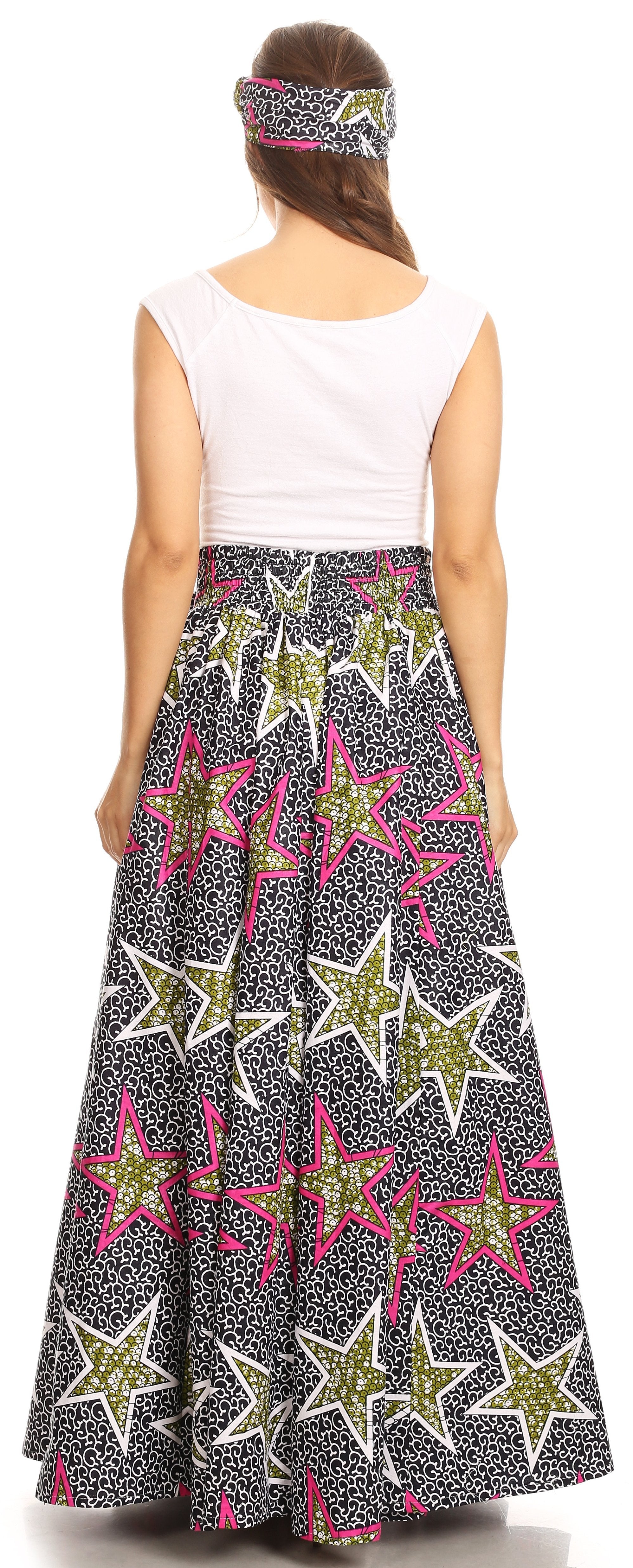 • This skirt features a long and wide flowing beautiful design. It is multi colored with a traditional wax print pattern. This skirt has pockets at the side for a total of two pockets. Pockets are deep and comfortable. A broad elastic waist band and adjustable wrap around strap allows skirt to easily convert into an elegant and carefree dress. This versatile item also features a beautiful head scarf in matching print.