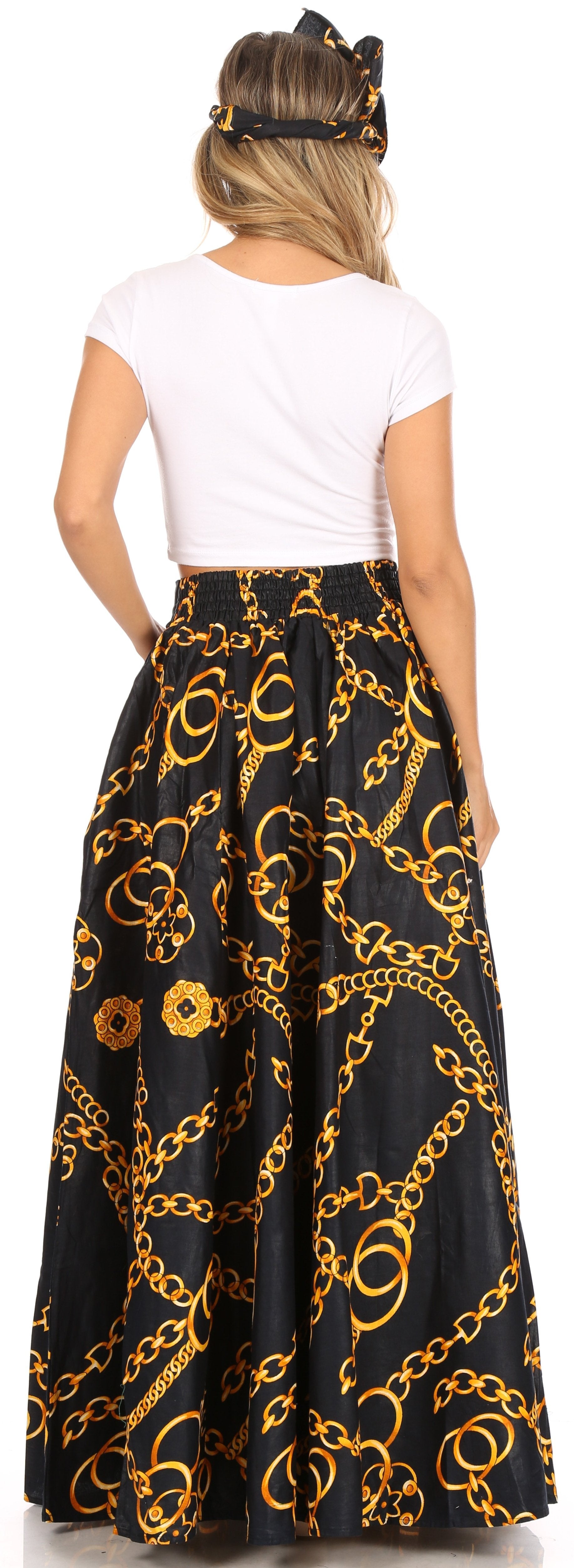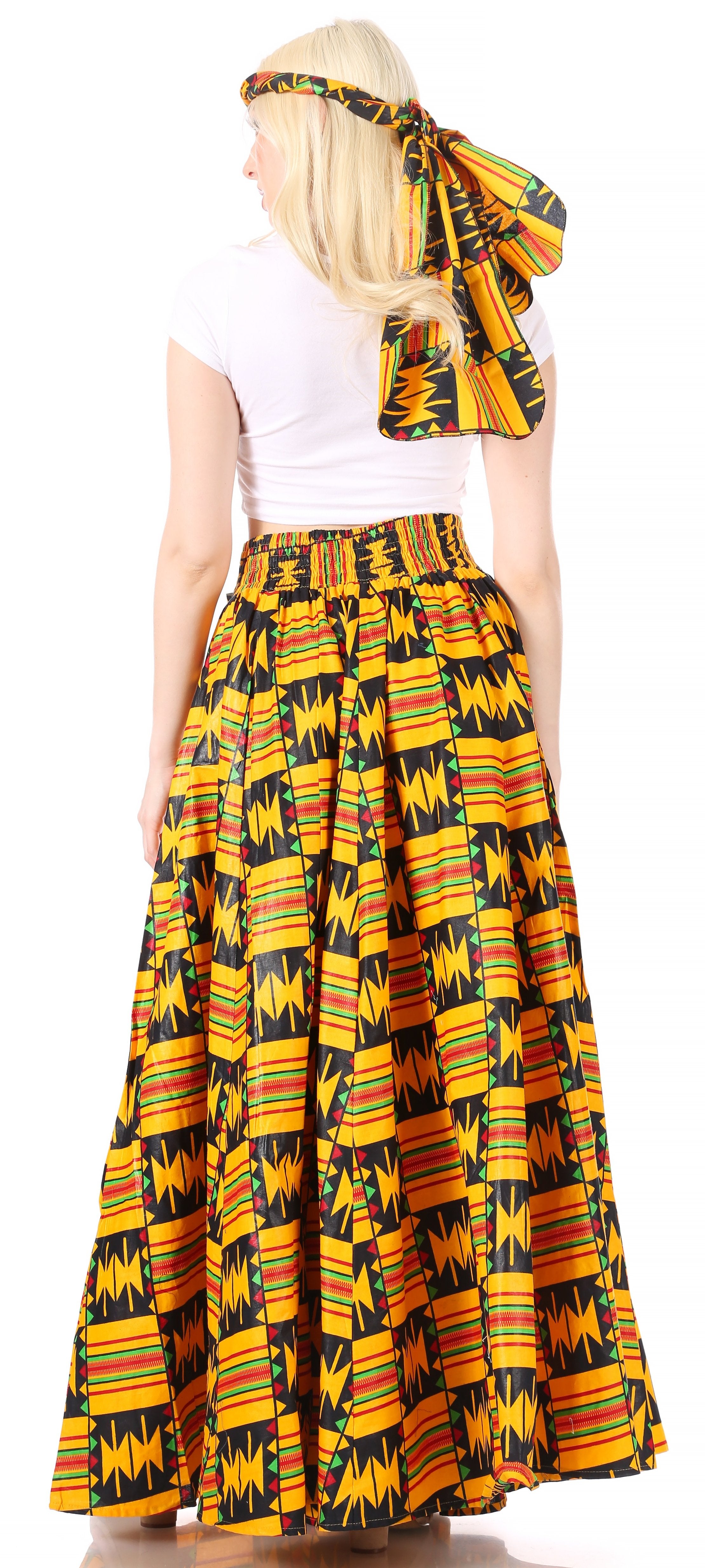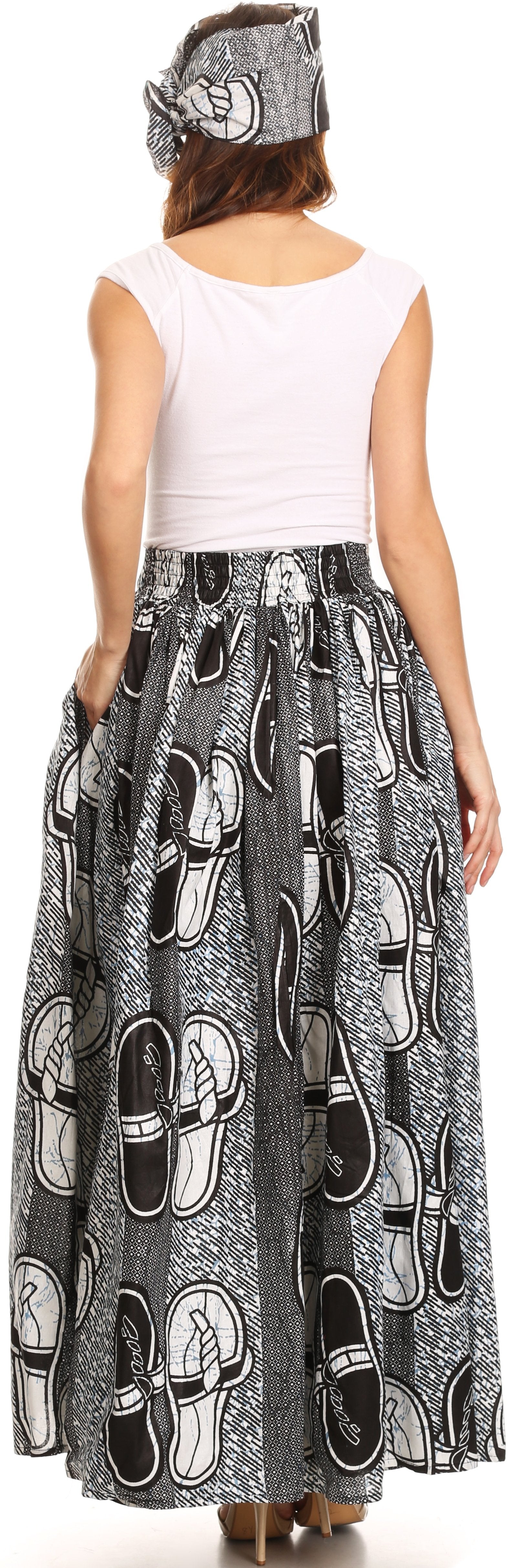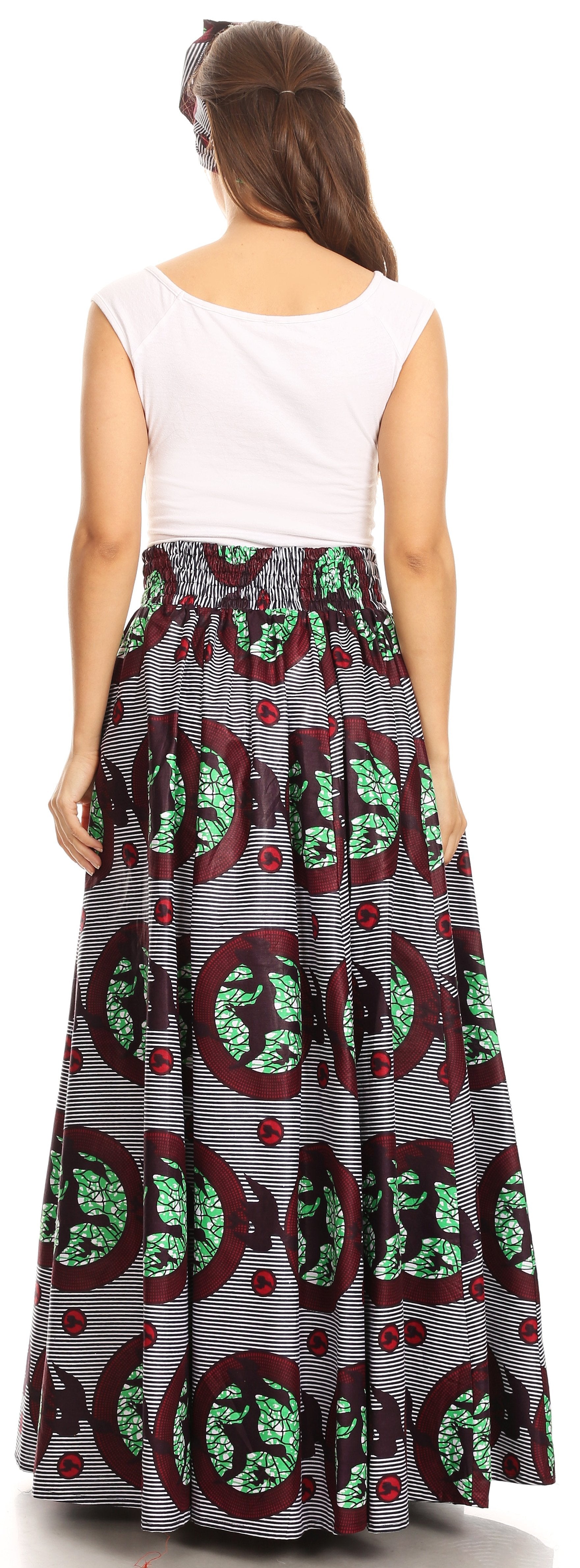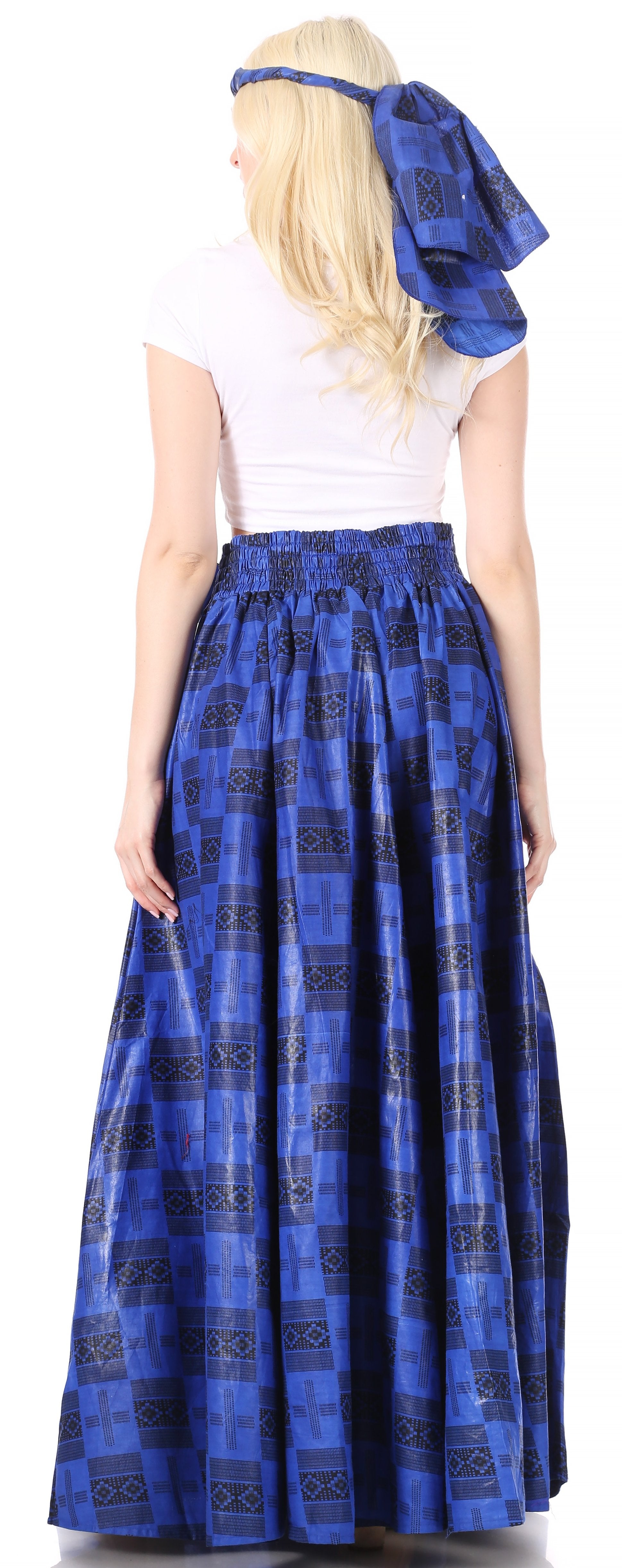 • This skirt features a long and wide flowing beautiful design. It is multi colored with a traditional wax print pattern. This skirt has pockets at the side for a total of two pockets. Pockets are deep and comfortable. A broad elastic waist band and adjustable wrap around strap allows skirt to easily convert into an elegant and carefree dress. This versatile item also features a beautiful head scarf in matching print.
