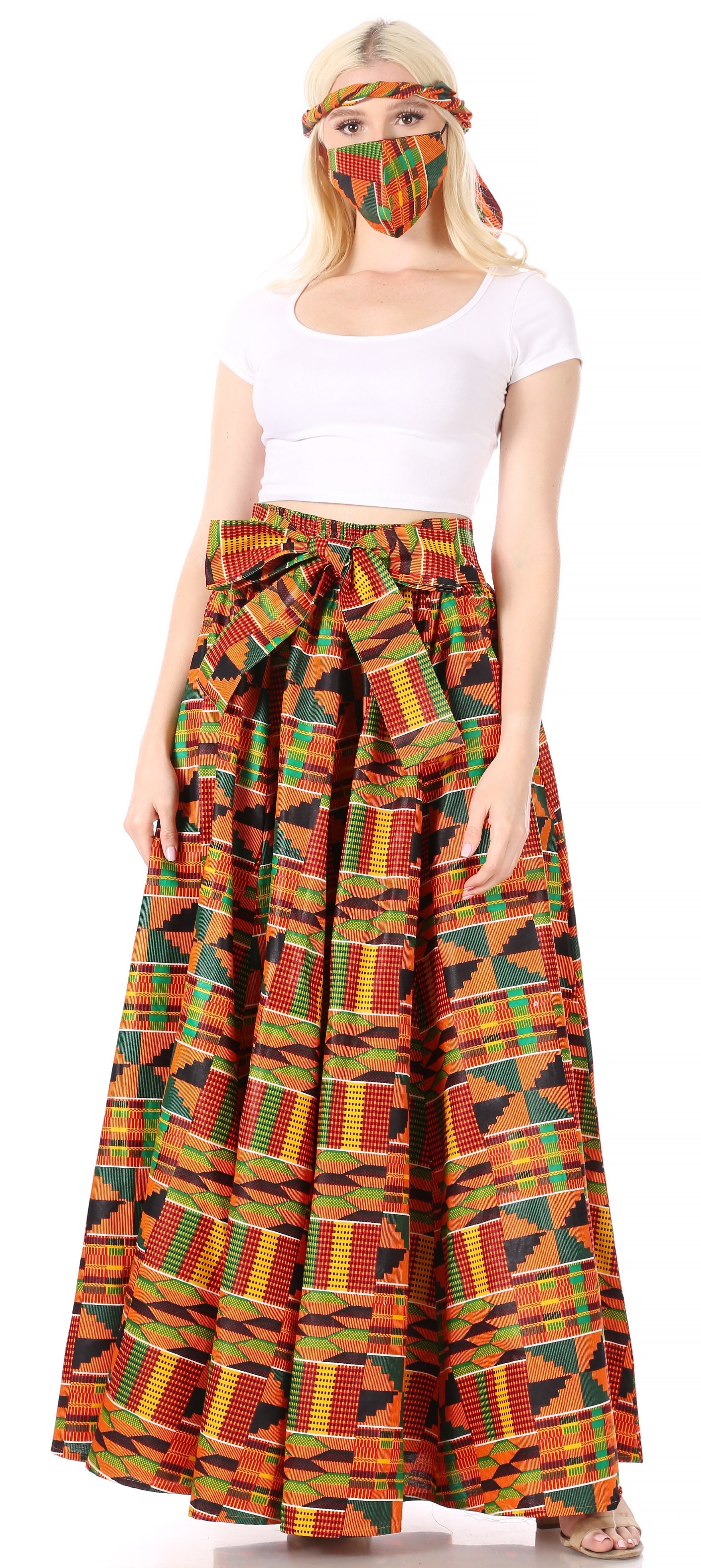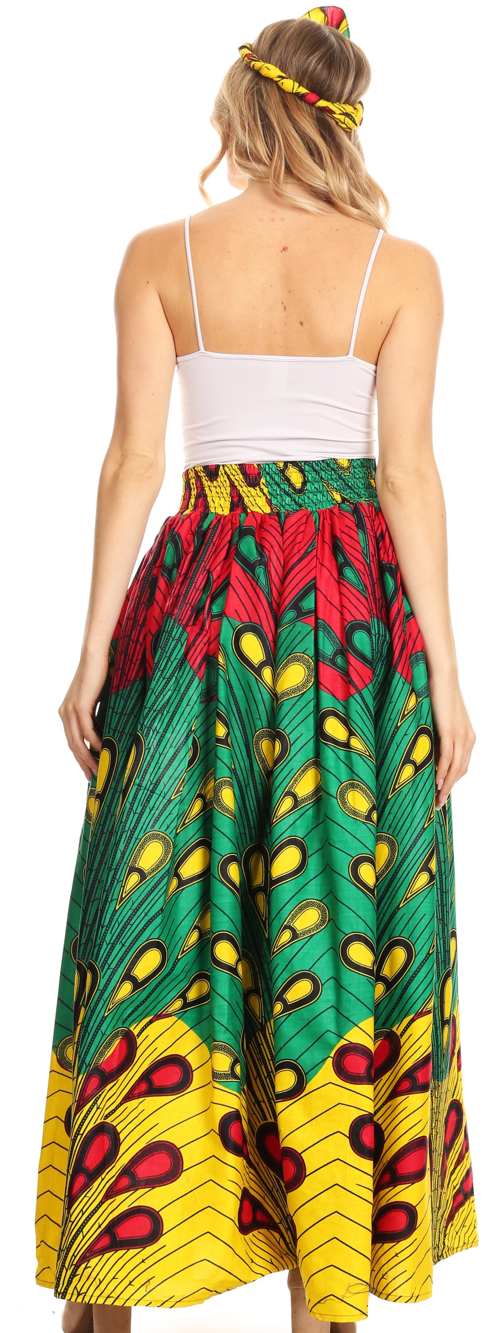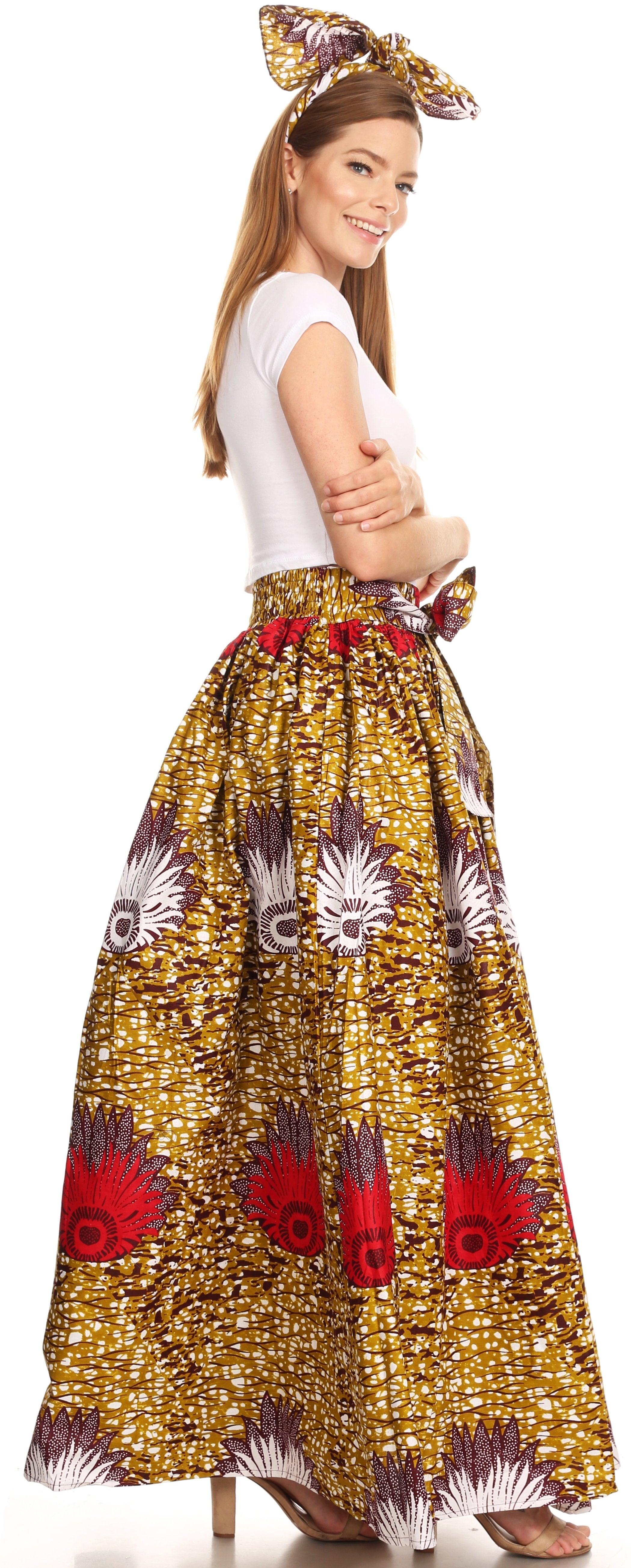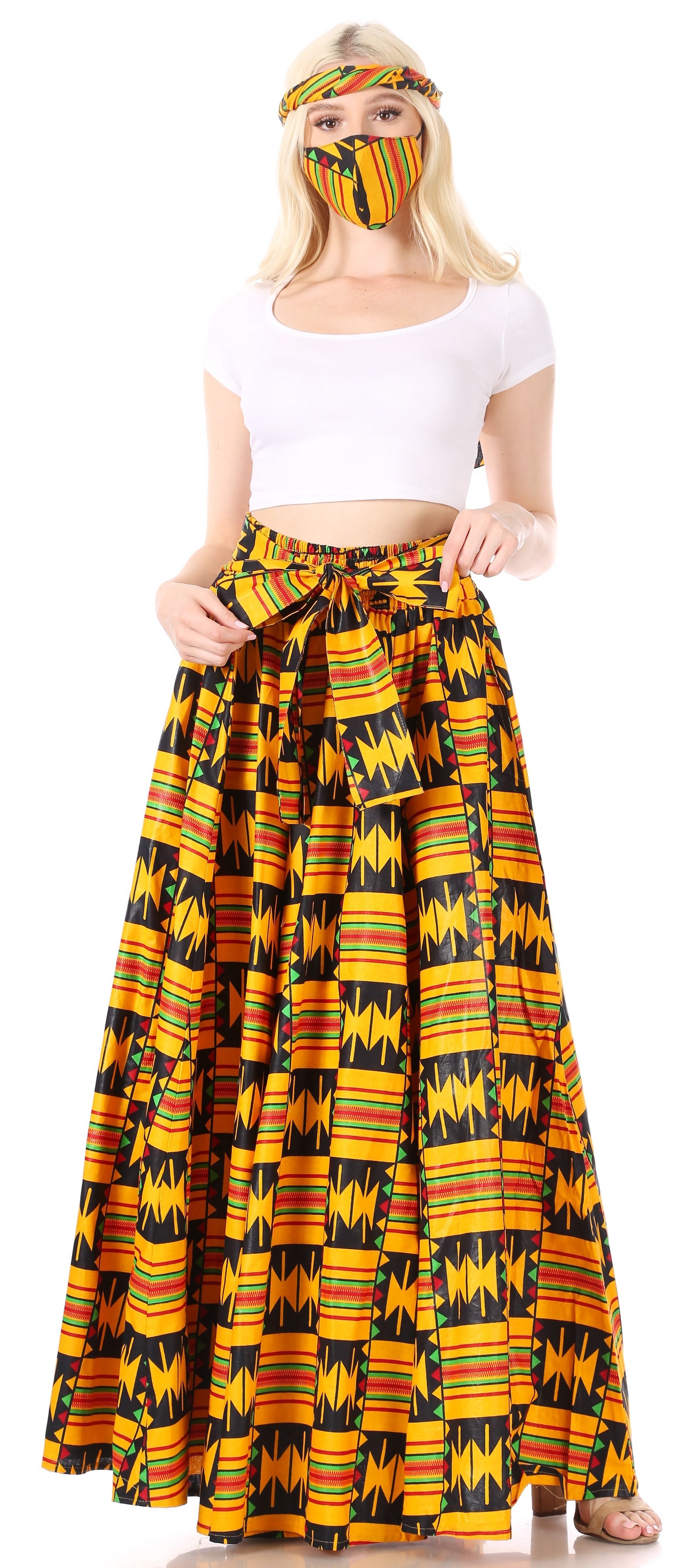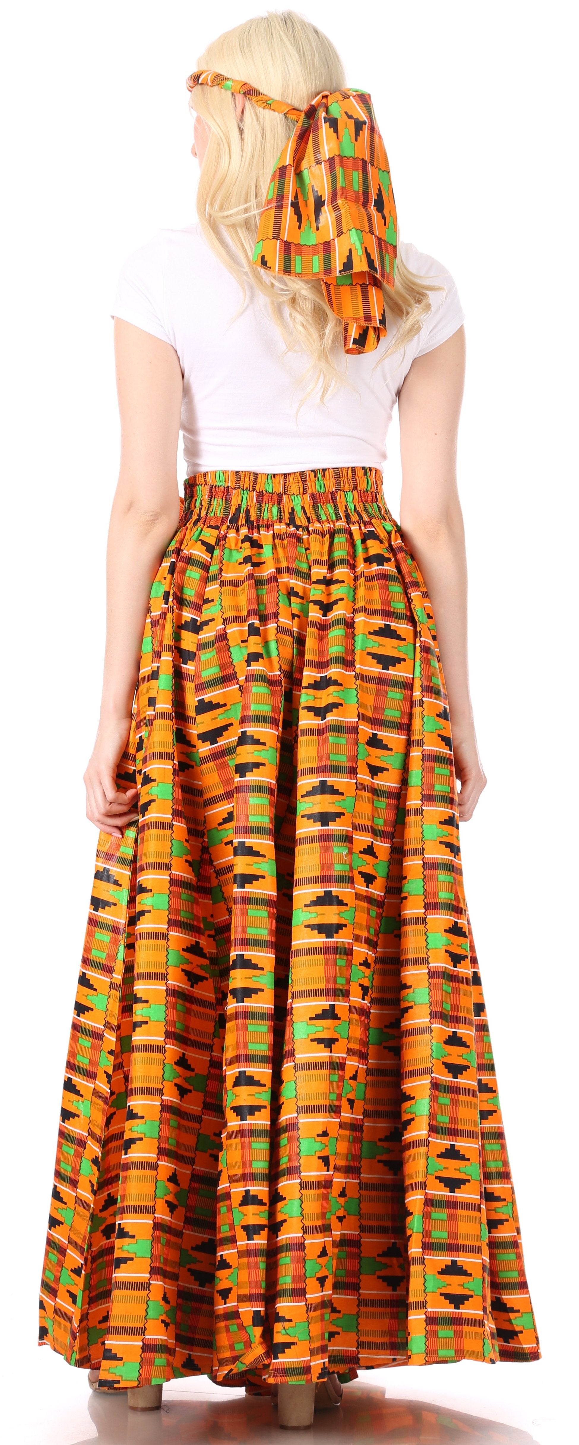 • This skirt features a long and wide flowing beautiful design. It is multi colored with a traditional wax print pattern. This skirt has pockets at the side for a total of two pockets. Pockets are deep and comfortable. A broad elastic waist band and adjustable wrap around strap allows skirt to easily convert into an elegant and carefree dress. This versatile item also features a beautiful head scarf in matching print.
