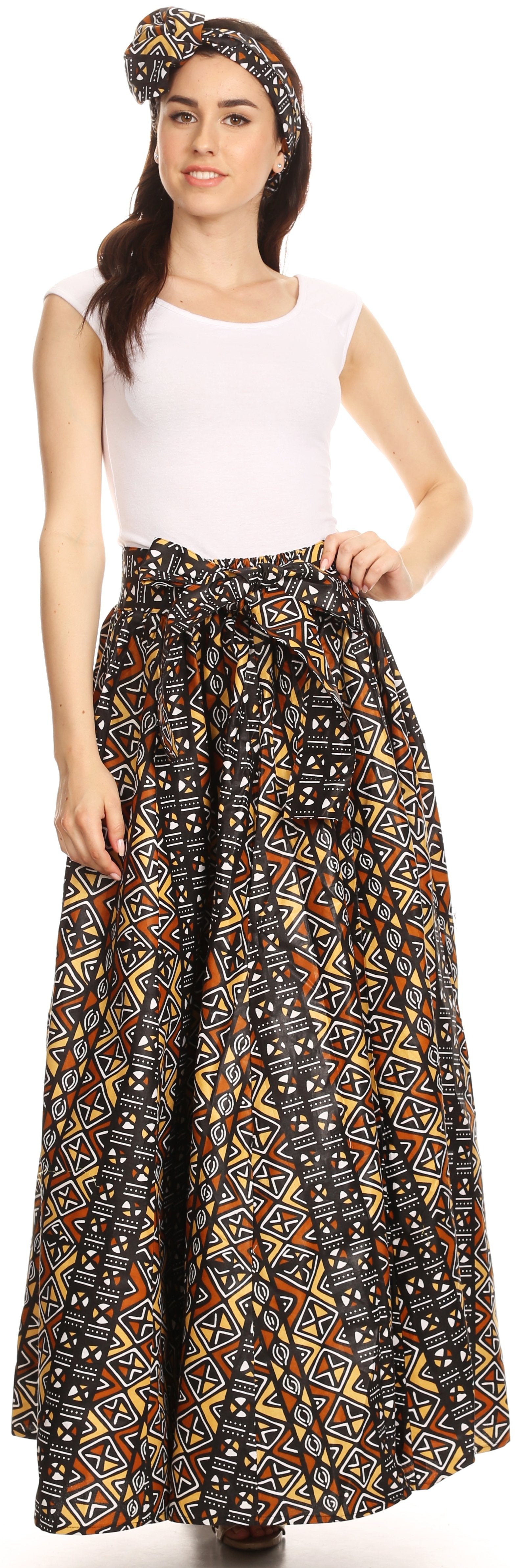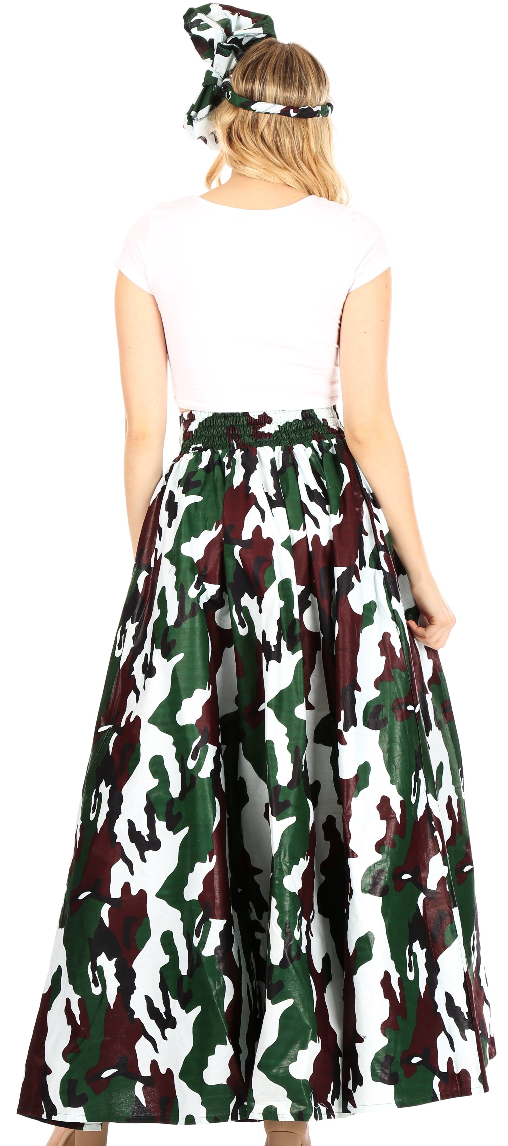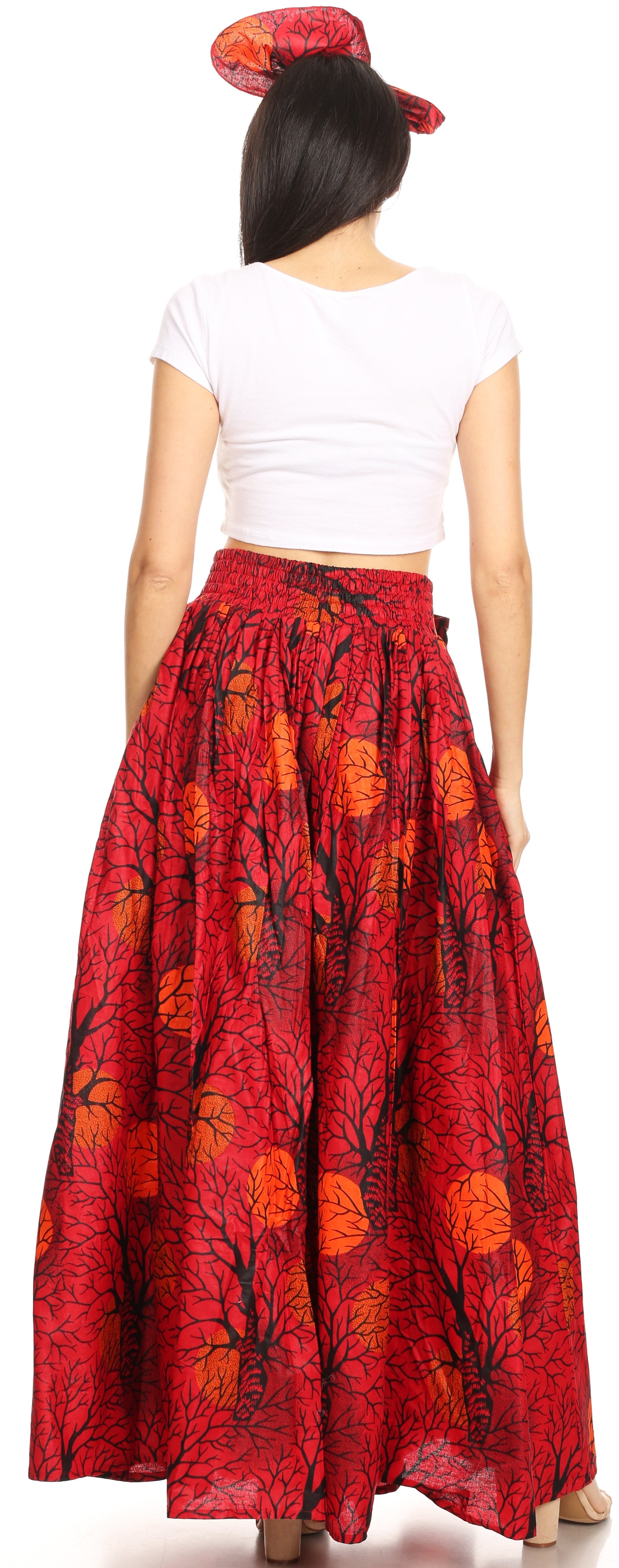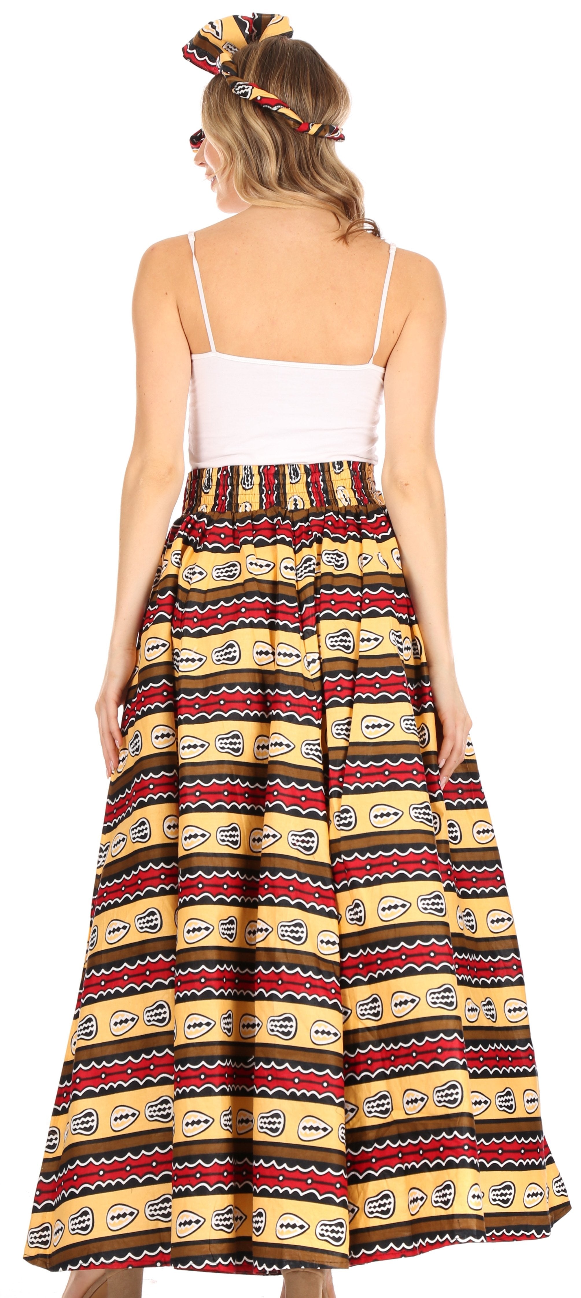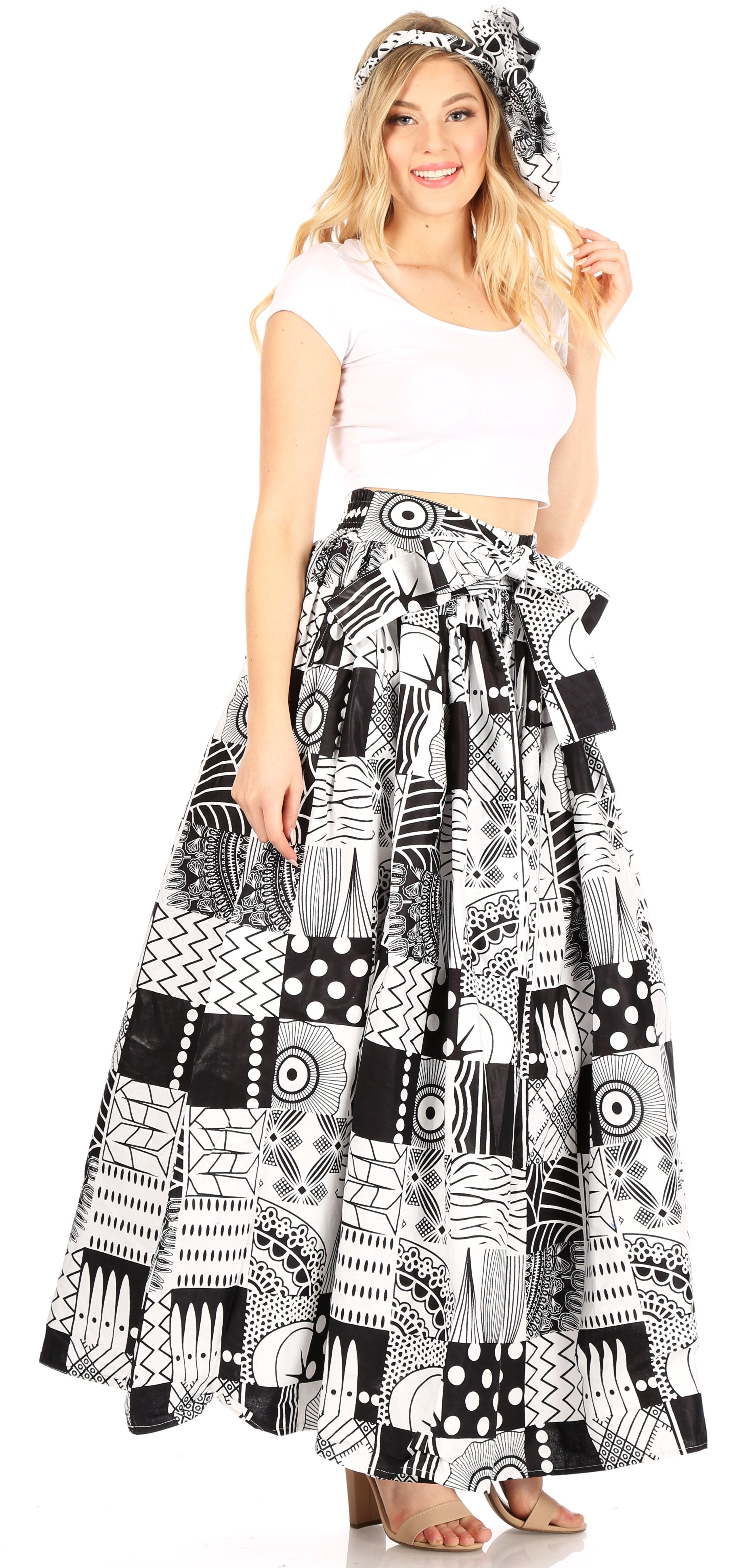 • This skirt features a long and wide flowing beautiful design. It is multi colored with a traditional wax print pattern. This skirt has pockets at the side for a total of two pockets. Pockets are deep and comfortable. A broad elastic waist band and adjustable wrap around strap allows skirt to easily convert into an elegant and carefree dress. This versatile item also features a beautiful head scarf in matching print.