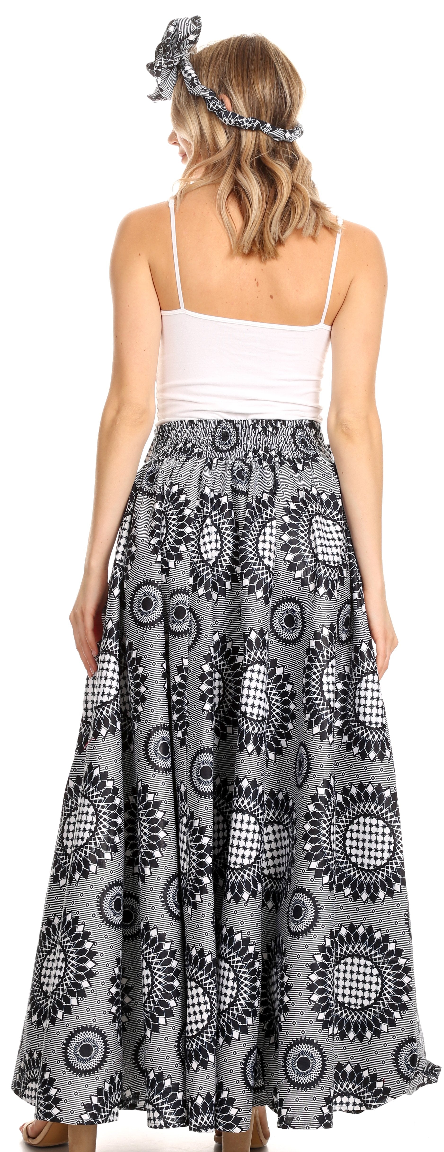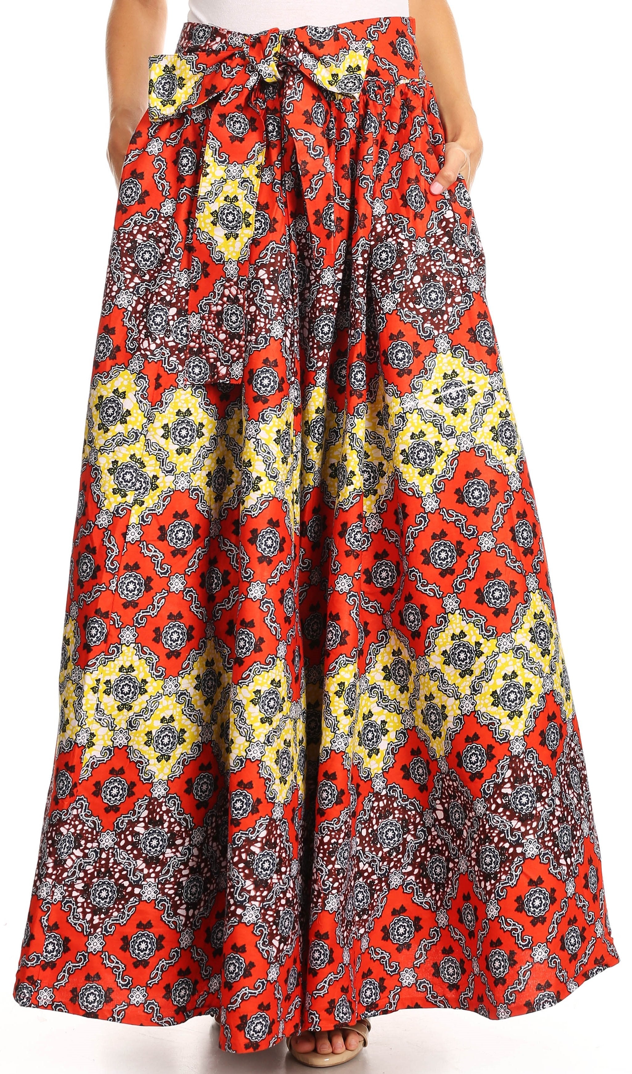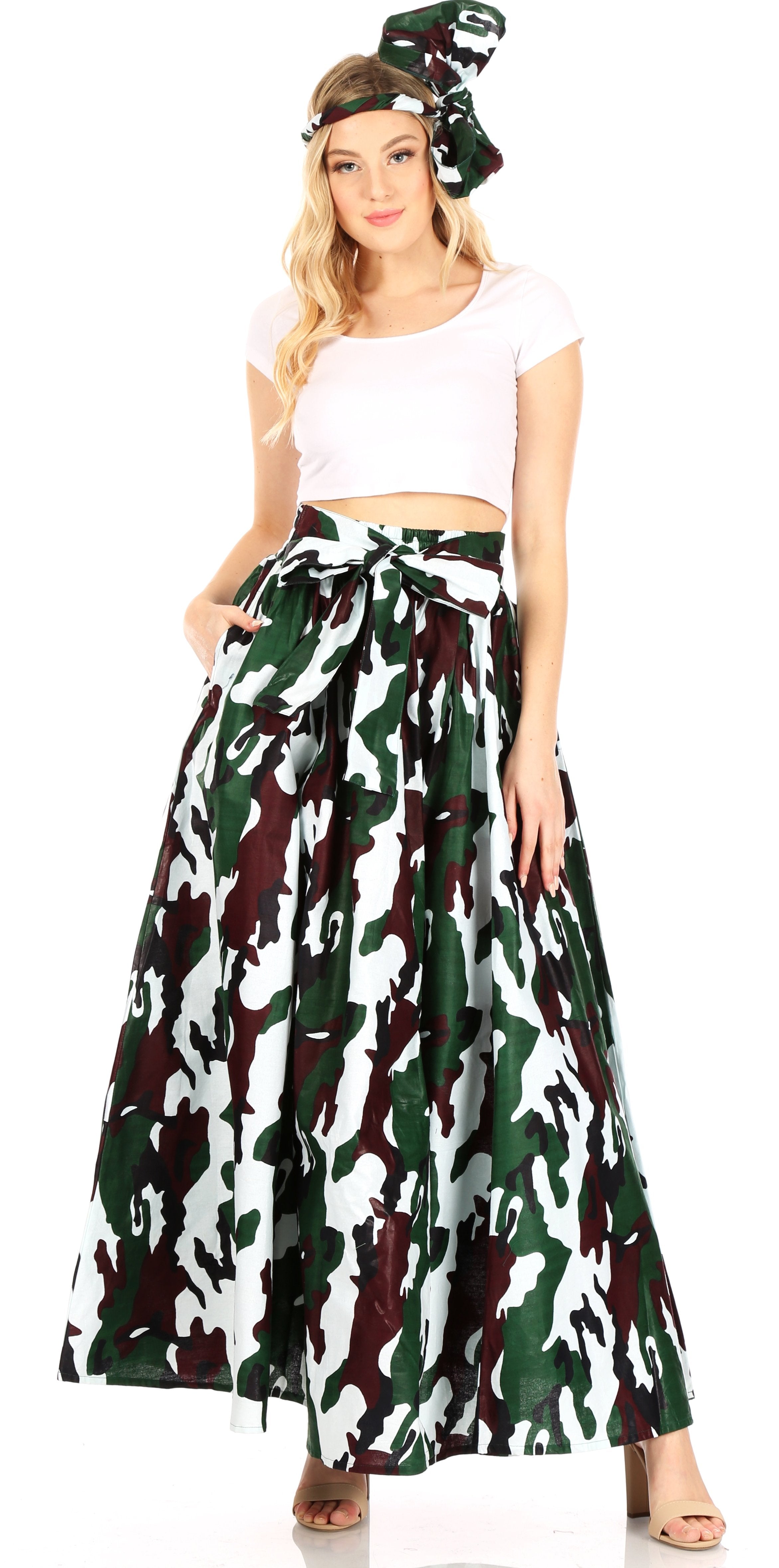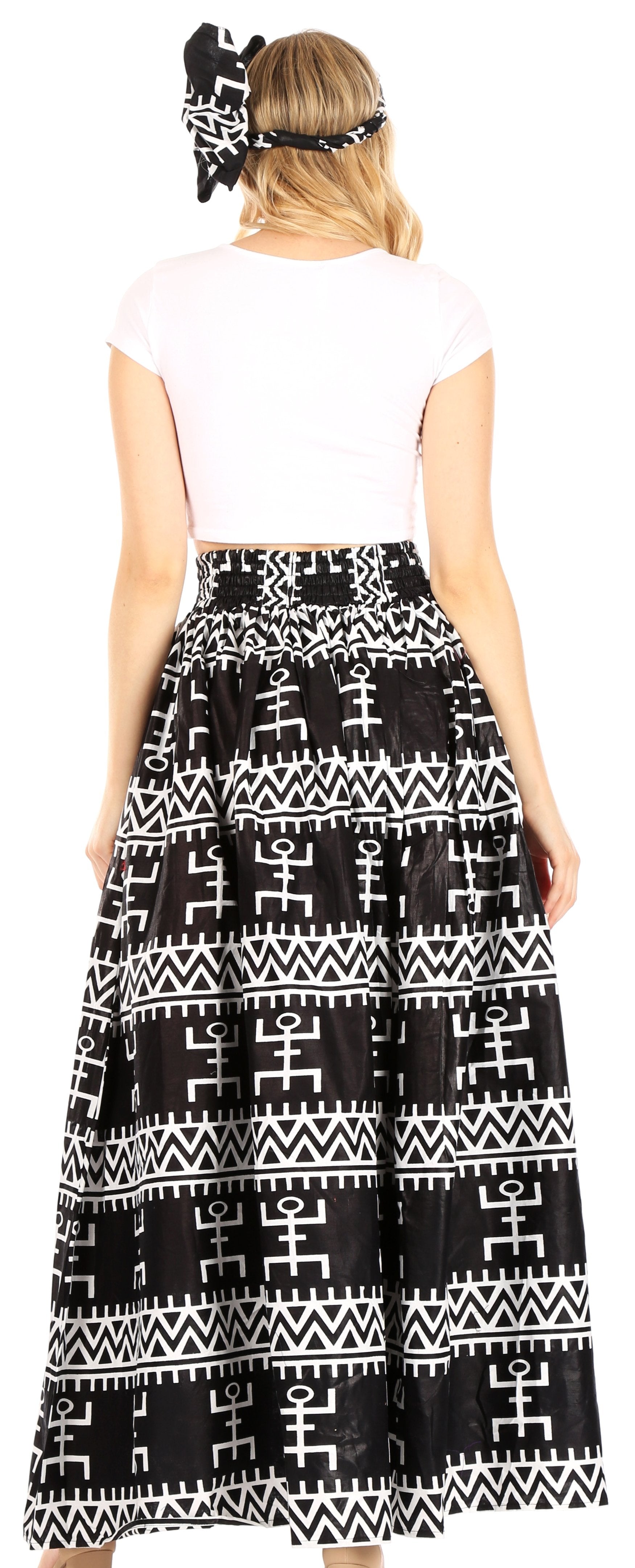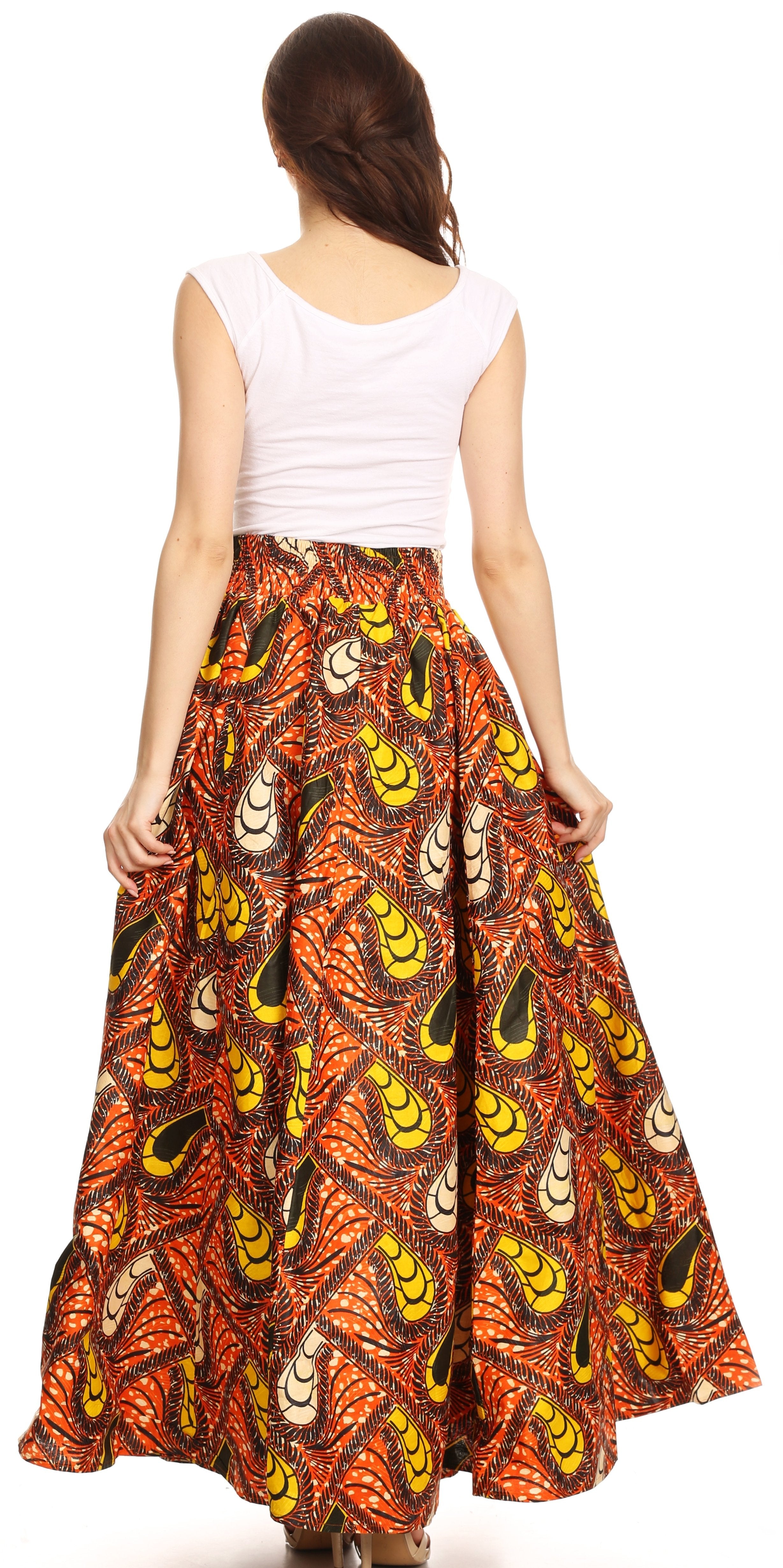 • This skirt features a long and wide flowing beautiful design. It is multi colored with a traditional wax print pattern. This skirt has pockets at the side for a total of two pockets. Pockets are deep and comfortable. A broad elastic waist band and adjustable wrap around strap allows skirt to easily convert into an elegant and carefree dress. This versatile item also features a beautiful head scarf in matching print.