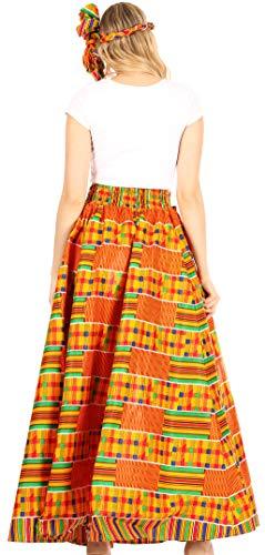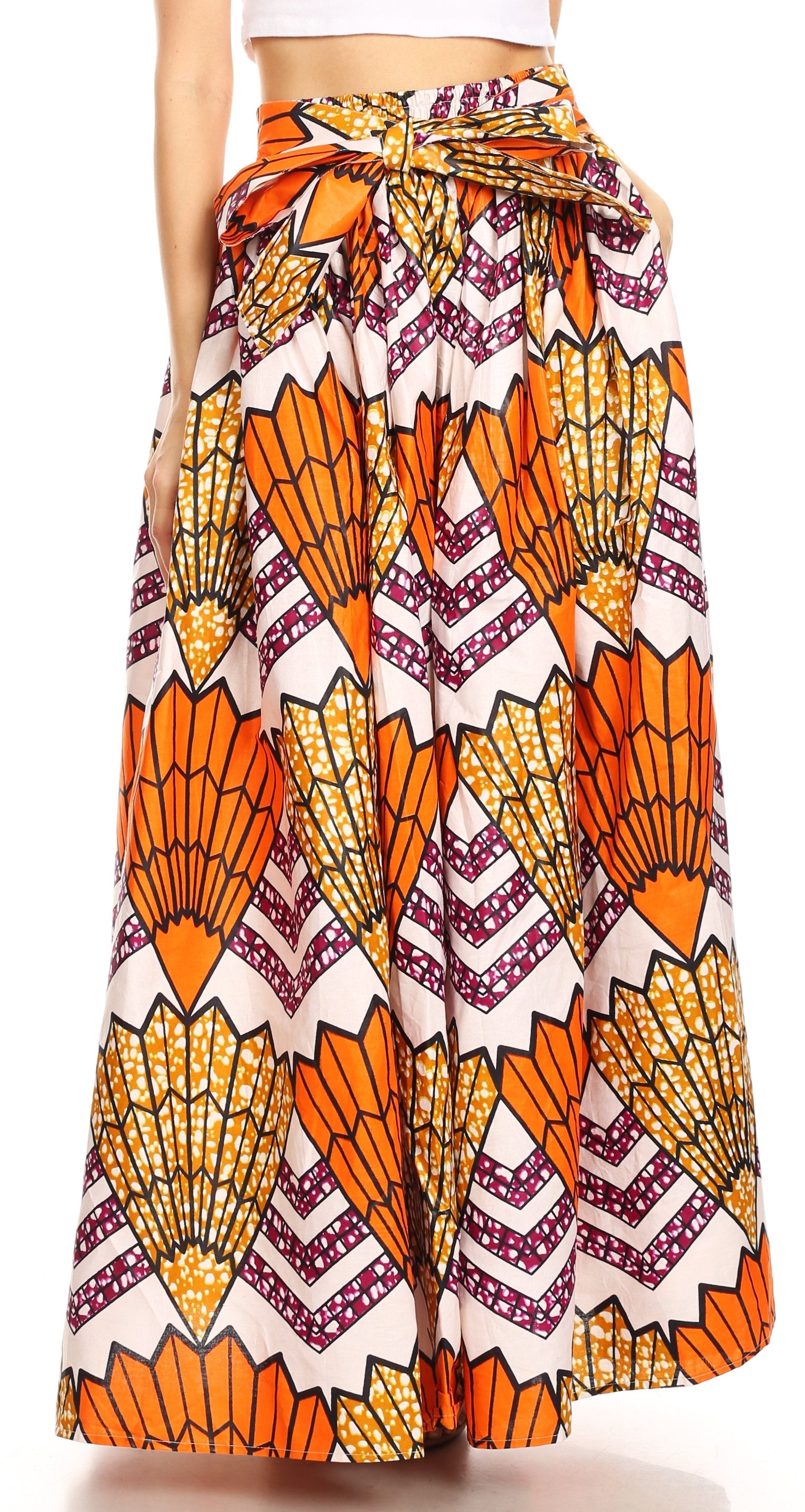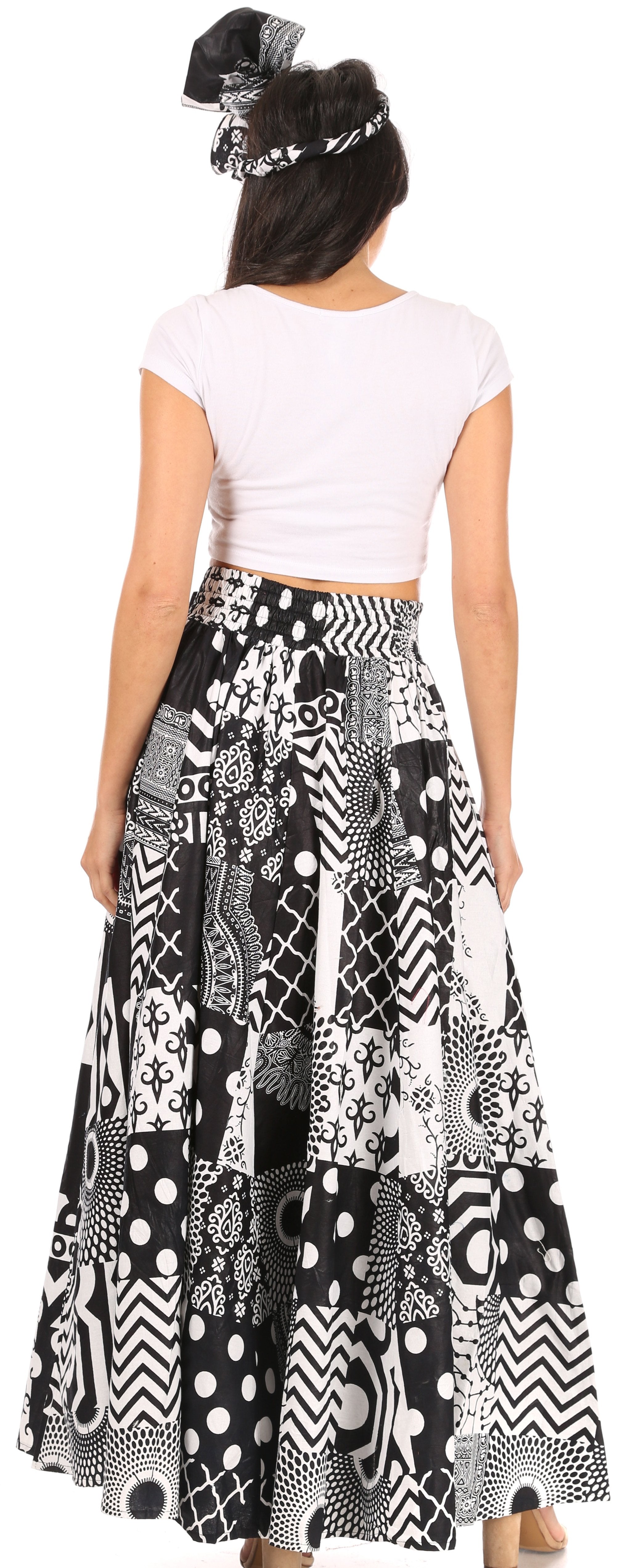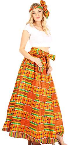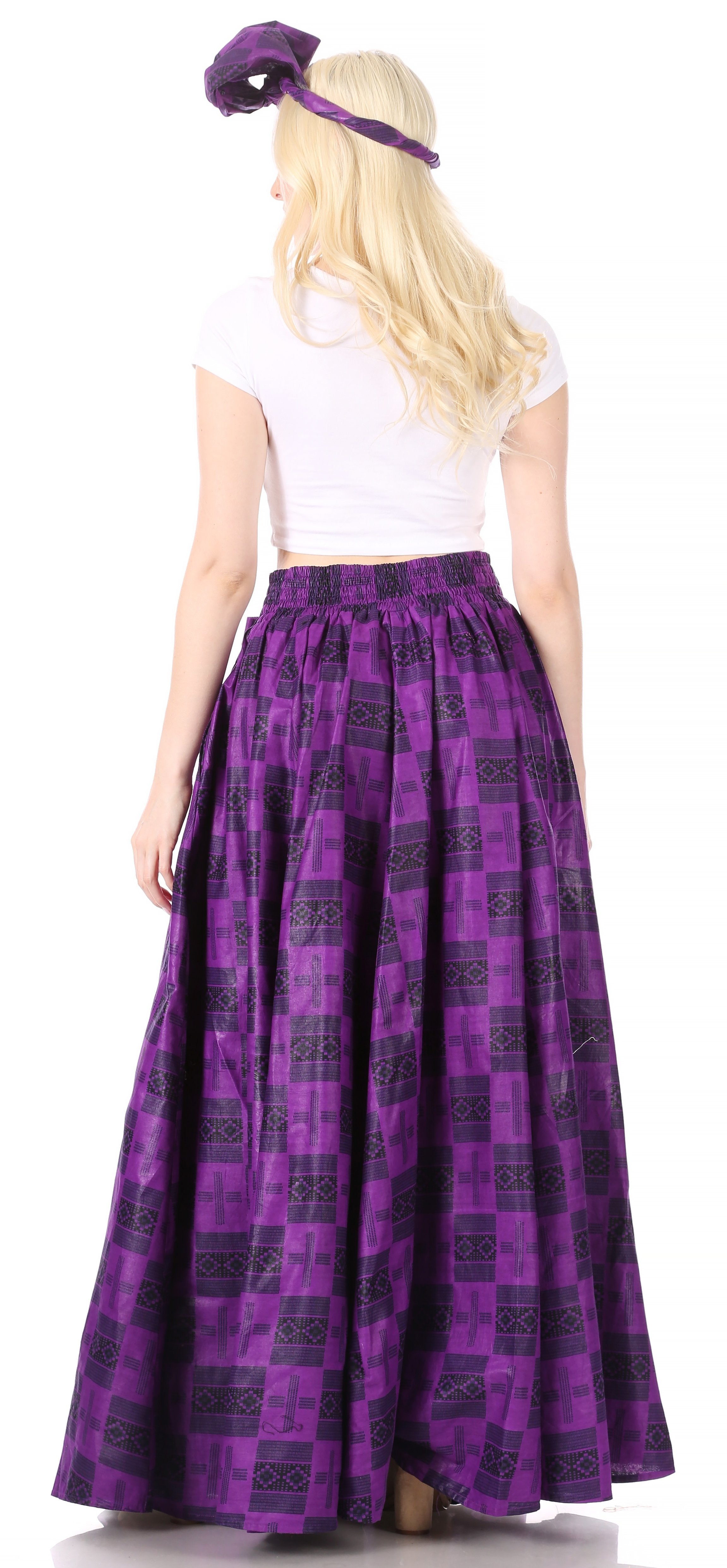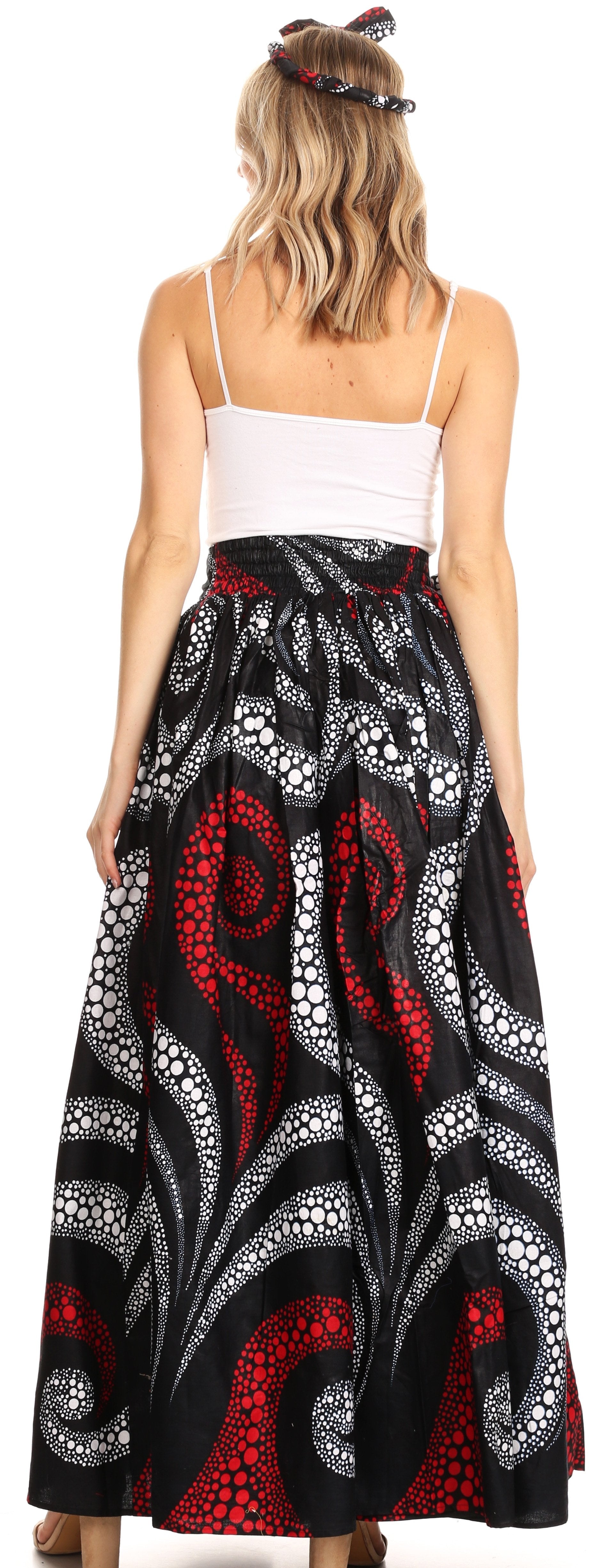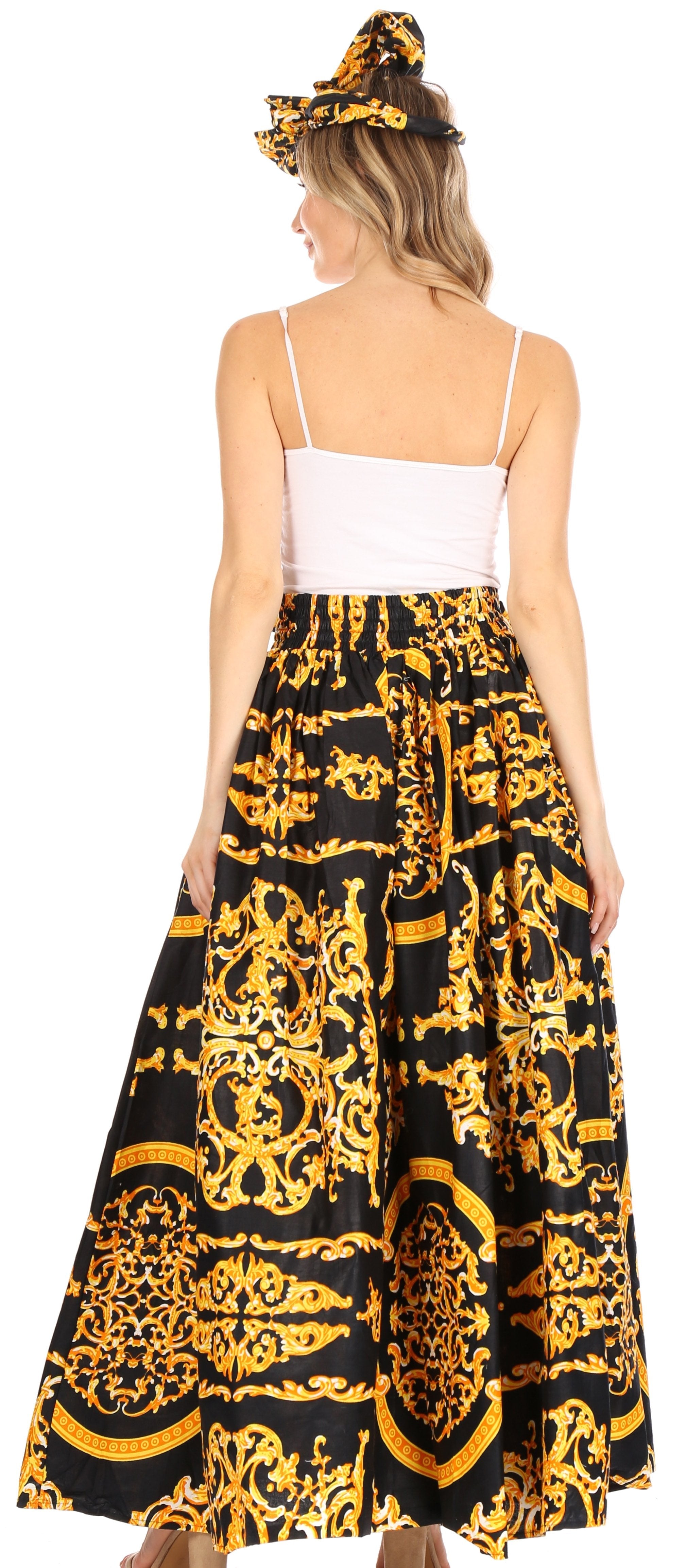 • This skirt features a long and wide flowing beautiful design. It is multi colored with a traditional wax print pattern. This skirt has pockets at the side for a total of two pockets. Pockets are deep and comfortable. A broad elastic waist band and adjustable wrap around strap allows skirt to easily convert into an elegant and carefree dress. This versatile item also features a beautiful head scarf in matching print.