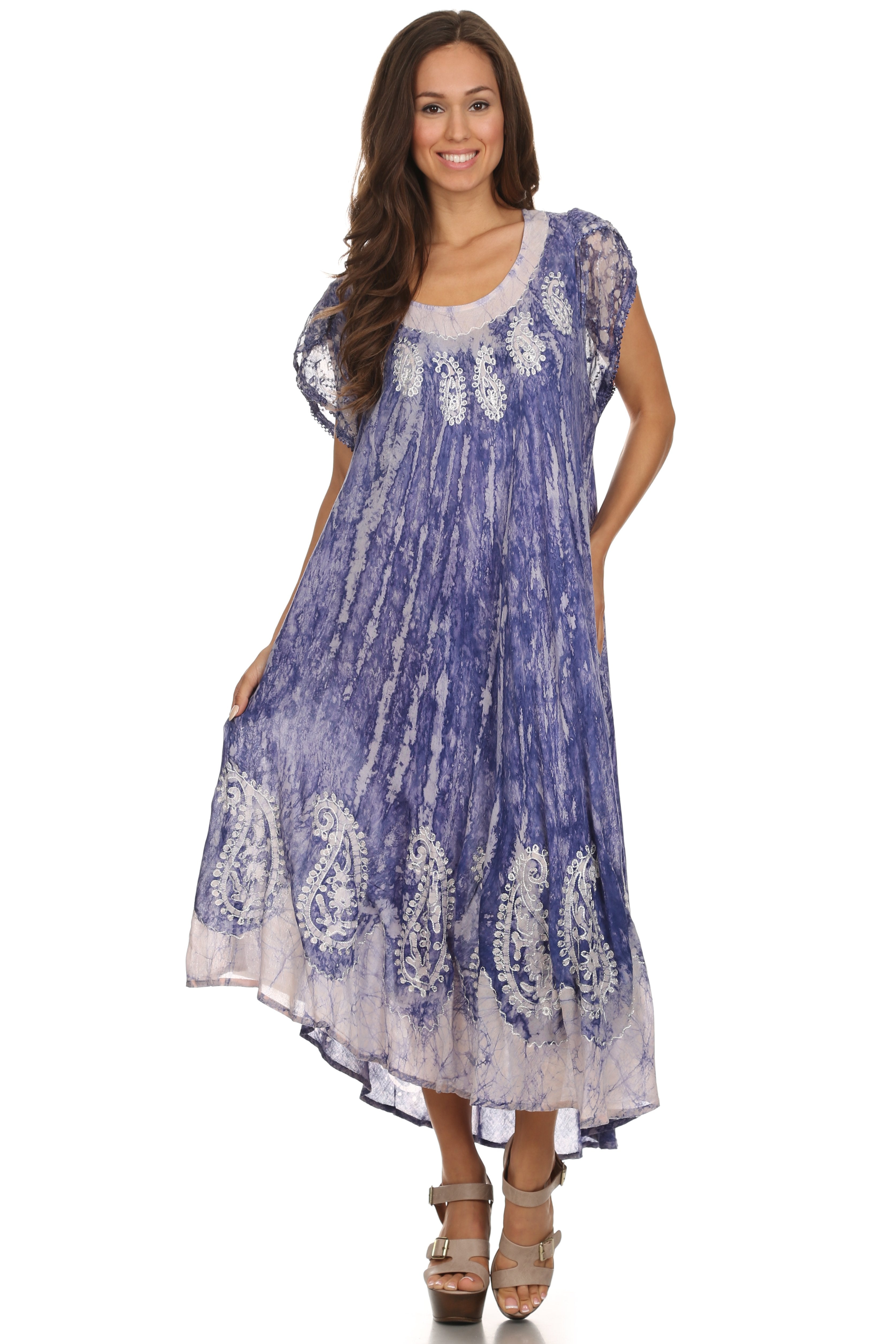 • Features beautiful embroidered pattern with marbled wash and comfortable cap sleeves and draped fit.