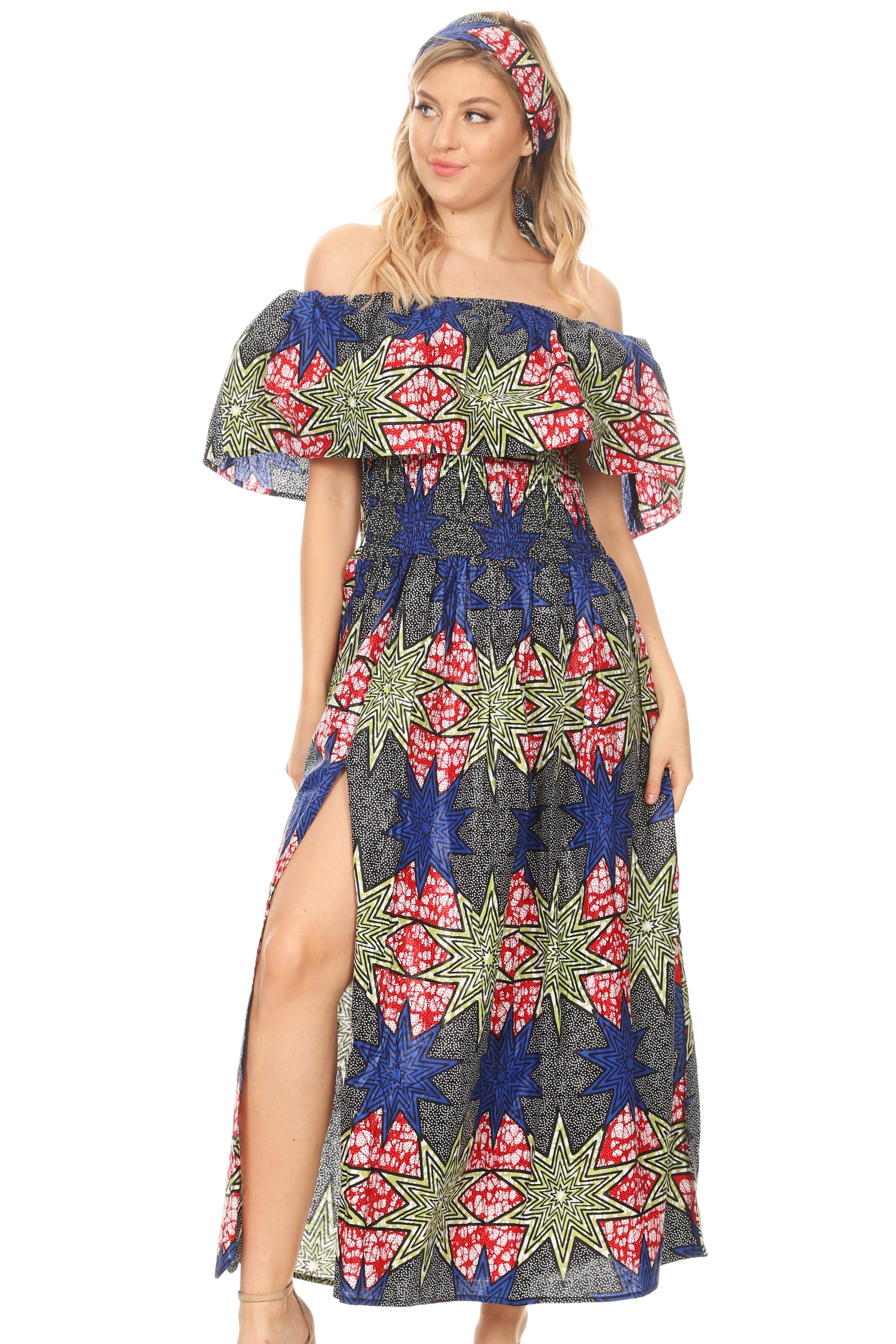 Sakkas Buhle Ruffle Off-shoulder Long Dress Wax African Ankara Dutch Print