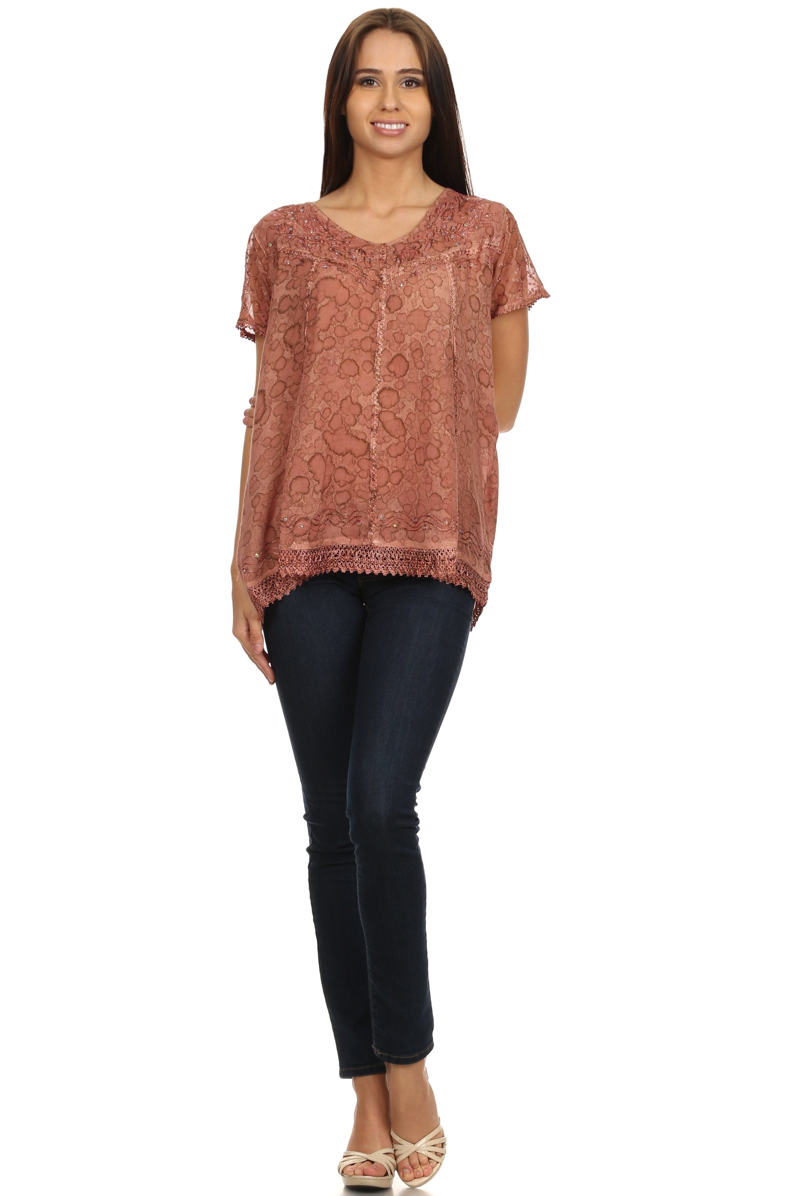 • Gauzy Rayon blouse features neckline and hem embroidery, sequin accents, sheer crepe cap sleeves, relaxed fit and beautiful two-tone colors