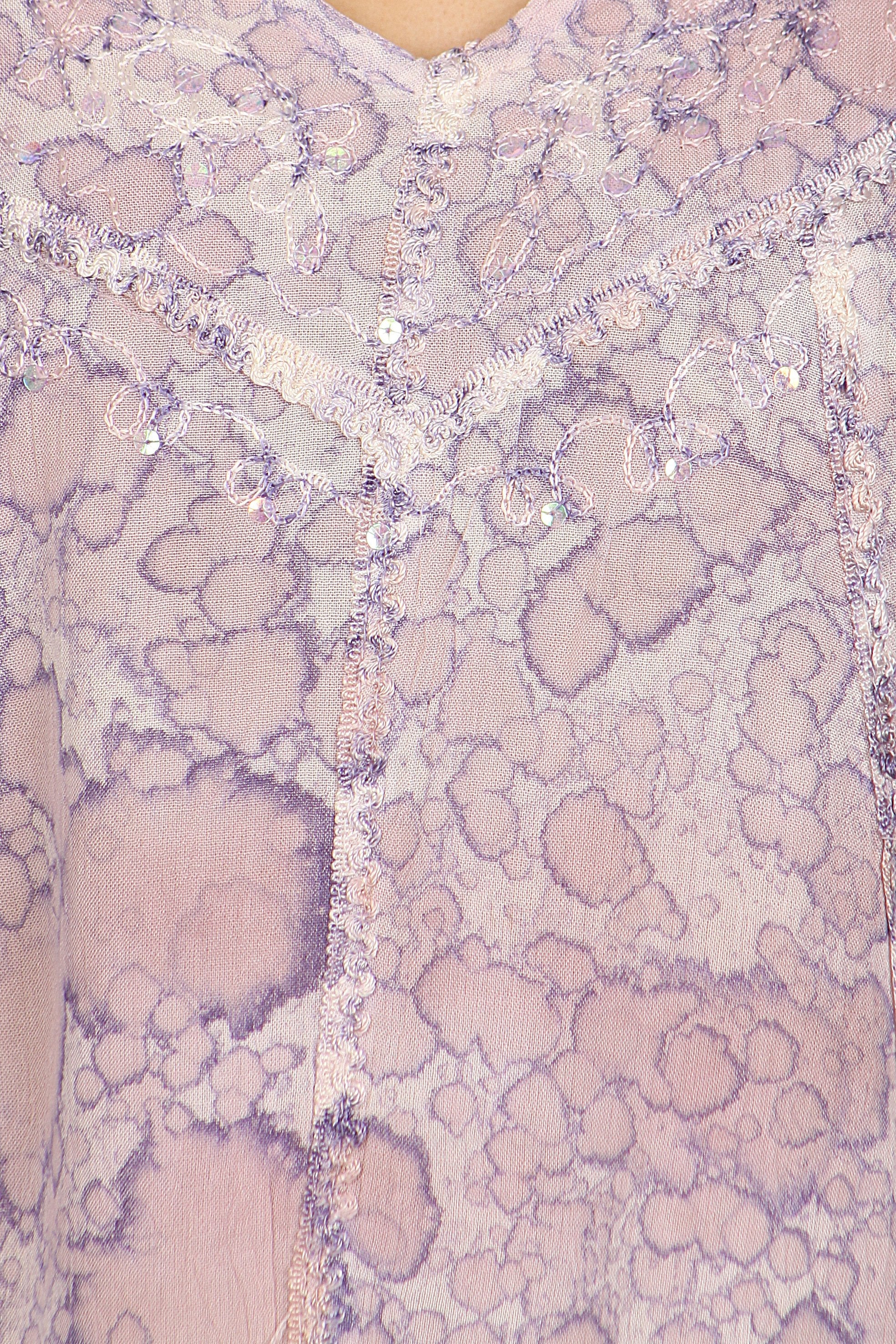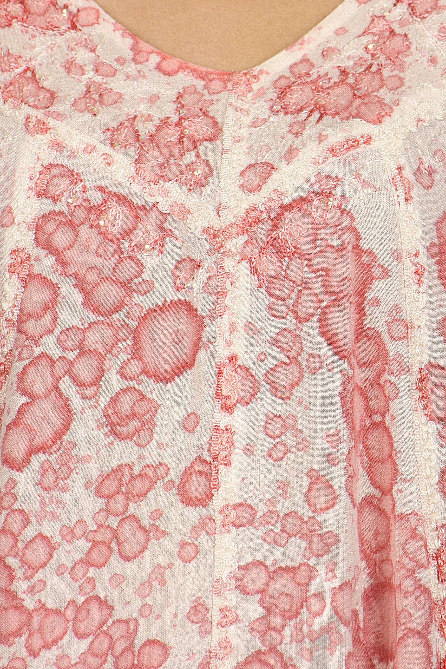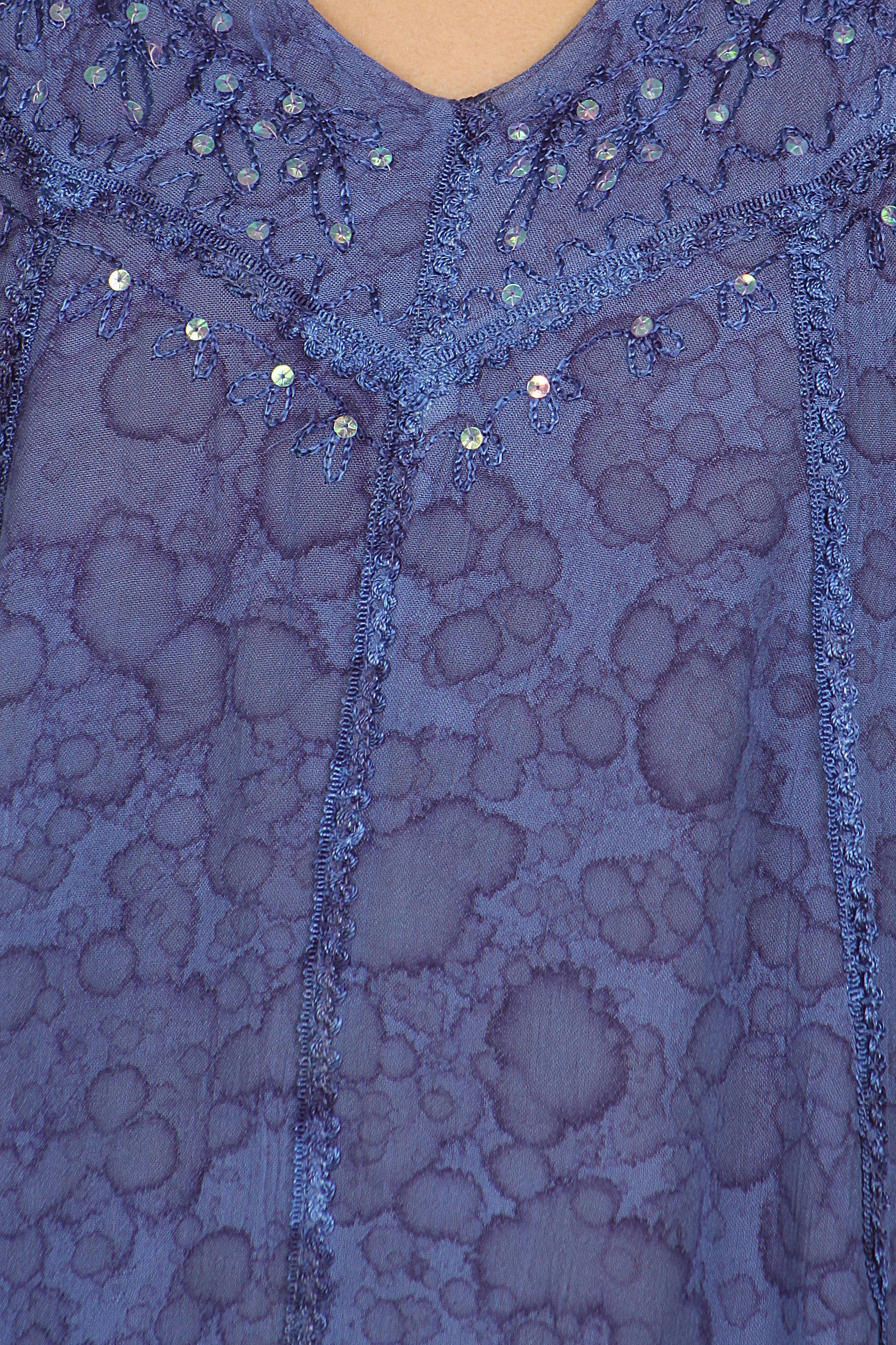 Gauzy Rayon blouse features neckline and hem with delicate embroidery, sequin accents, sheer crepe cap sleeves, relaxed fit and beautiful two-tone colors