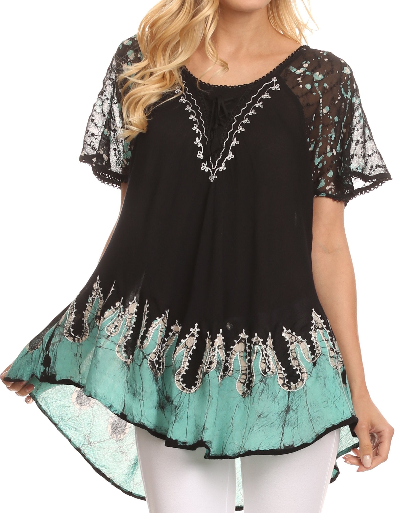 • Blouse features delicate embroidery, lace up tie, sheer cap sleeves, unique batik design and relaxed fit
