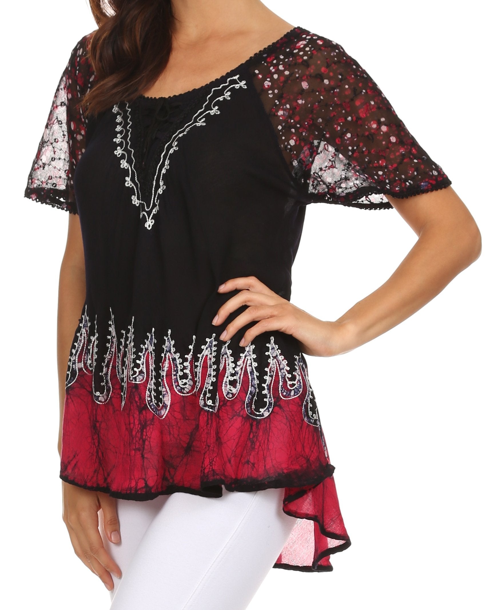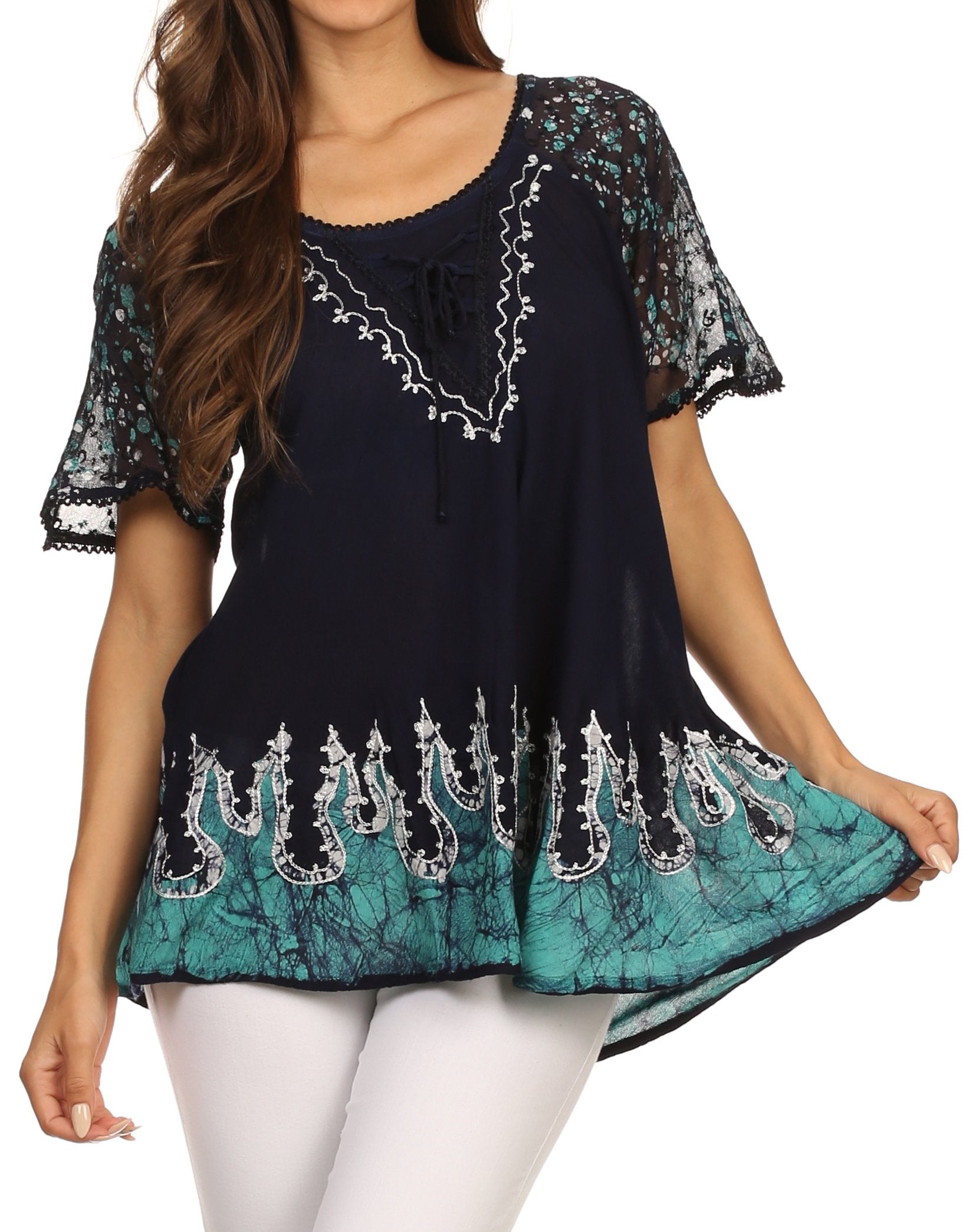Sakkas Cora Relaxed Fit Batik Design Embroidery Cap Sleeves Blouse / Top