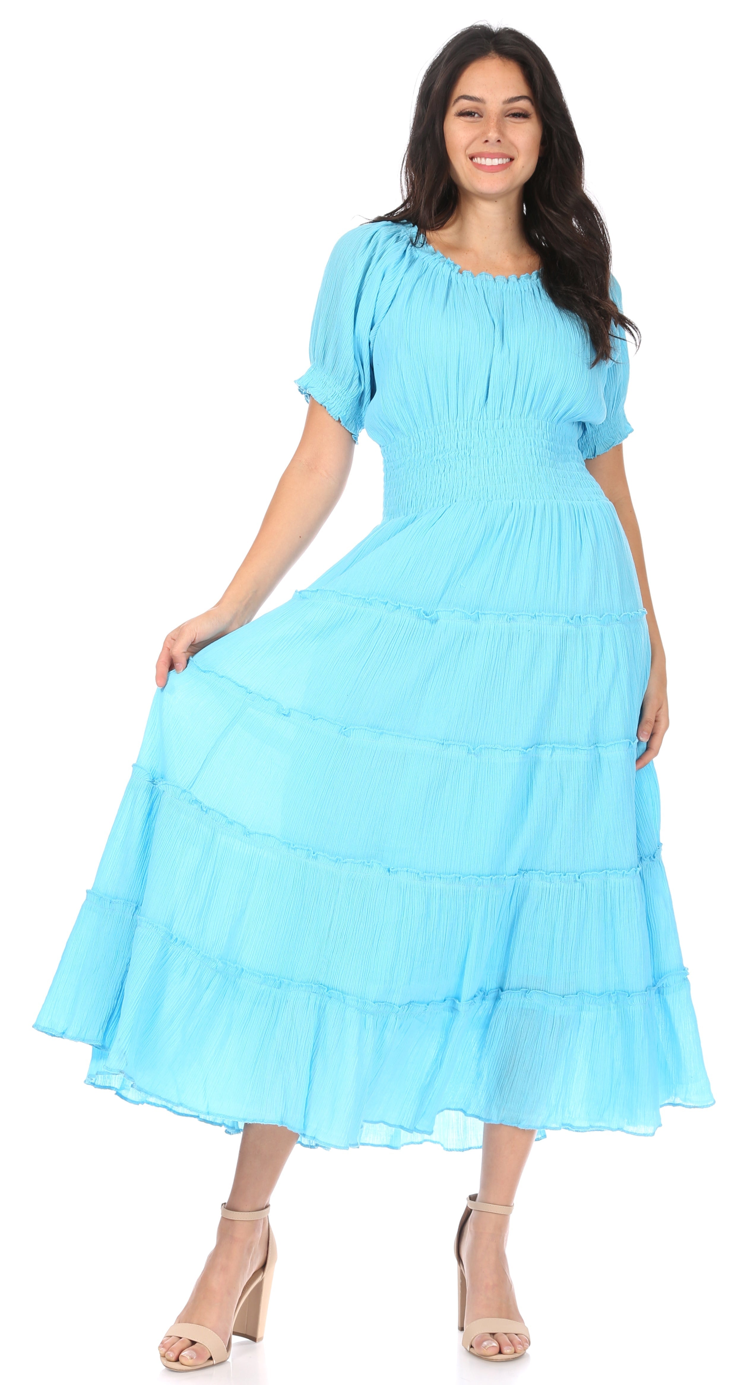 • Features full tiered skirt, beautiful solid colors, lightweight gauzy lining, smocked elastic waist and neckline.