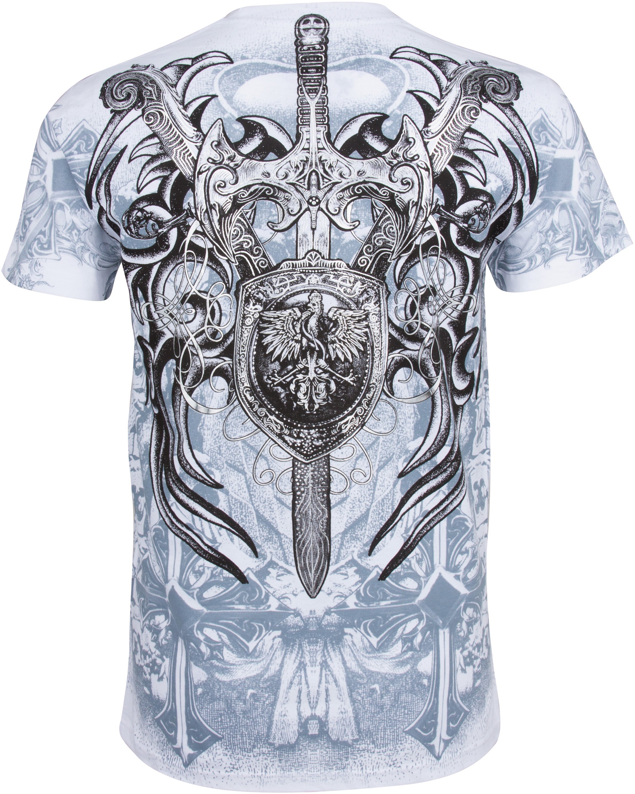 Sakkas Cross, Sword and Shield Metallic Silver Embossed Cotton Mens T-Shirt