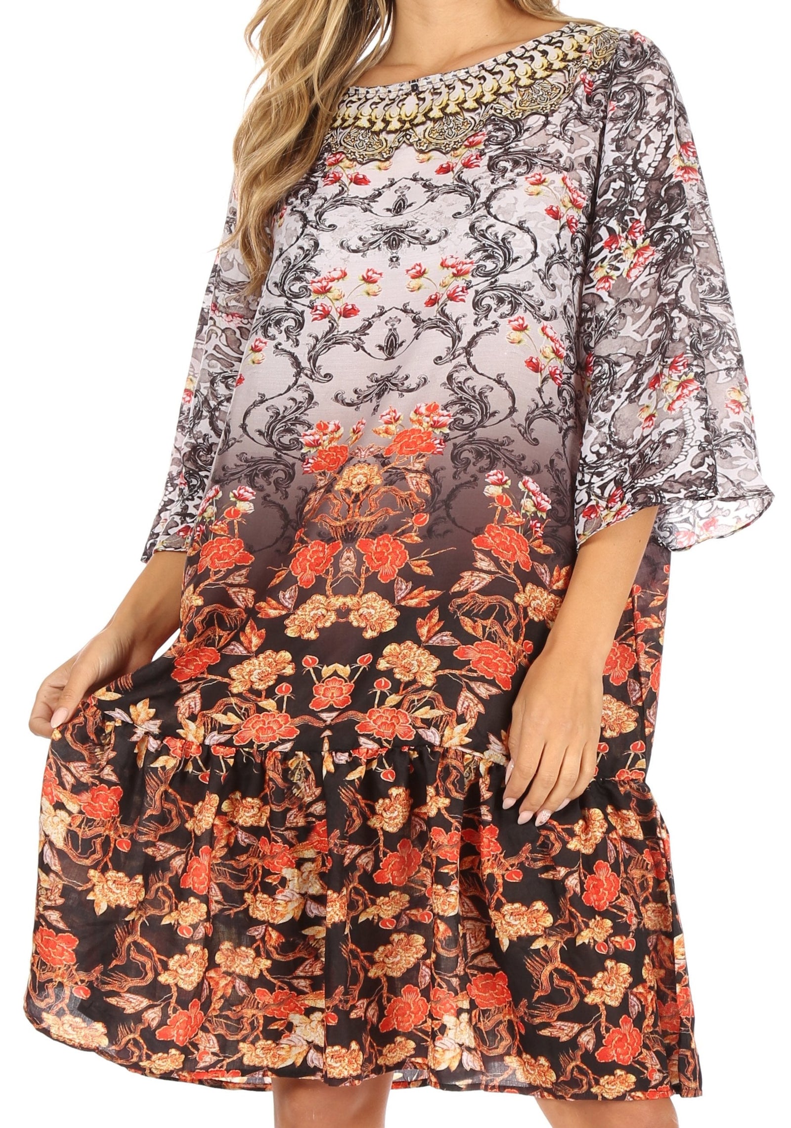 • ROUND NECK/FLORAL/SUMMER/CASUAL/SWING DRESS/COVER UP: Dona, the ideal loose dress for everyday wear. This lovely garment features a round neck, ruffle hem, loose bodice, generous 3/4 sleeves, cocktail length, made with super light tropical printed material. Ideal for summer wear, bohemian casual style. Look and feel like a goddess in any setting while wearing this lovely flattering dress!