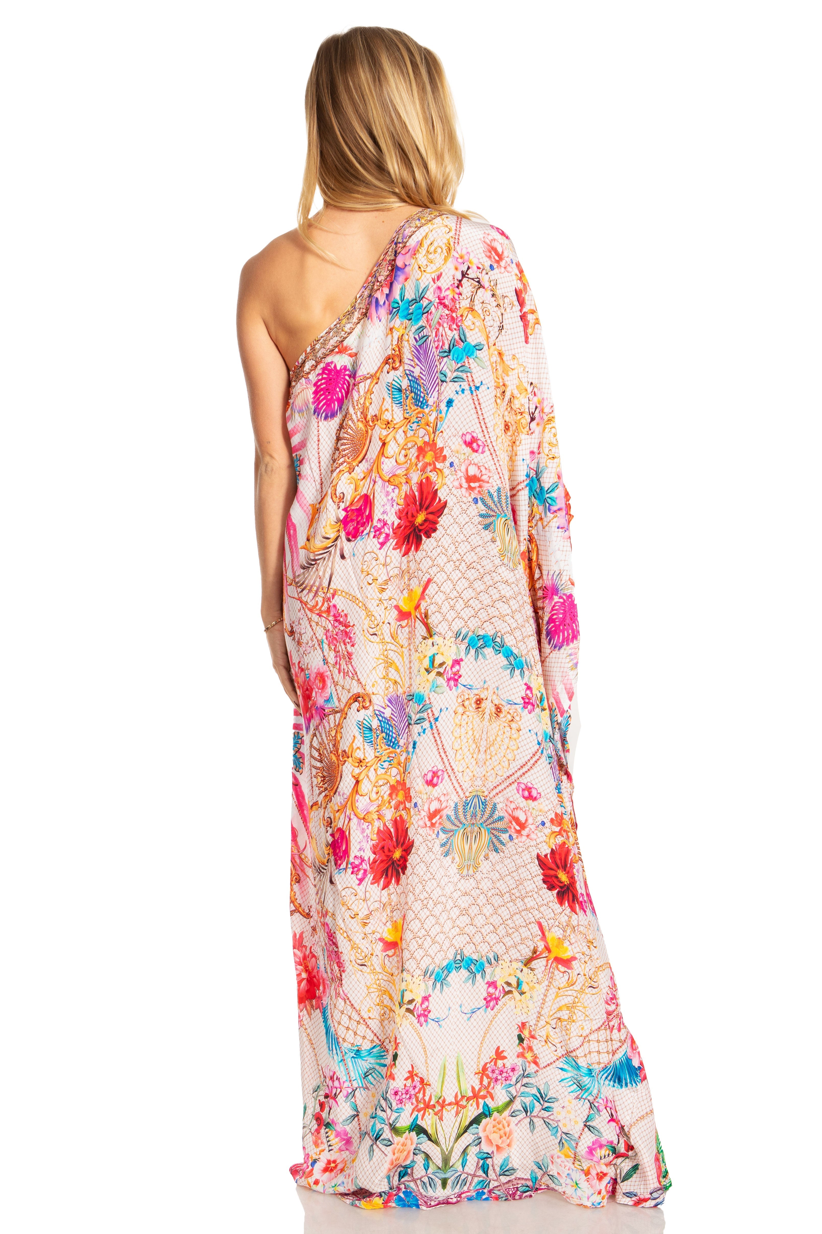 • MAXI/COVER-UP/SUNDRESS/CAFTAN DRESS: Dora, the perfect lightweight casual everyday dress. This lovely garment features a one shoulder short sleeve upper, wide neck opening, colorful print, embellishment at front, A-line shape. Ideal for everyday wear, easily transitions from casual to formal, can also be worn as swimwear cover up! Look and feel like a goddess in any setting while wearing this gorgeous dress!