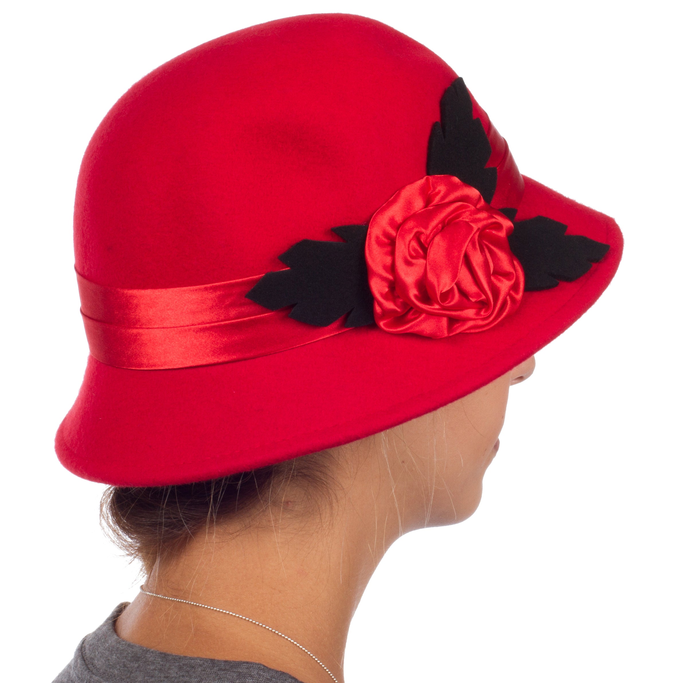 Modern classic vintage style cloche hat features soft wool construction, satin rosette, felt leaves accent and adjustable inner elastic satin crown.