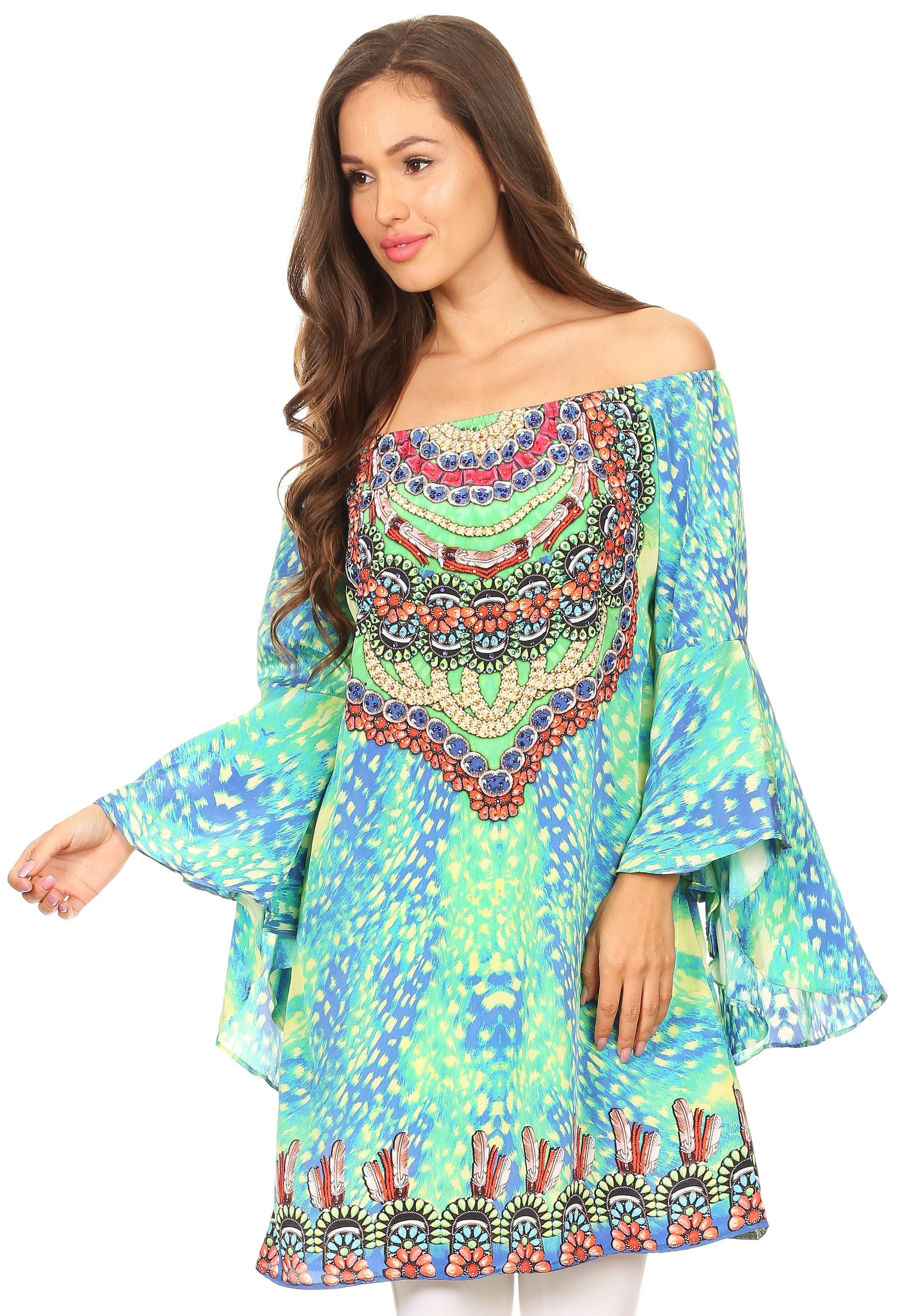 Sakkas Inna Colorful Shift Dress Tunic with Bell Ruffled Sleeves & Rhinestones