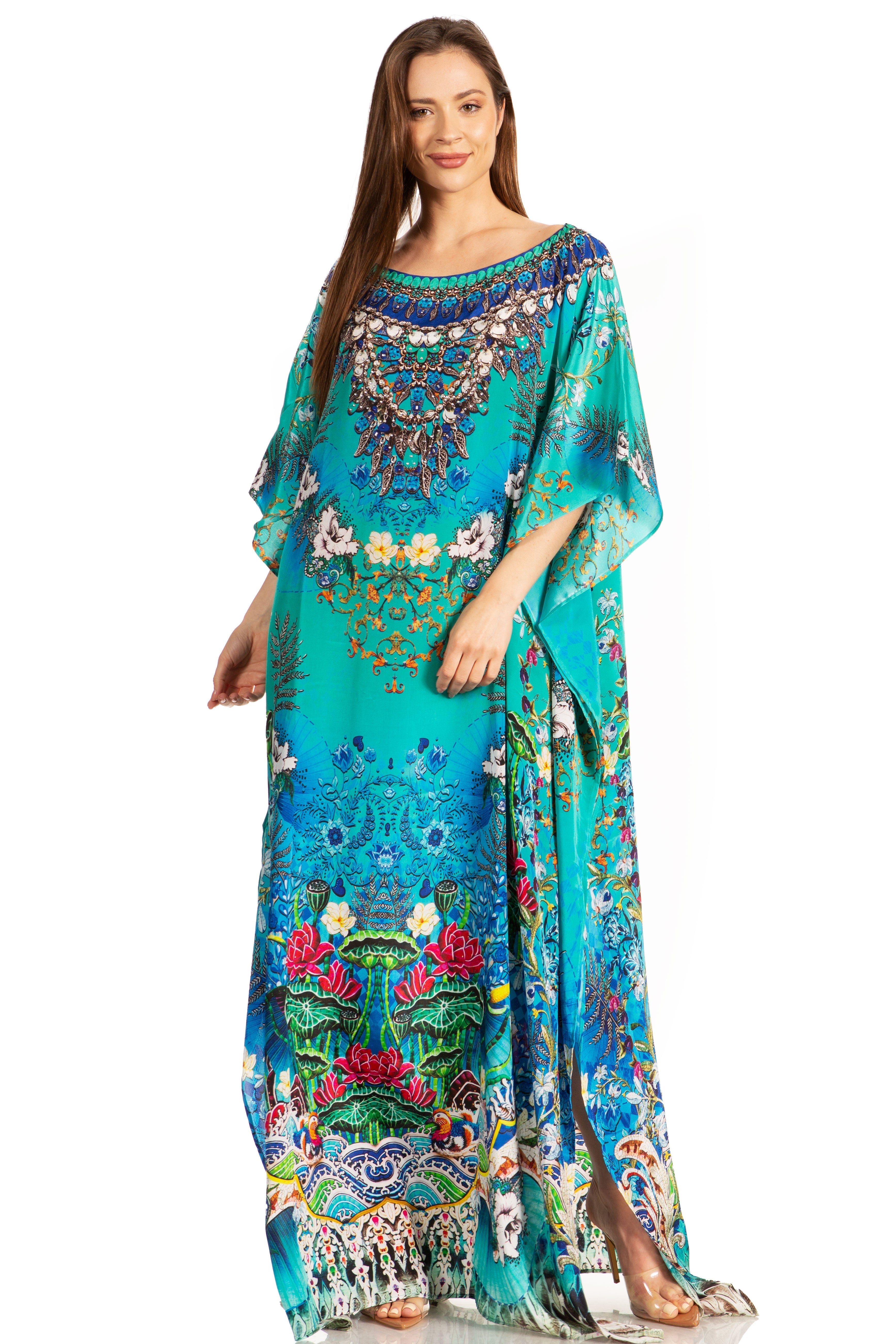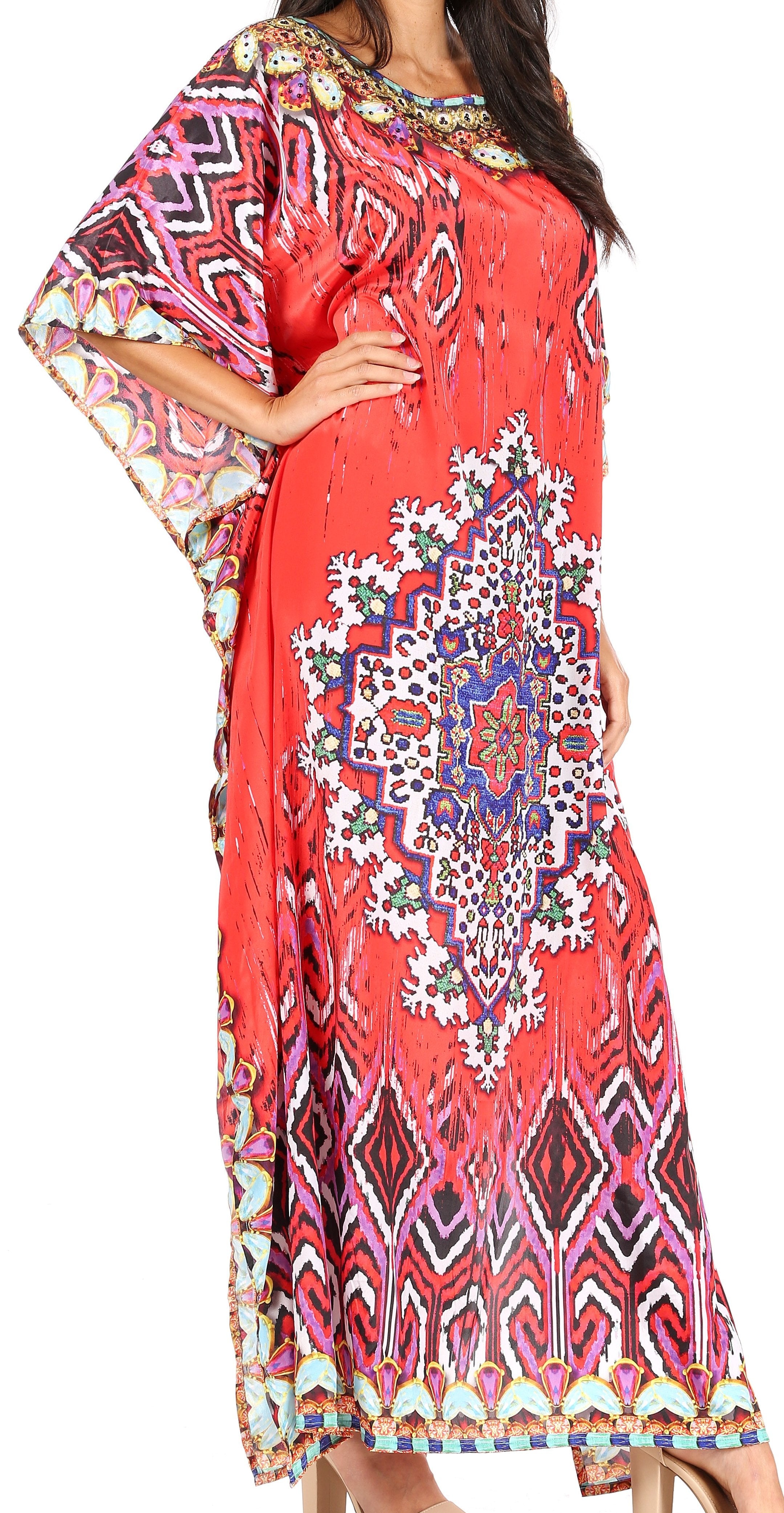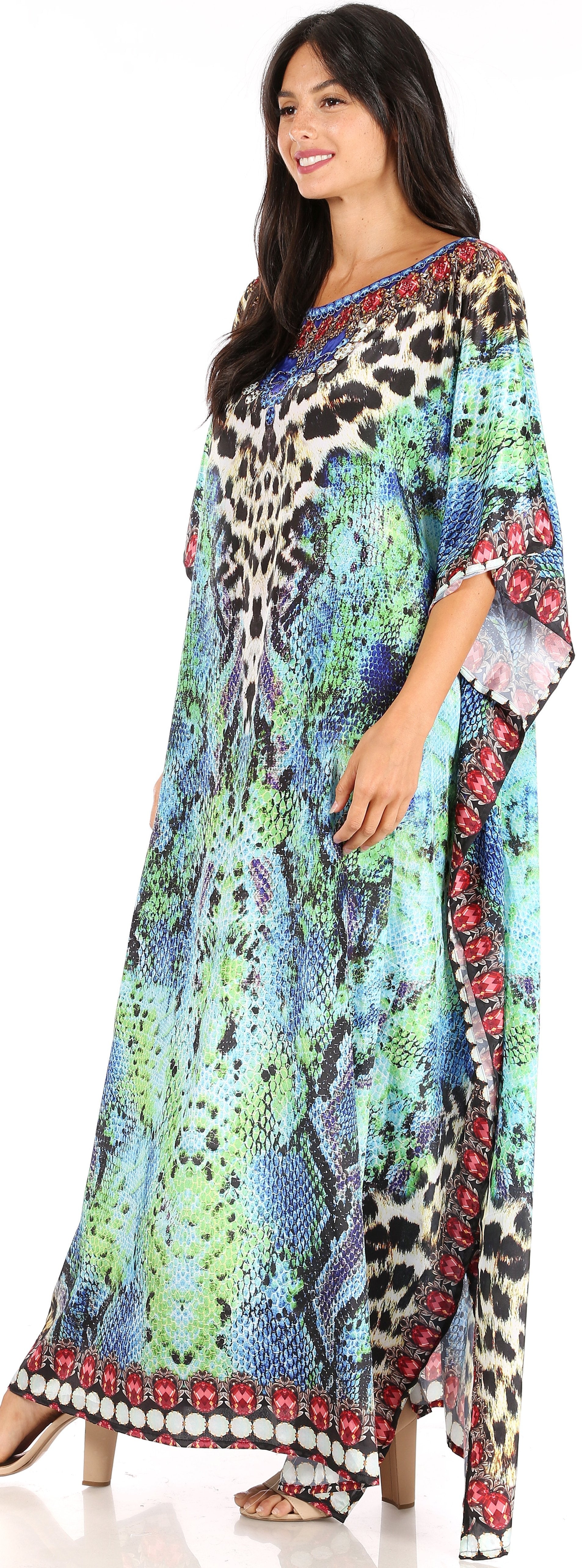 • This lovely kaftan dress features a boat-neck and generous sleeve openings. Also, nicely placed rhinestones around the neckline. This garment is perfect for all body shapes, made with lightweight soft opaque crepe fabric and colorful print.