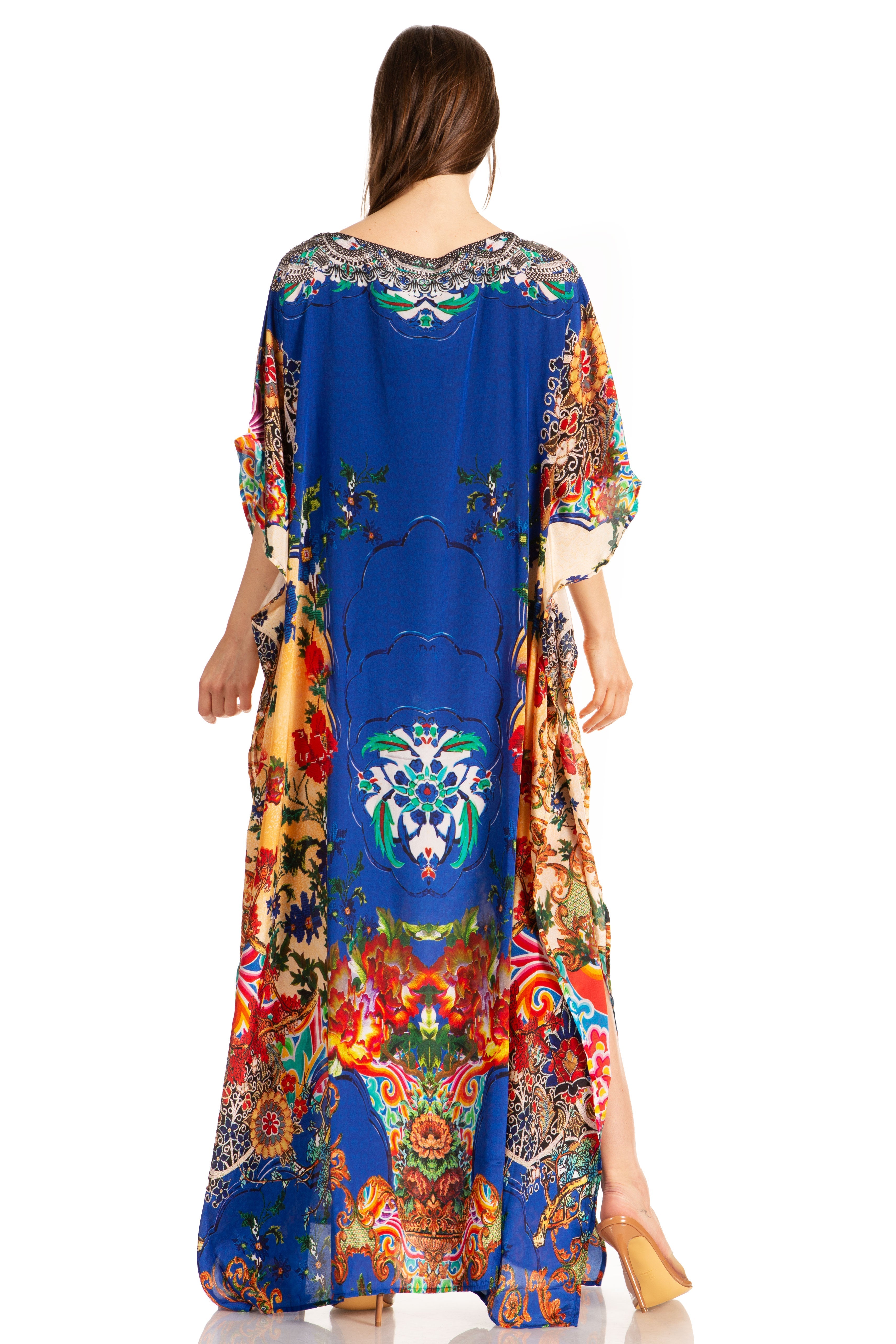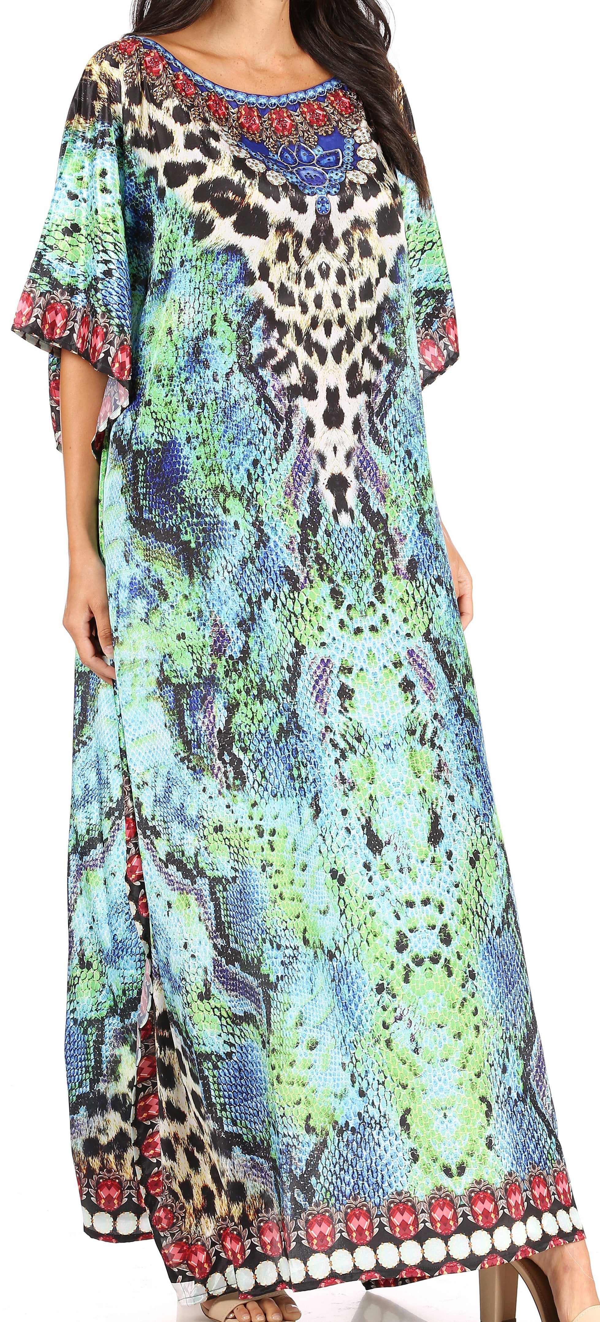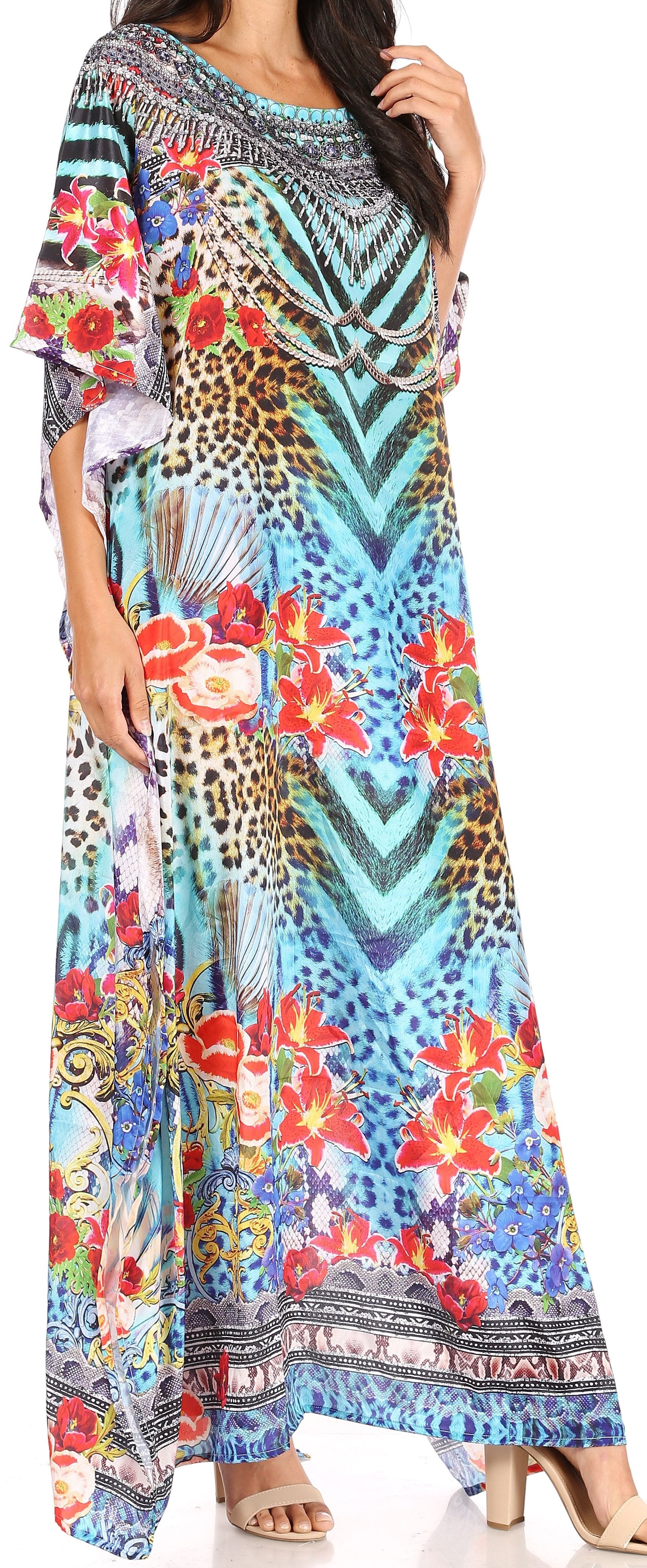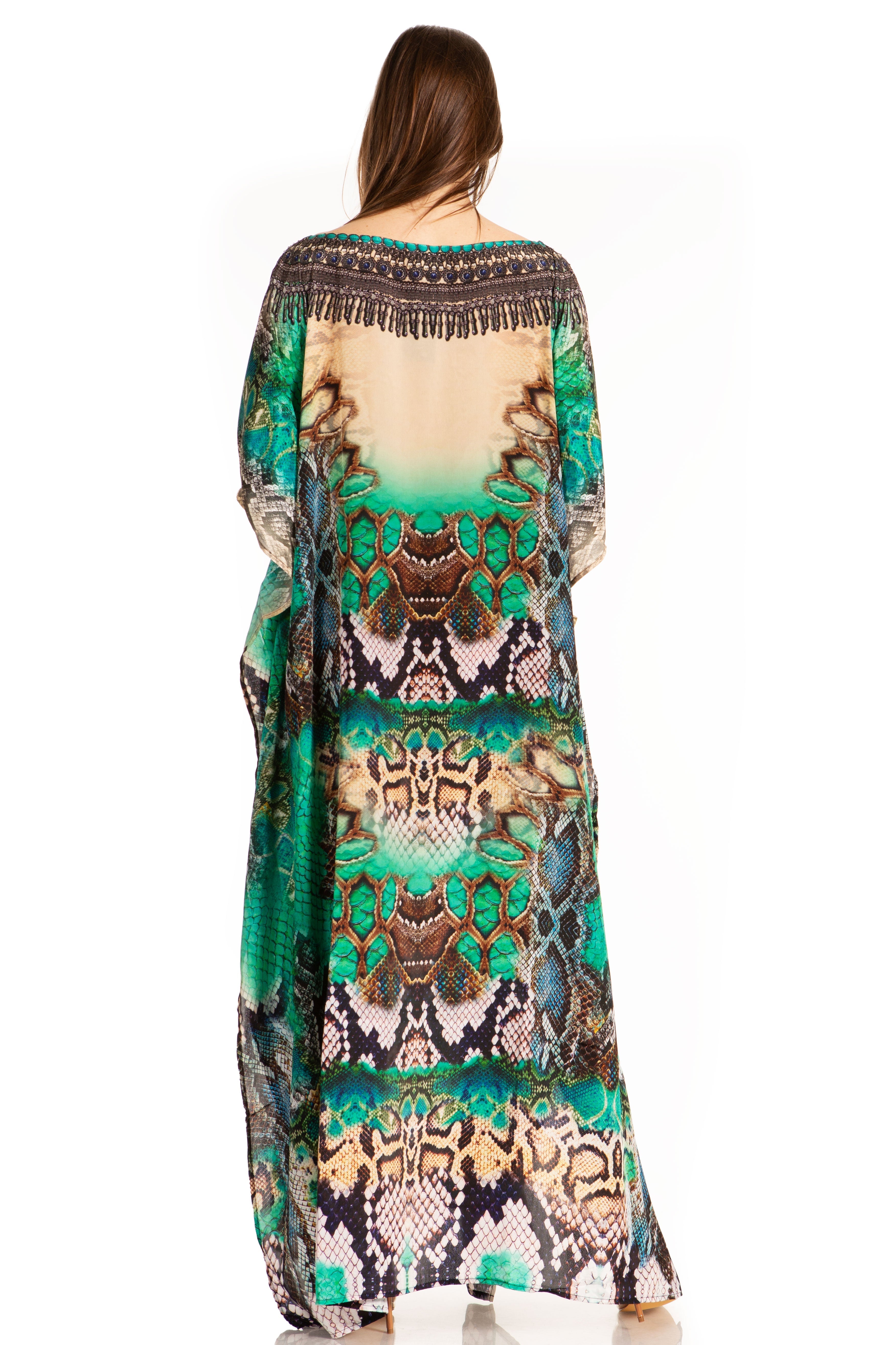 • This lovely kaftan dress features a boat-neck and generous sleeve openings. Also, nicely placed rhinestones around the neckline. This garment is perfect for all body shapes, made with lightweight soft opaque crepe fabric and colorful print.