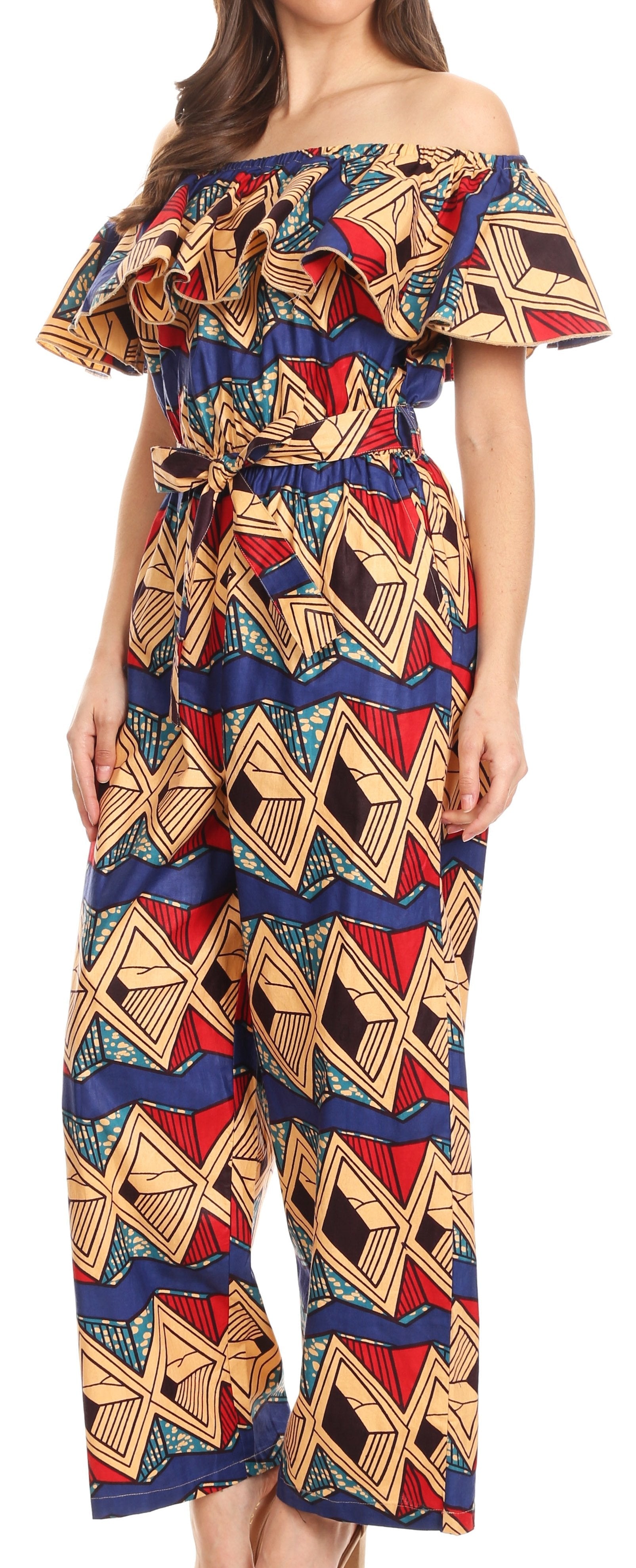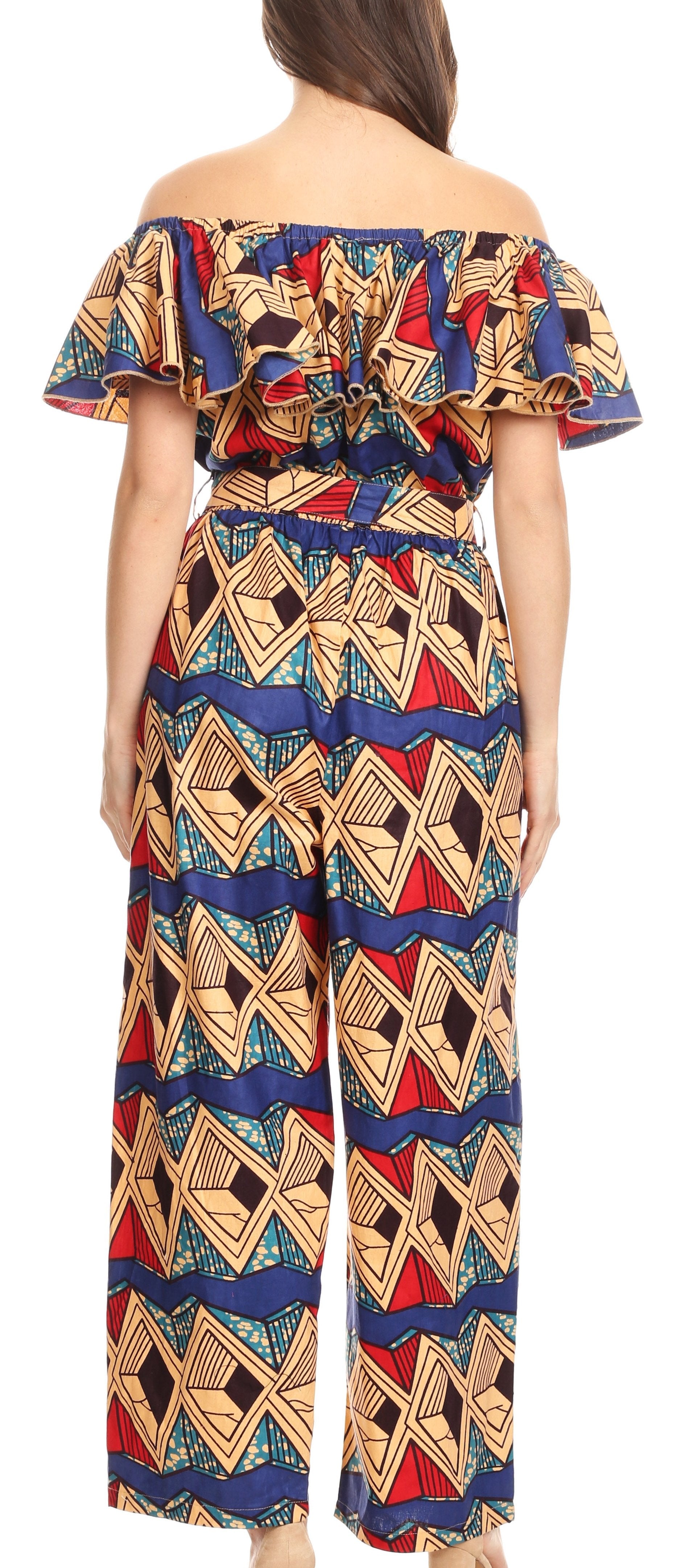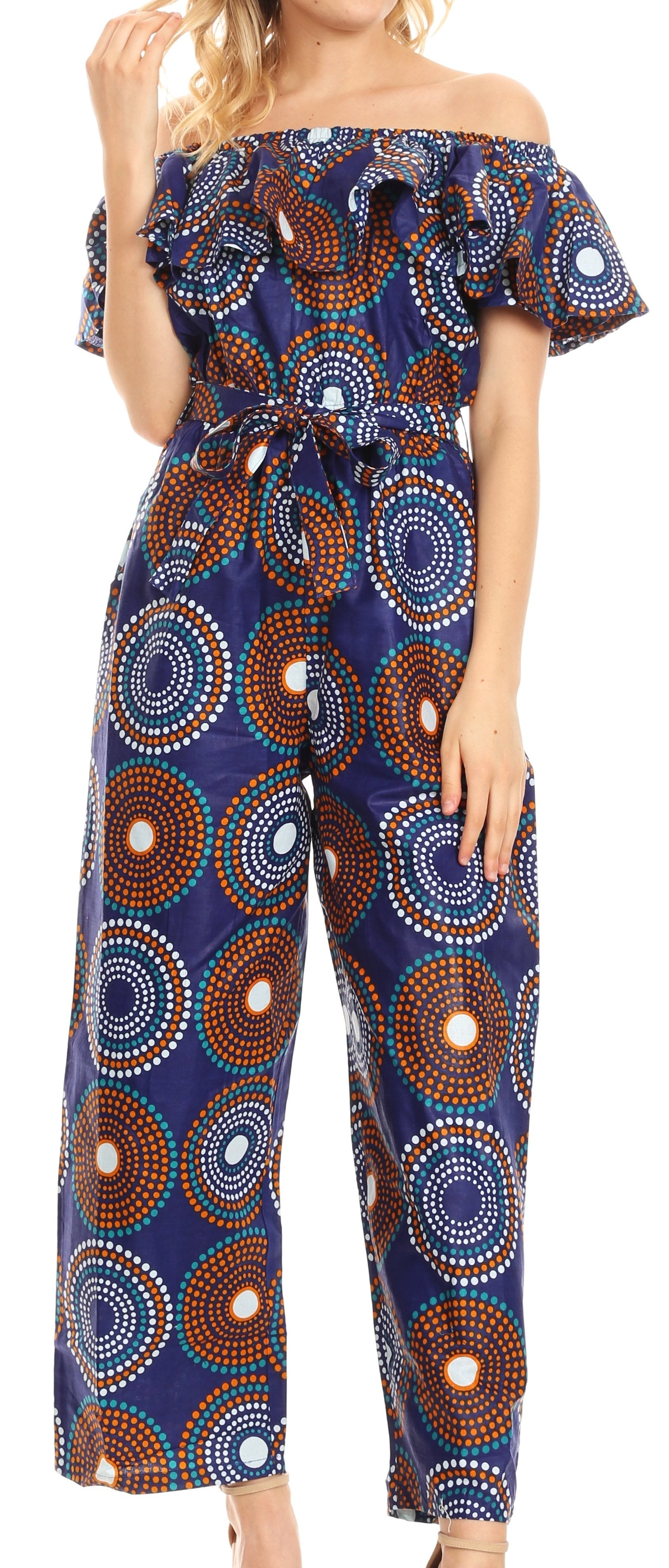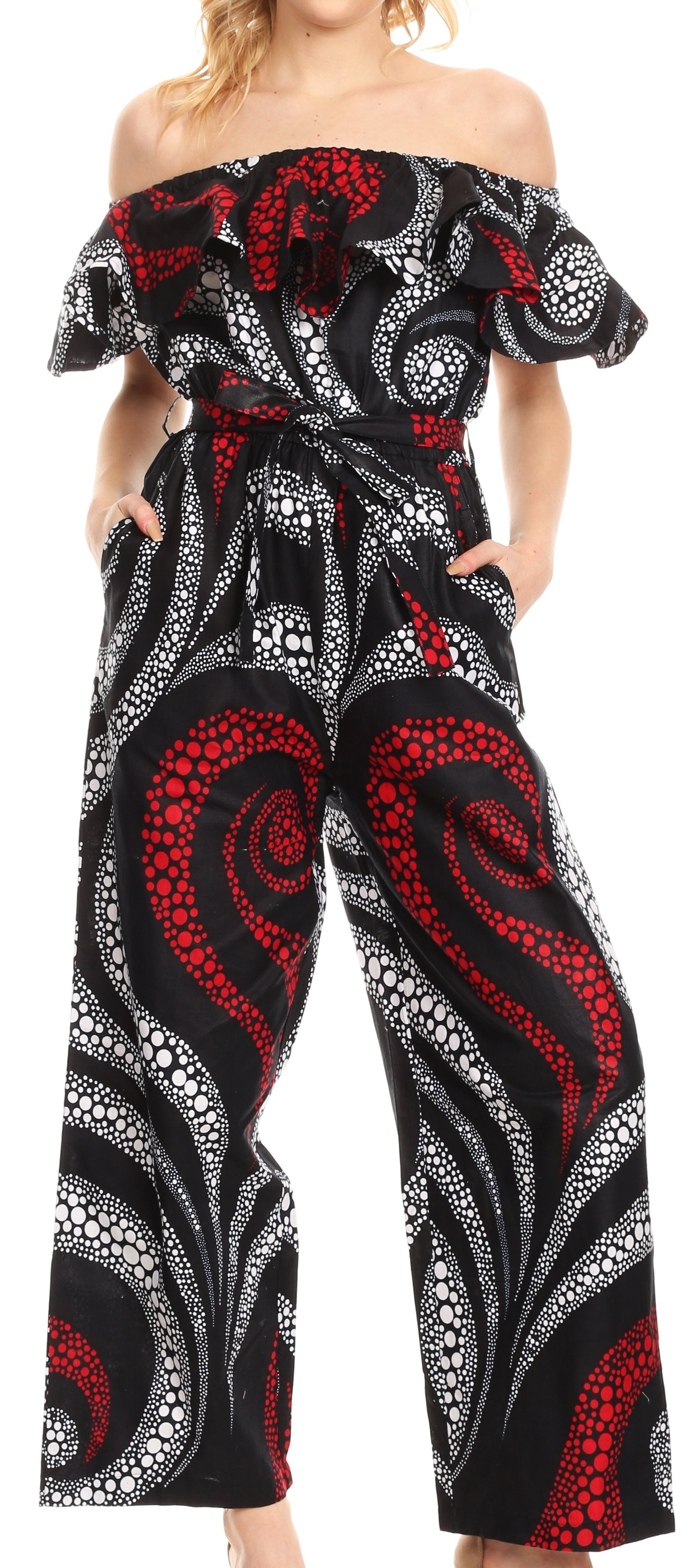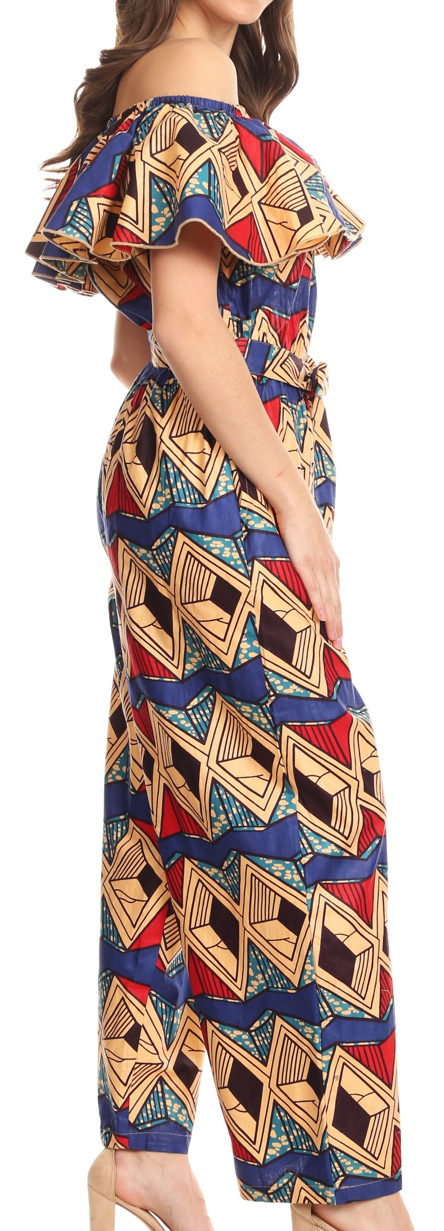 Sakkas Lelisa Ruffle Off-shoulder Long Jumpsuit w/pockets Wax African Ankara Dutch