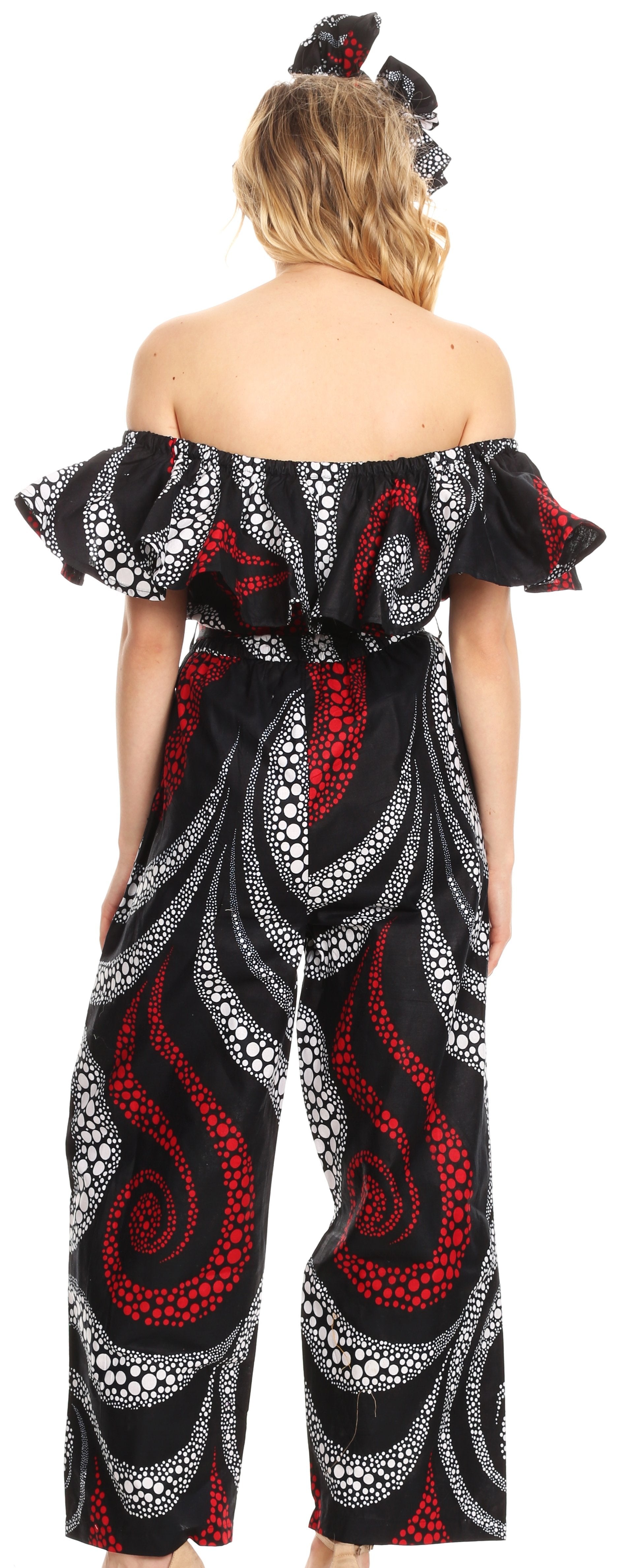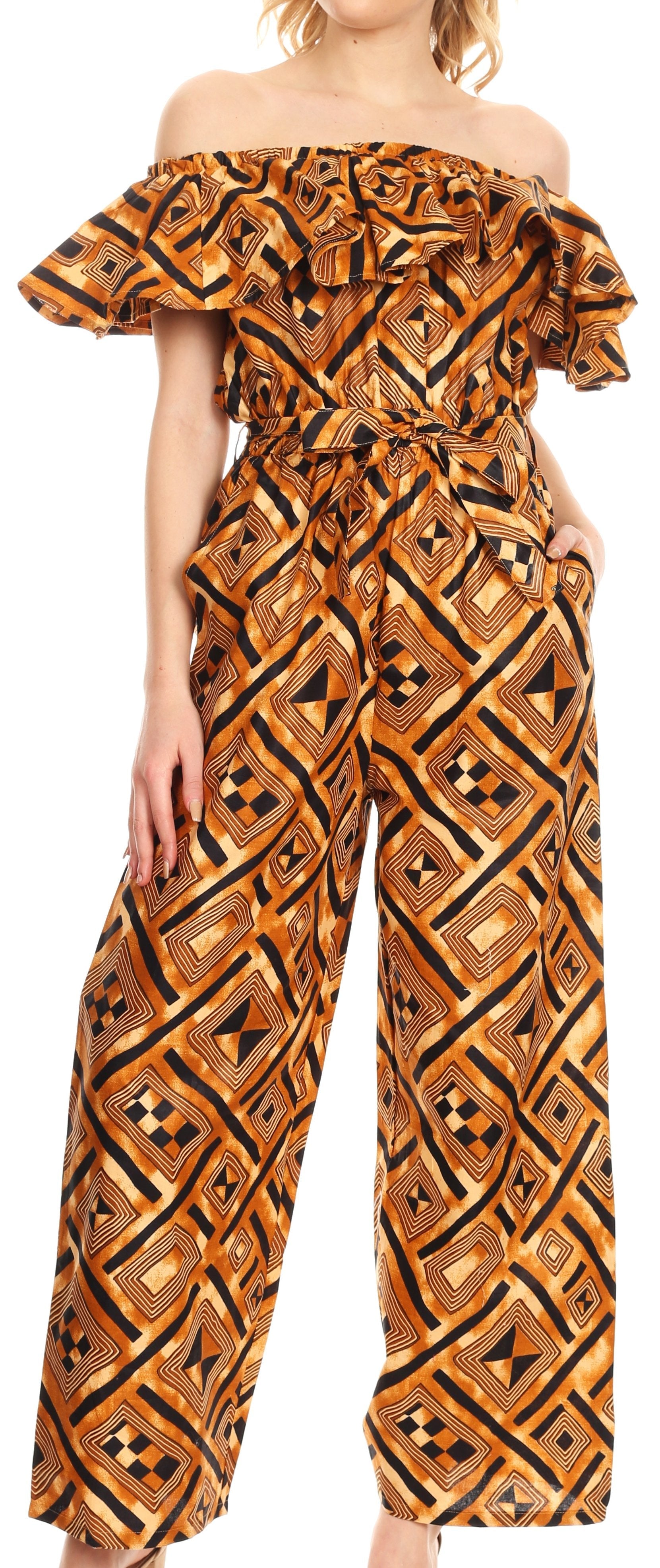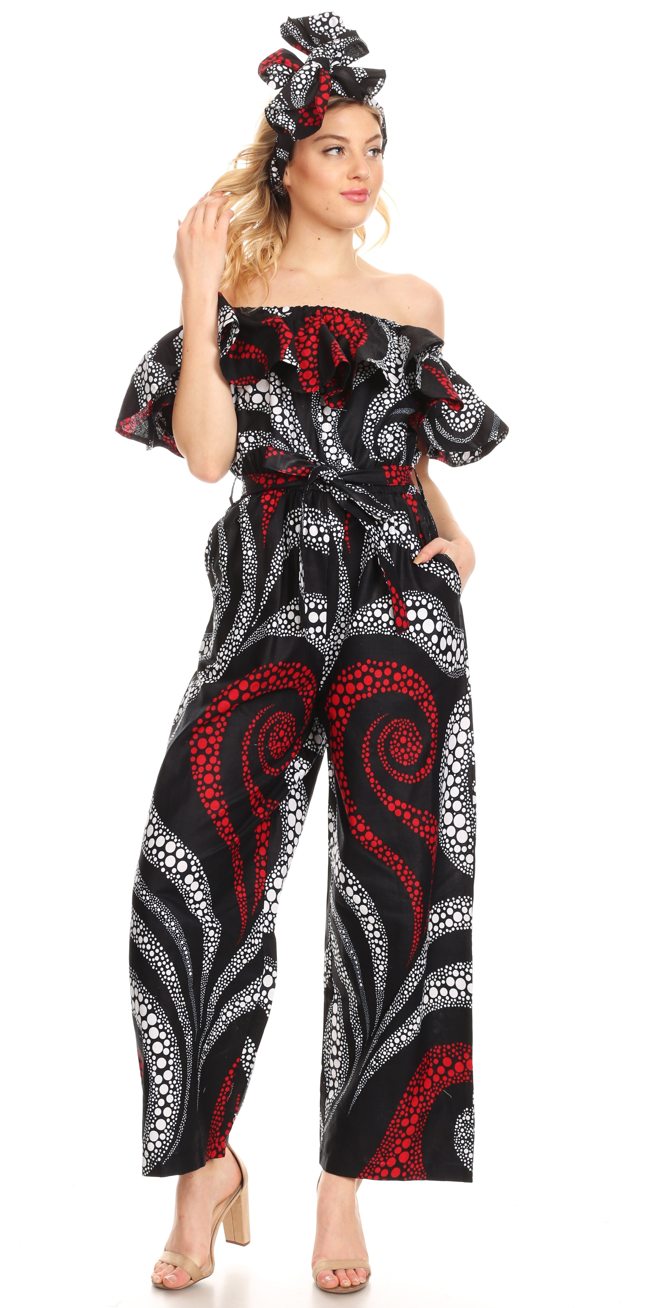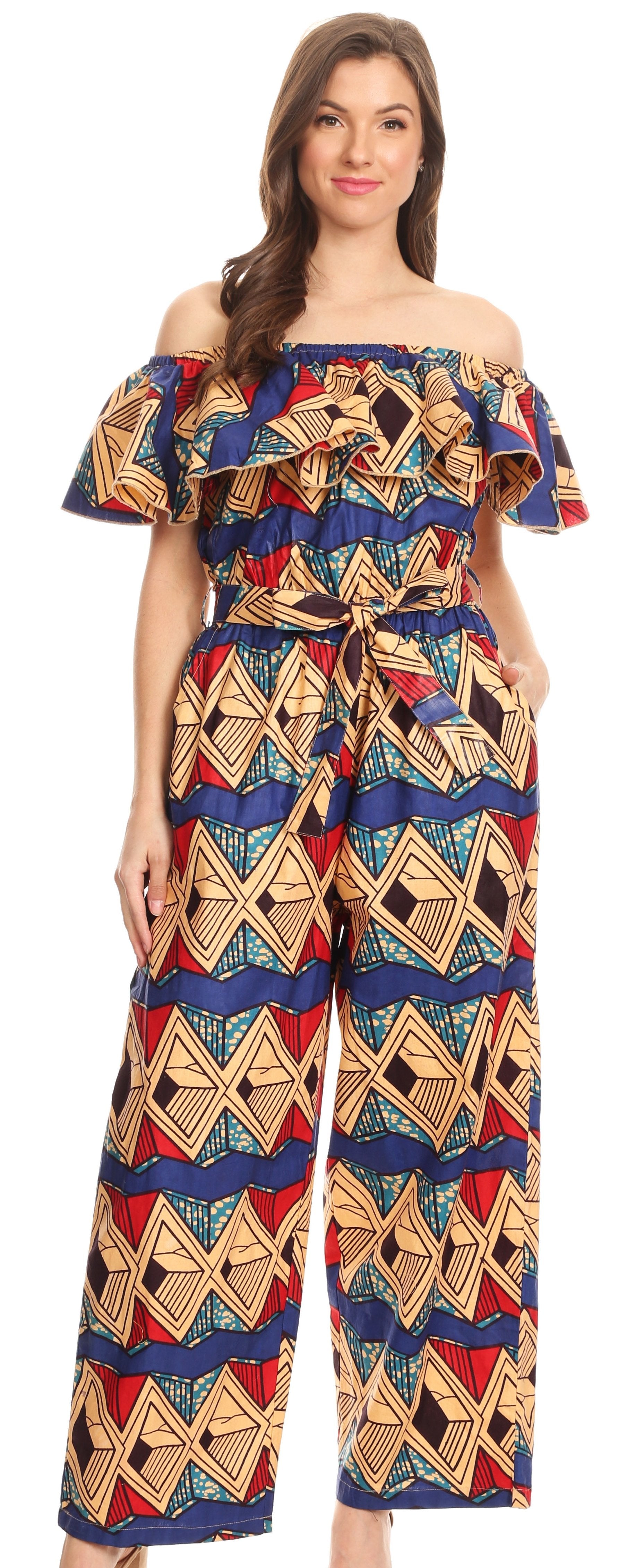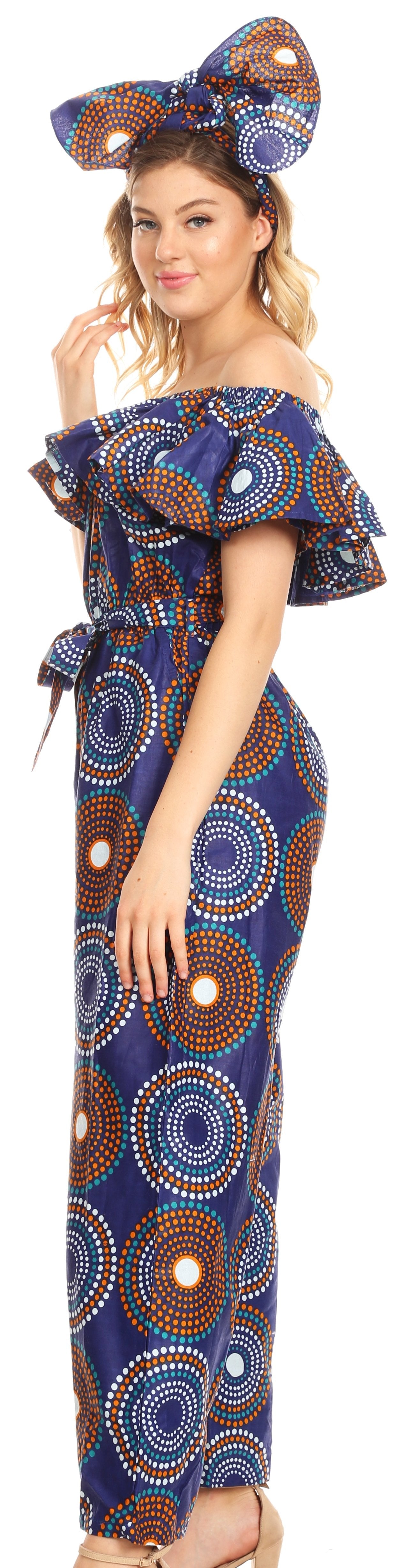 Sakkas Lelisa Ruffle Off-shoulder Long Jumpsuit w/pockets Wax African Ankara Dutch
