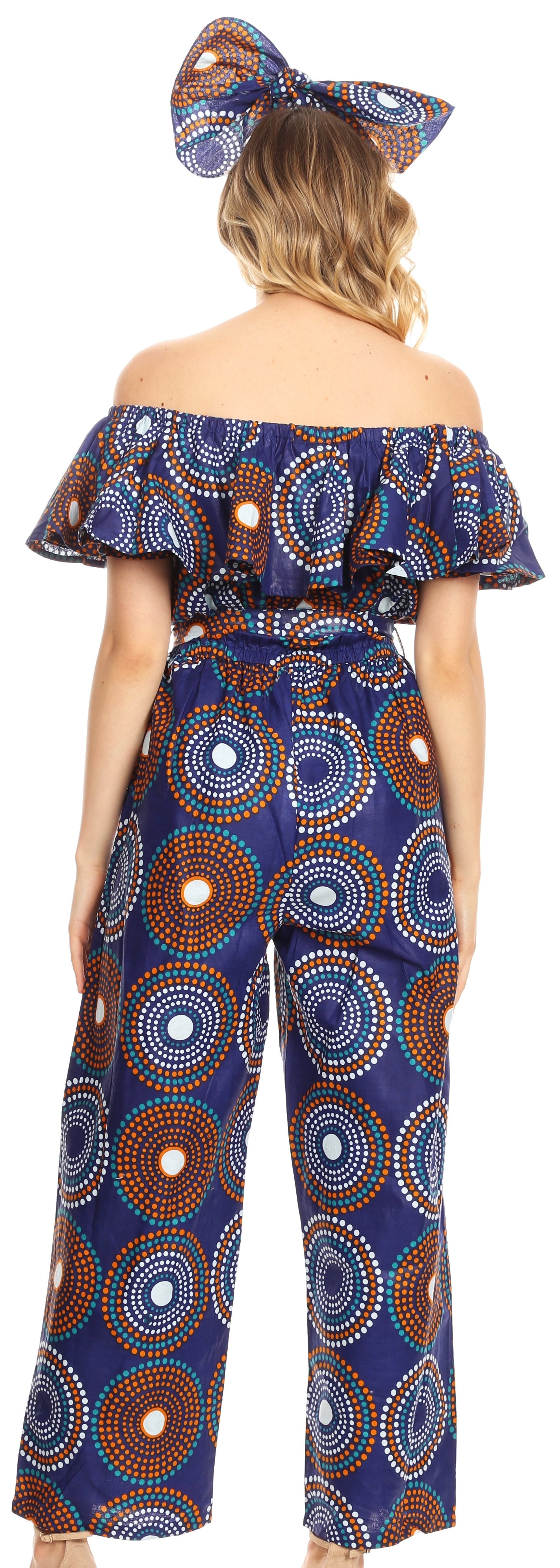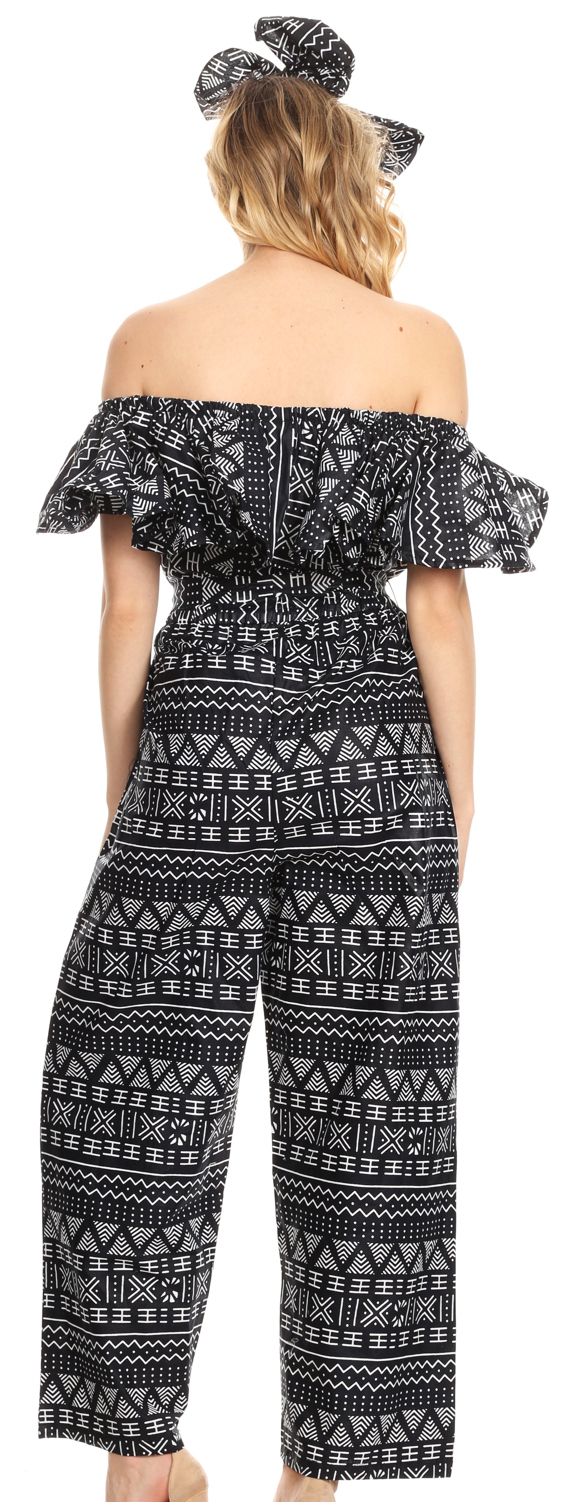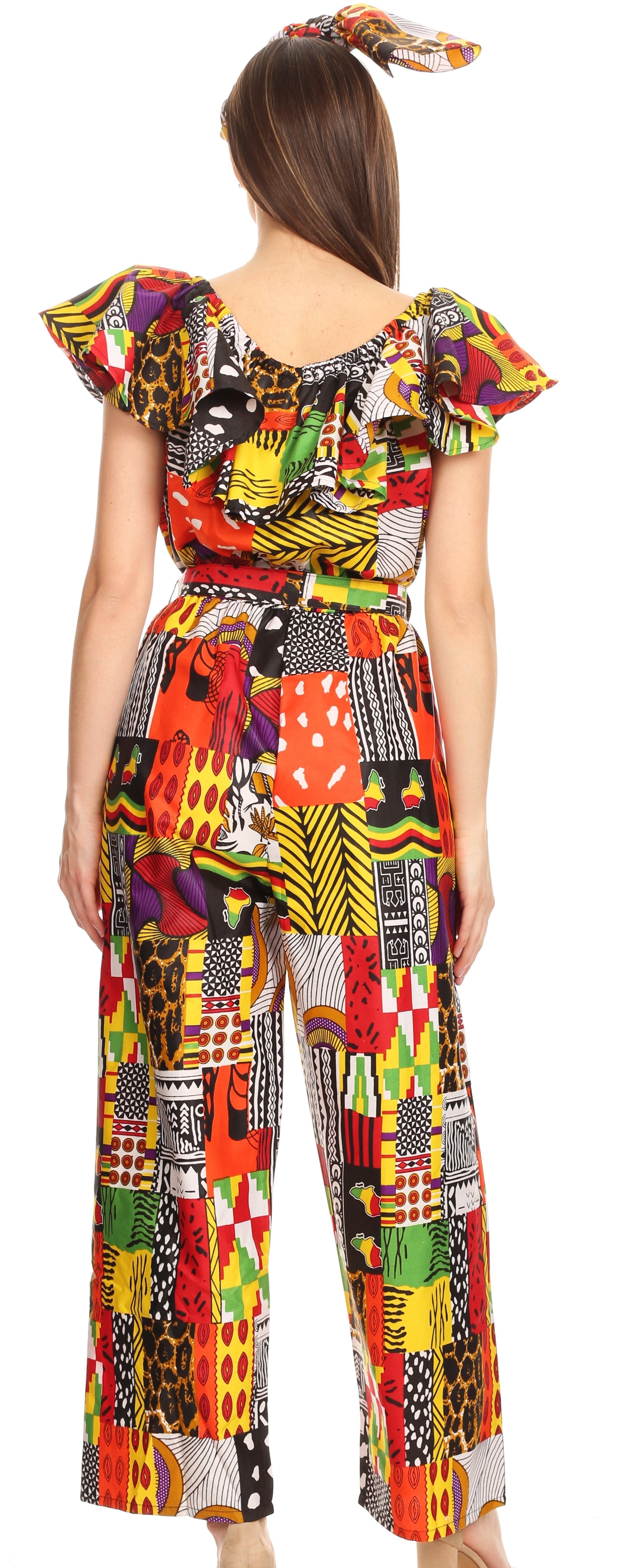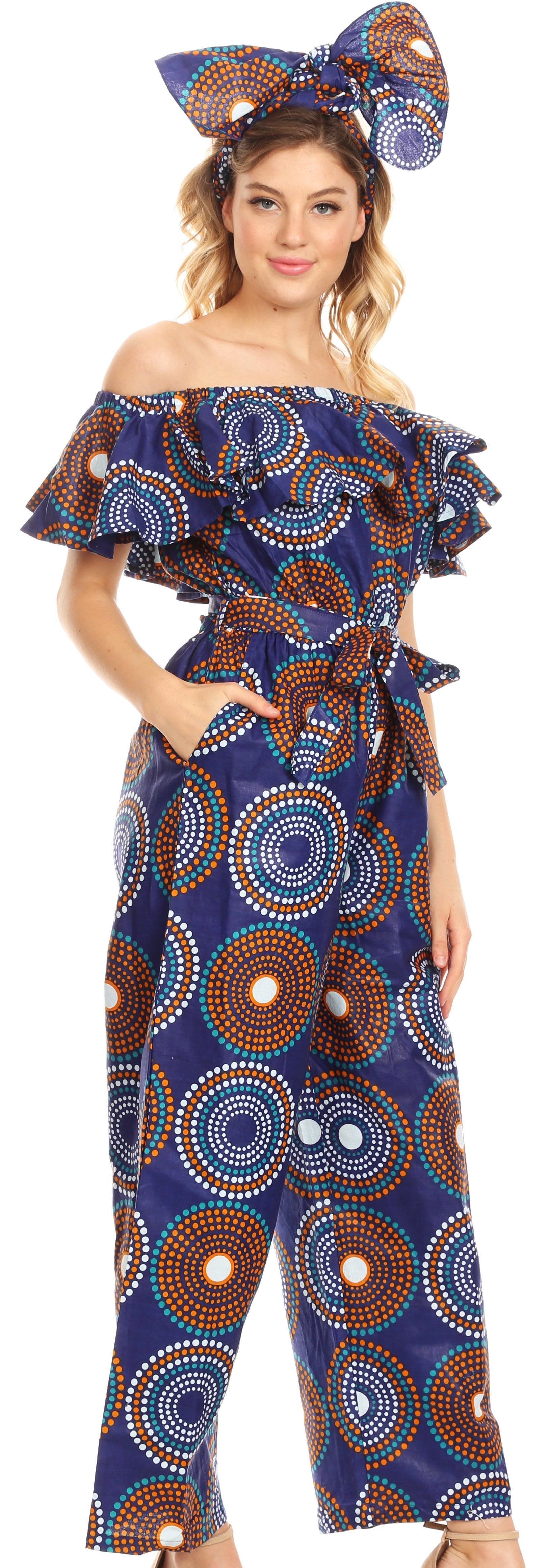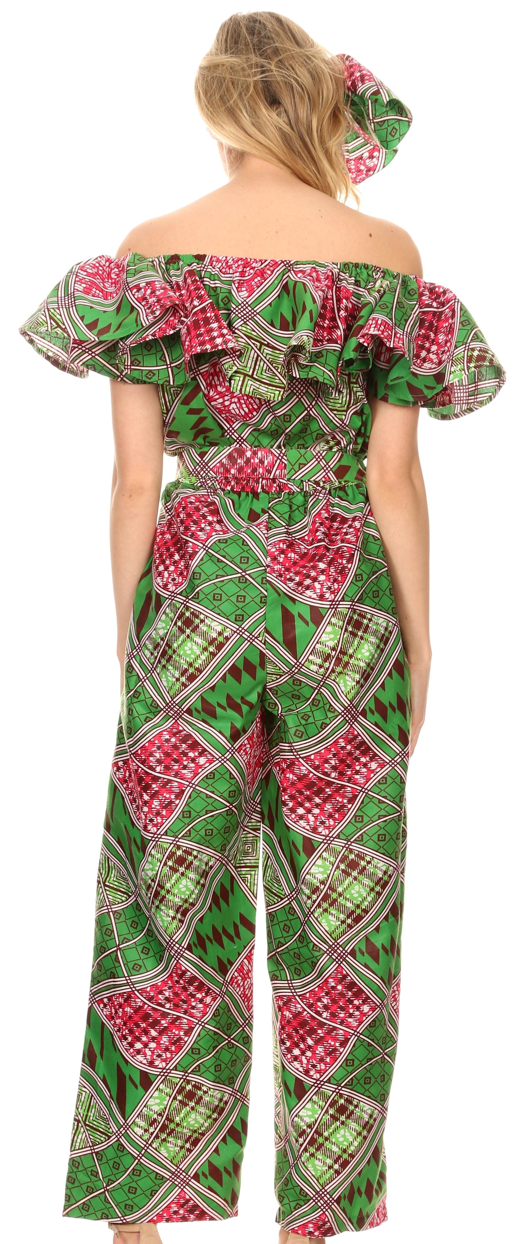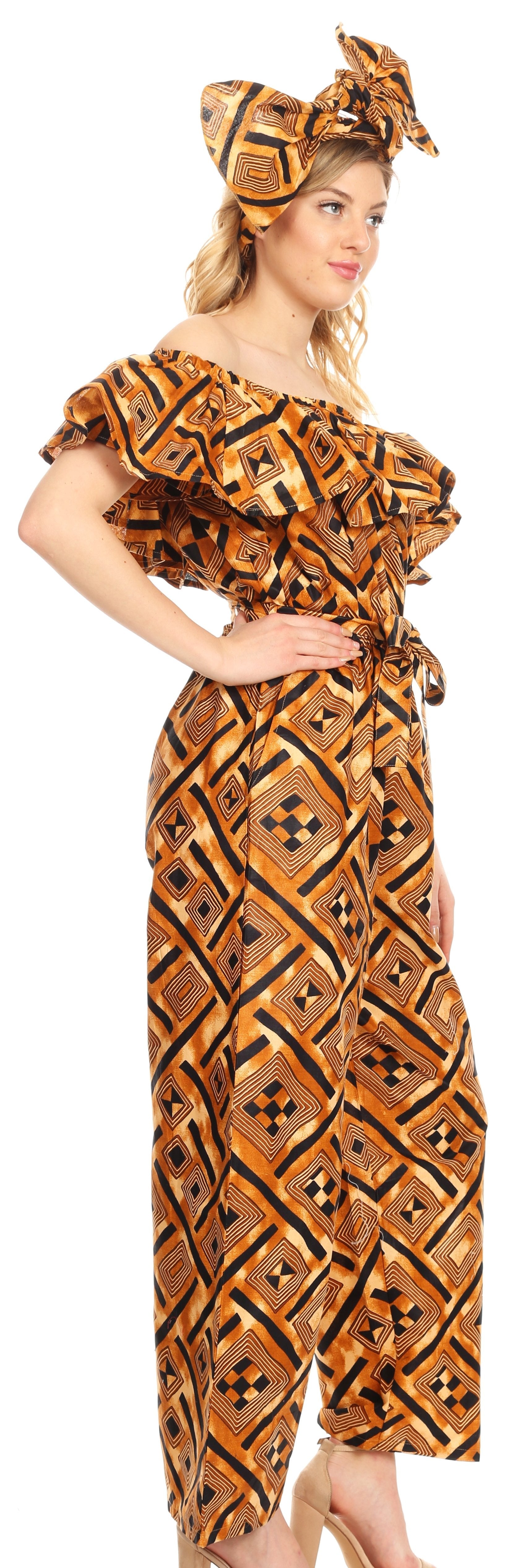 Sakkas Lelisa Ruffle Off-shoulder Long Jumpsuit w/pockets Wax African Ankara Dutch
