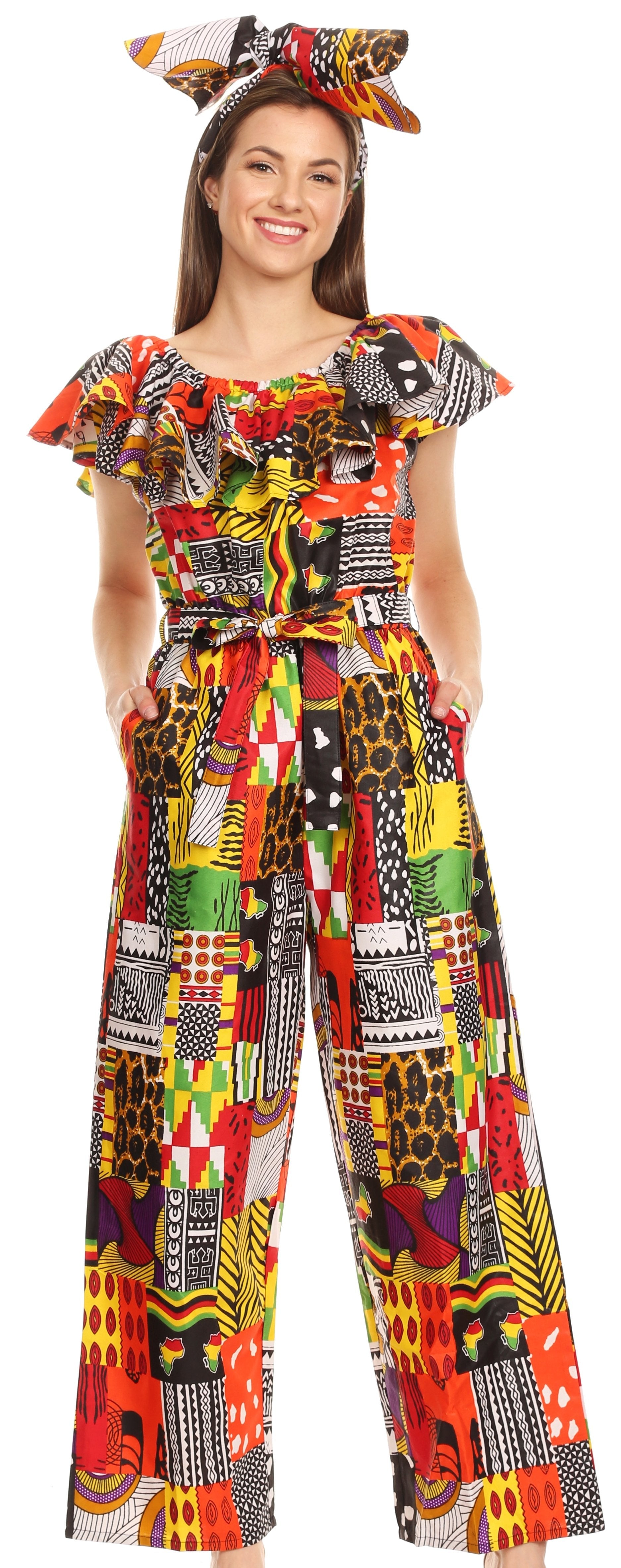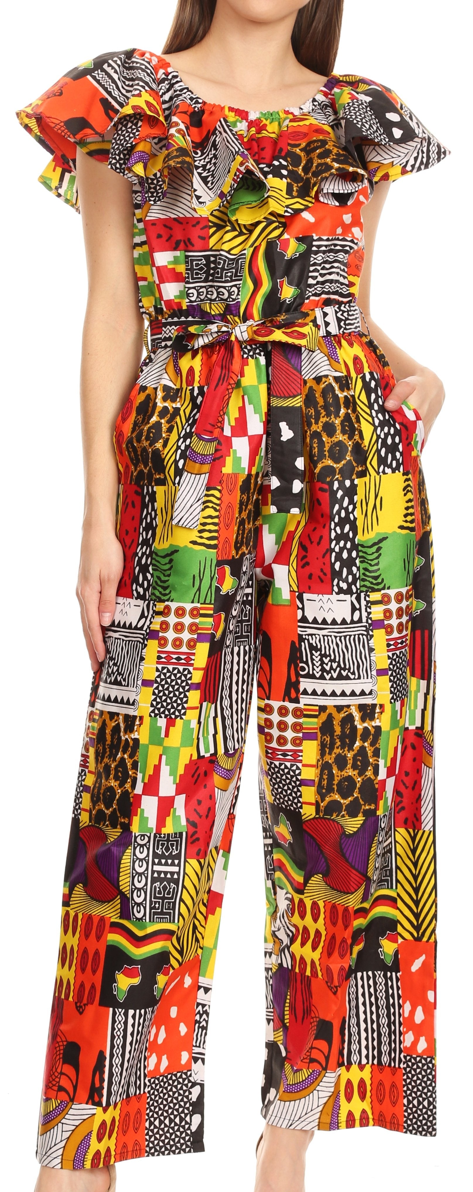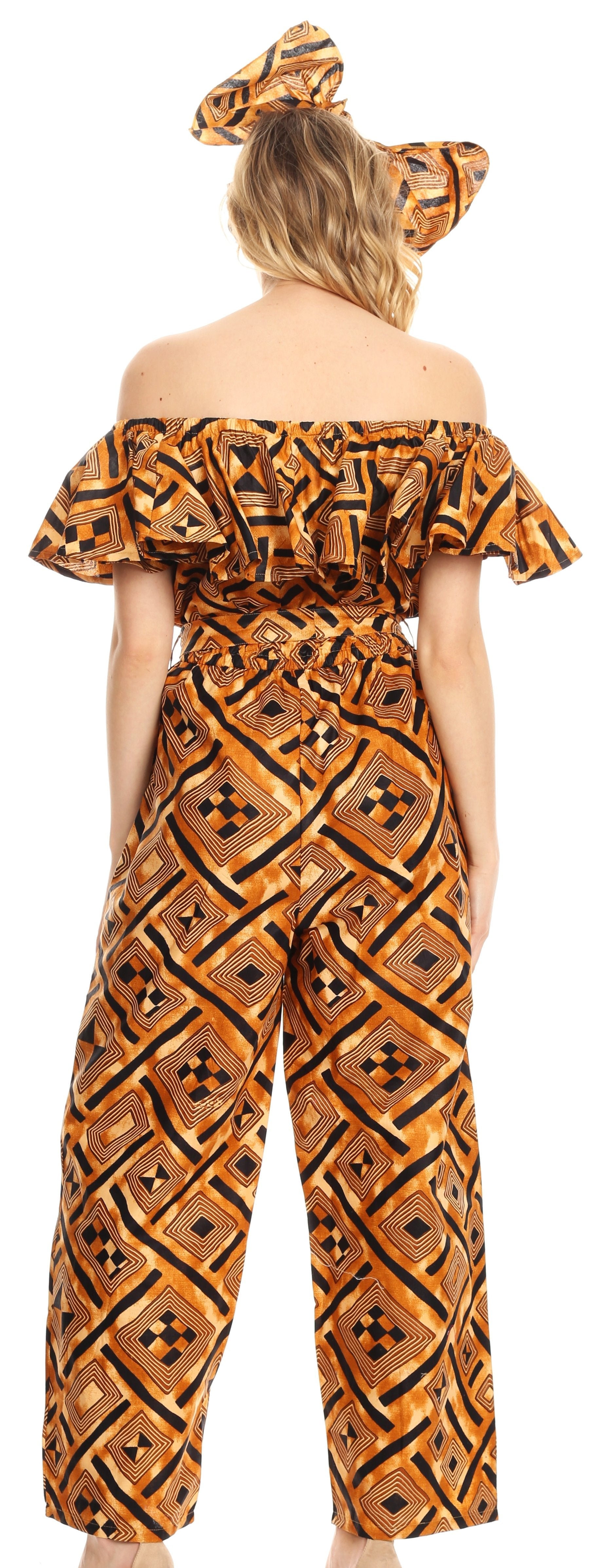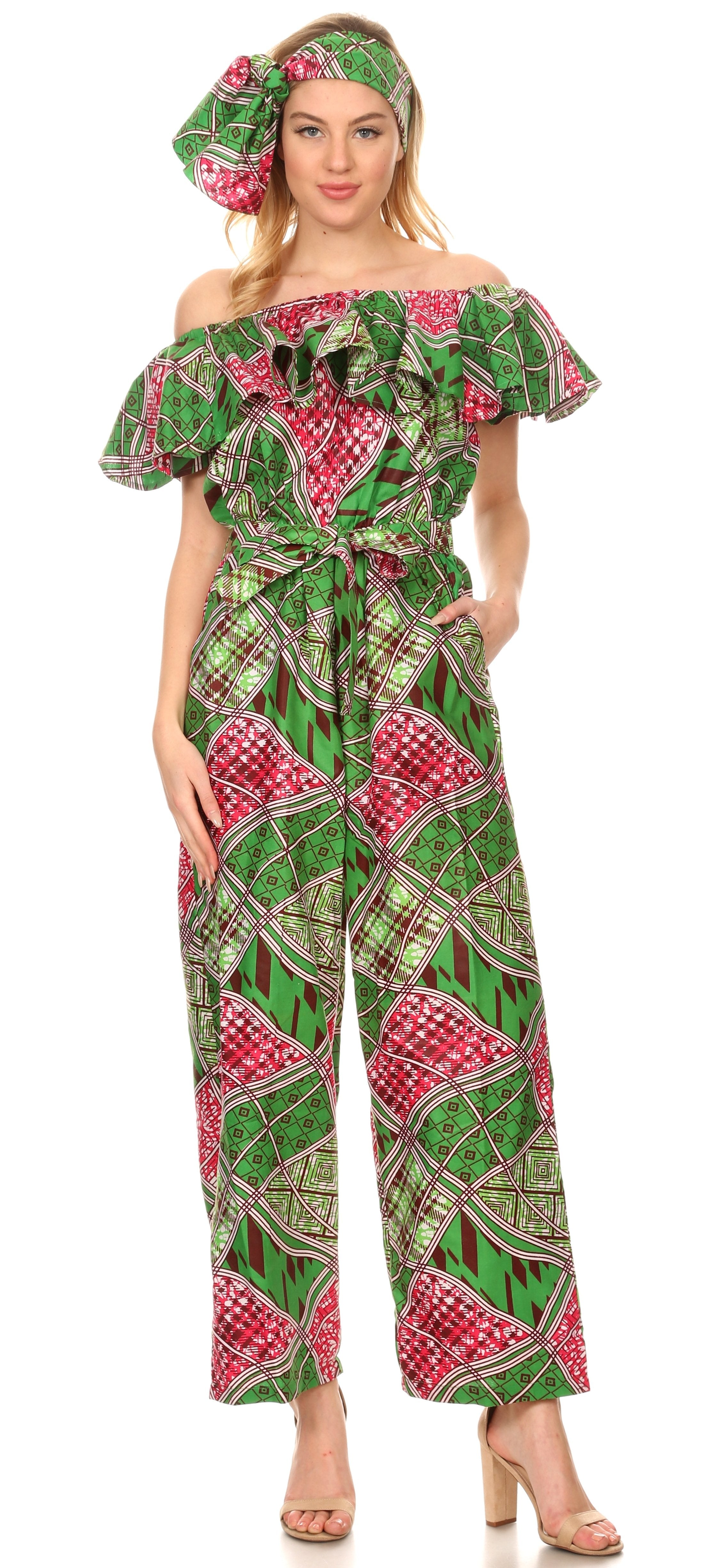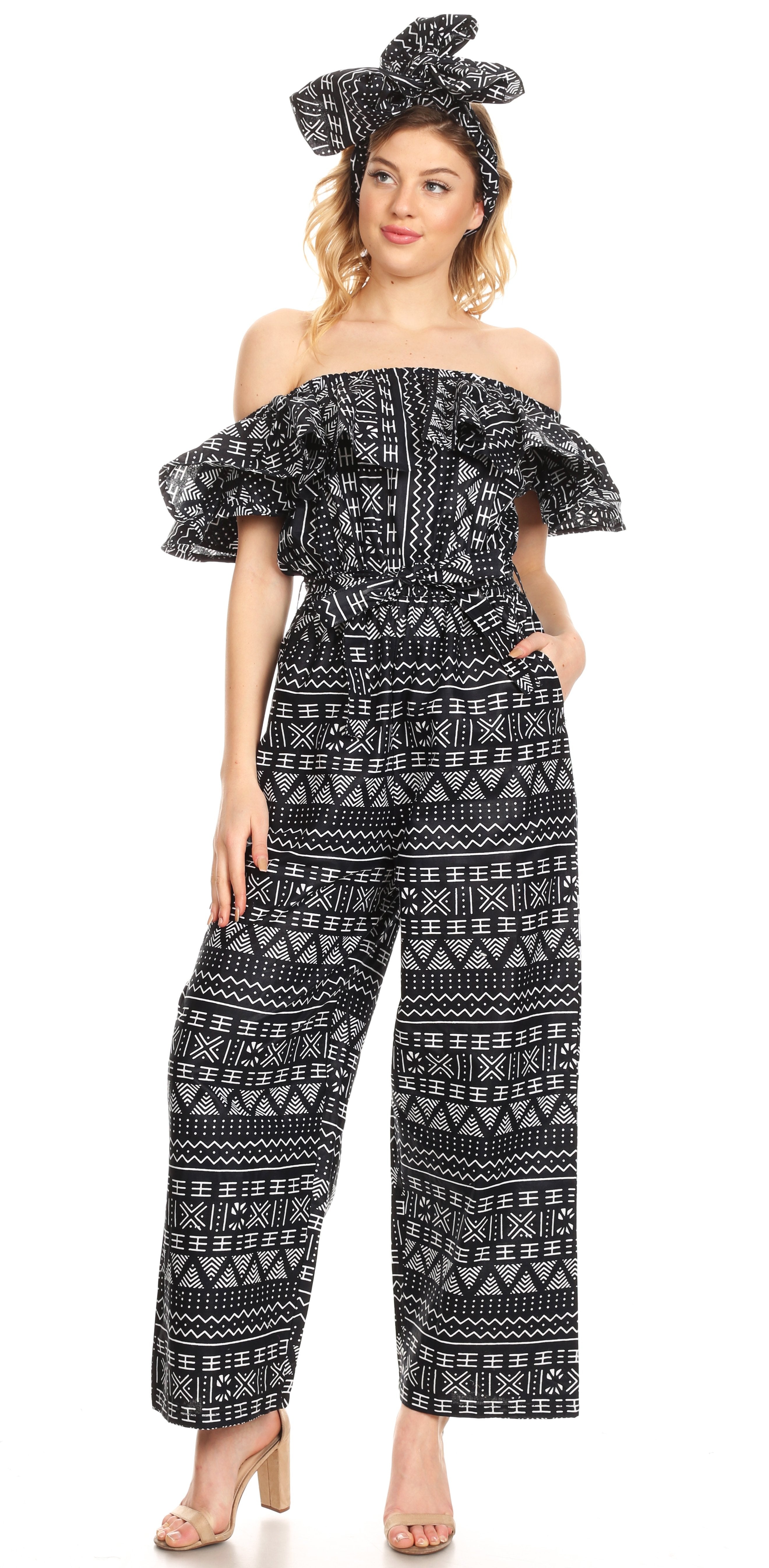 Sakkas Lelisa Ruffle Off-shoulder Long Jumpsuit w/pockets Wax African Ankara Dutch