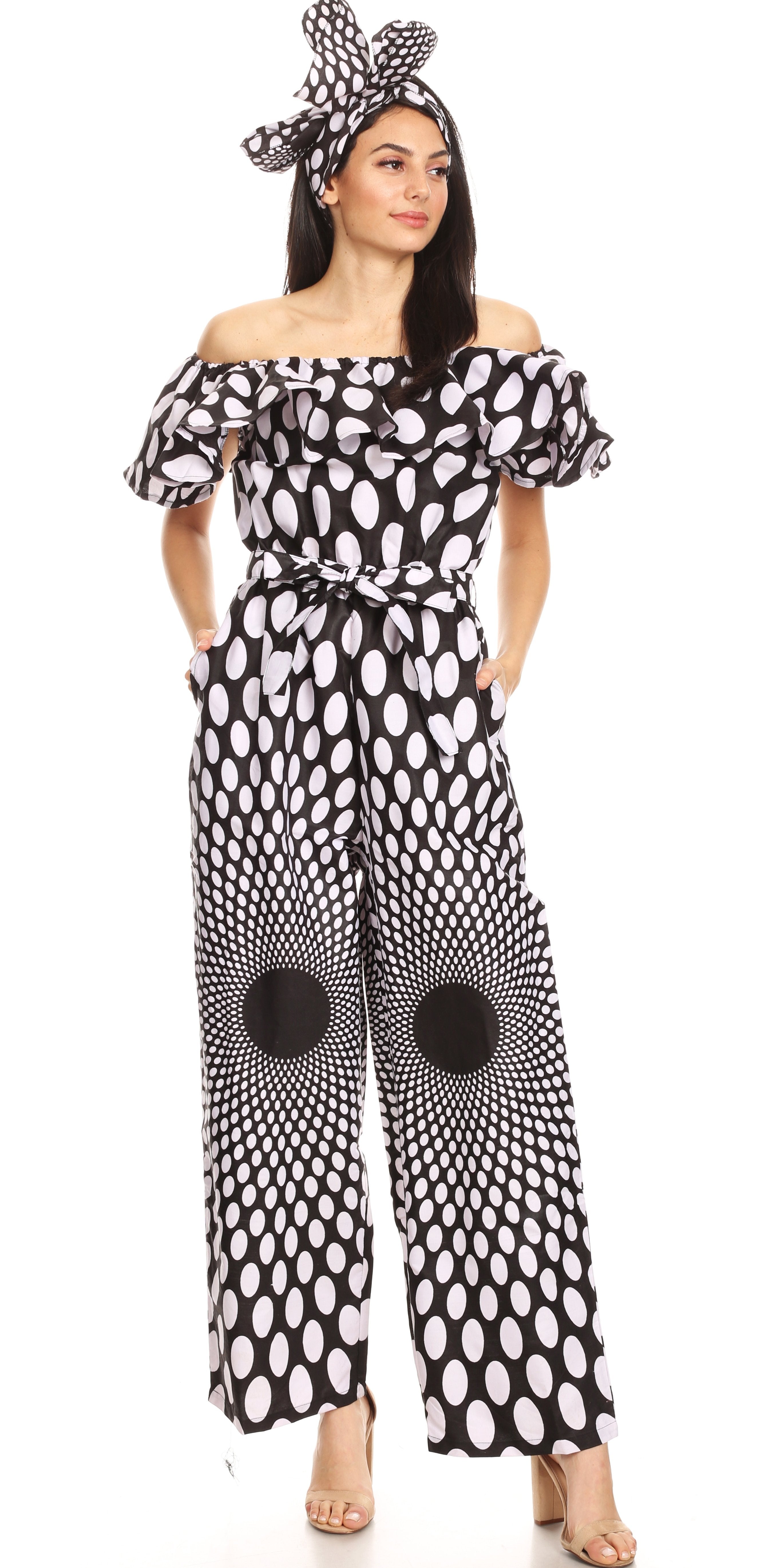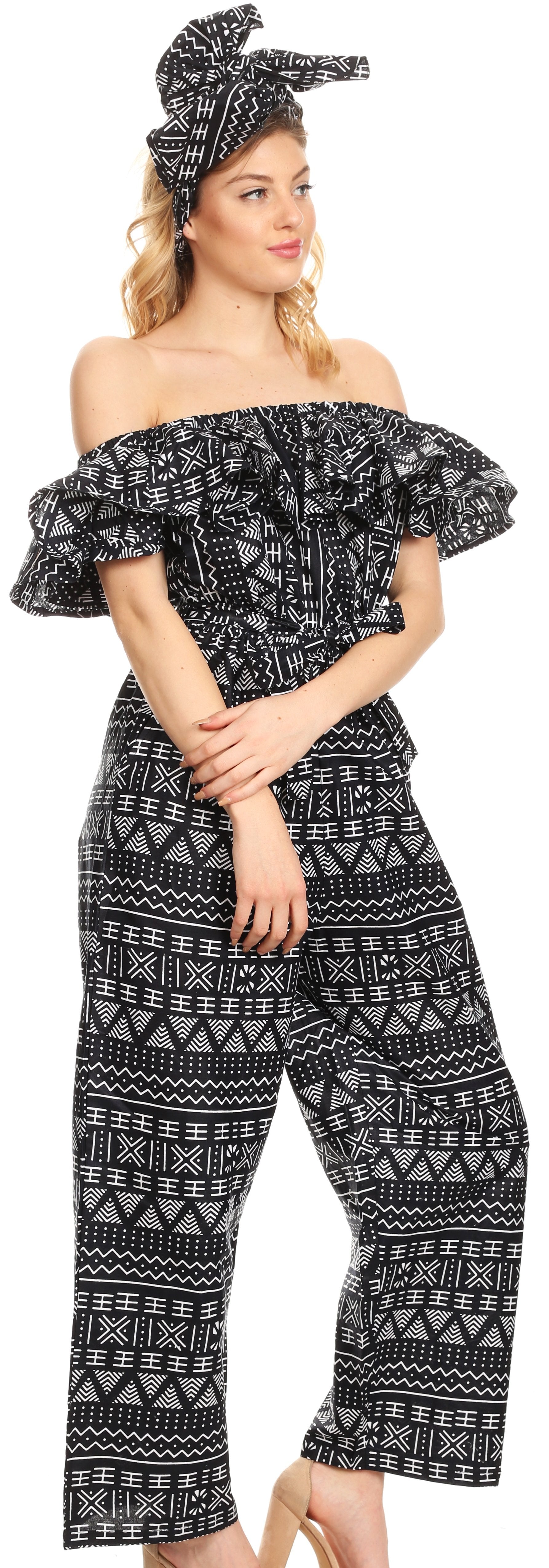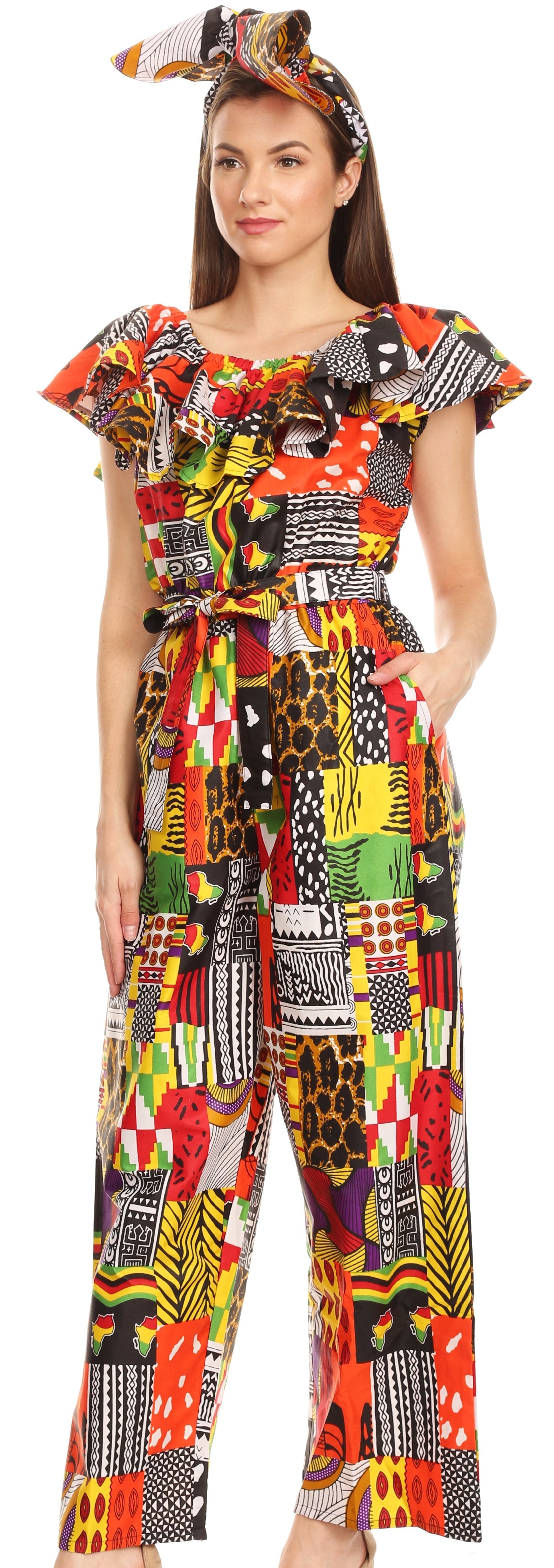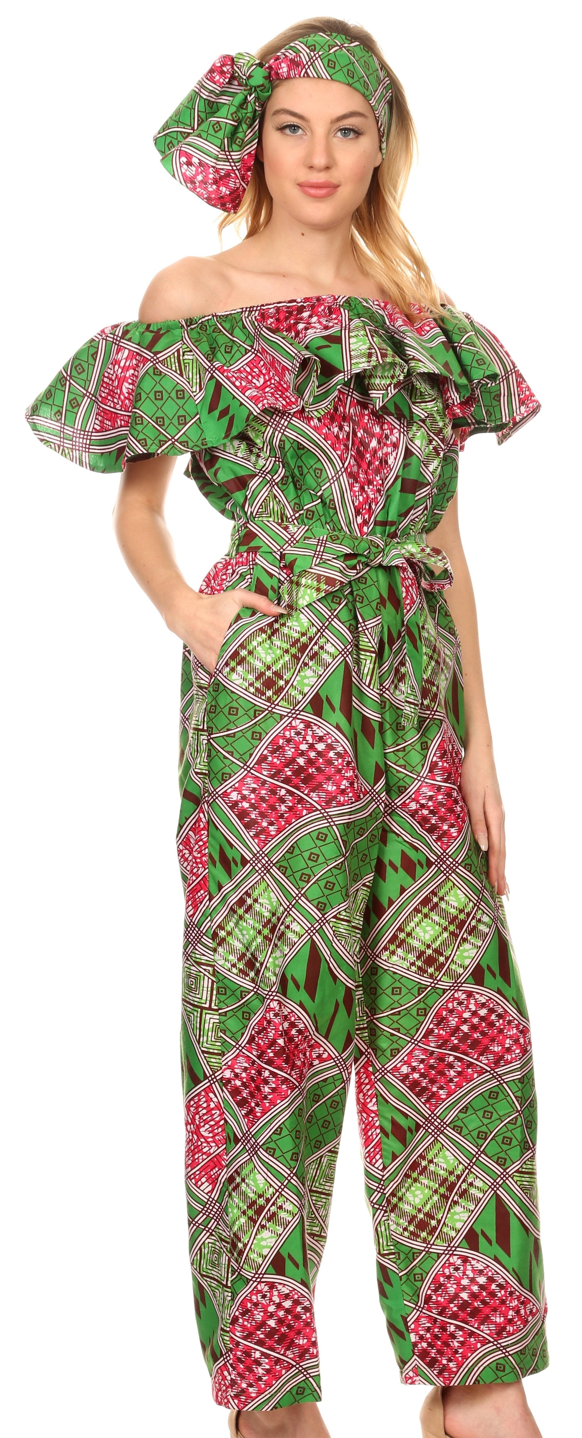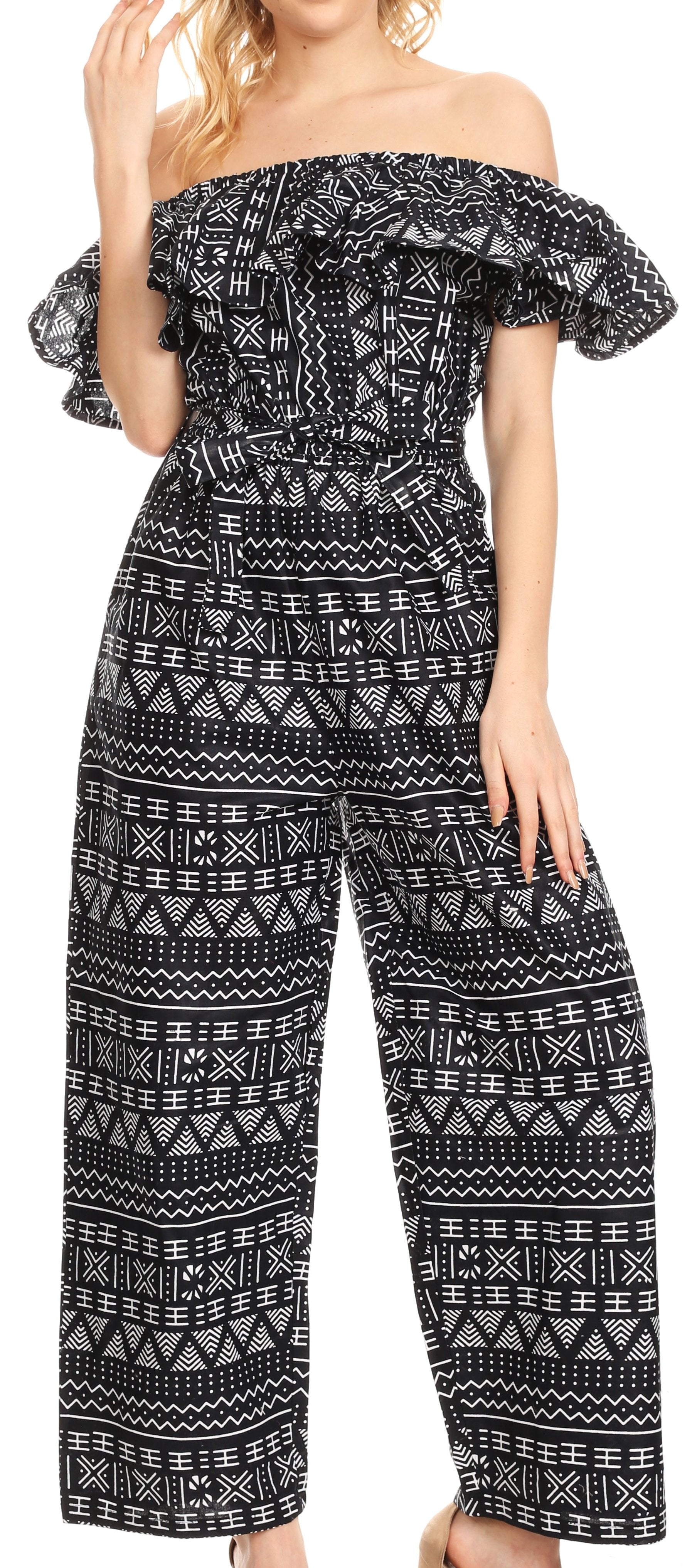 Sakkas Lelisa Ruffle Off-shoulder Long Jumpsuit w/pockets Wax African Ankara Dutch