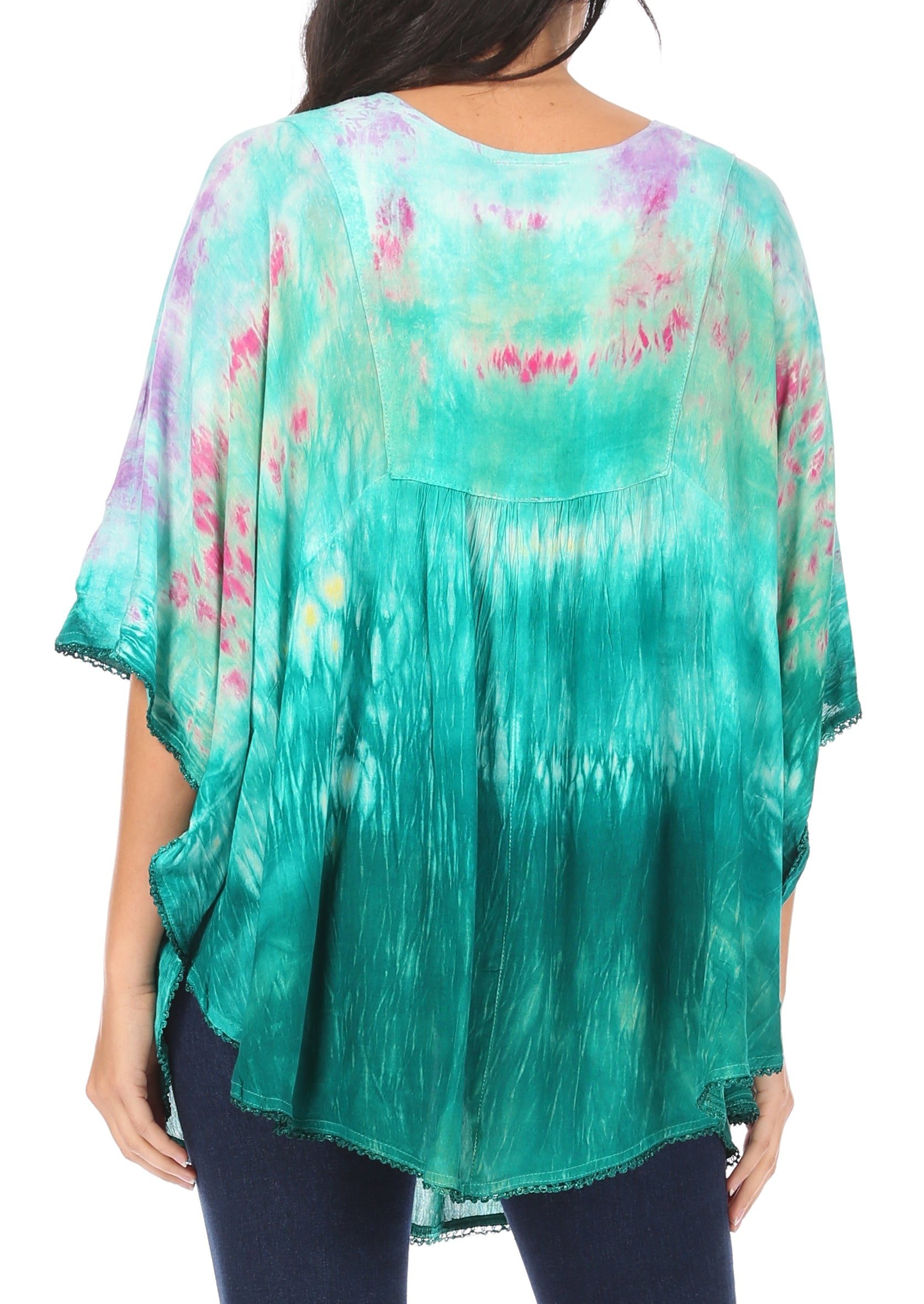 Sakkas Lepha Long Wide Multi Colored Tie Dye Sequin Embroidered Poncho Top Blouse