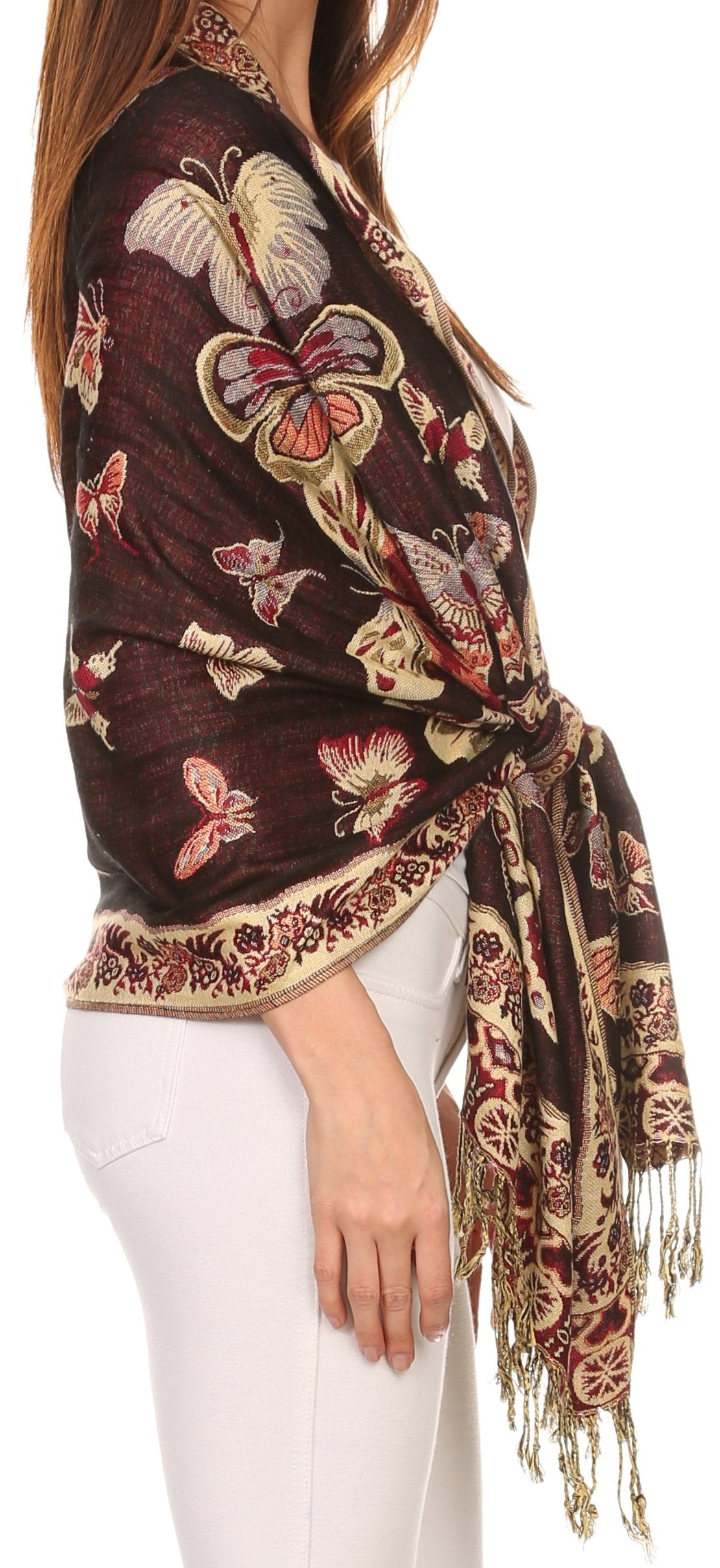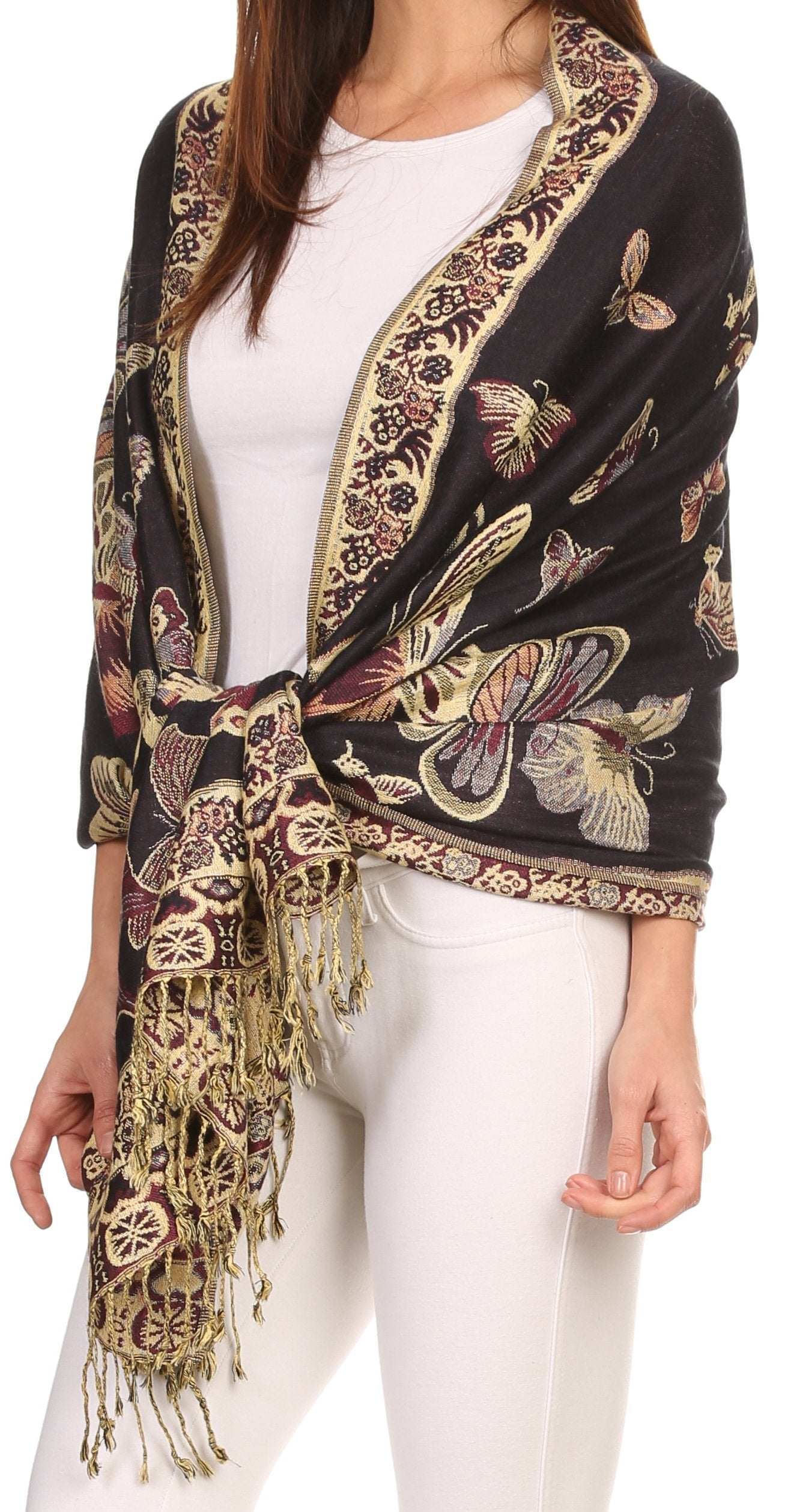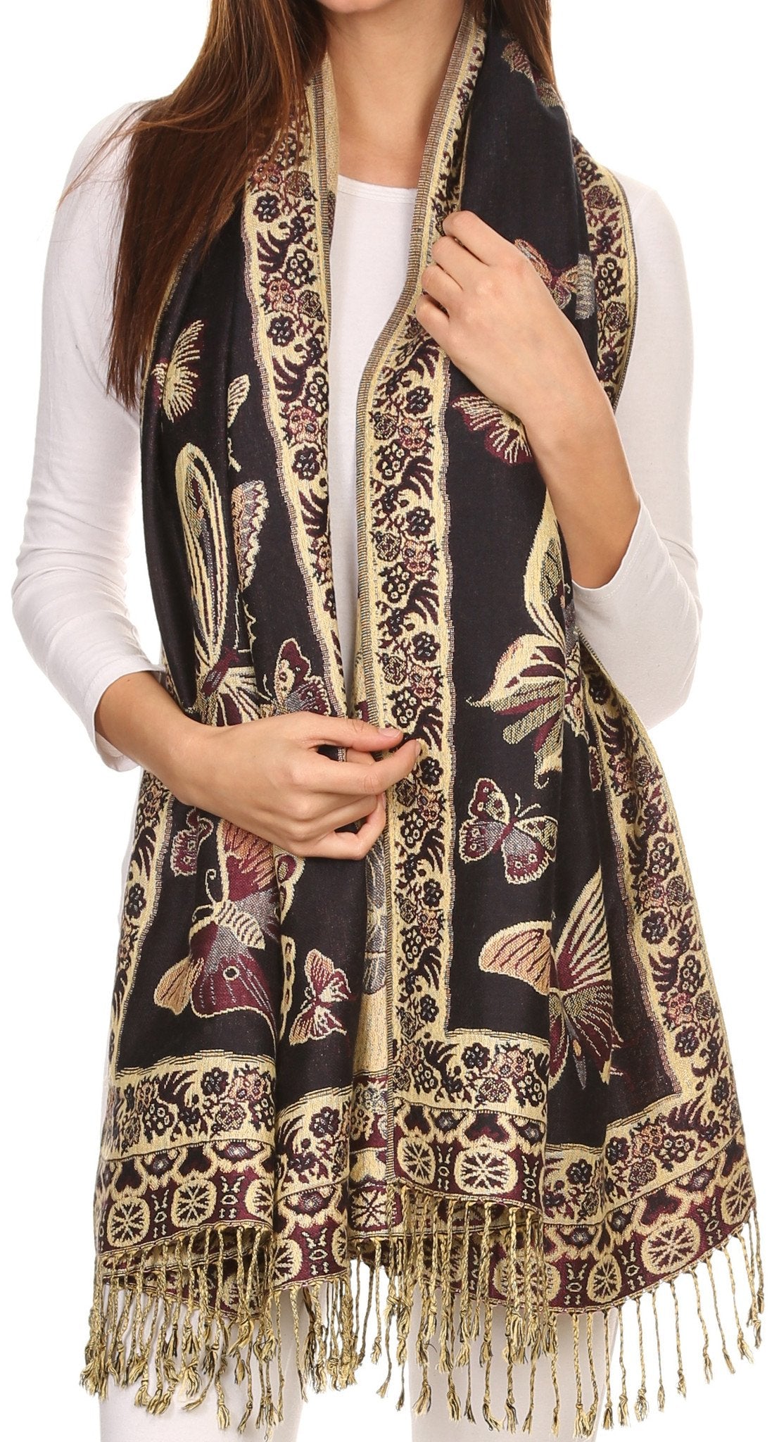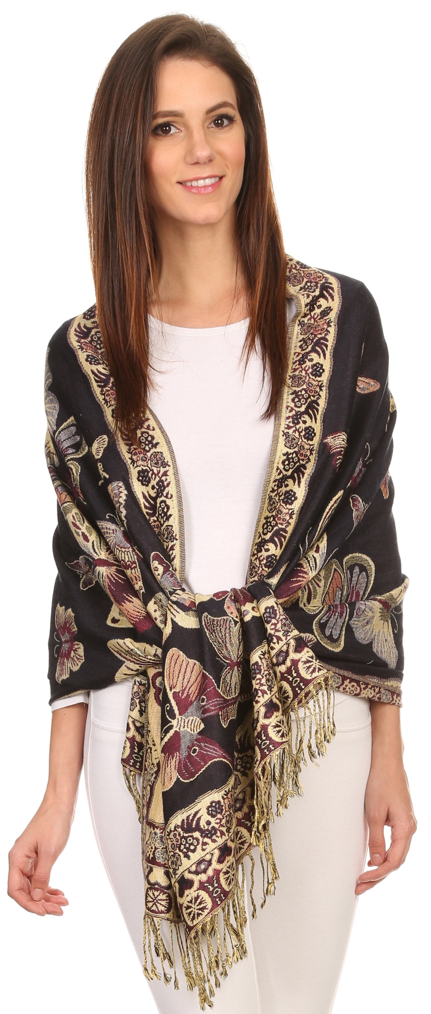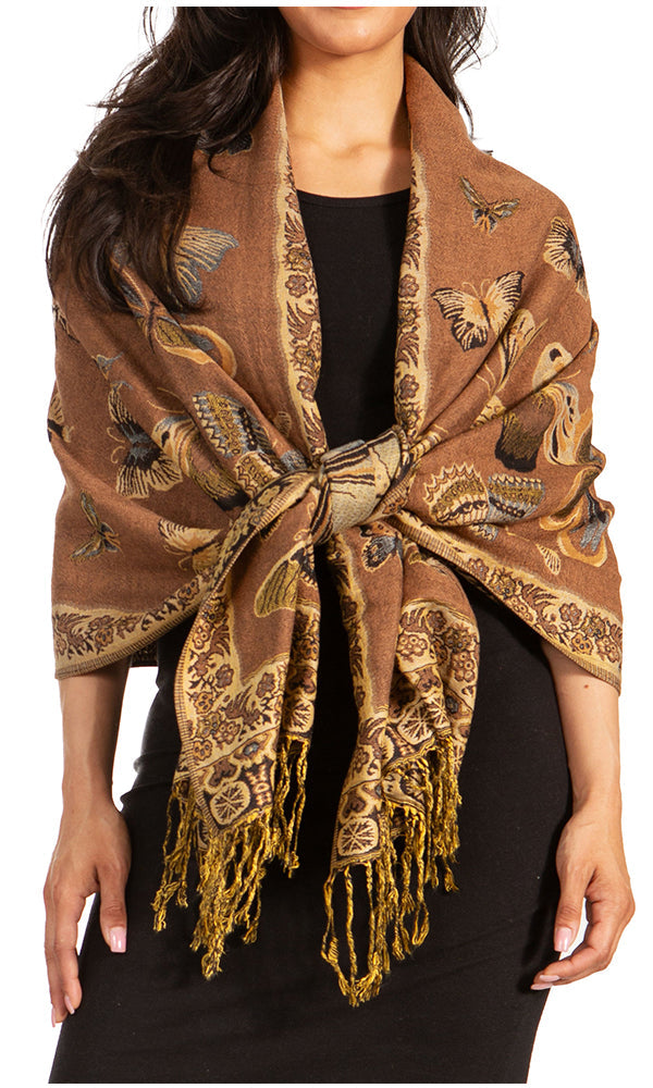 This pashmina feel shawl features a unique gorgeous butterfly patterned design. The designs are multi colored. The color combination for each scarf is gorgeous with the most beautiful hues. The tassels are a blend of two different colors of fabric woven together. This scarf is long and wide, opaque, and mid weight.