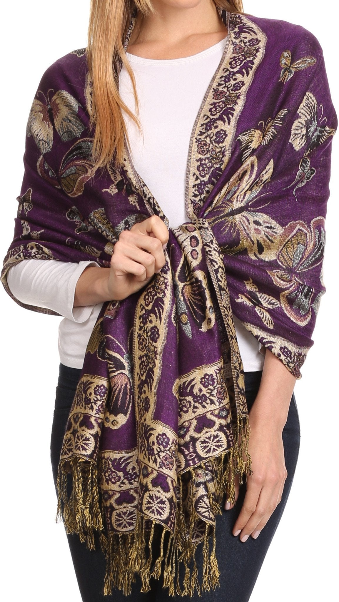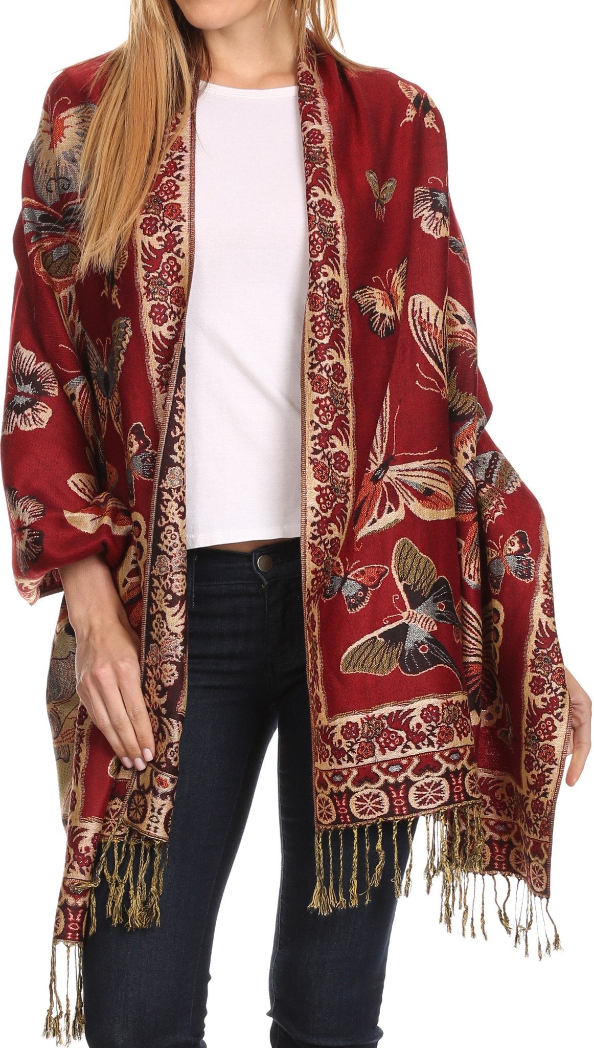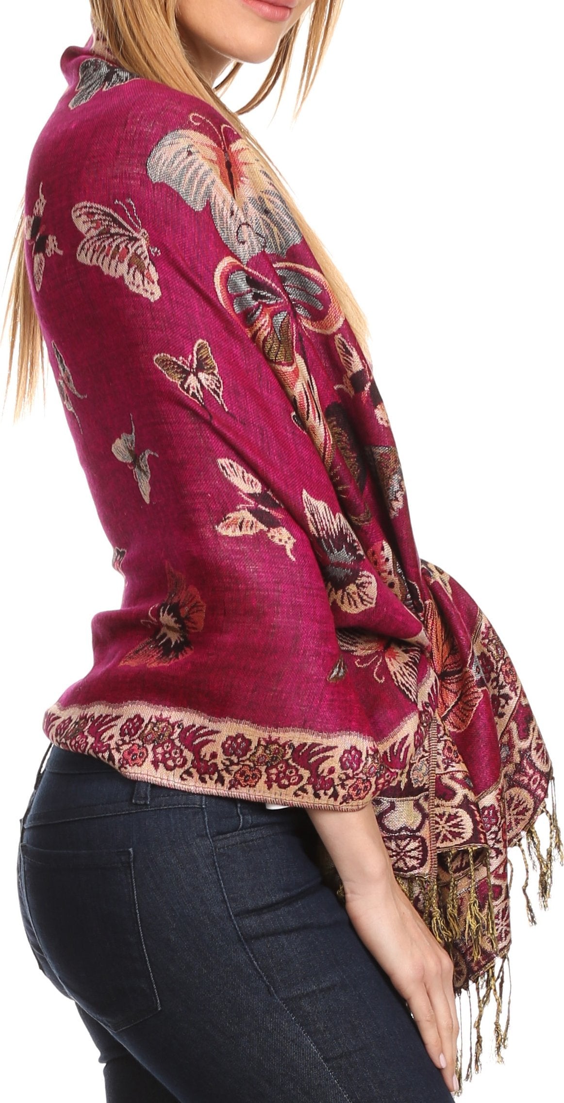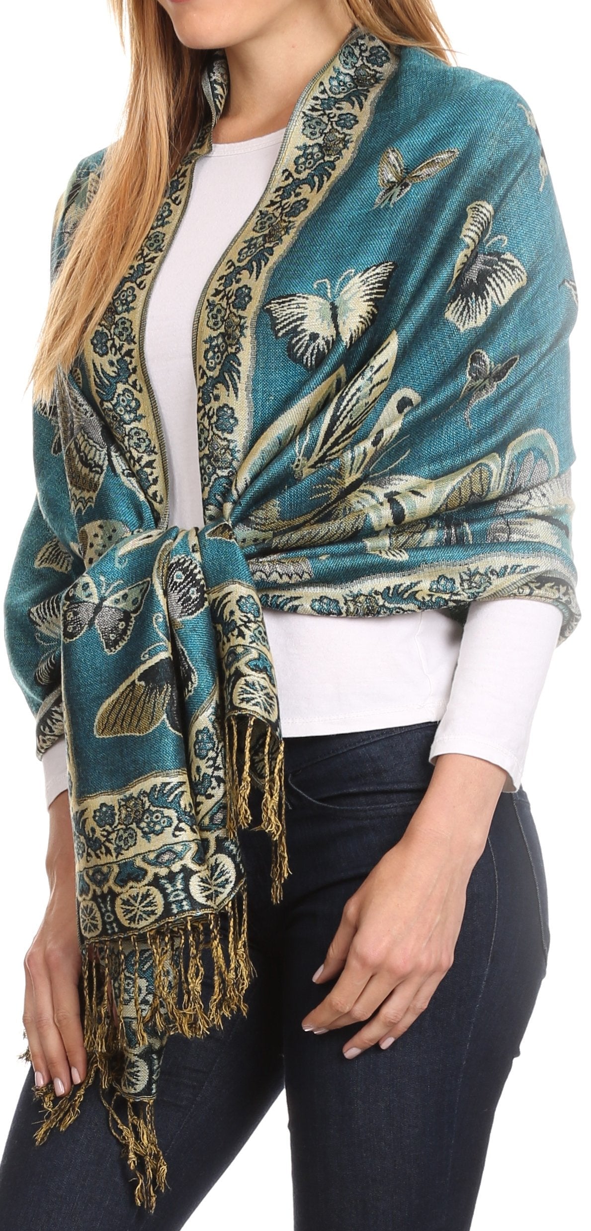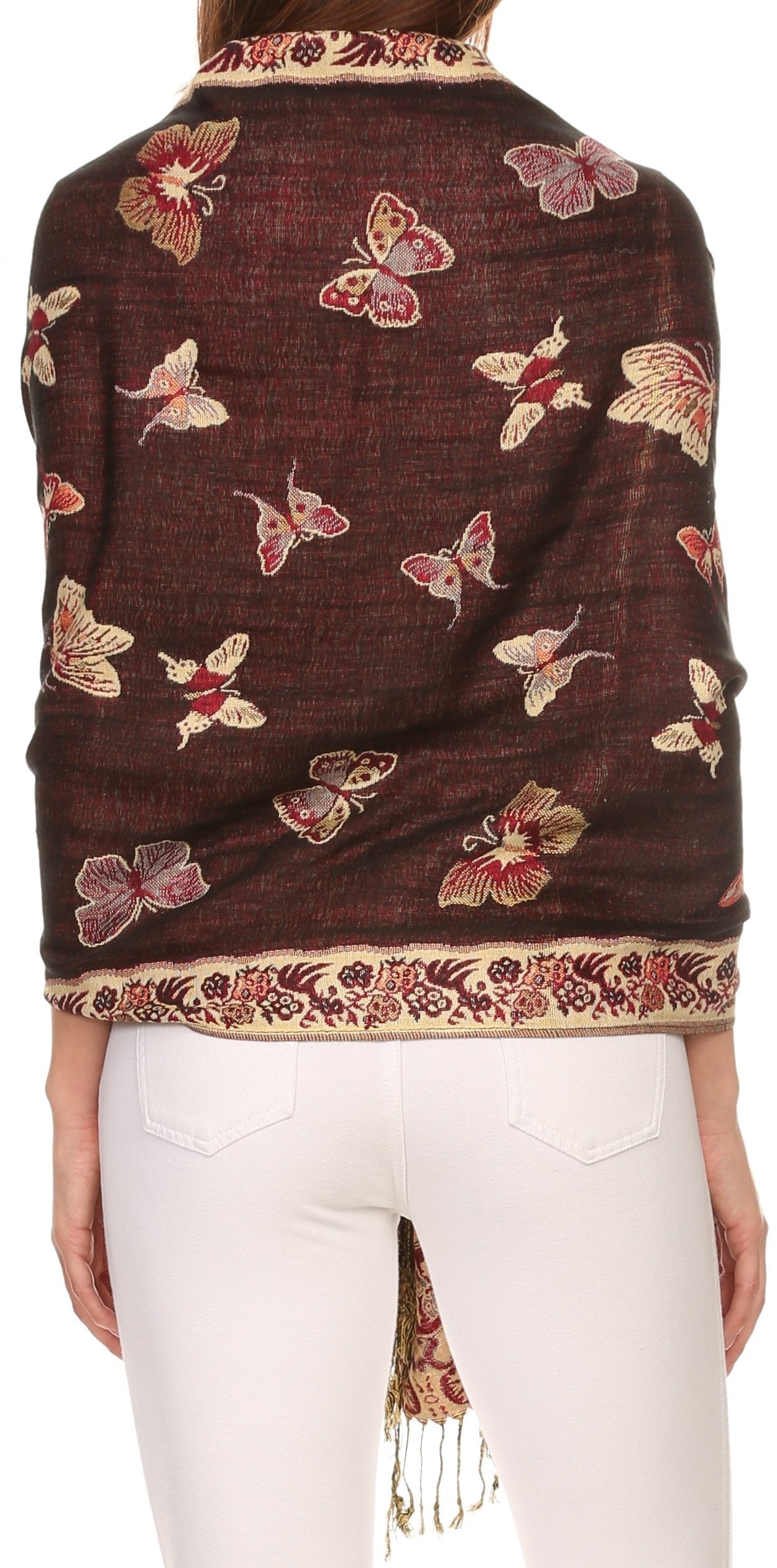 This pashmina feel shawl features a unique gorgeous butterfly patterned design. The designs are multi colored. The color combination for each scarf is gorgeous with the most beautiful hues. The tassels are a blend of two different colors of fabric woven together. This scarf is long and wide, opaque, and mid weight.