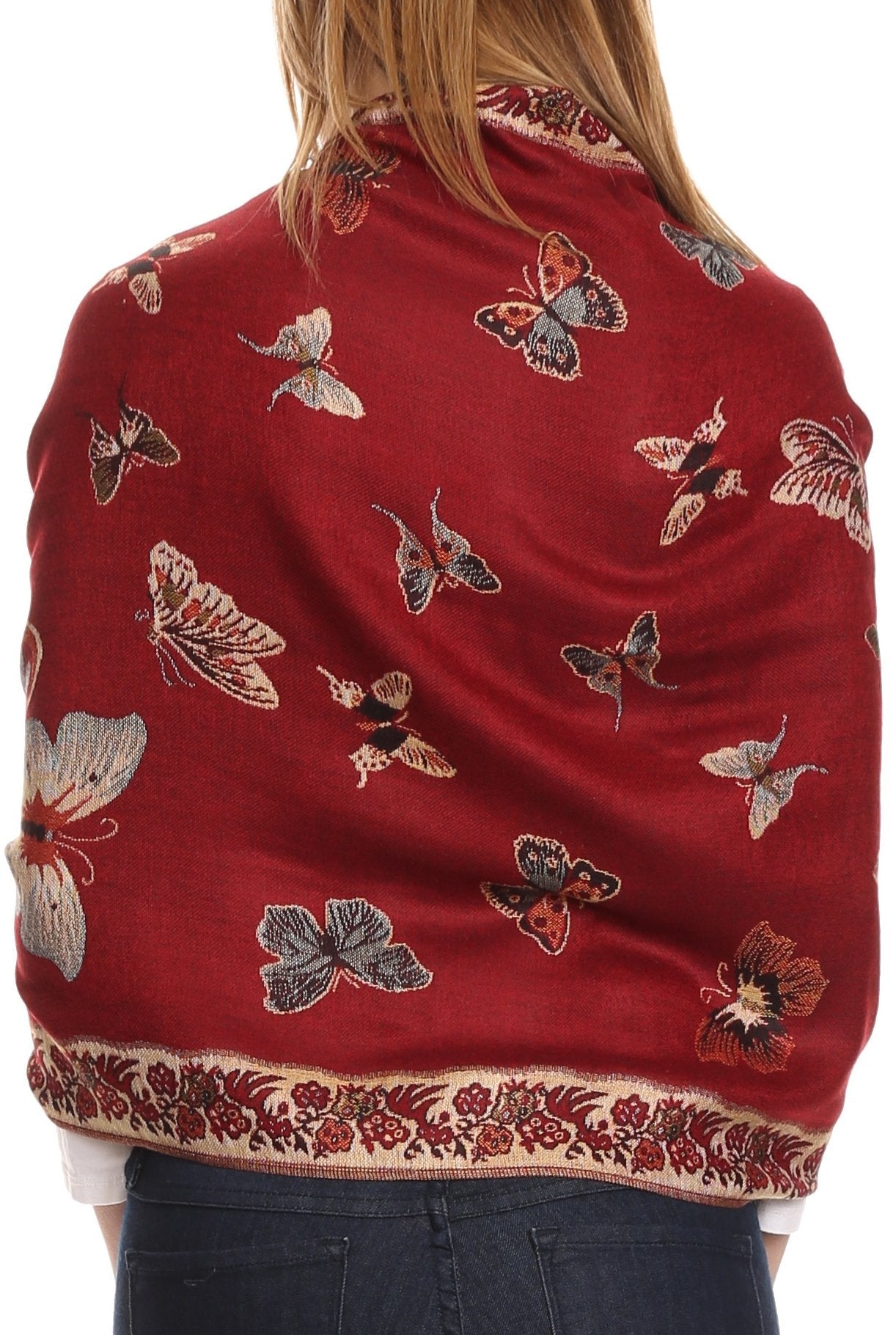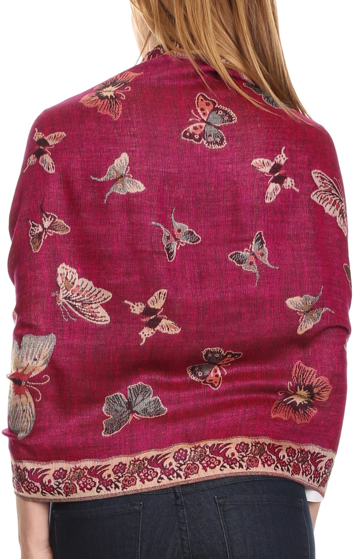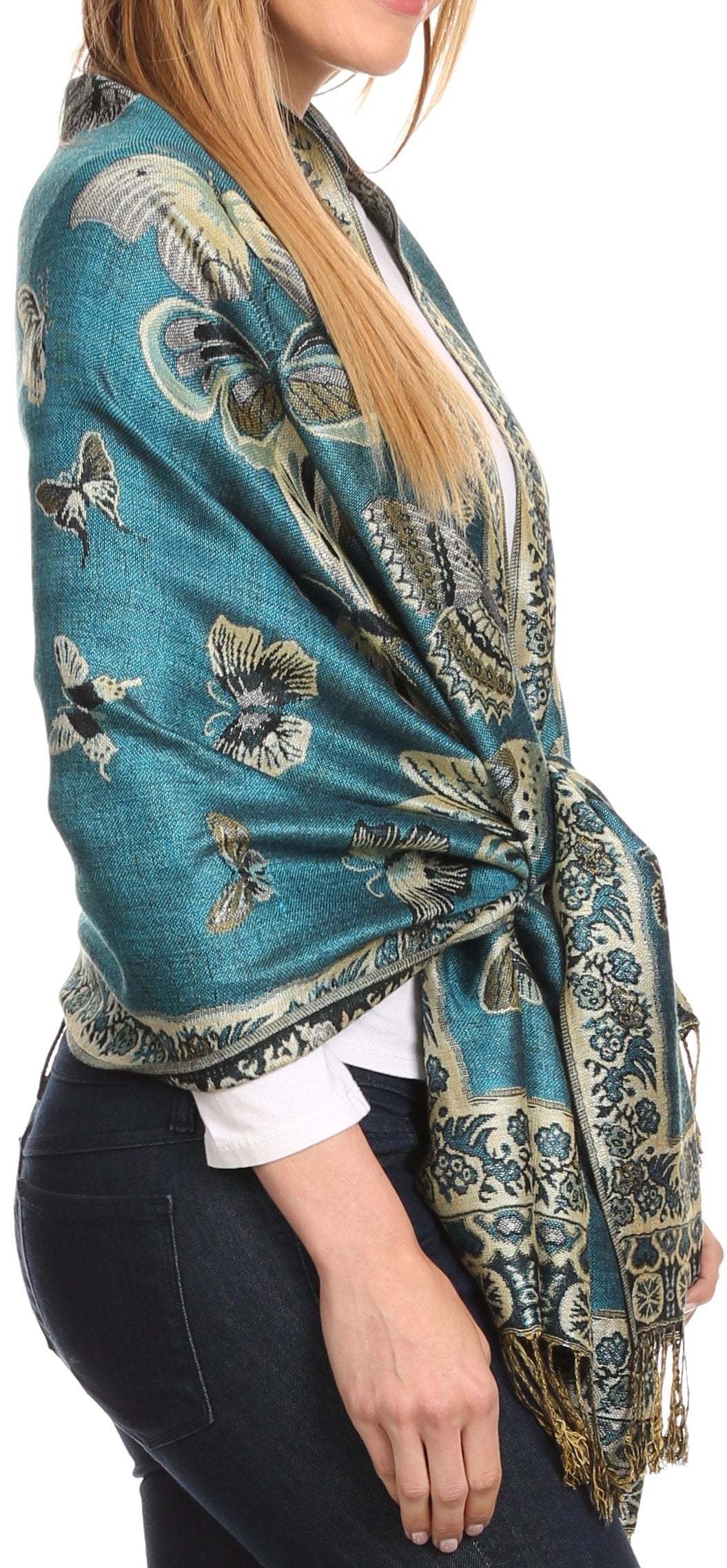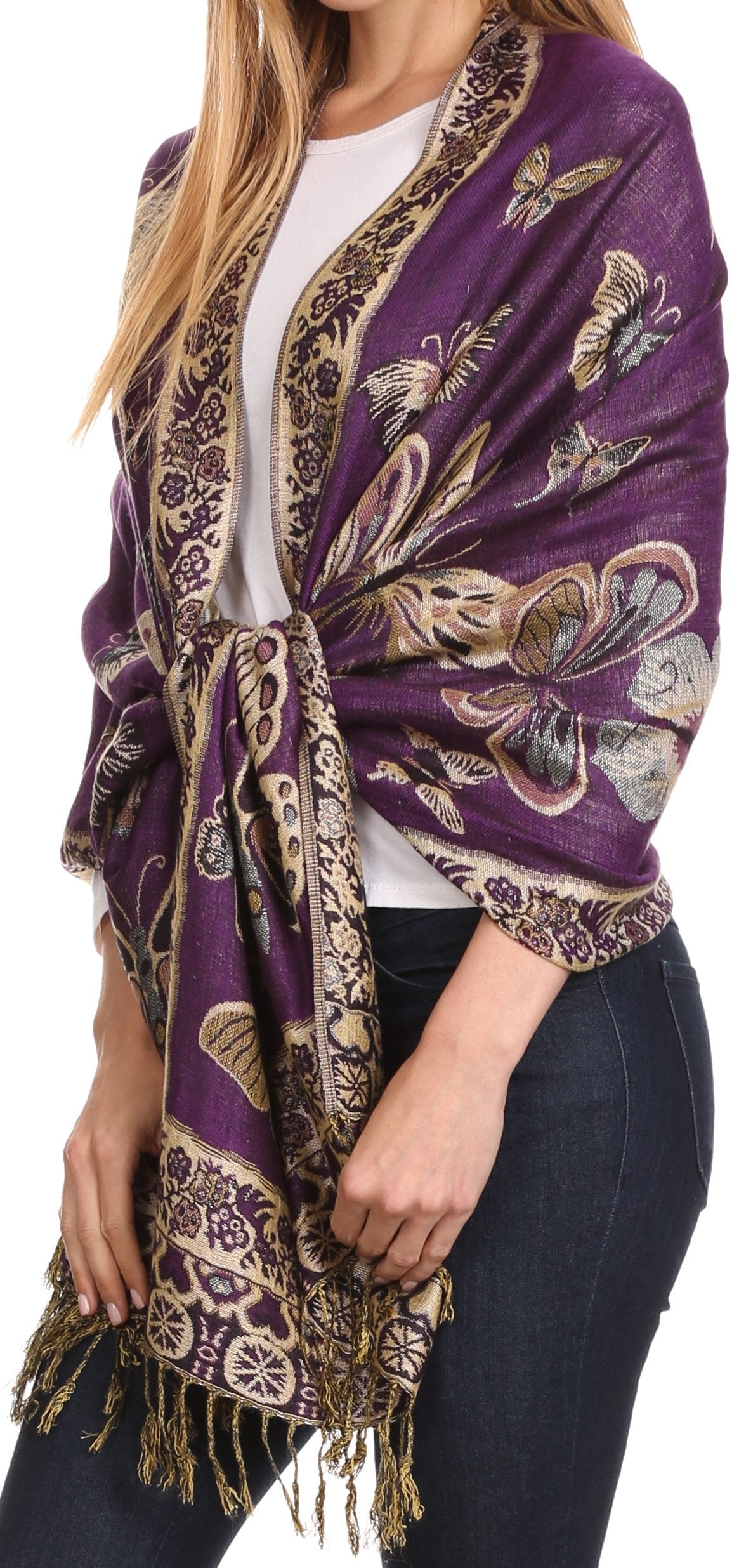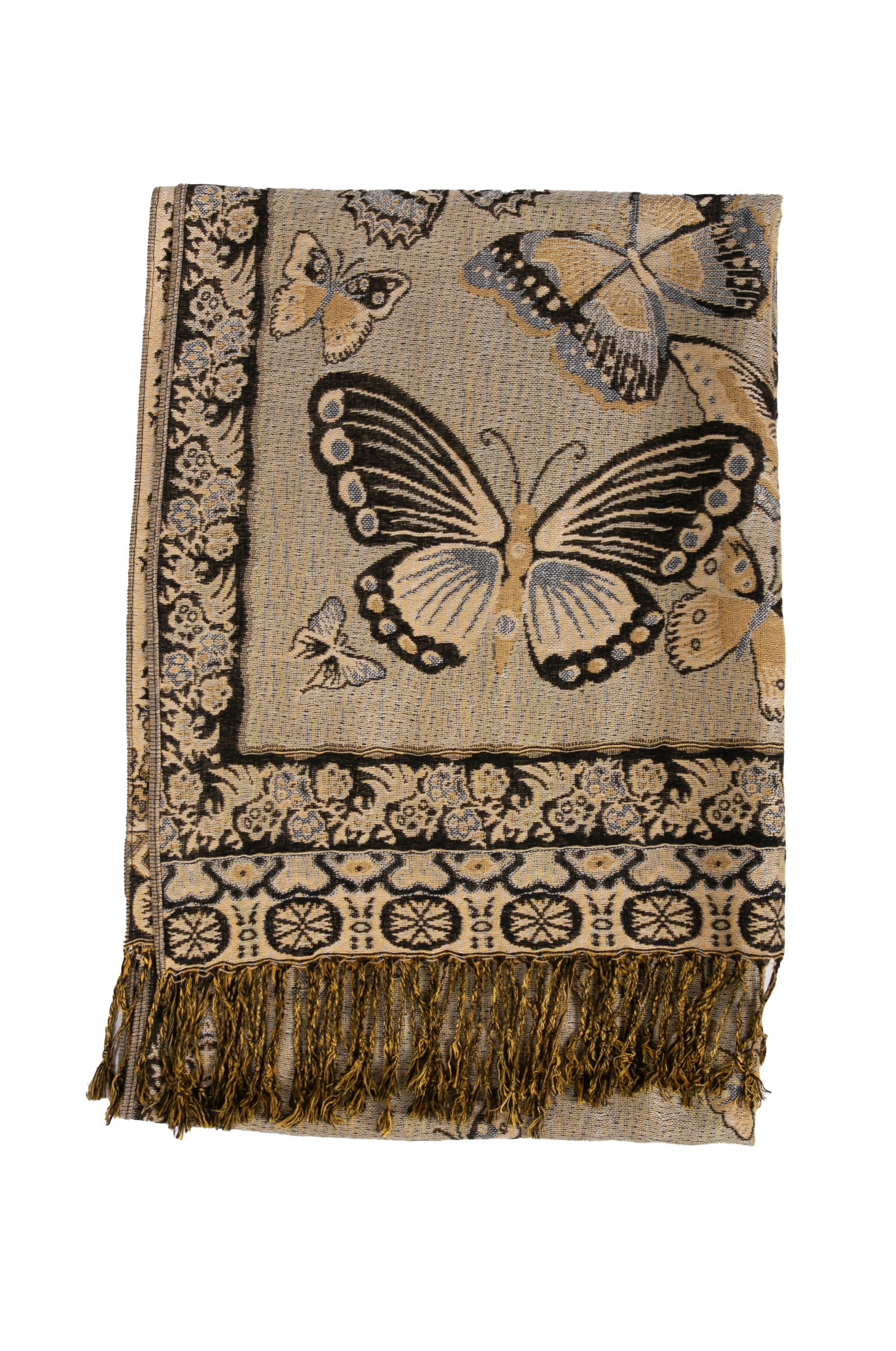 This pashmina feel shawl features a unique gorgeous butterfly patterned design. The designs are multi colored. The color combination for each scarf is gorgeous with the most beautiful hues. The tassels are a blend of two different colors of fabric woven together. This scarf is long and wide, opaque, and mid weight.