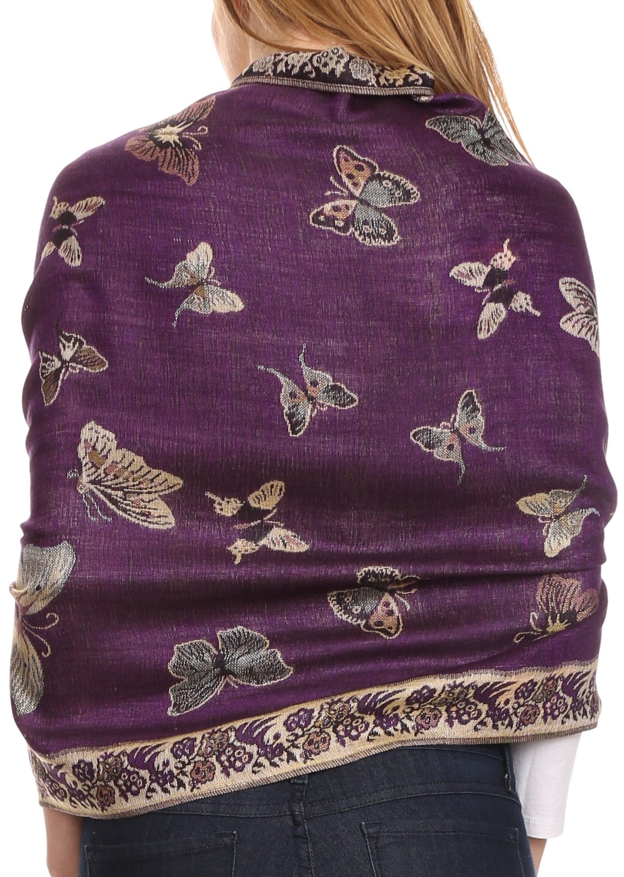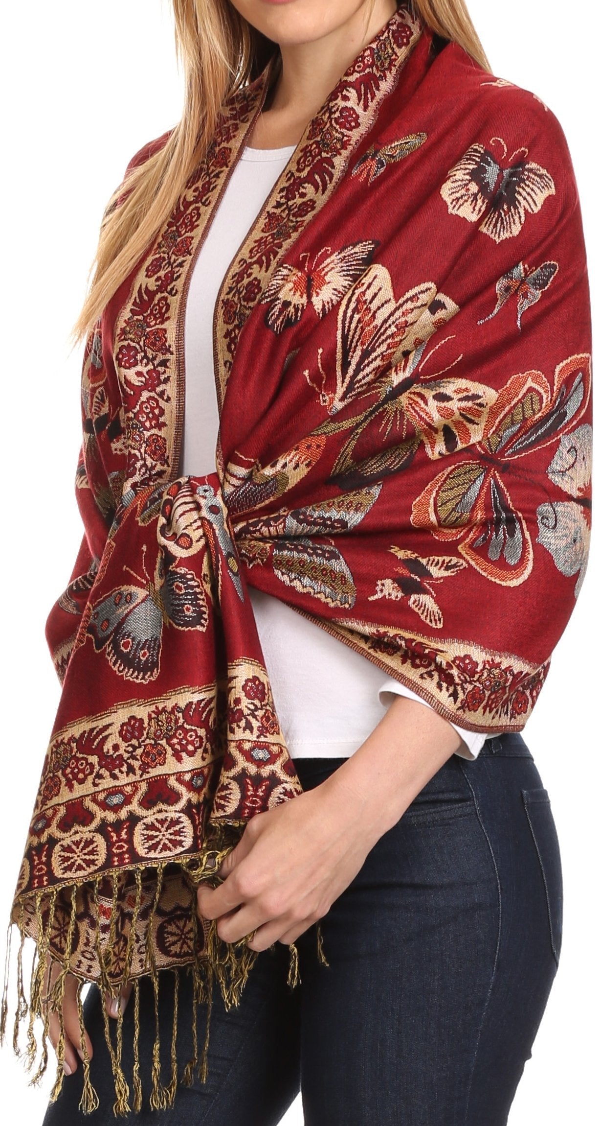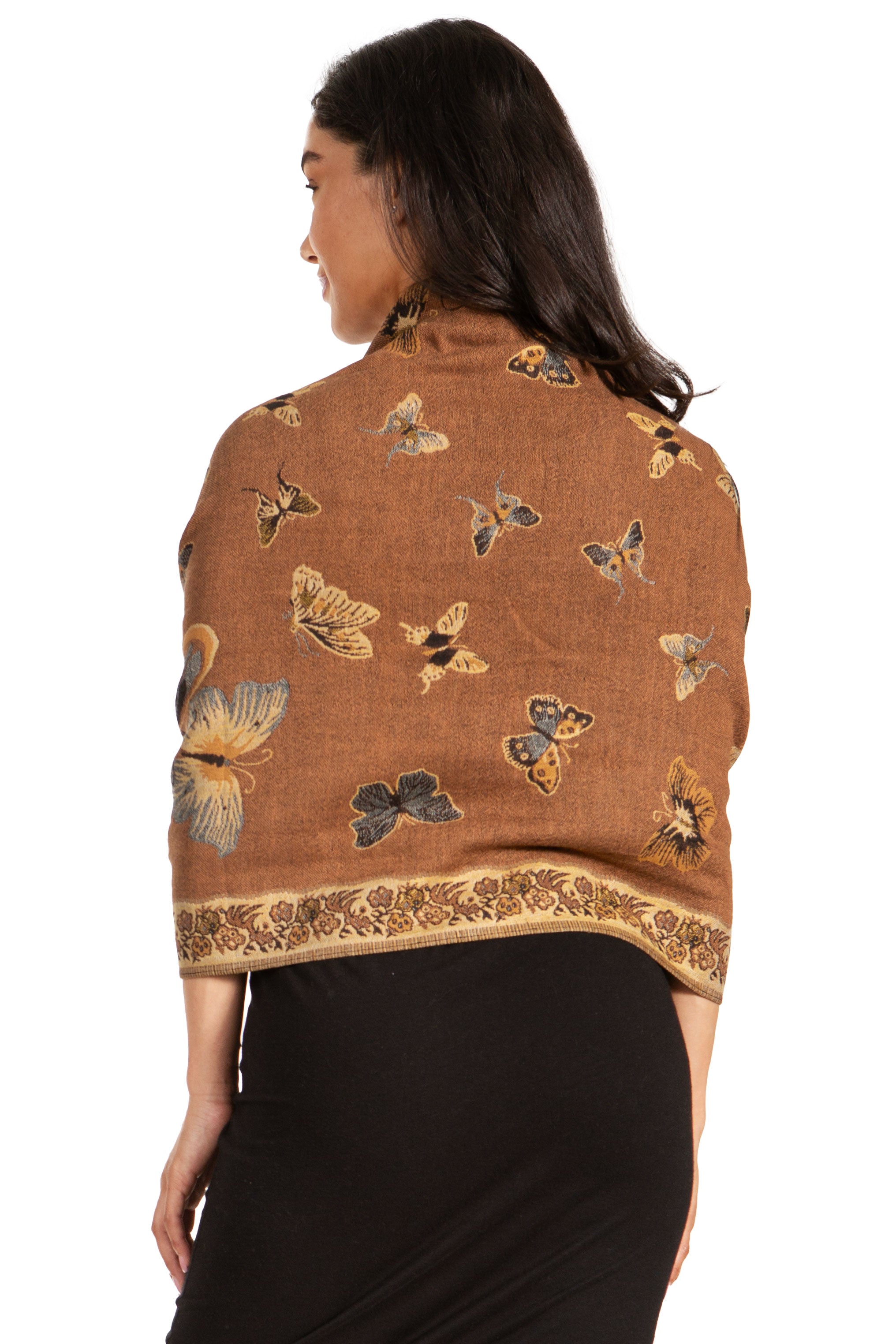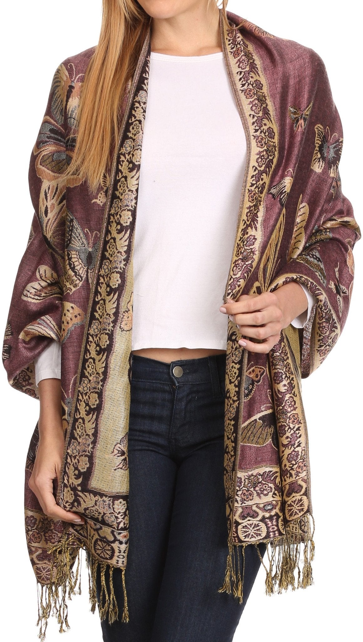 This pashmina feel shawl features a unique gorgeous butterfly patterned design. The designs are multi colored. The color combination for each scarf is gorgeous with the most beautiful hues. The tassels are a blend of two different colors of fabric woven together. This scarf is long and wide, opaque, and mid weight.