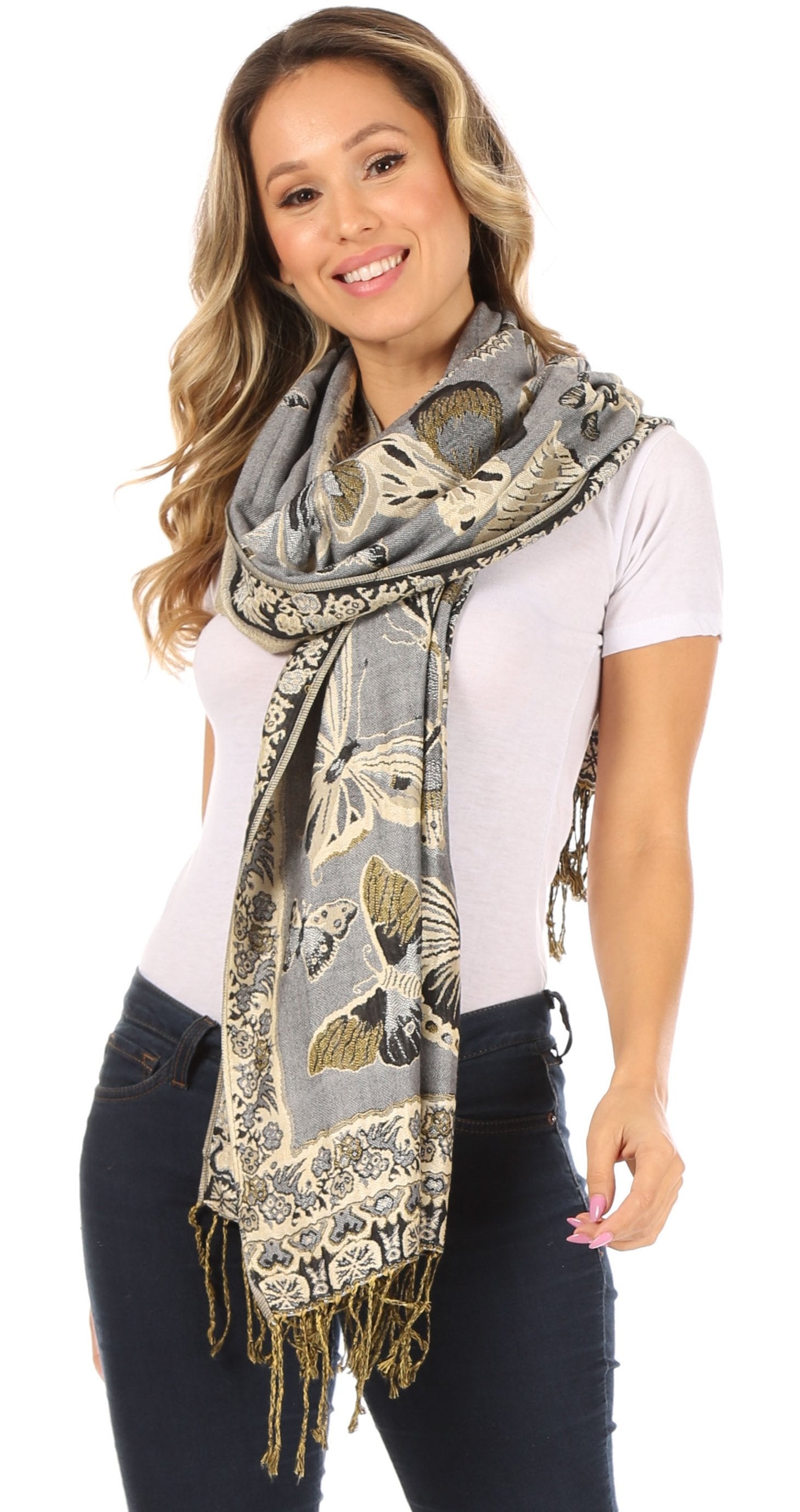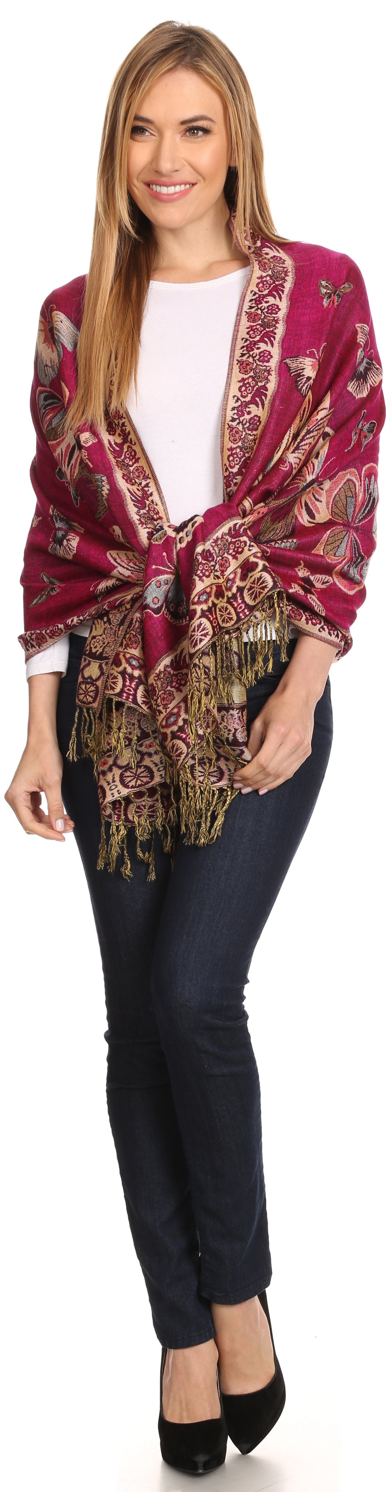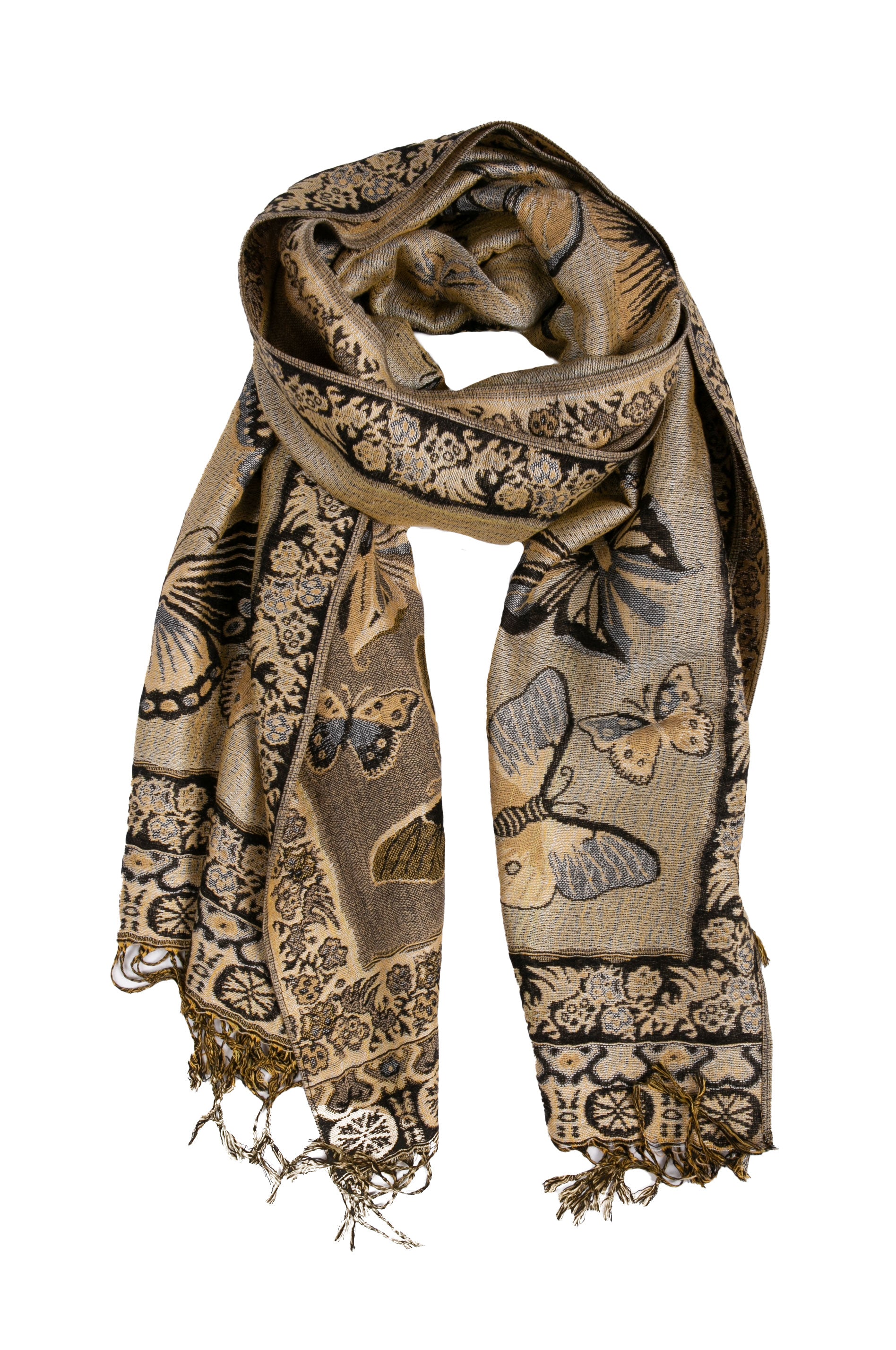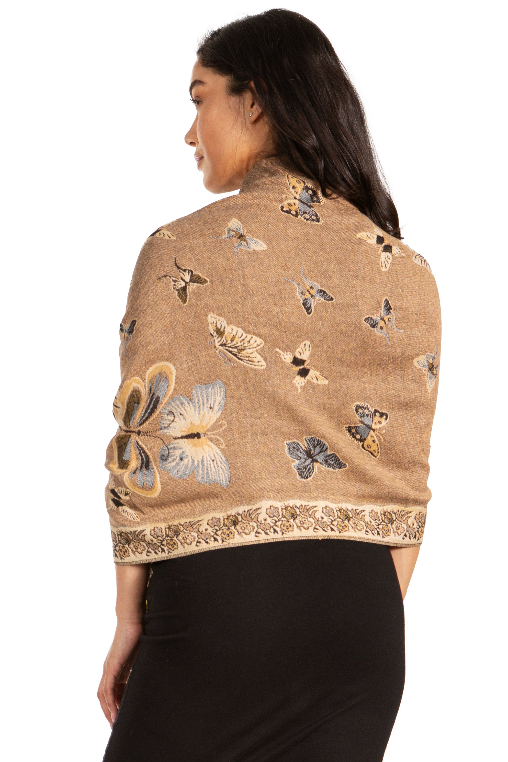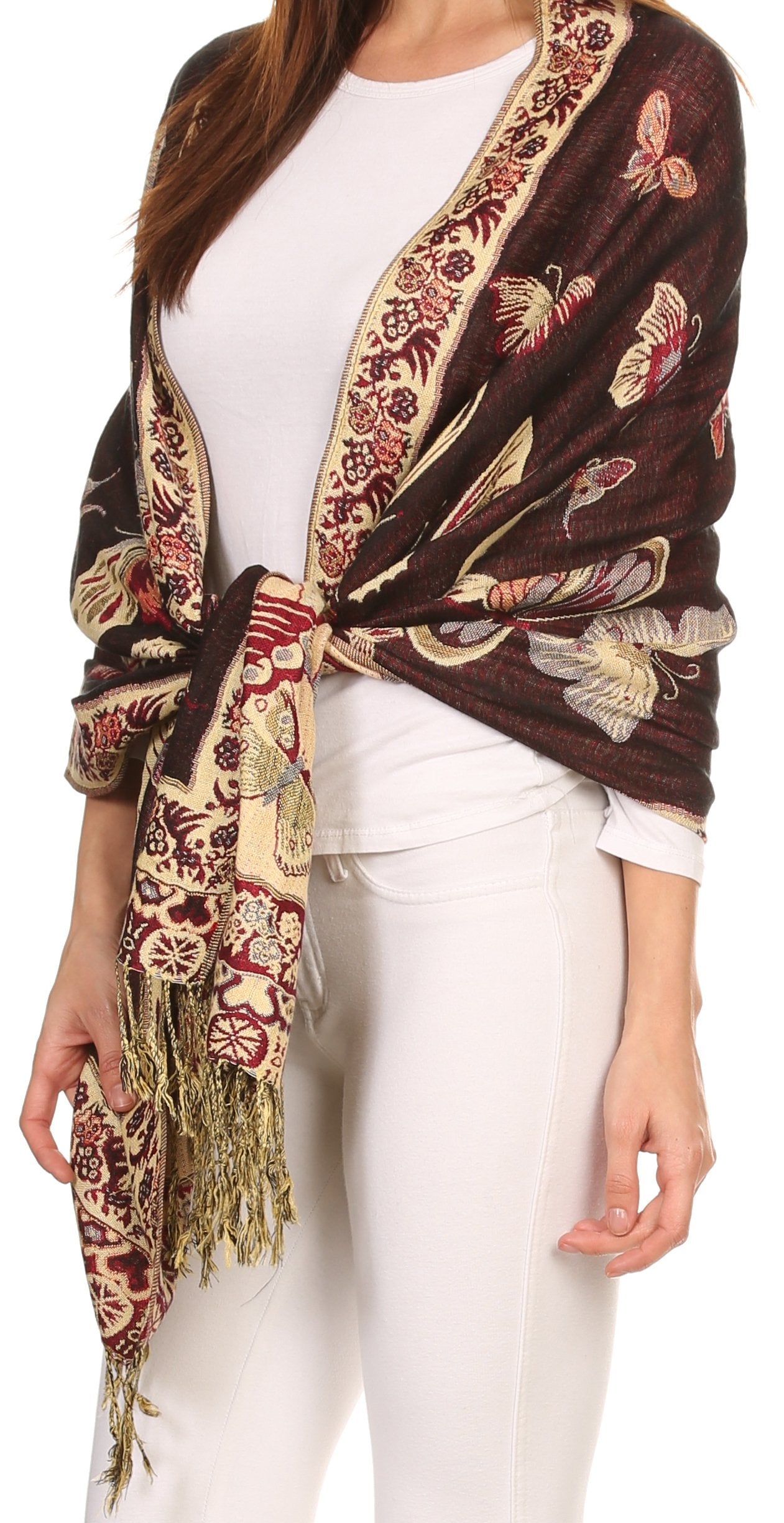 This pashmina feel shawl features a unique gorgeous butterfly patterned design. The designs are multi colored. The color combination for each scarf is gorgeous with the most beautiful hues. The tassels are a blend of two different colors of fabric woven together. This scarf is long and wide, opaque, and mid weight.