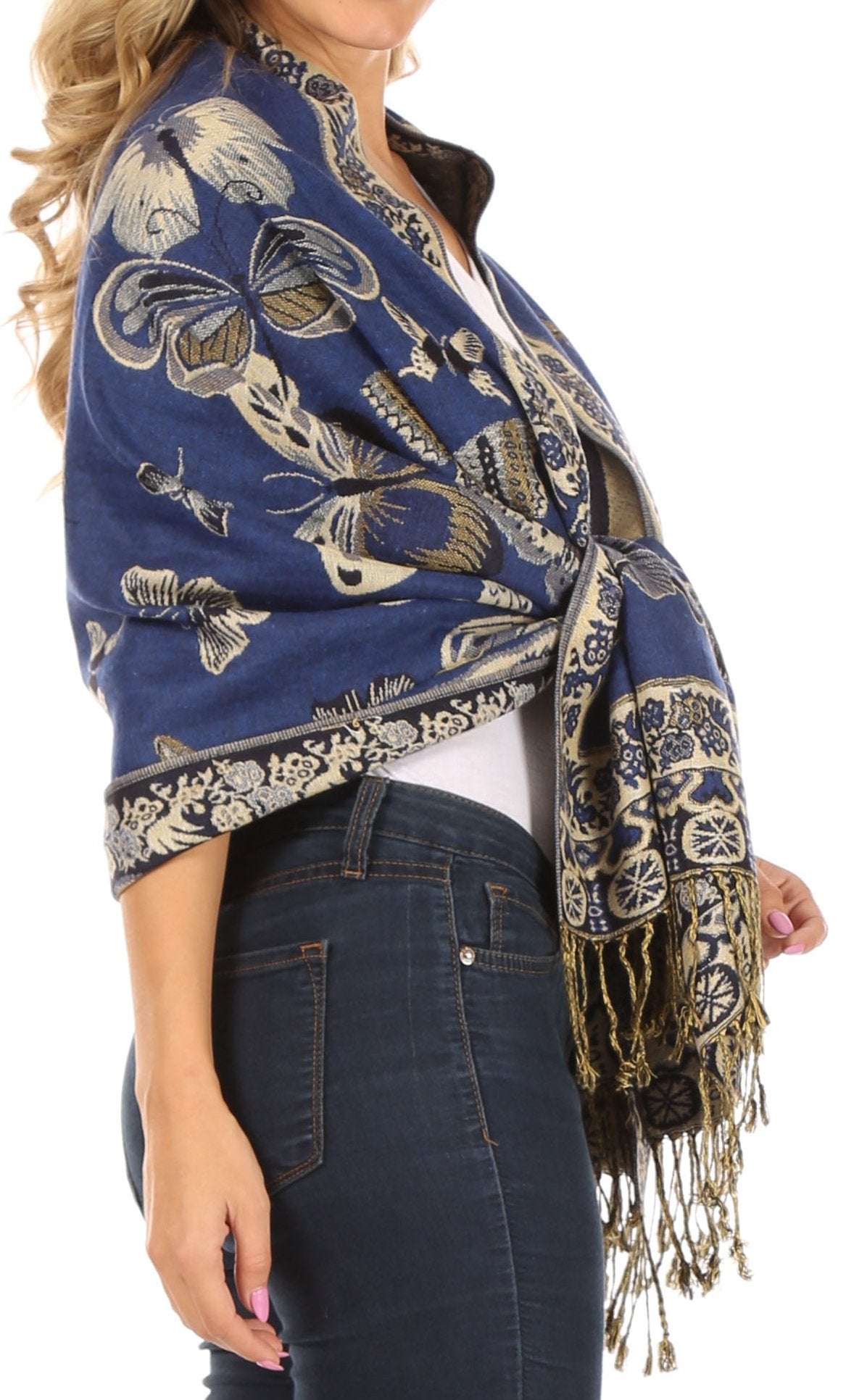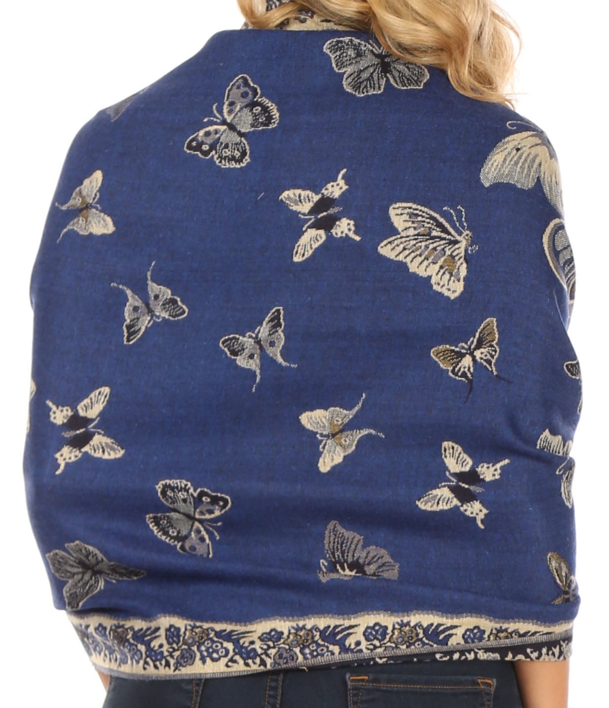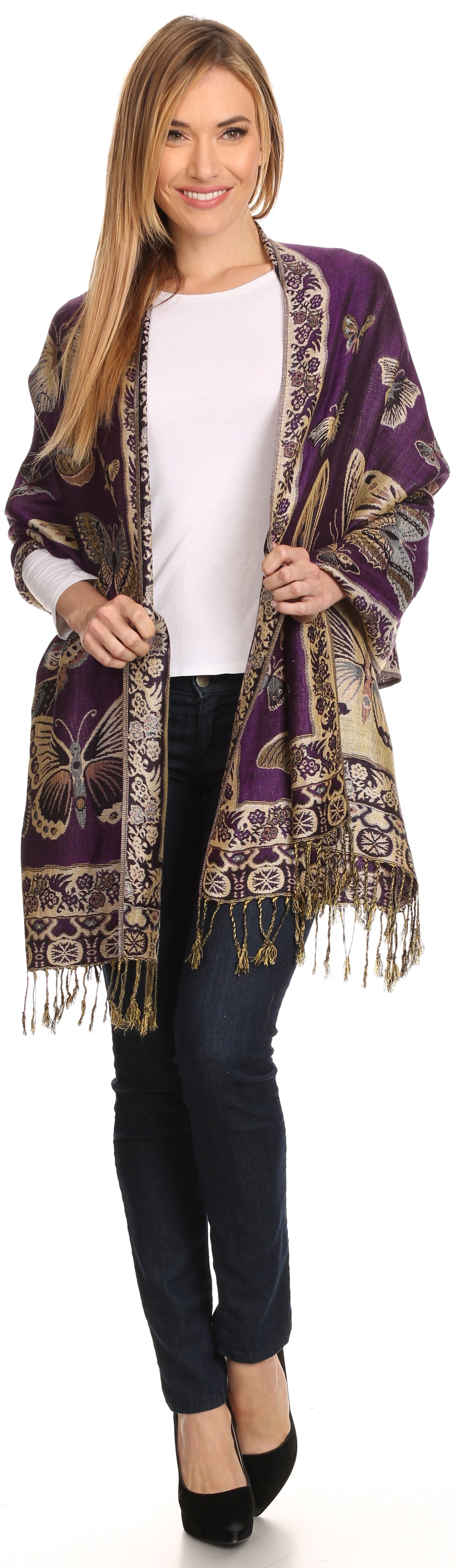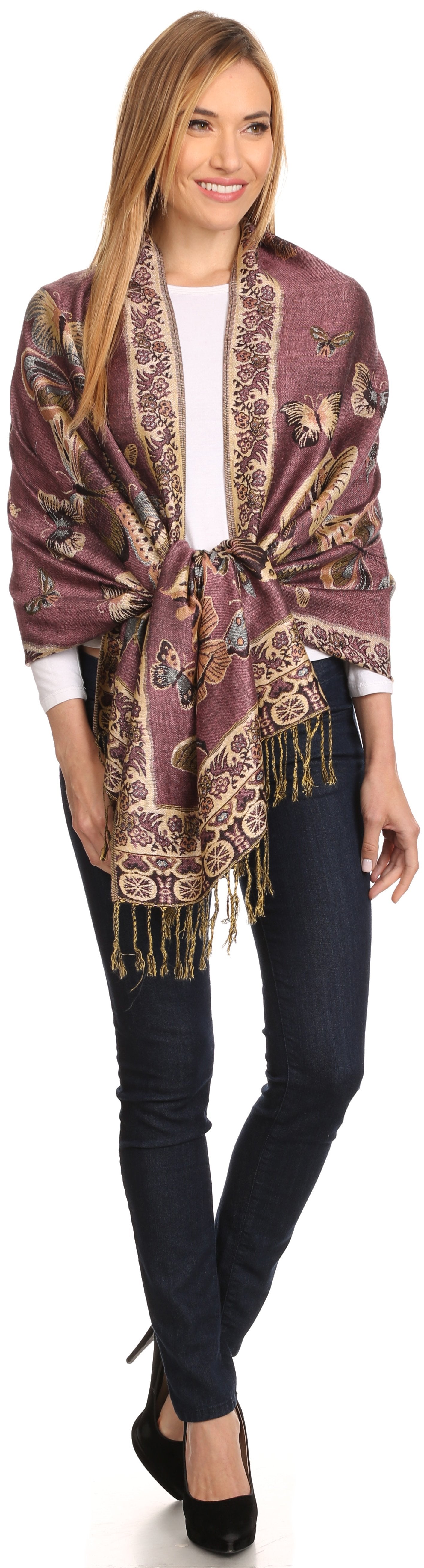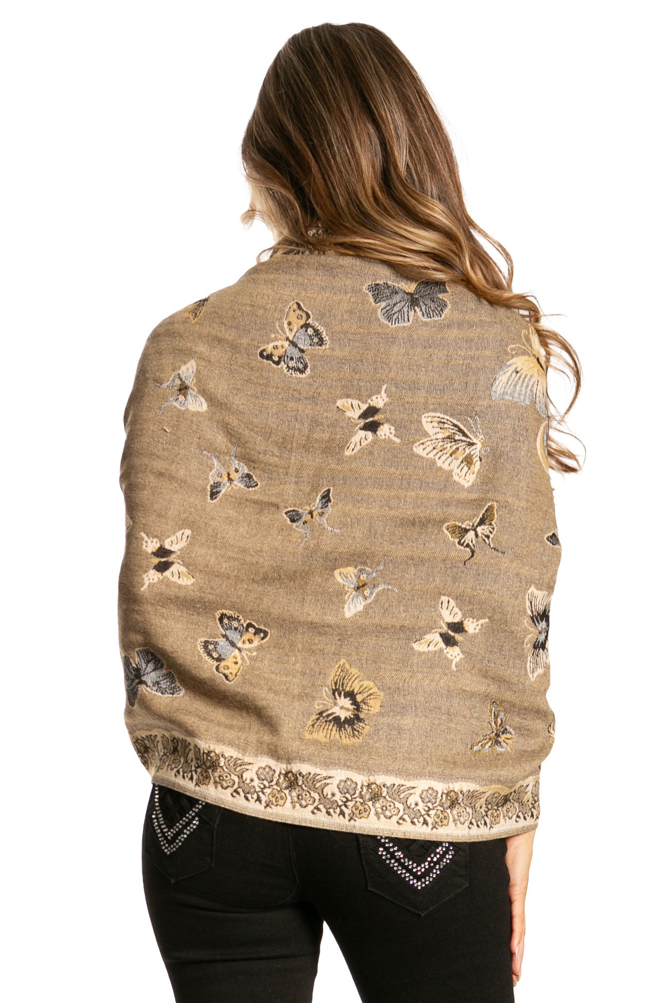 This pashmina feel shawl features a unique gorgeous butterfly patterned design. The designs are multi colored. The color combination for each scarf is gorgeous with the most beautiful hues. The tassels are a blend of two different colors of fabric woven together. This scarf is long and wide, opaque, and mid weight.