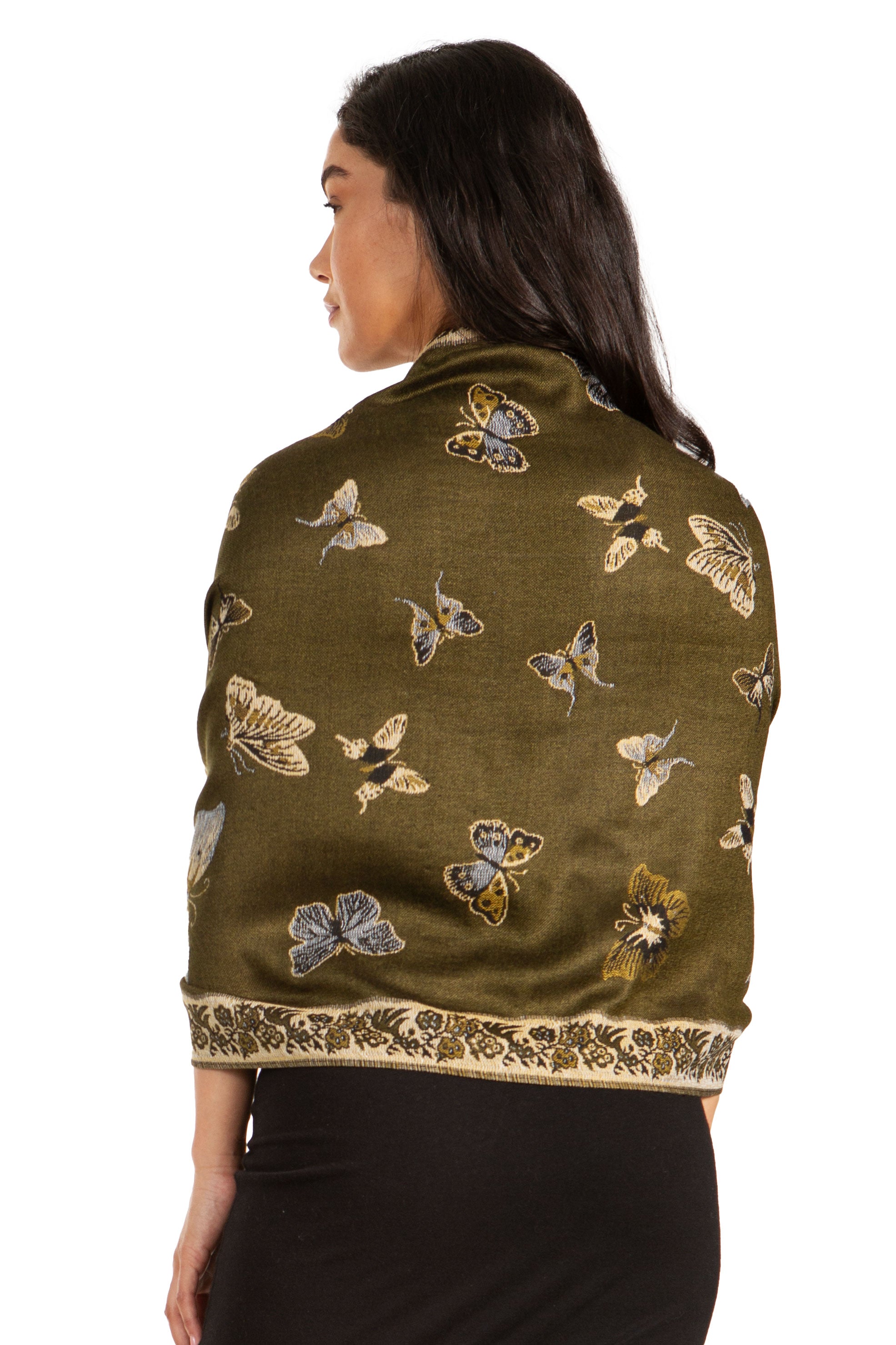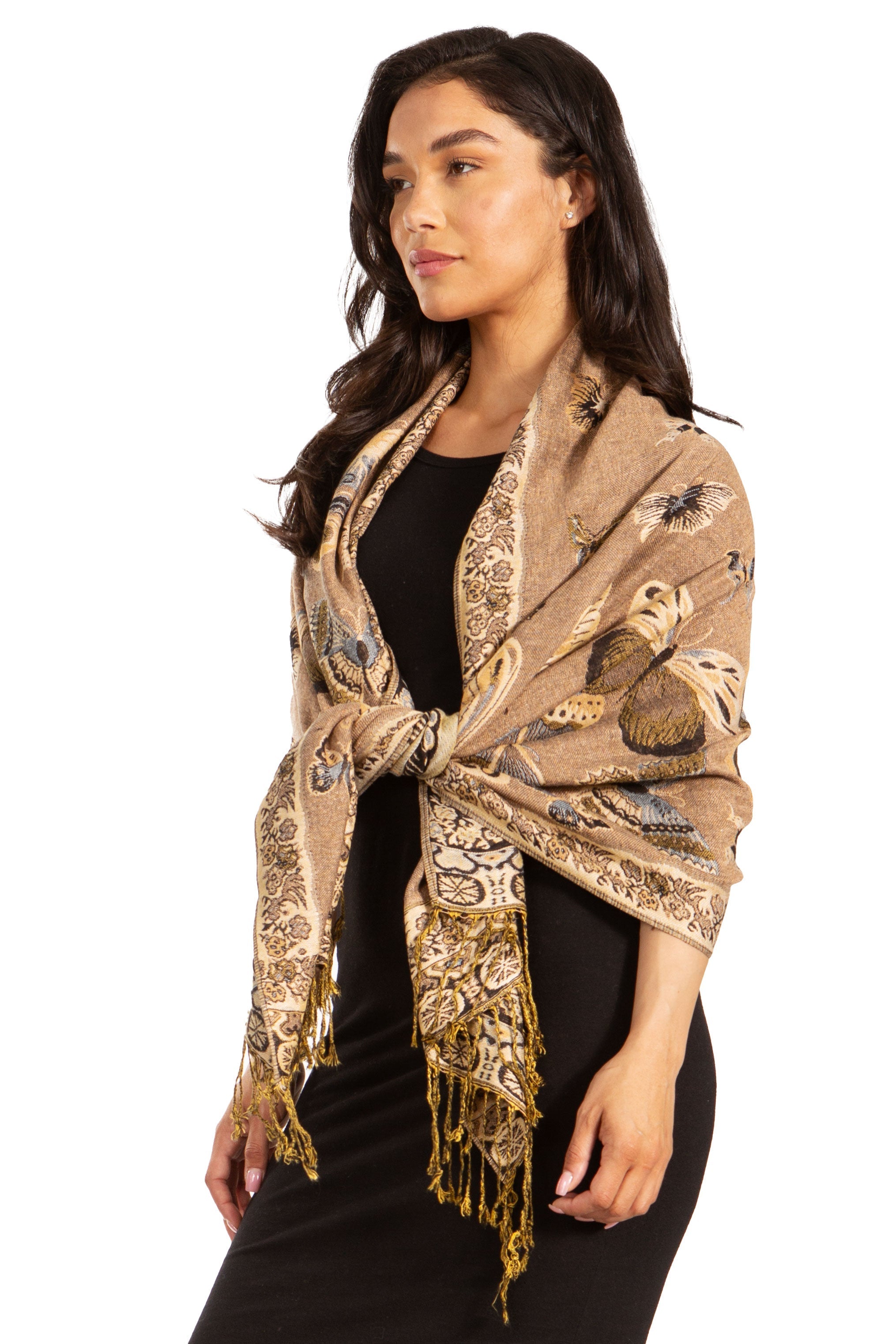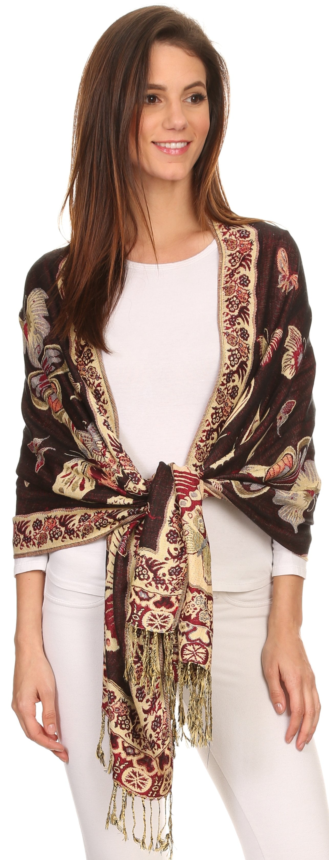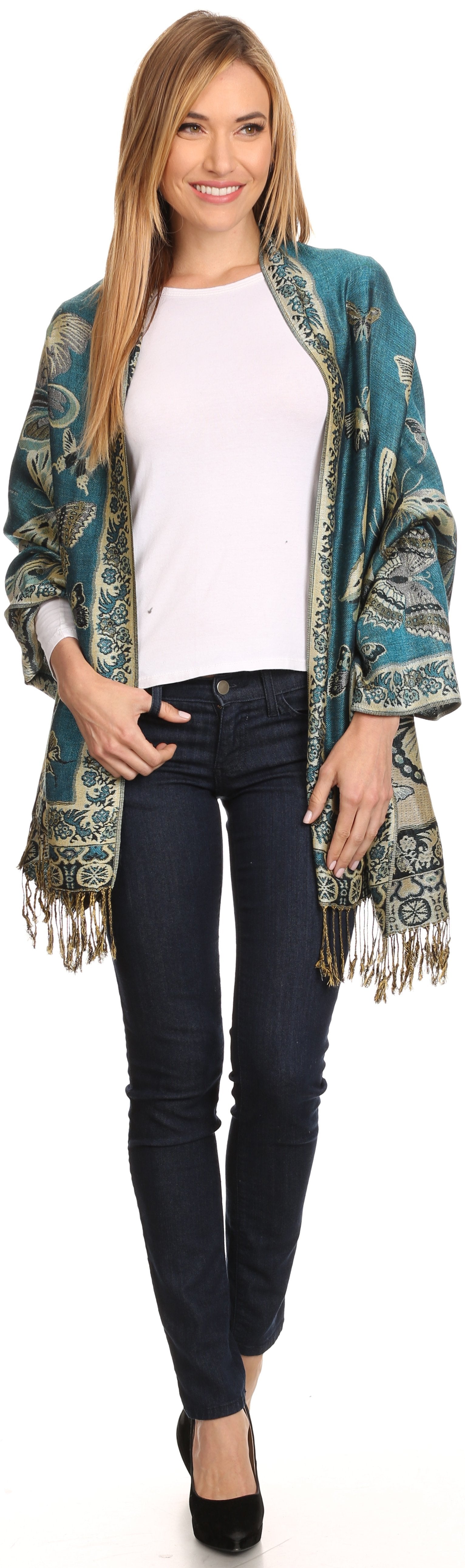 This pashmina feel shawl features a unique gorgeous butterfly patterned design. The designs are multi colored. The color combination for each scarf is gorgeous with the most beautiful hues. The tassels are a blend of two different colors of fabric woven together. This scarf is long and wide, opaque, and mid weight.