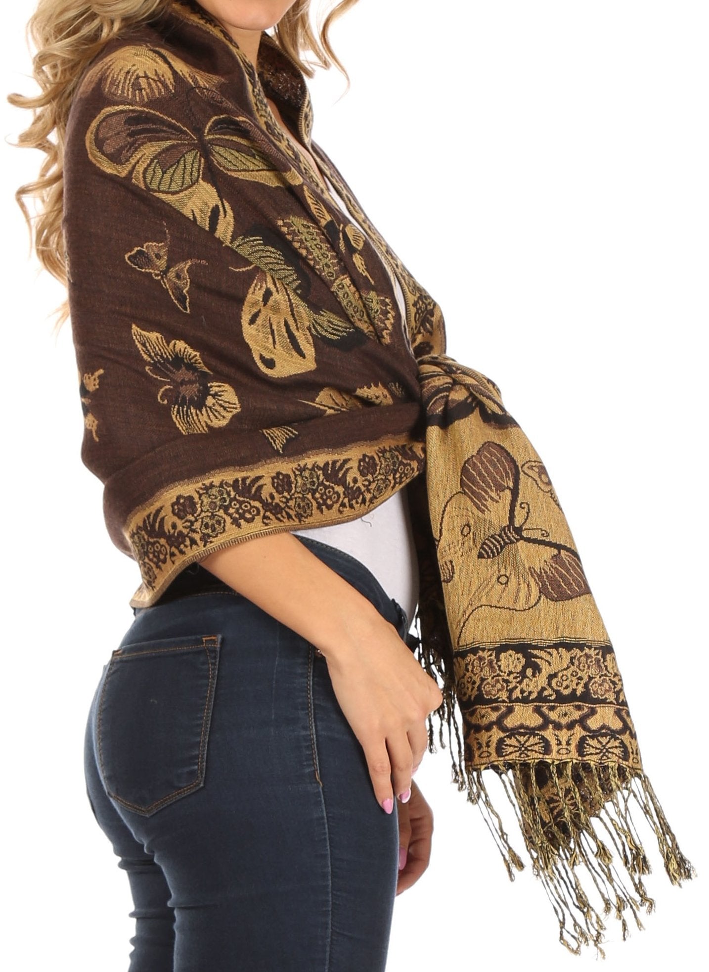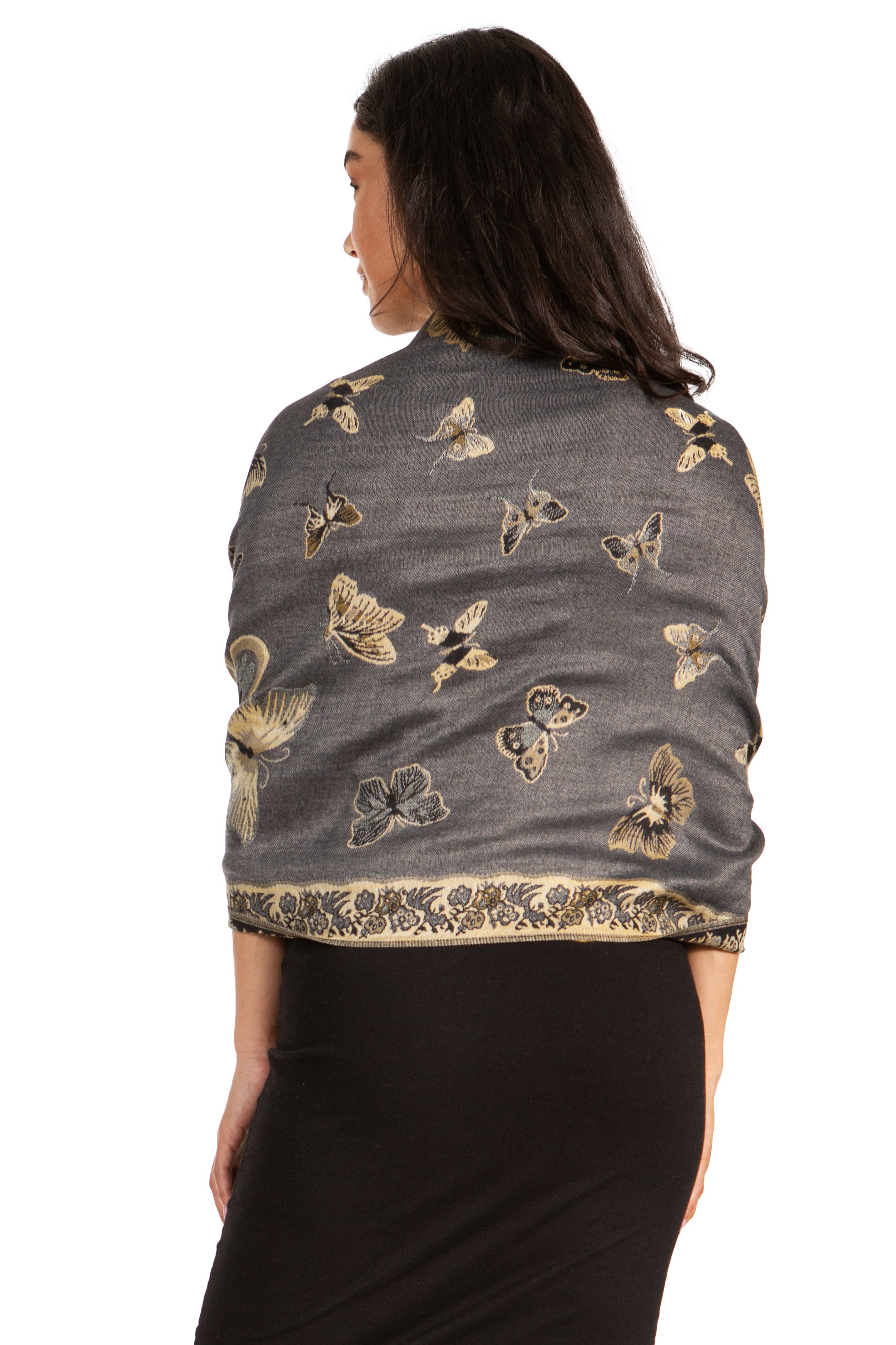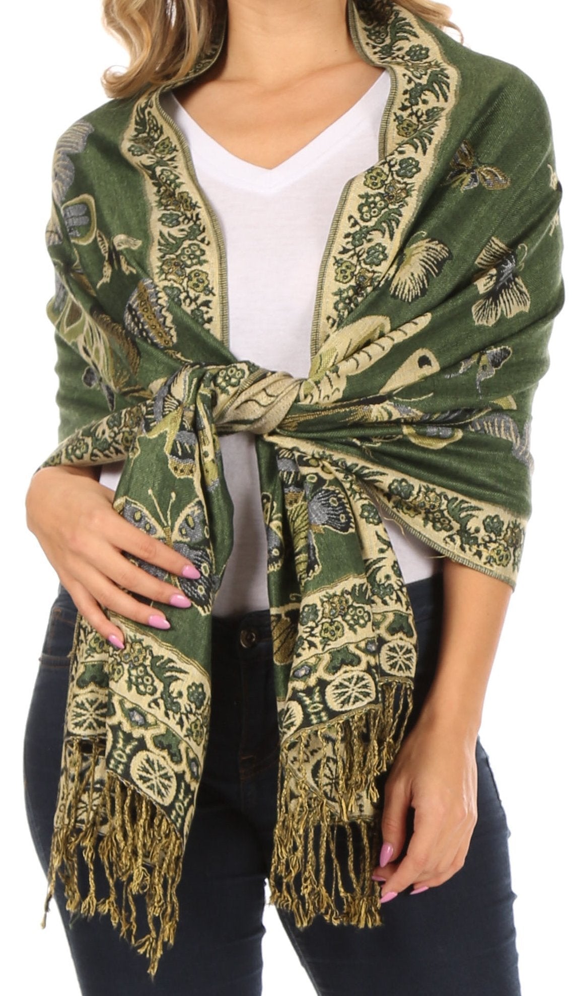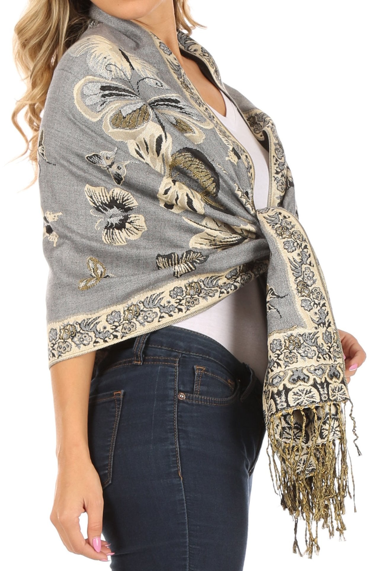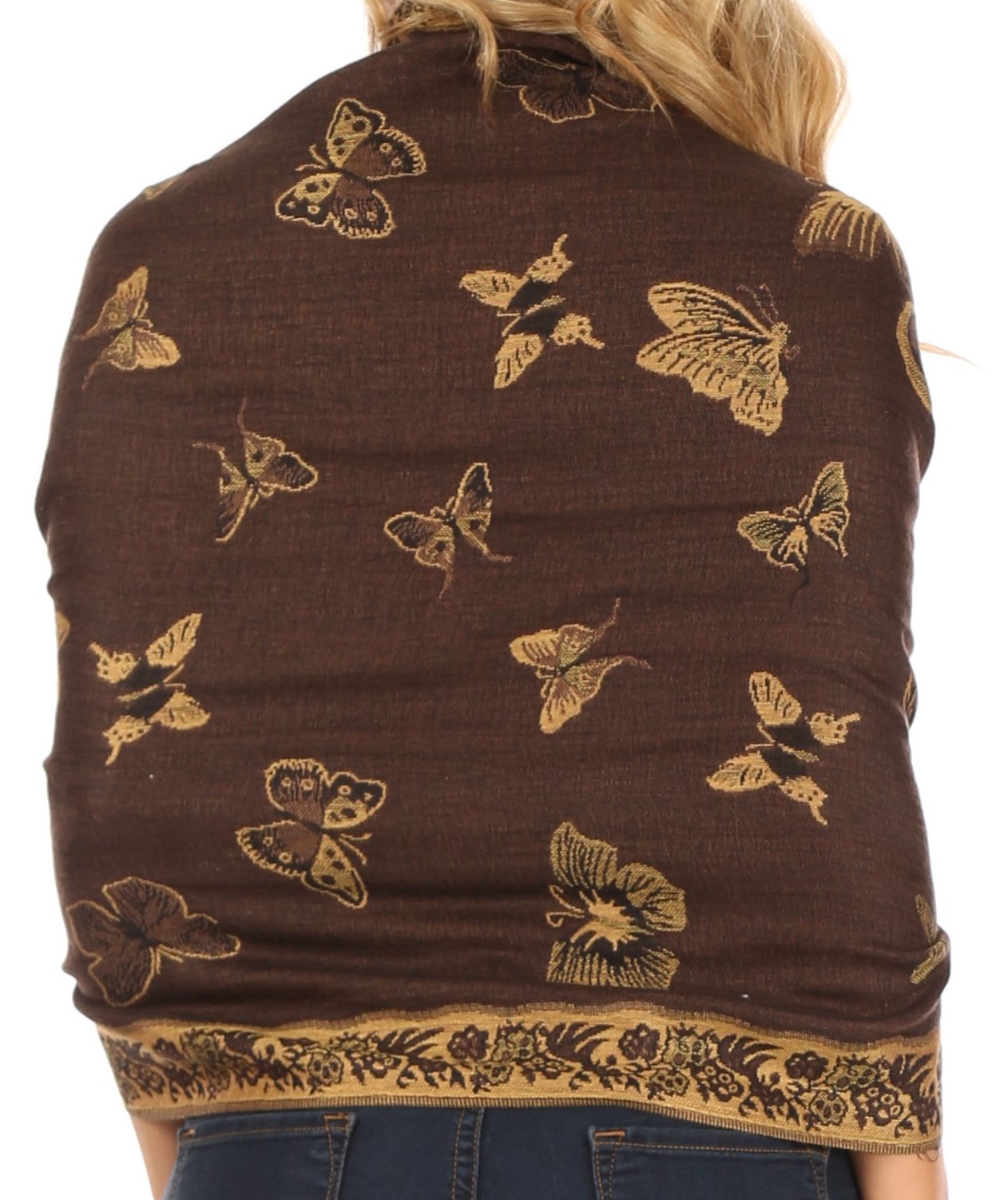 This pashmina feel shawl features a unique gorgeous butterfly patterned design. The designs are multi colored. The color combination for each scarf is gorgeous with the most beautiful hues. The tassels are a blend of two different colors of fabric woven together. This scarf is long and wide, opaque, and mid weight.